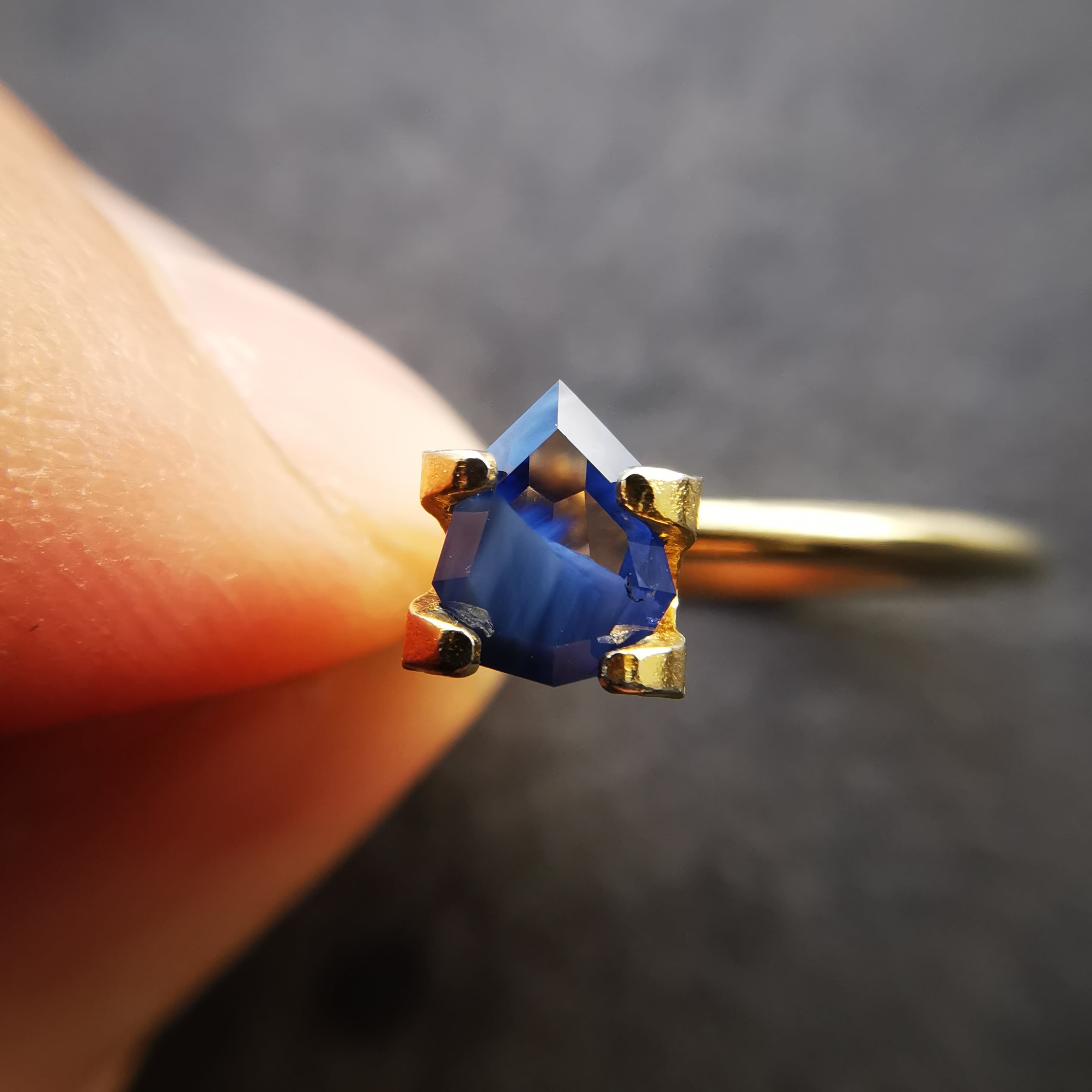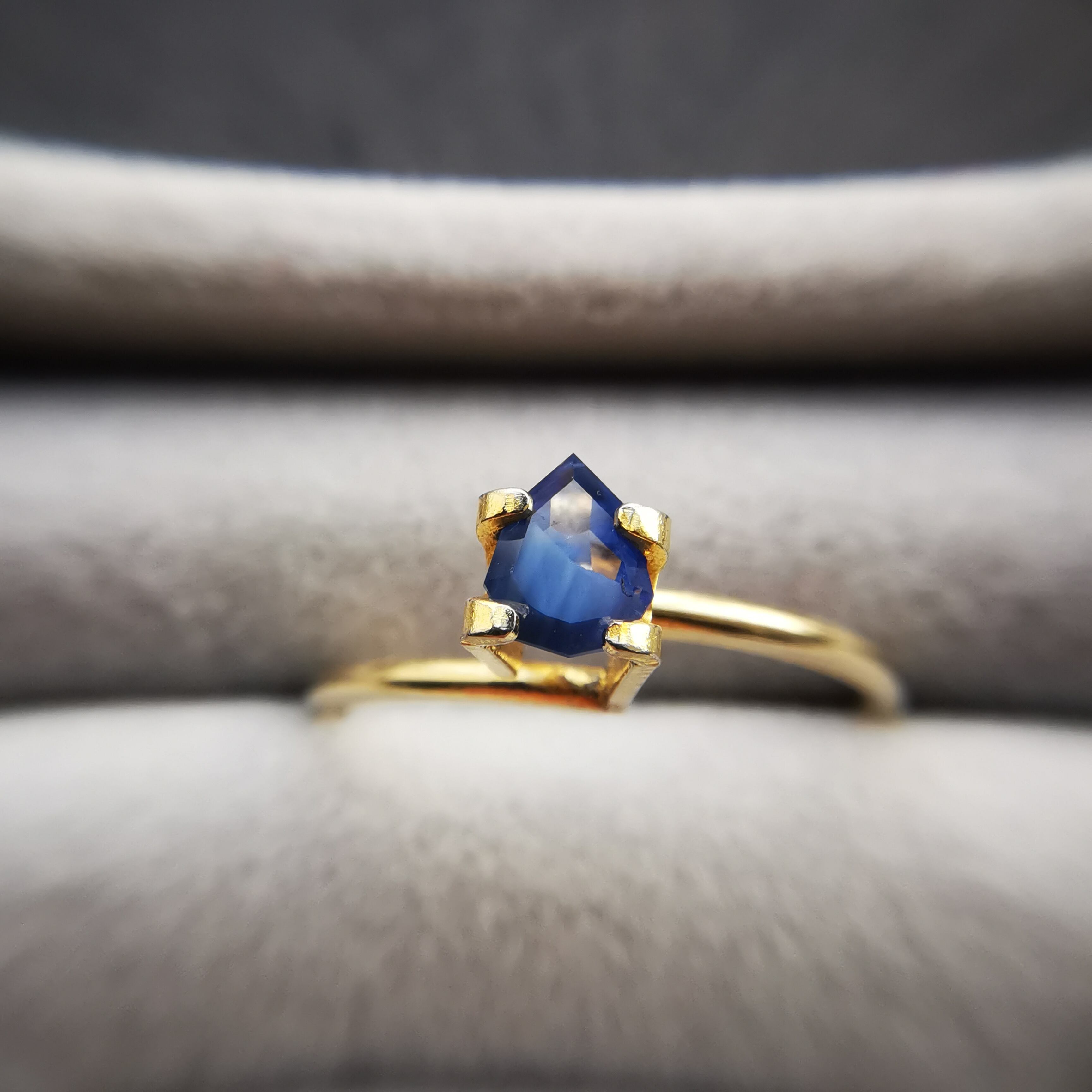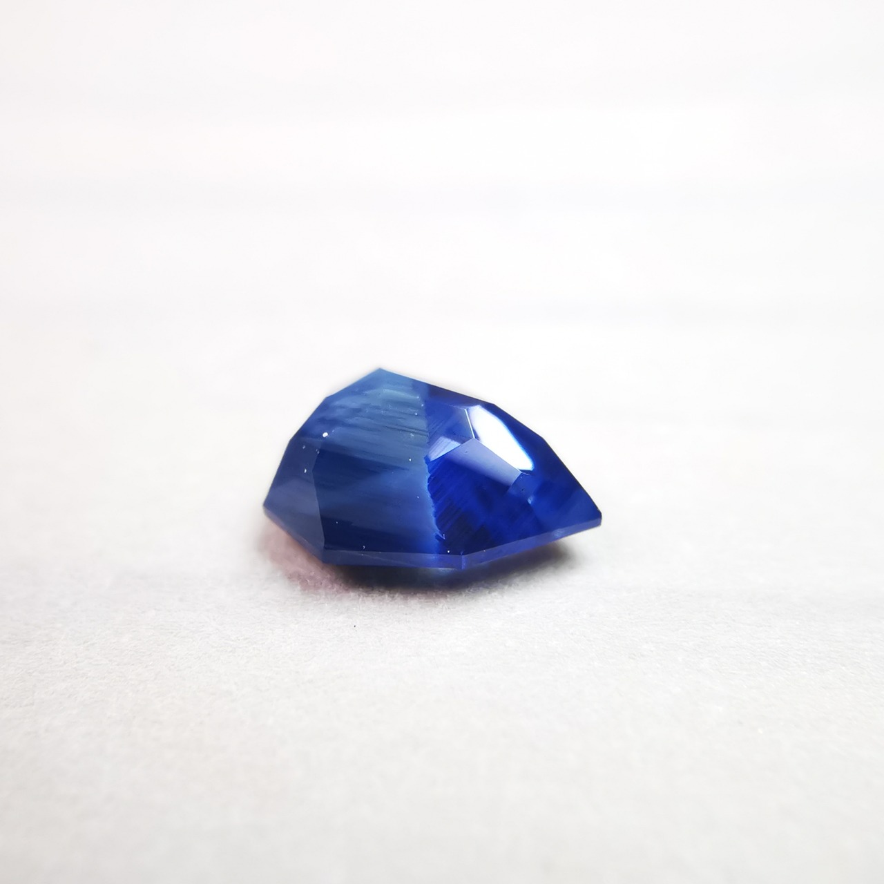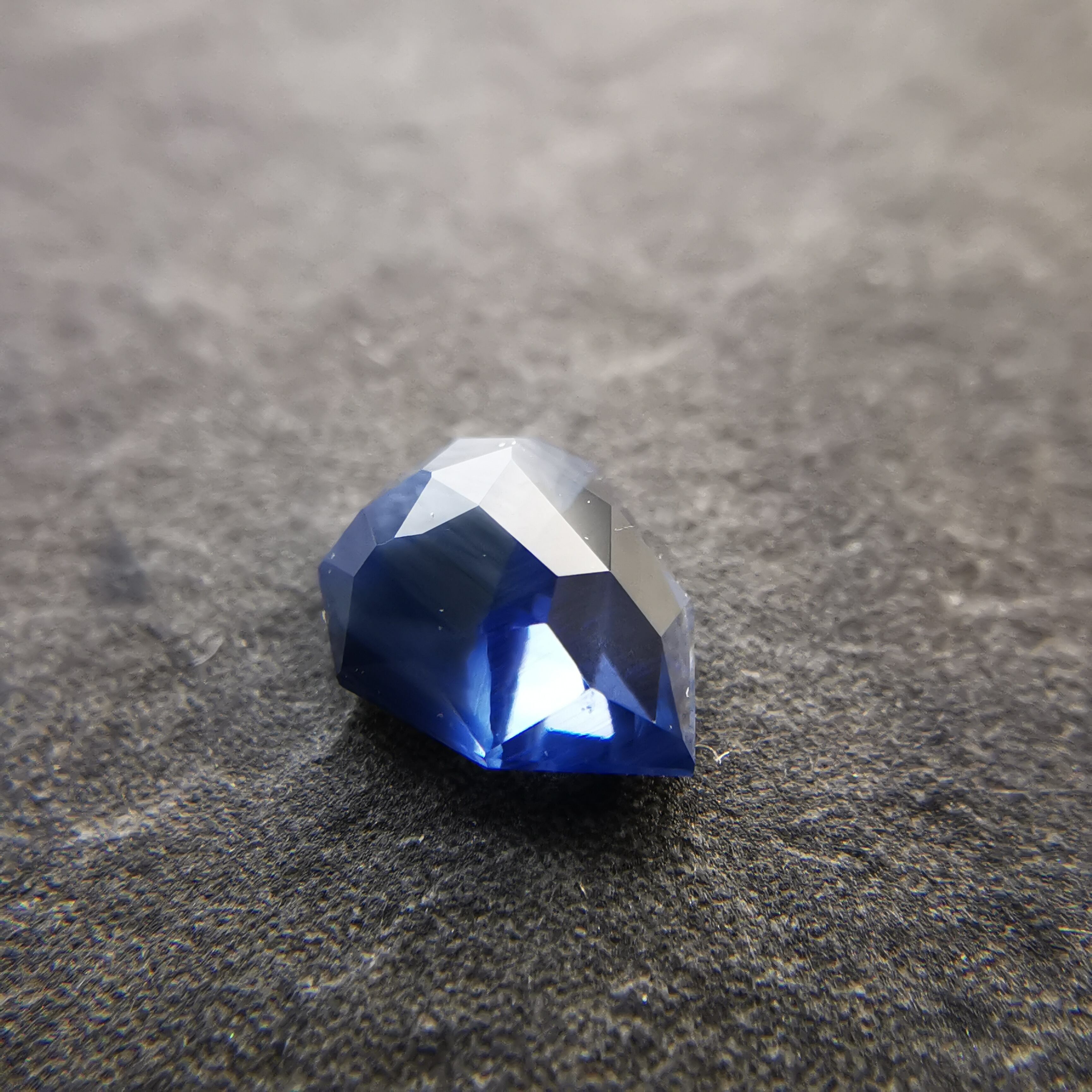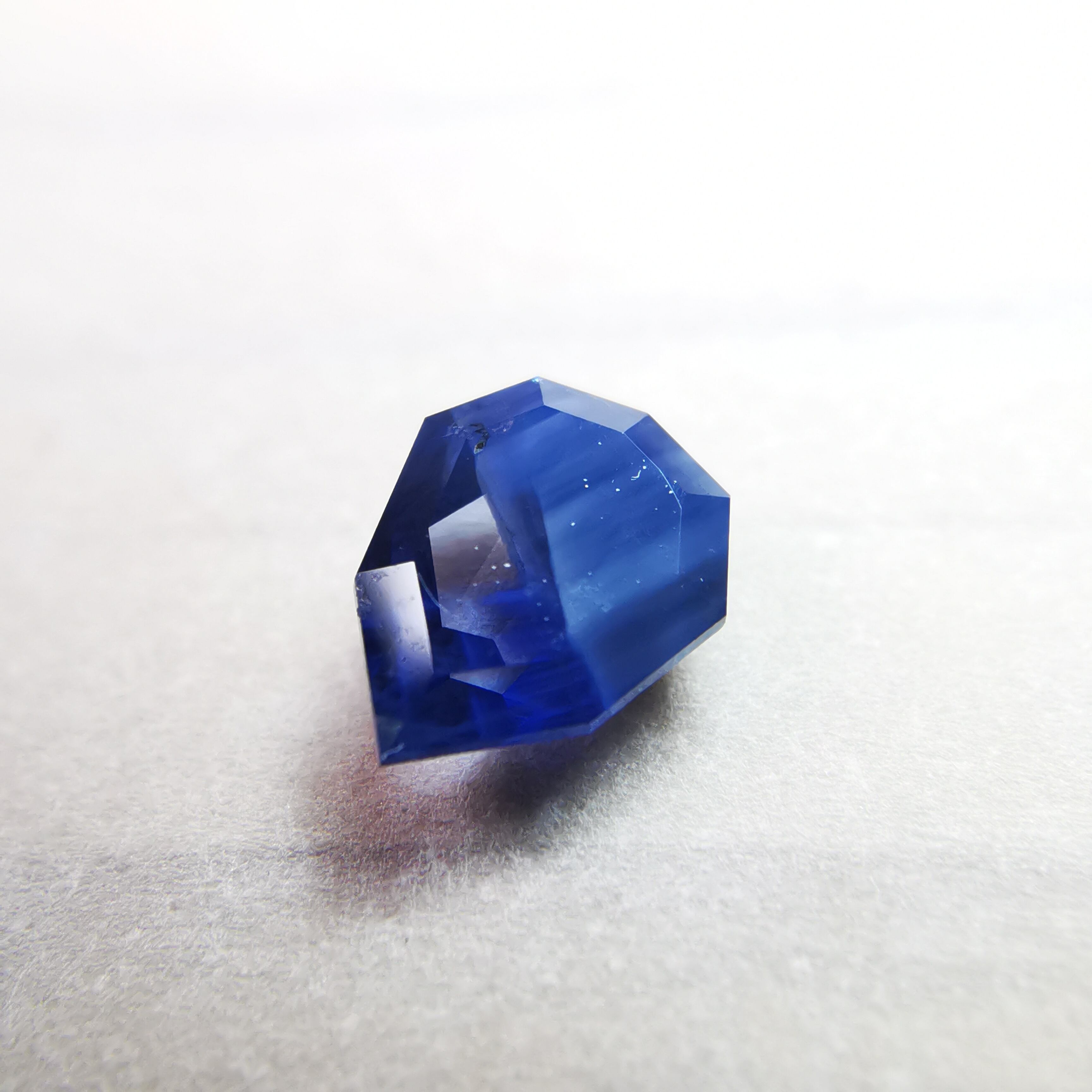 淡い瑠璃紺色に濃厚な不透明なブルーグレーが入ったサファイアです。