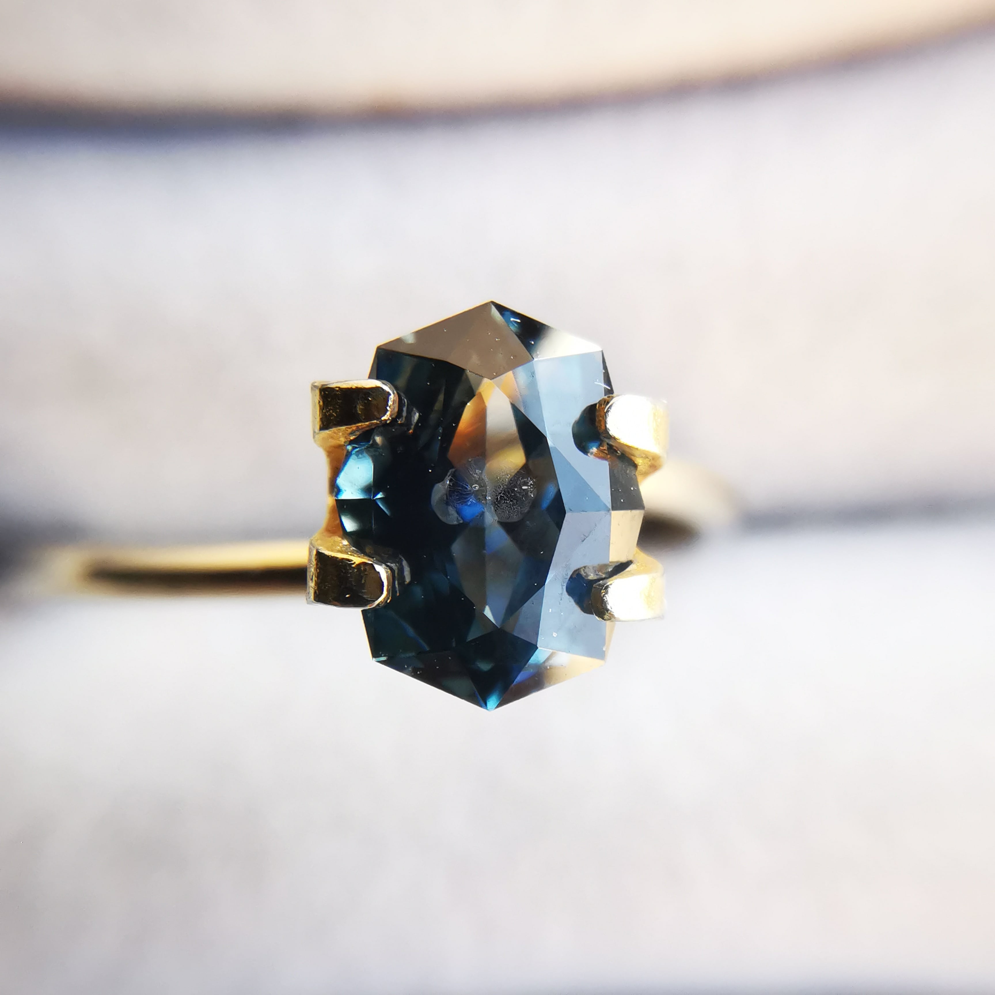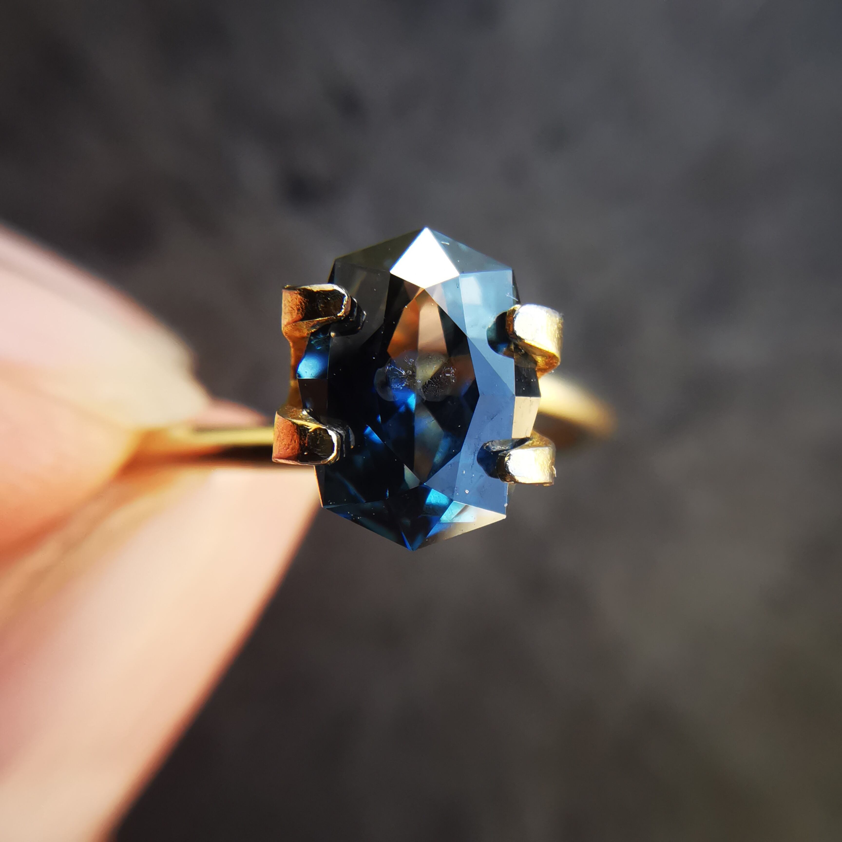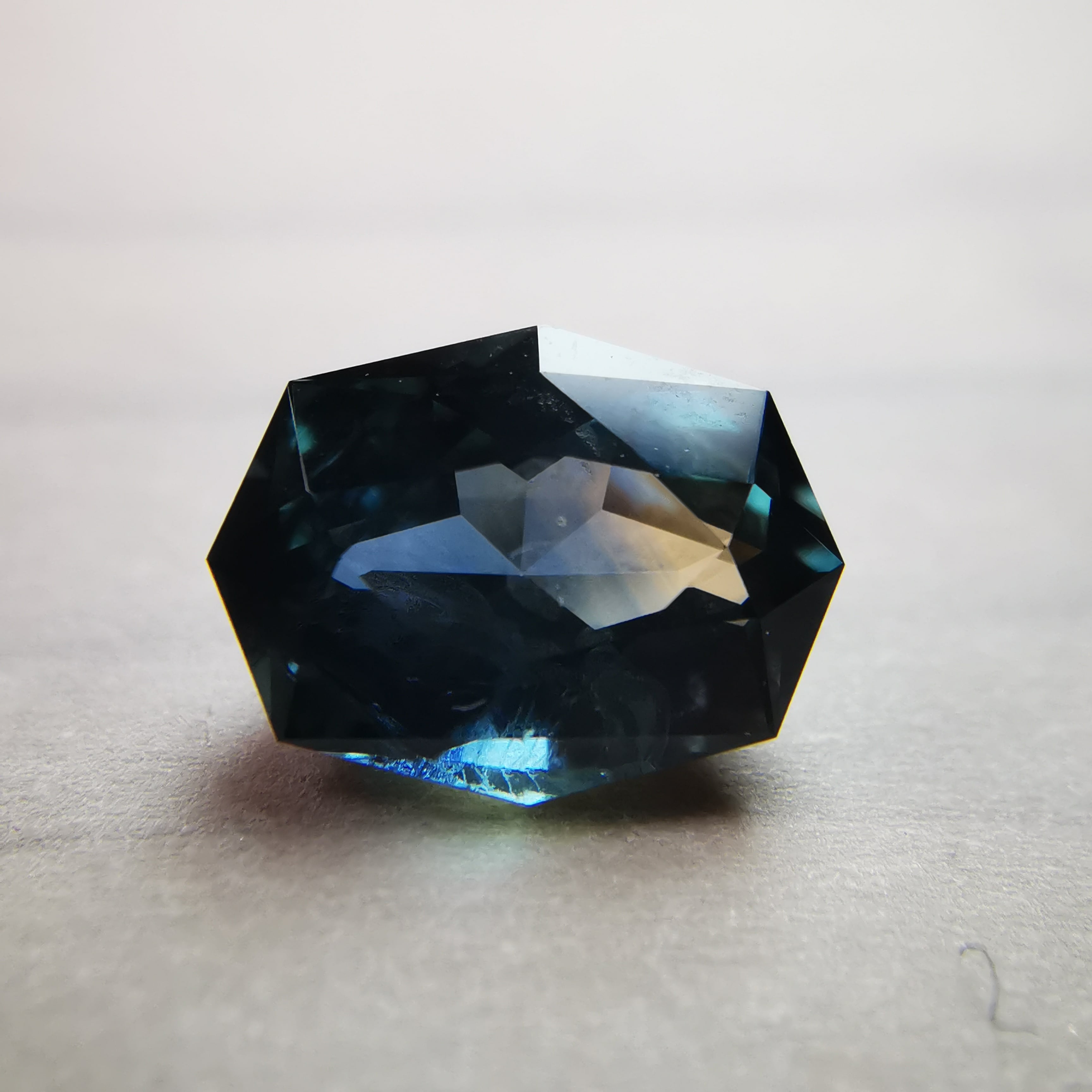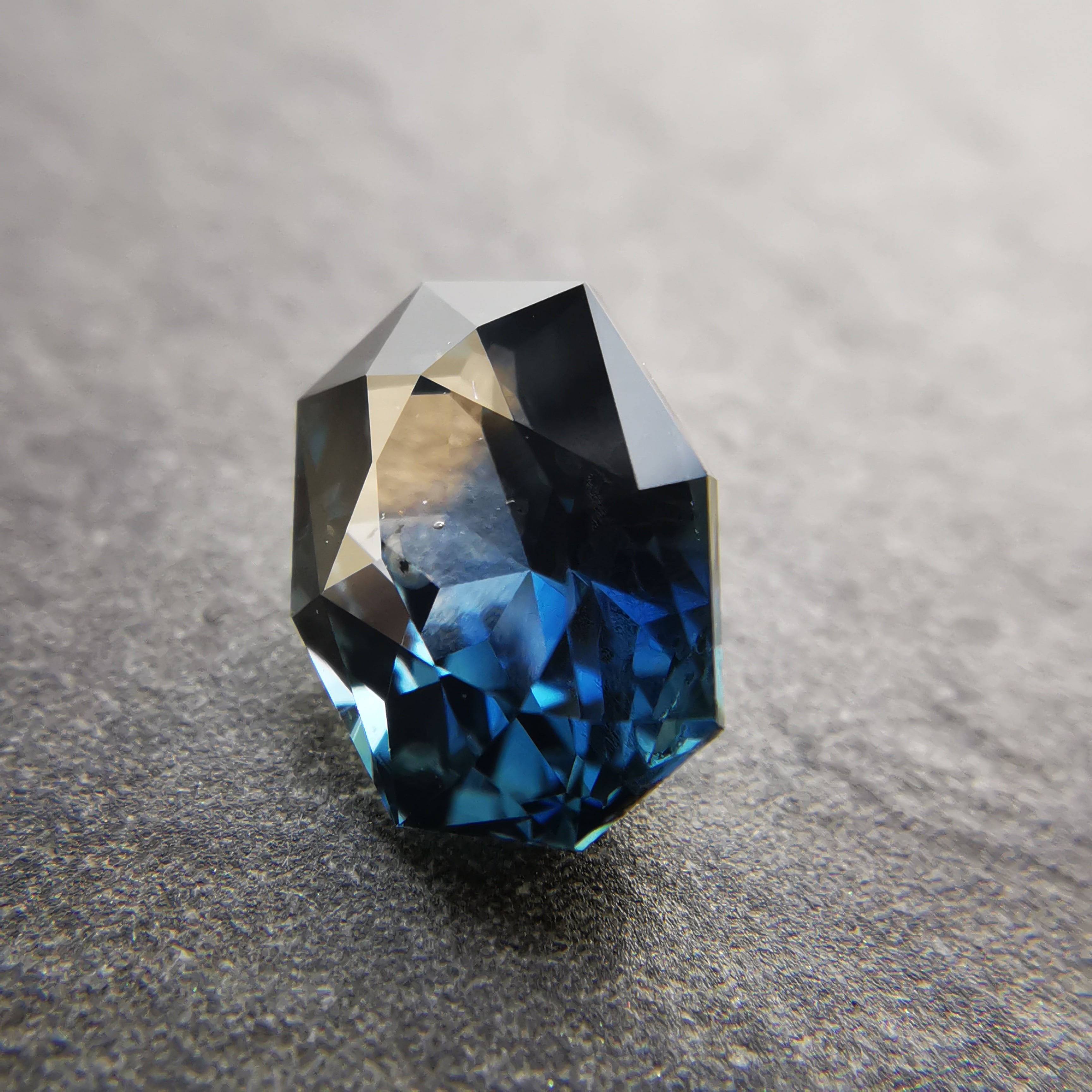 暗い青/インディゴブルーと、明るい灰みの黄赤/ピーチ色のバイカラーのサファイアです。