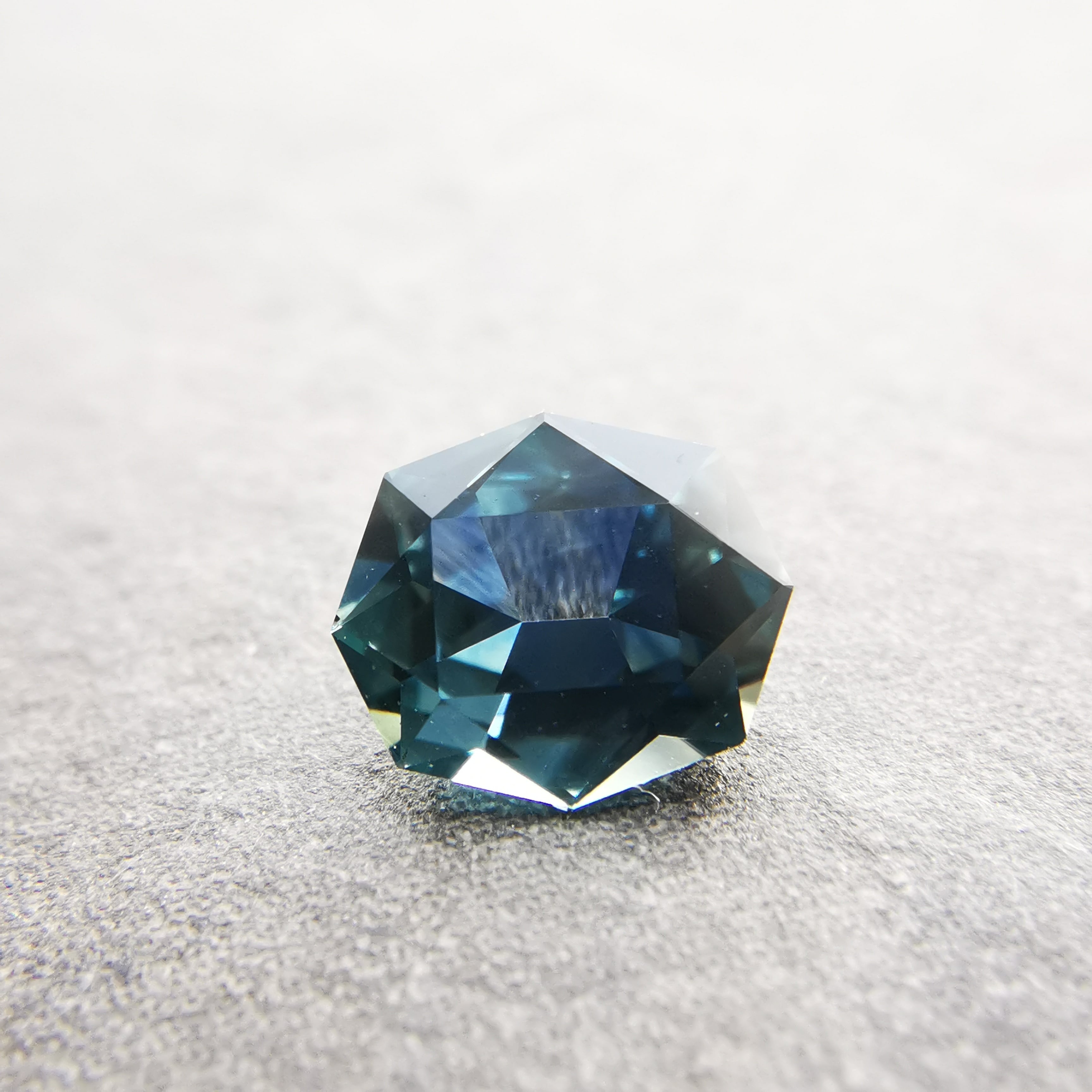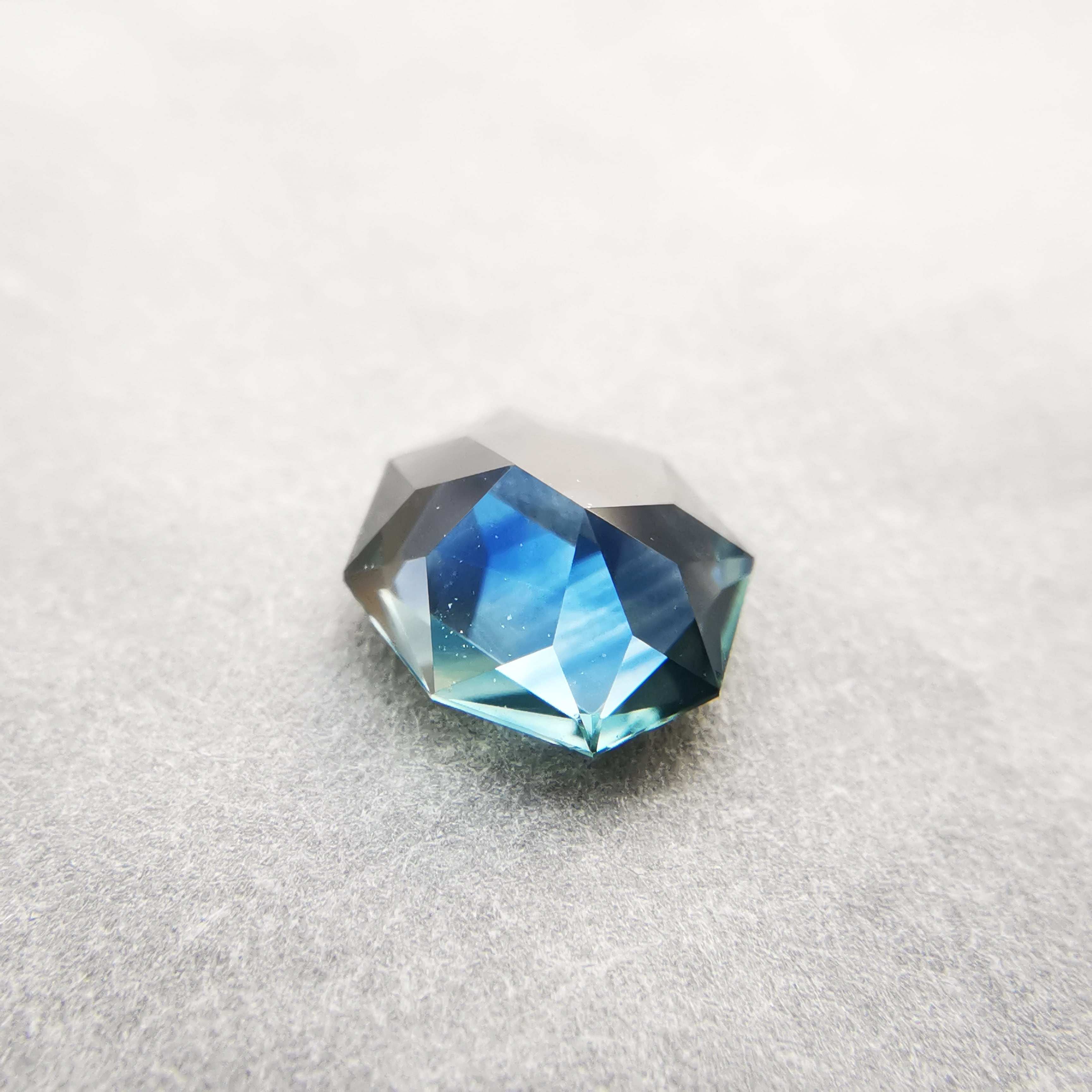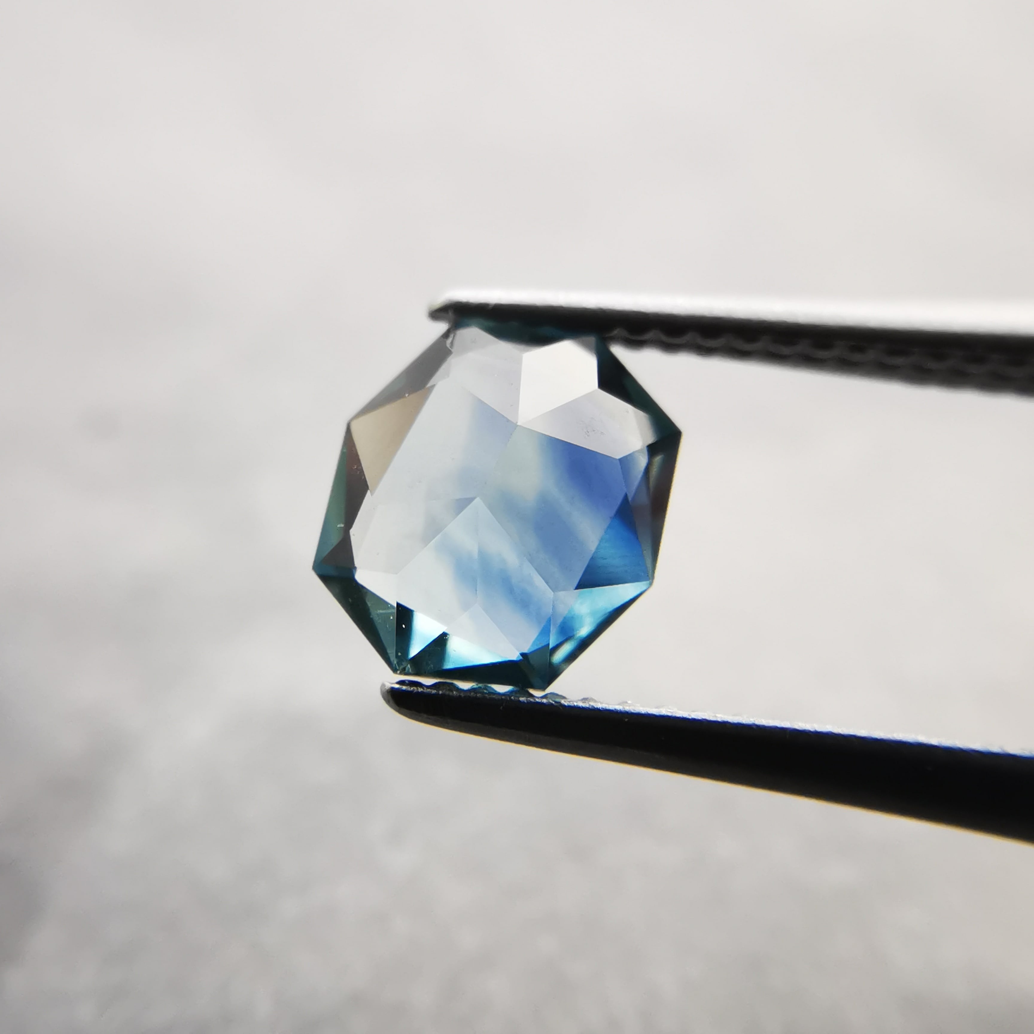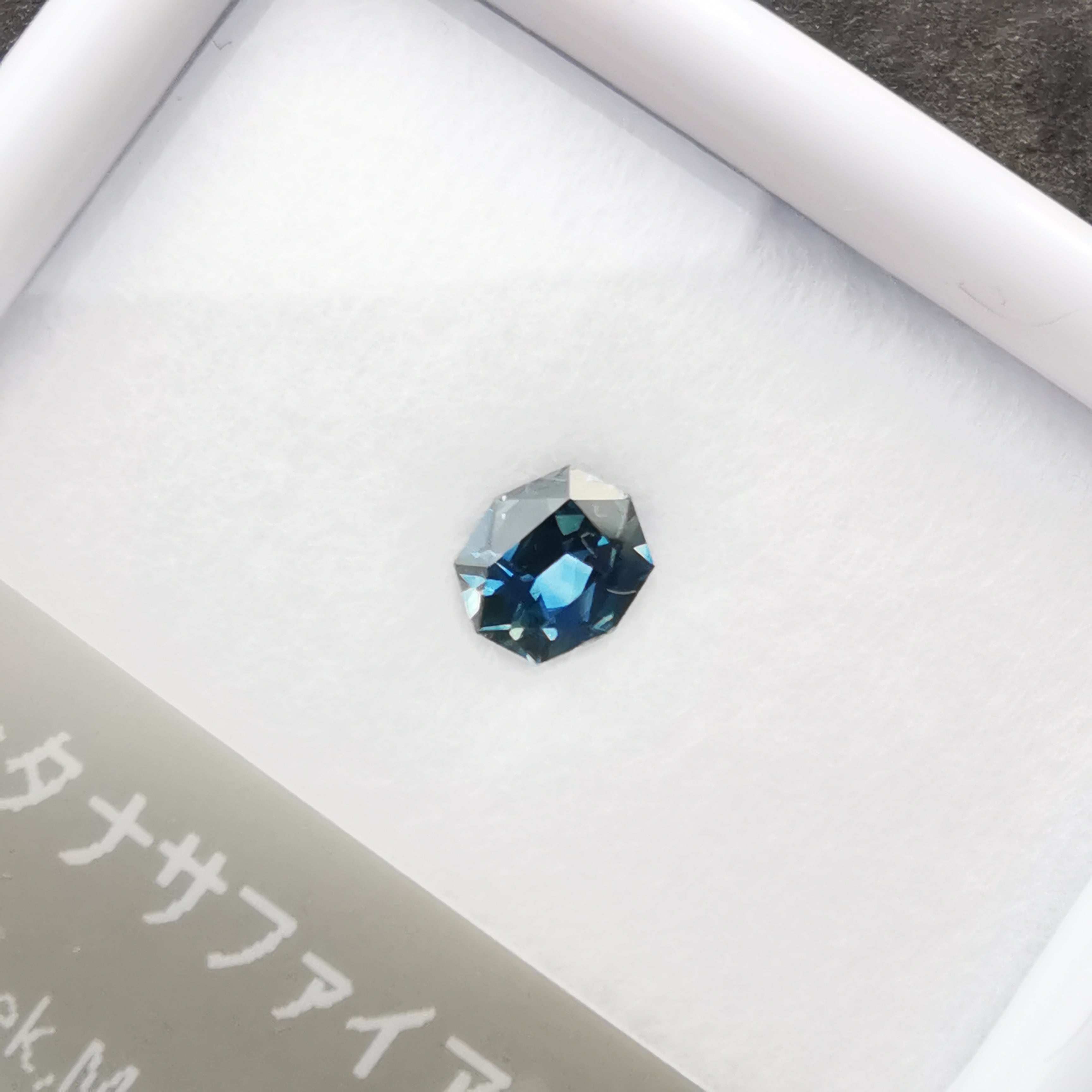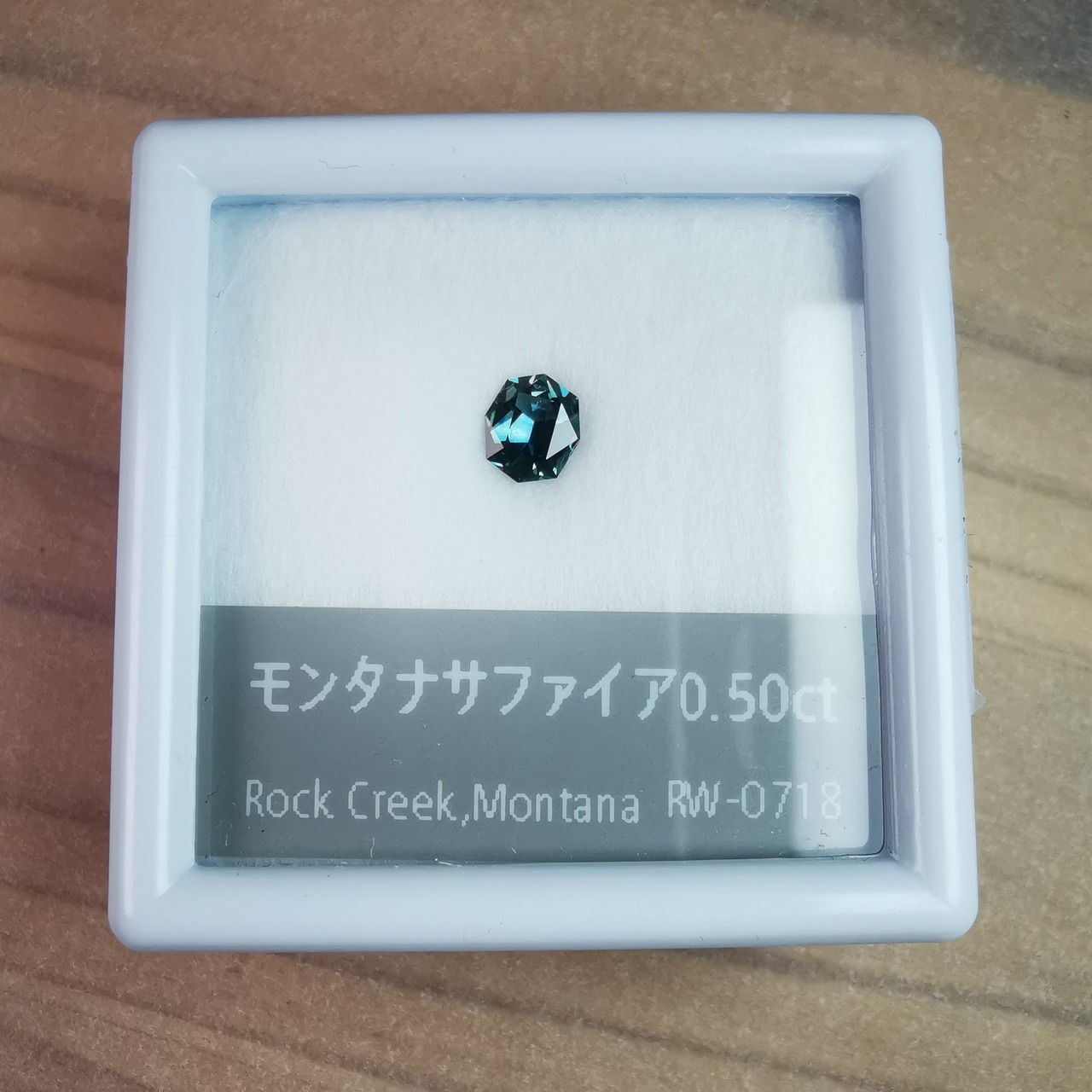 ごく淡いイエローに紺が入り、二つの色が混じり全体の印象としては錆浅葱色に見えるモンタナサファイアです。