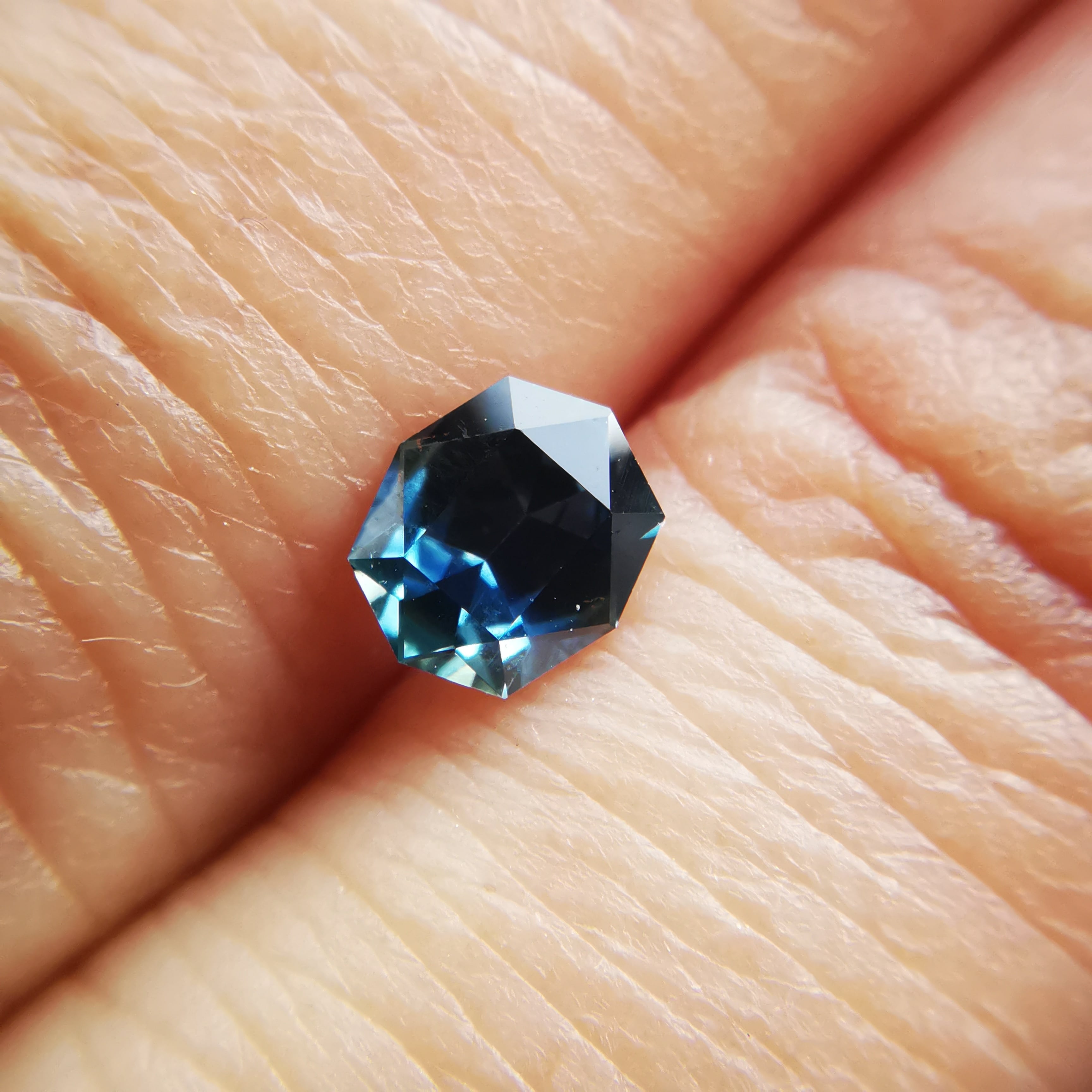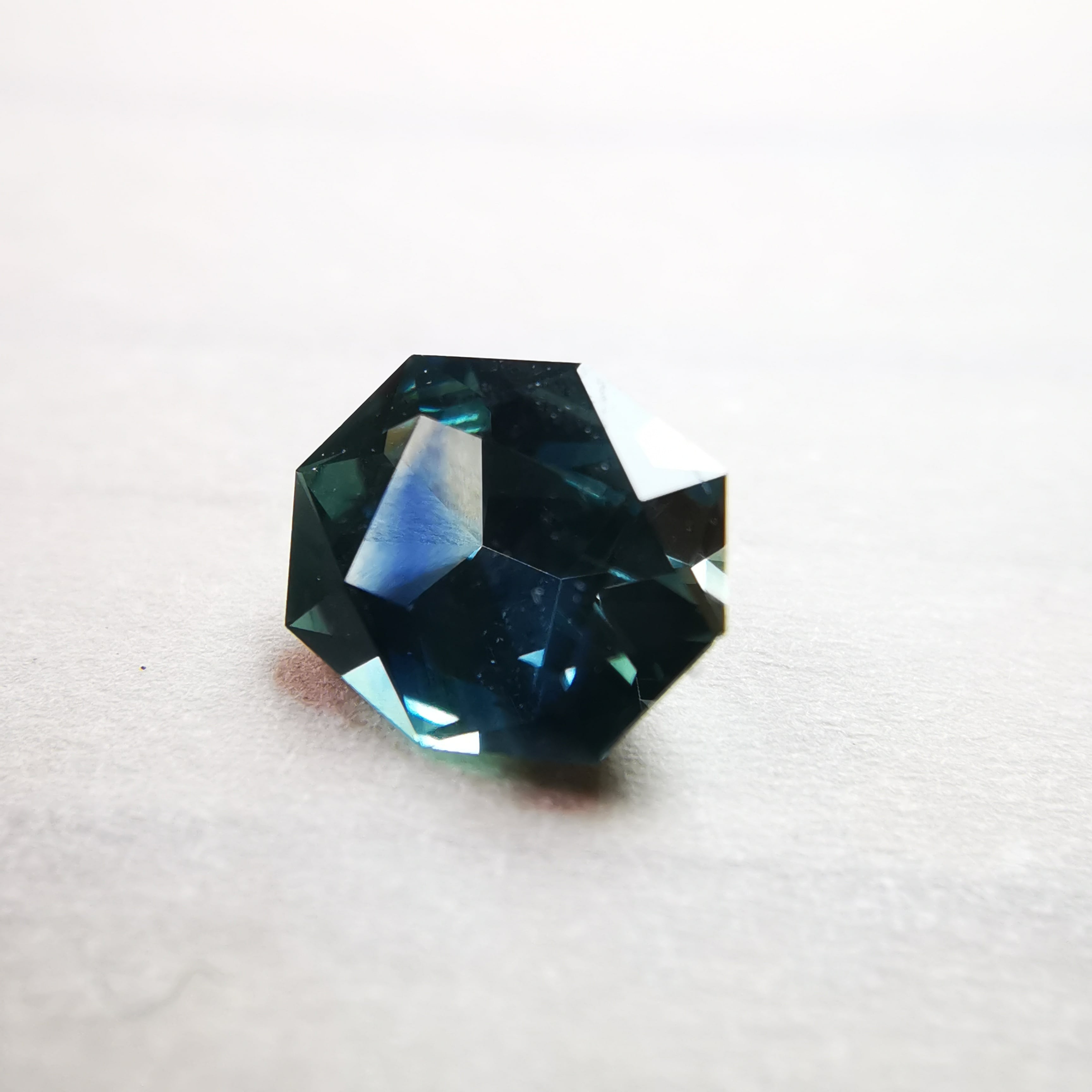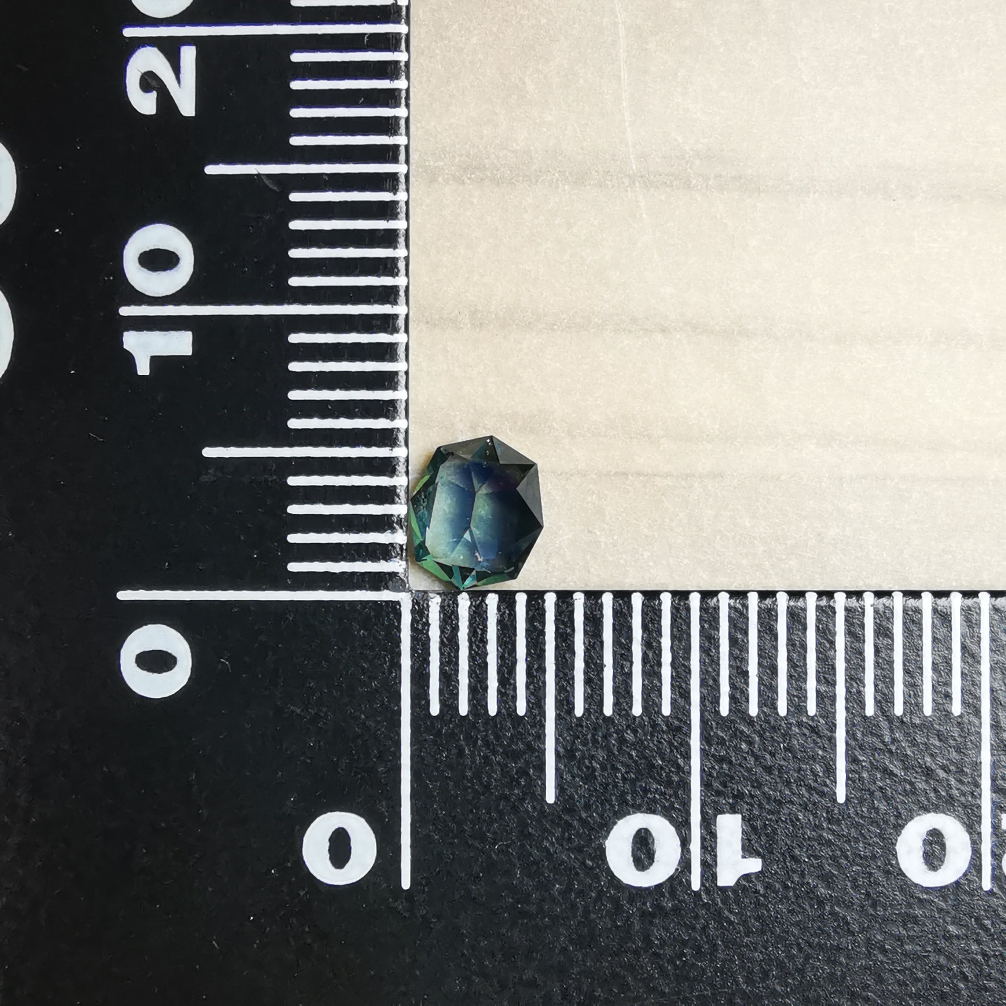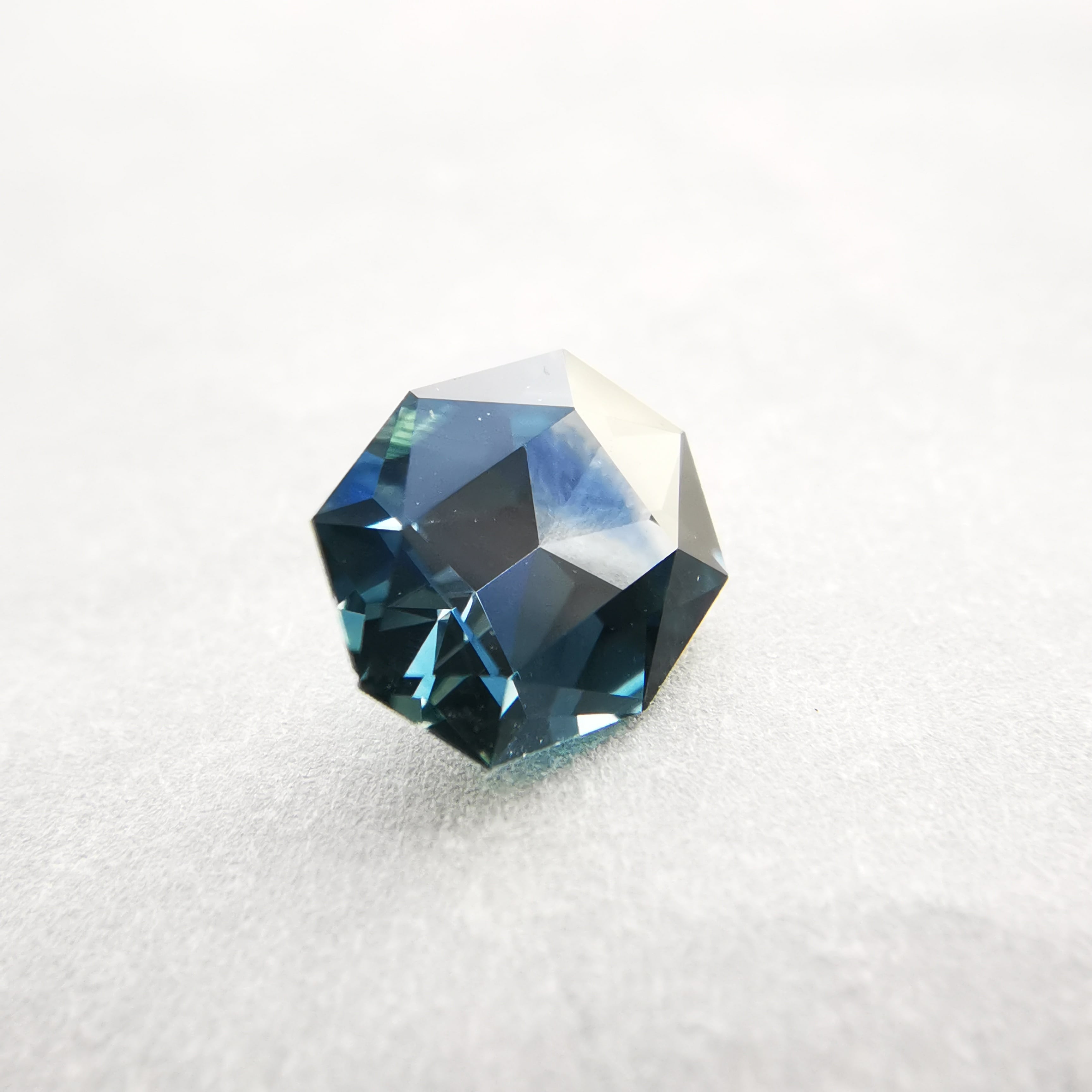 ごく淡いイエローに紺が入り、二つの色が混じり全体の印象としては錆浅葱色に見えるモンタナサファイアです。
