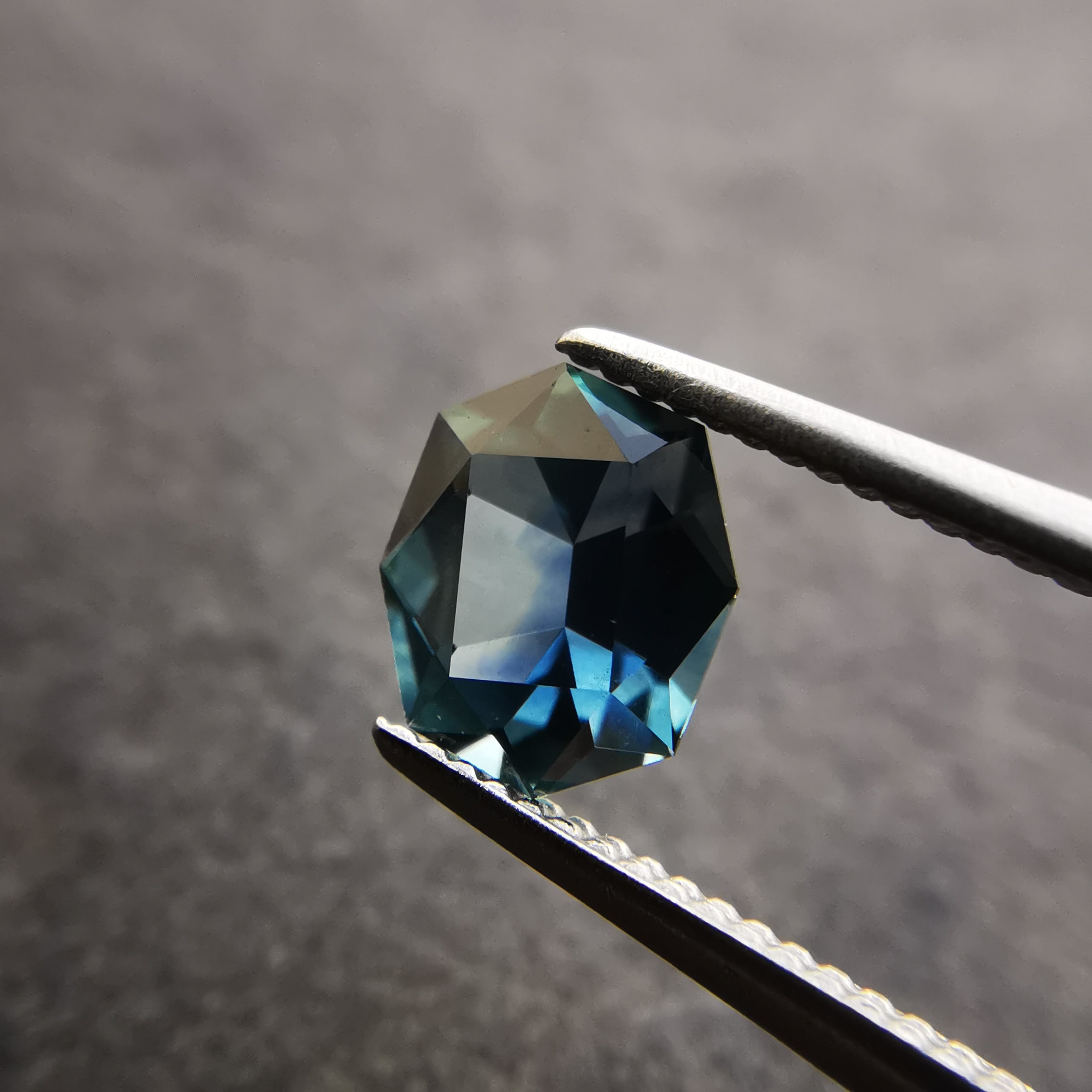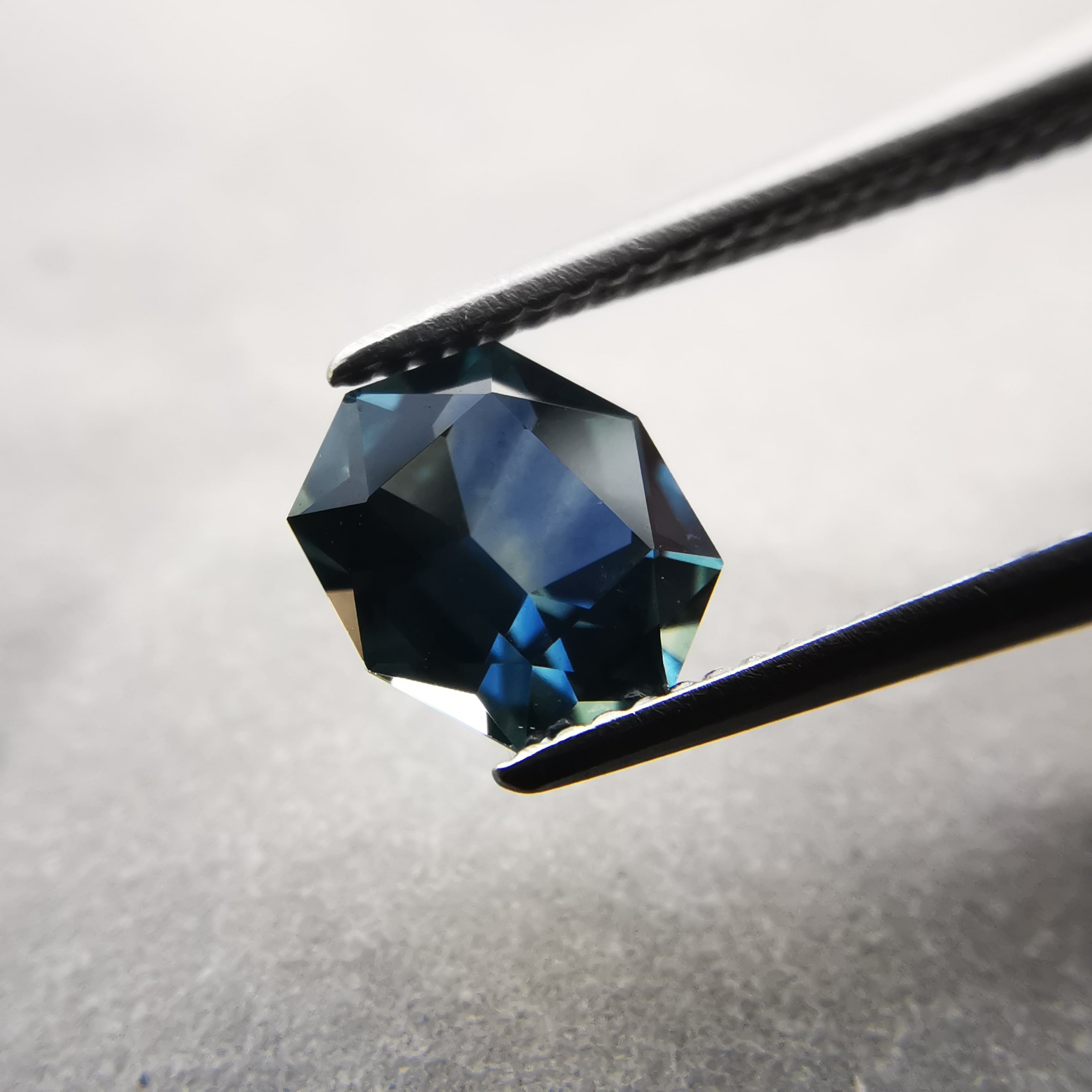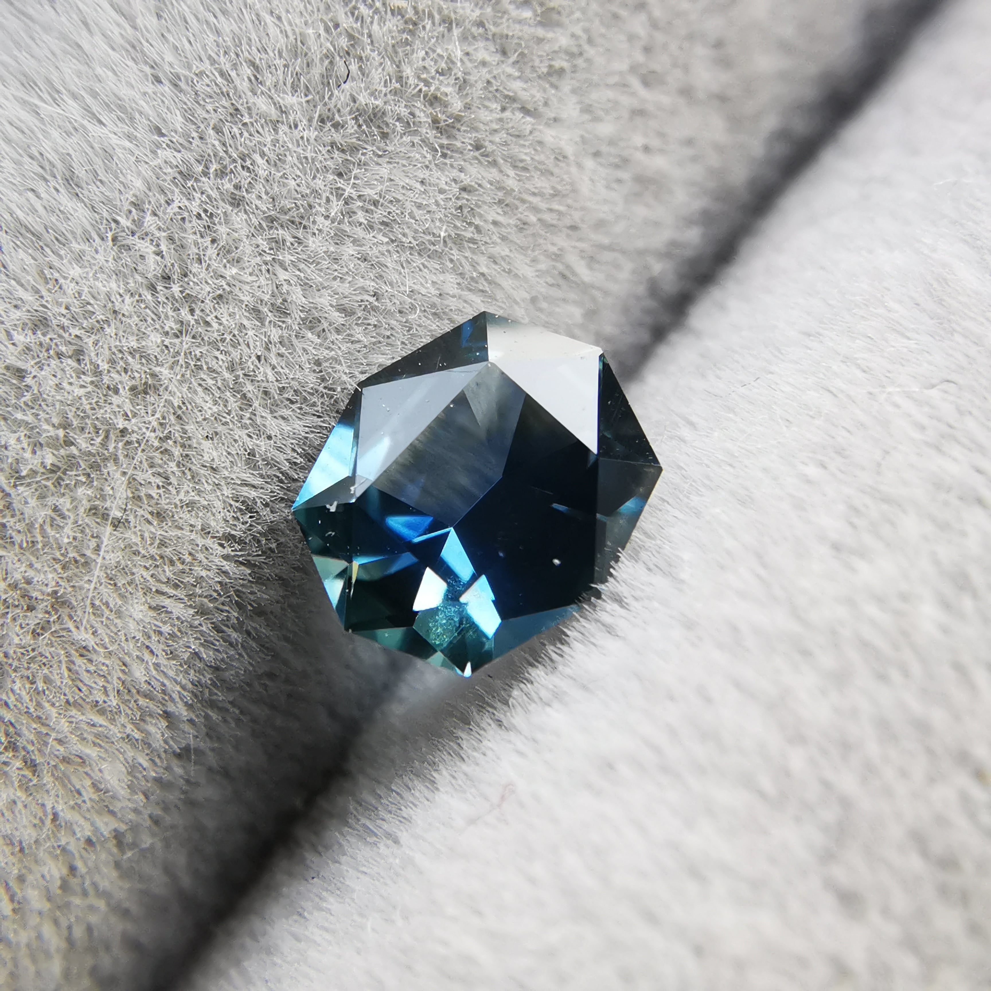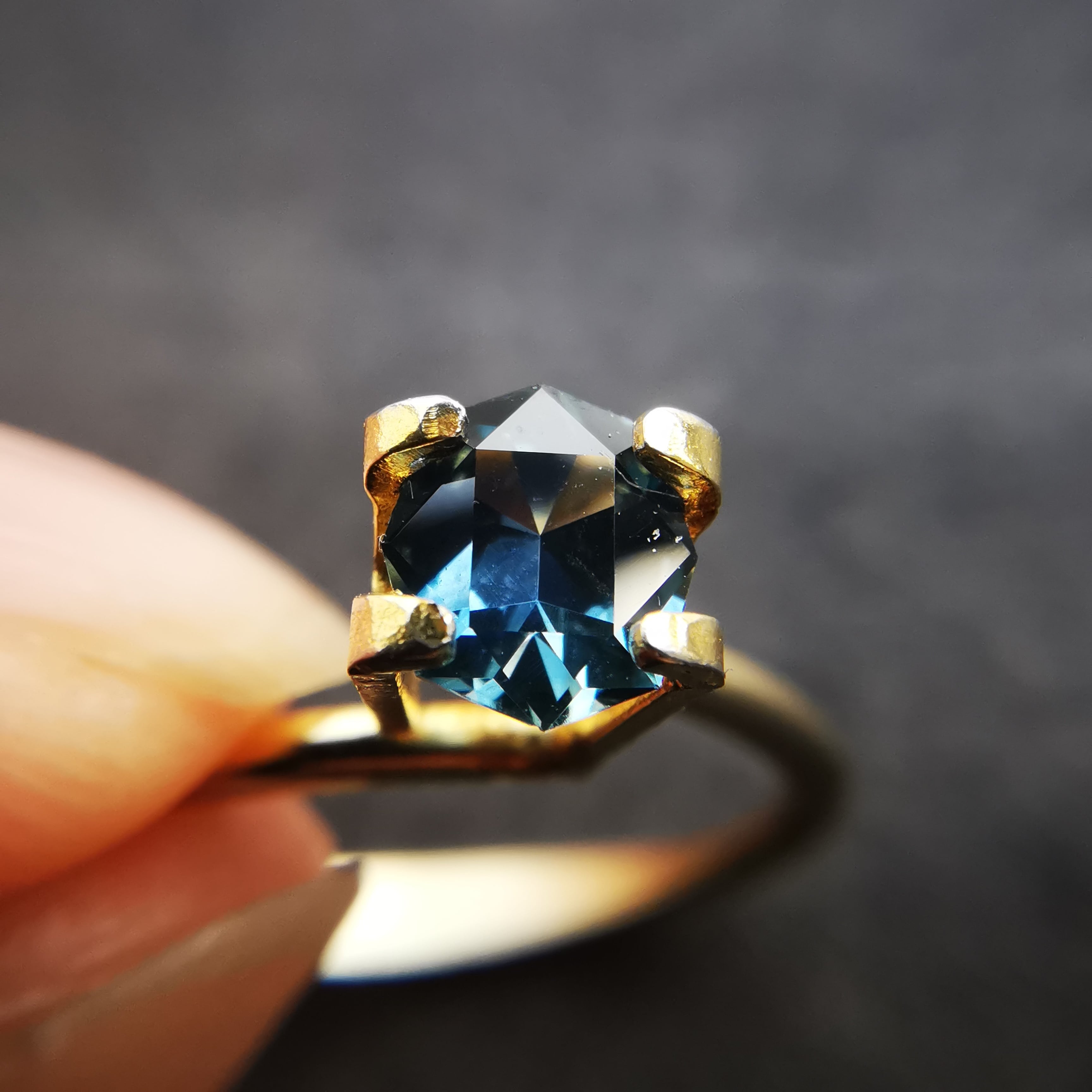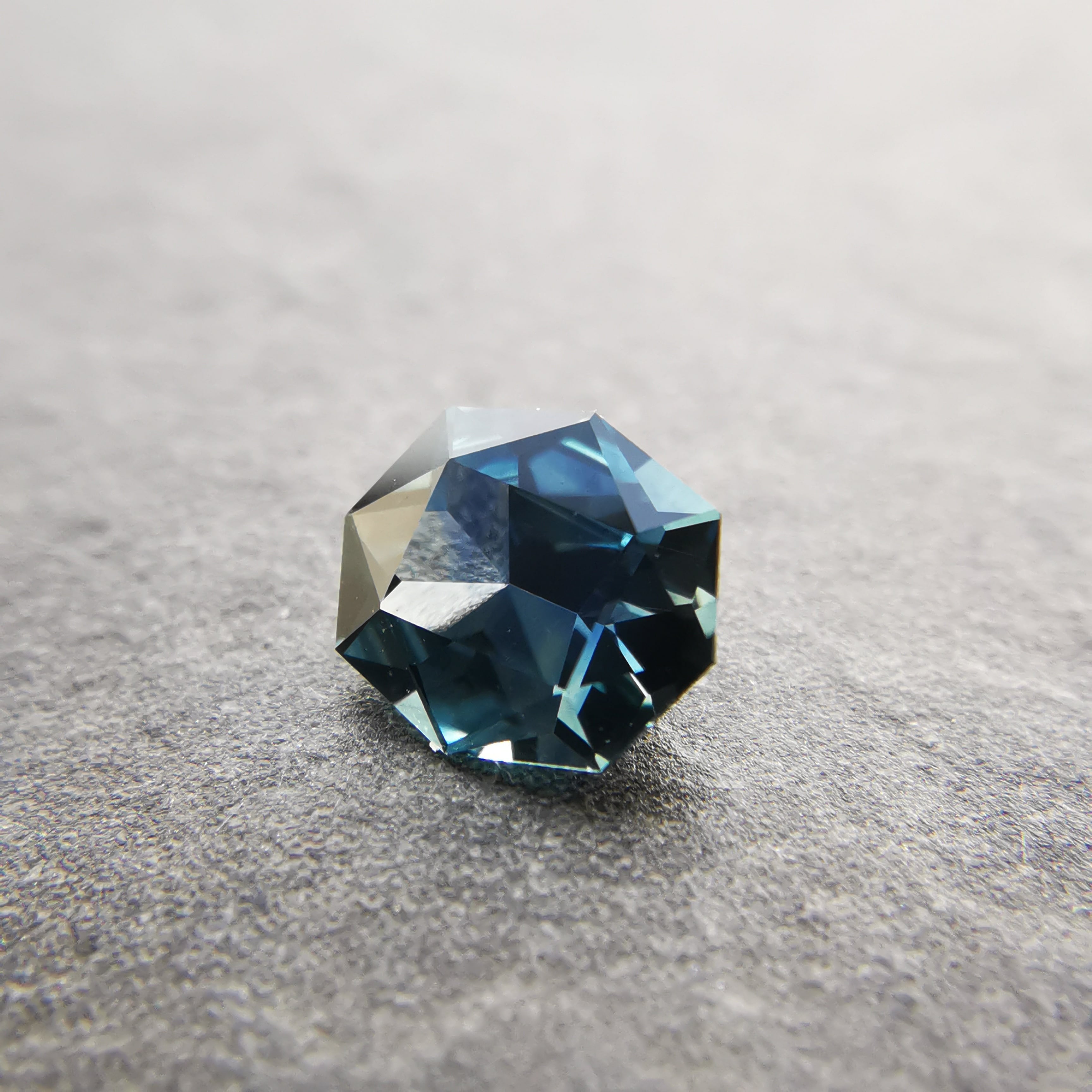 ごく淡いイエローに紺が入り、二つの色が混じり全体の印象としては錆浅葱色に見えるモンタナサファイアです。