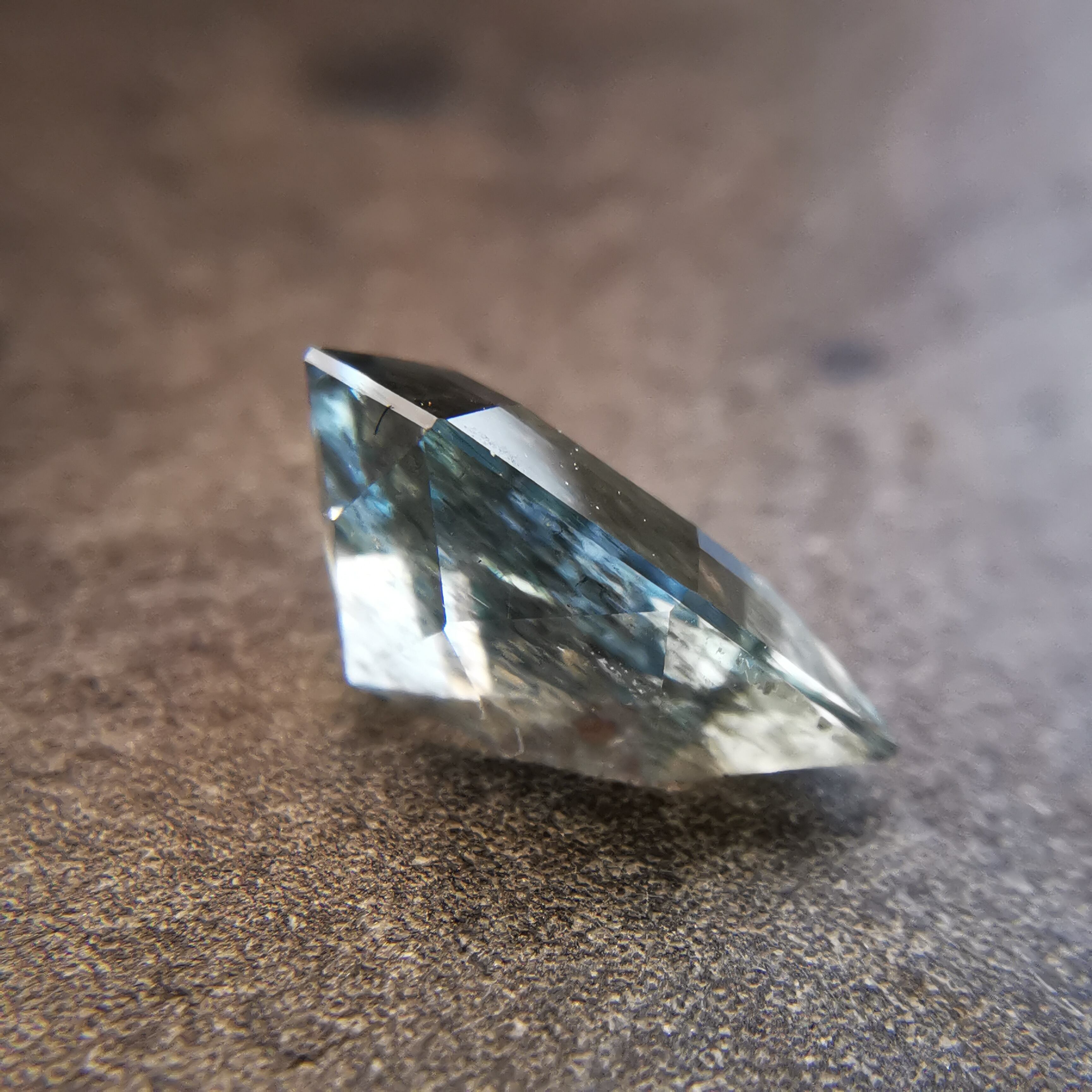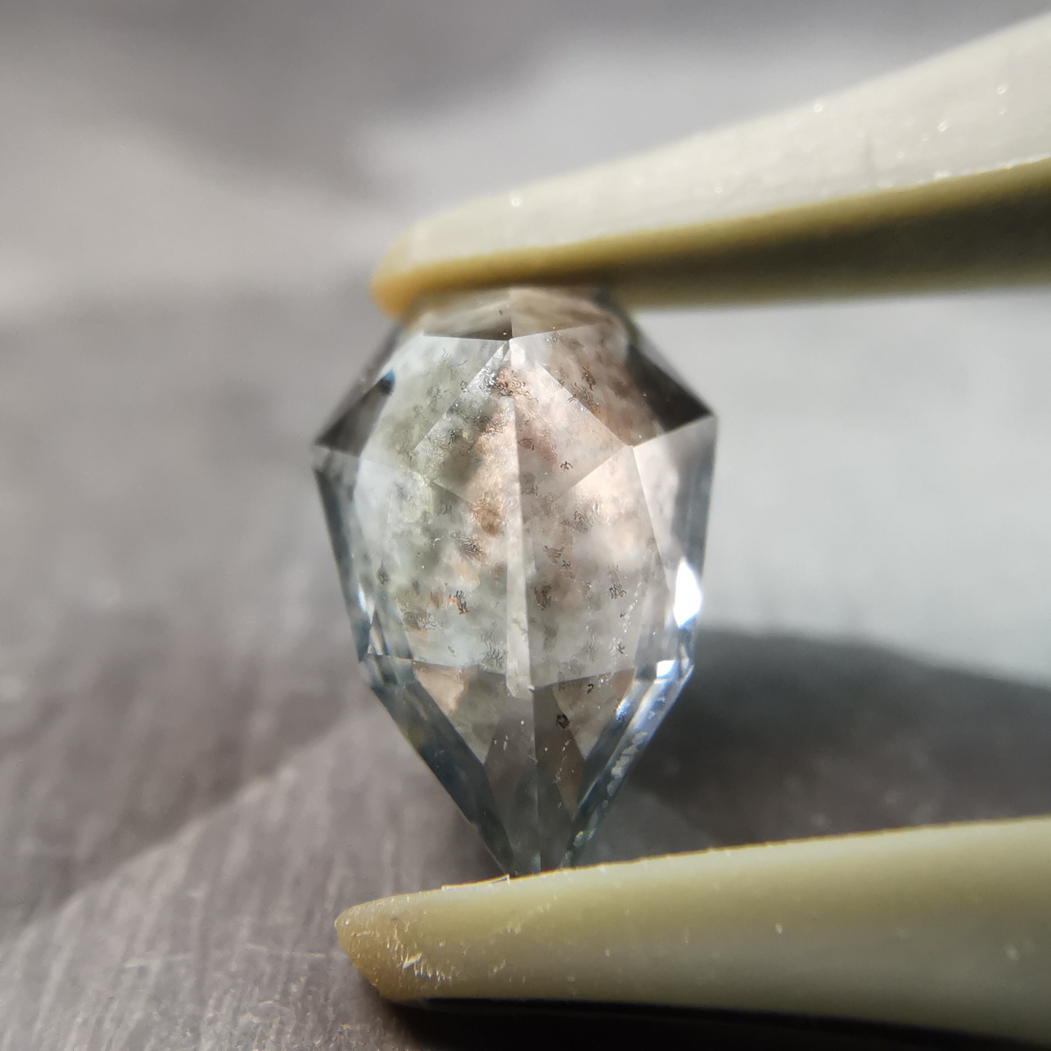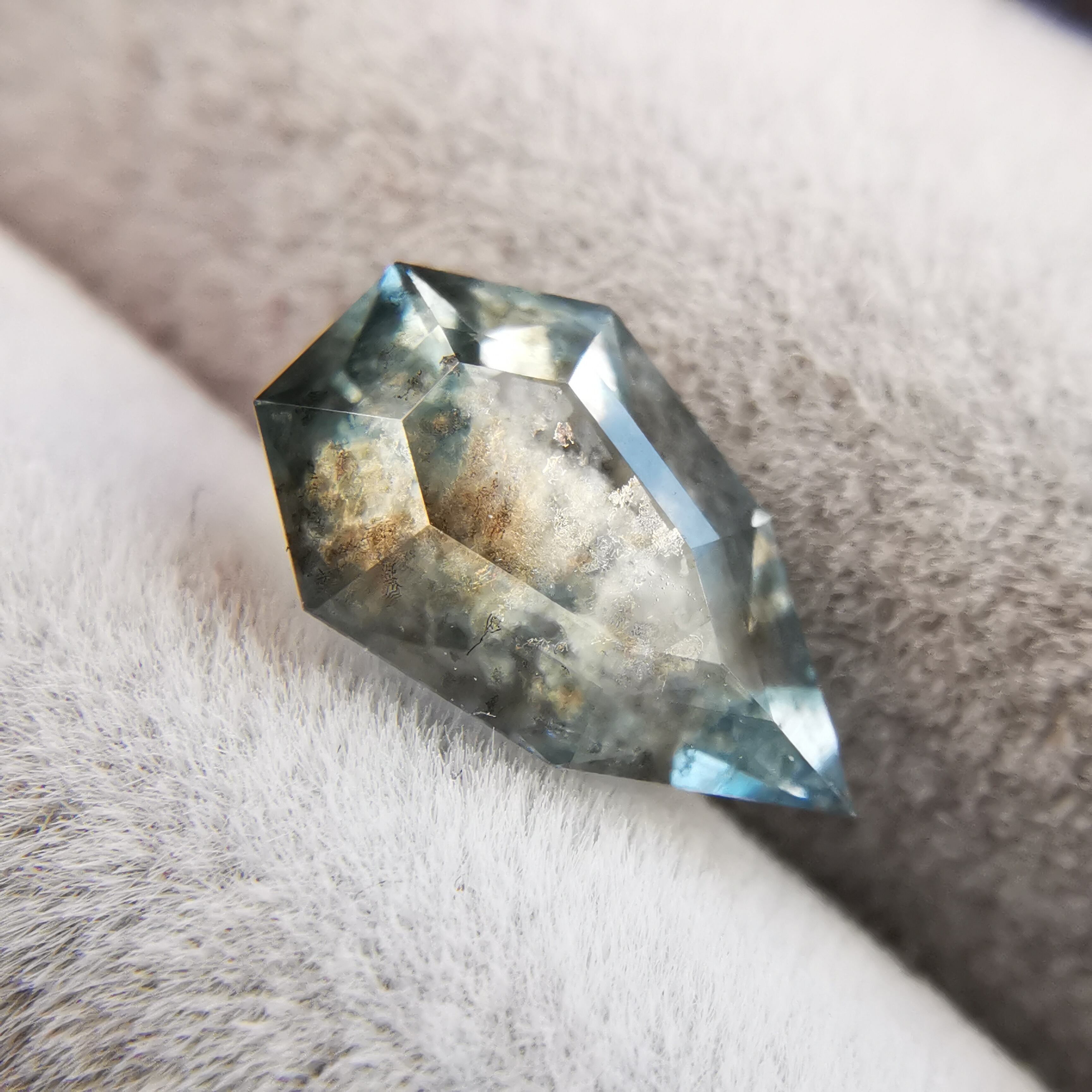 淡い水色に、黒い斑状の内包物がたっぷり入ったアクアマリンです。