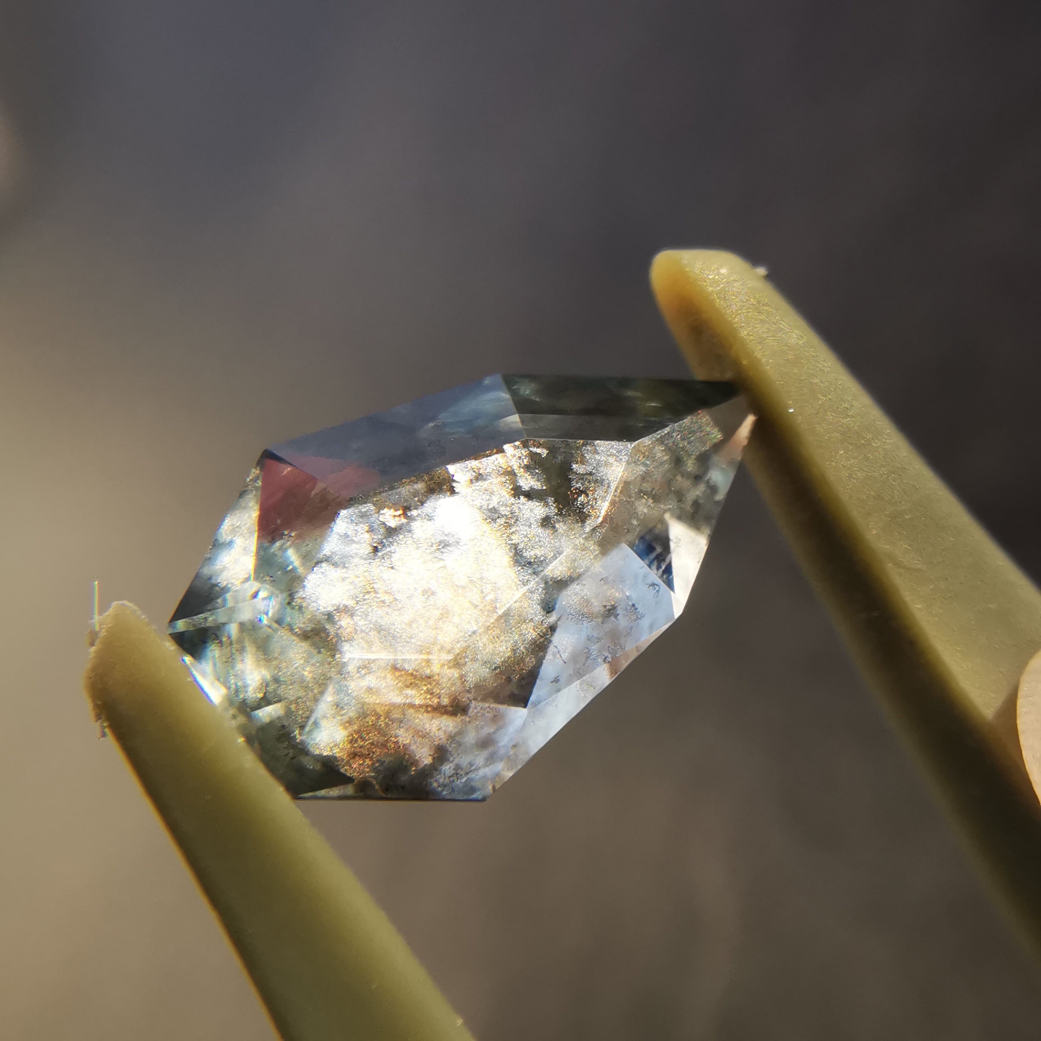 とても寒い日に、窓を覆う窓霜のような模様を描く内包物は、光が当たると、シャンパンゴールドにきらめき、冬の朝のような柔らかな光で魅了します。
