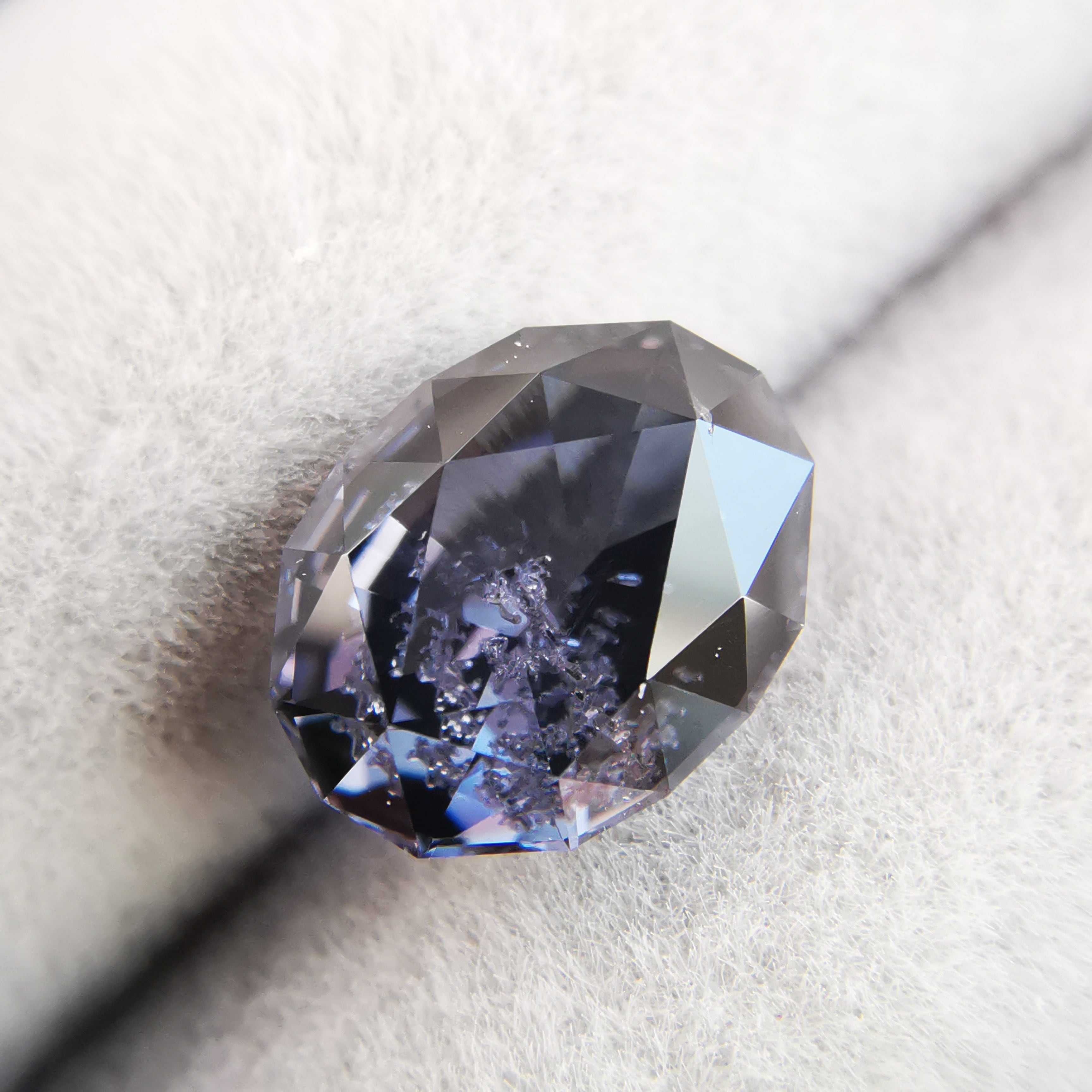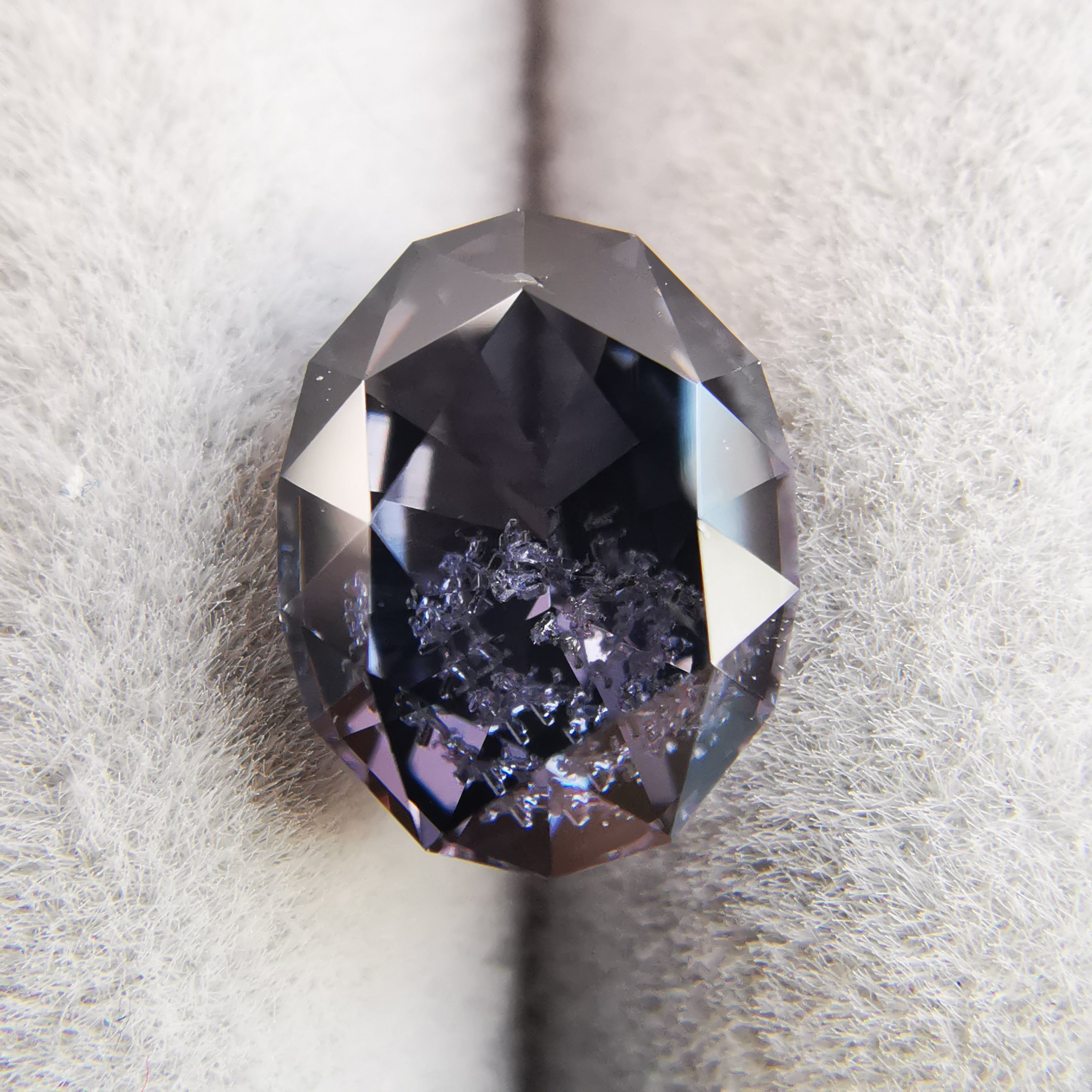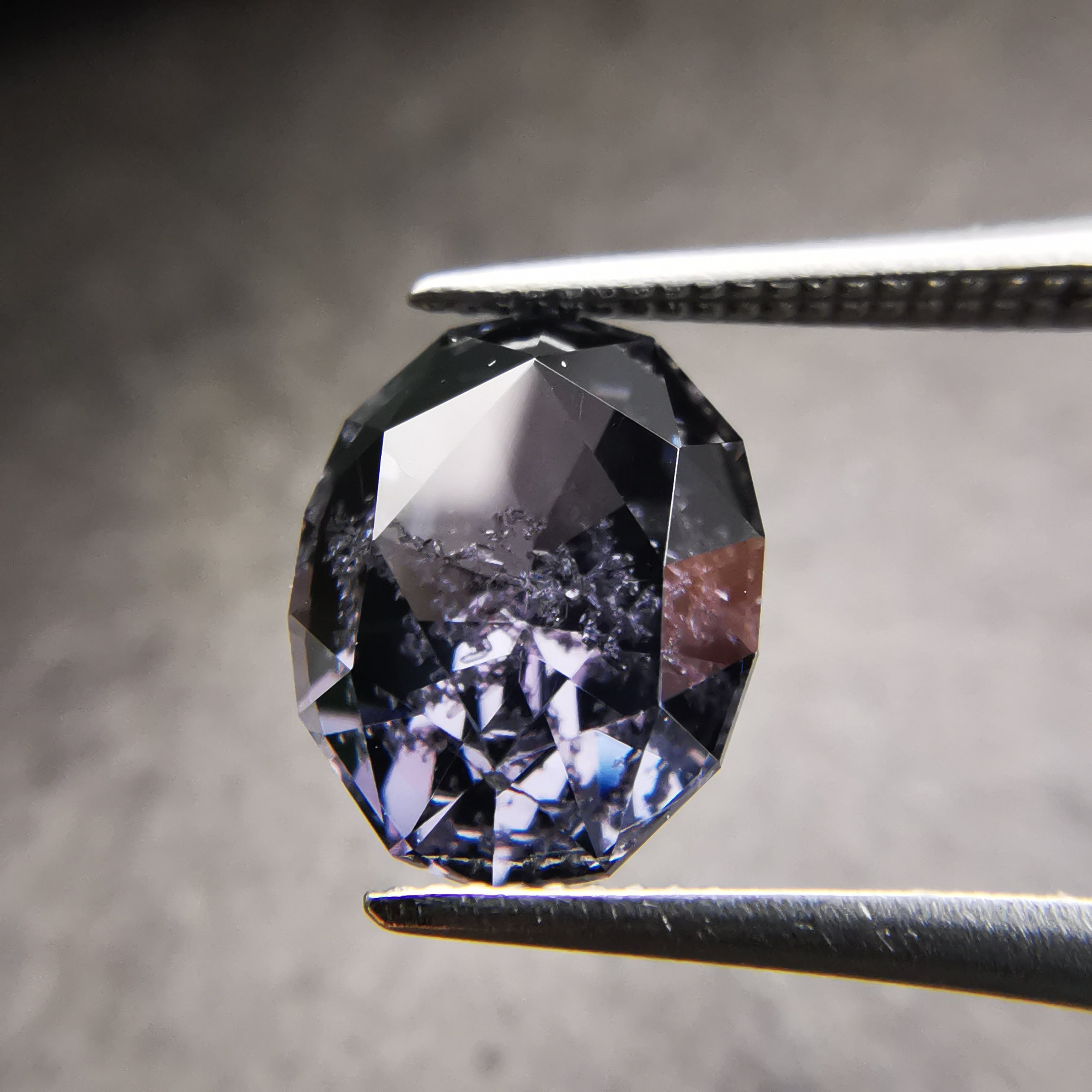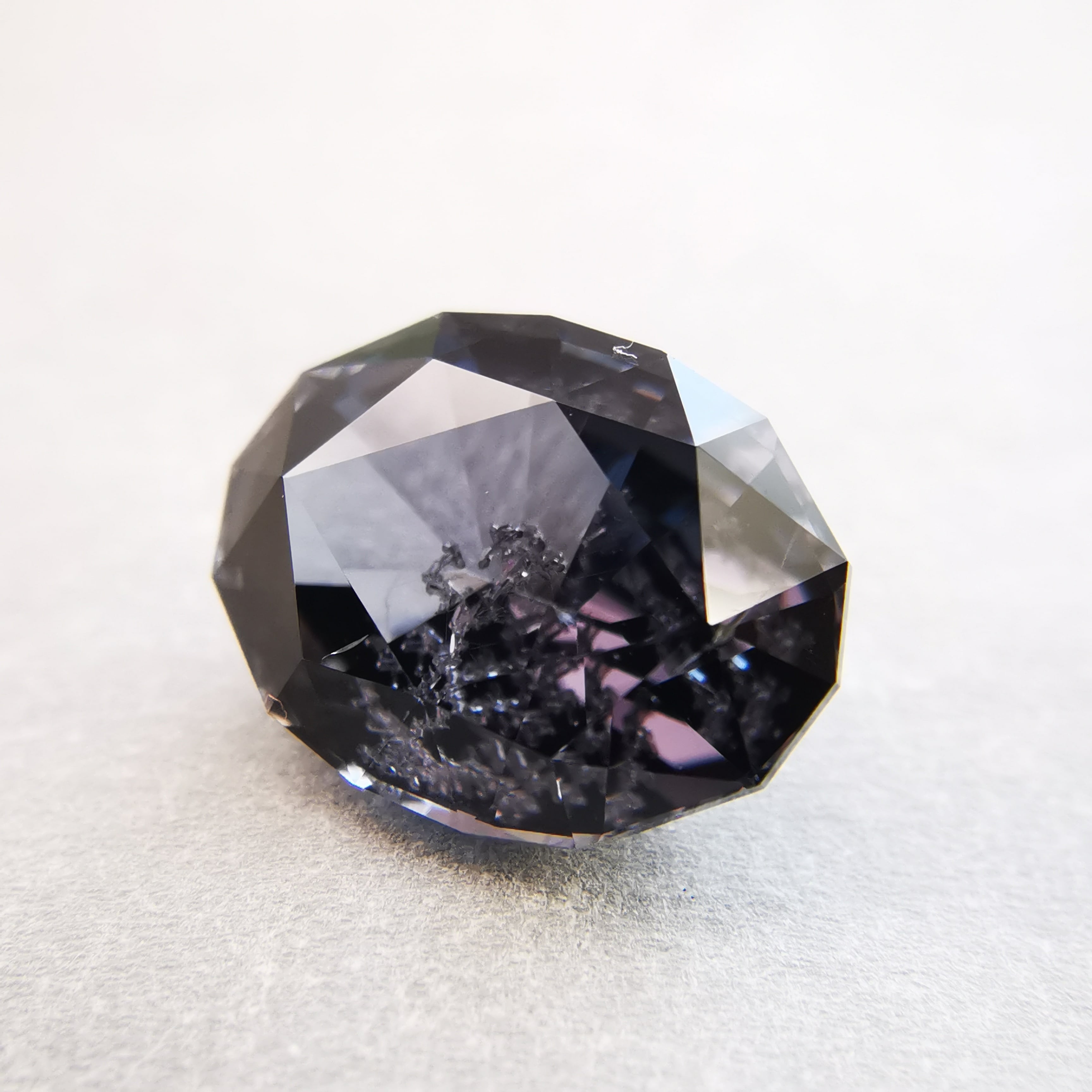 無彩色に近い、暗い灰みの紫/滅紫色のスピネルです。