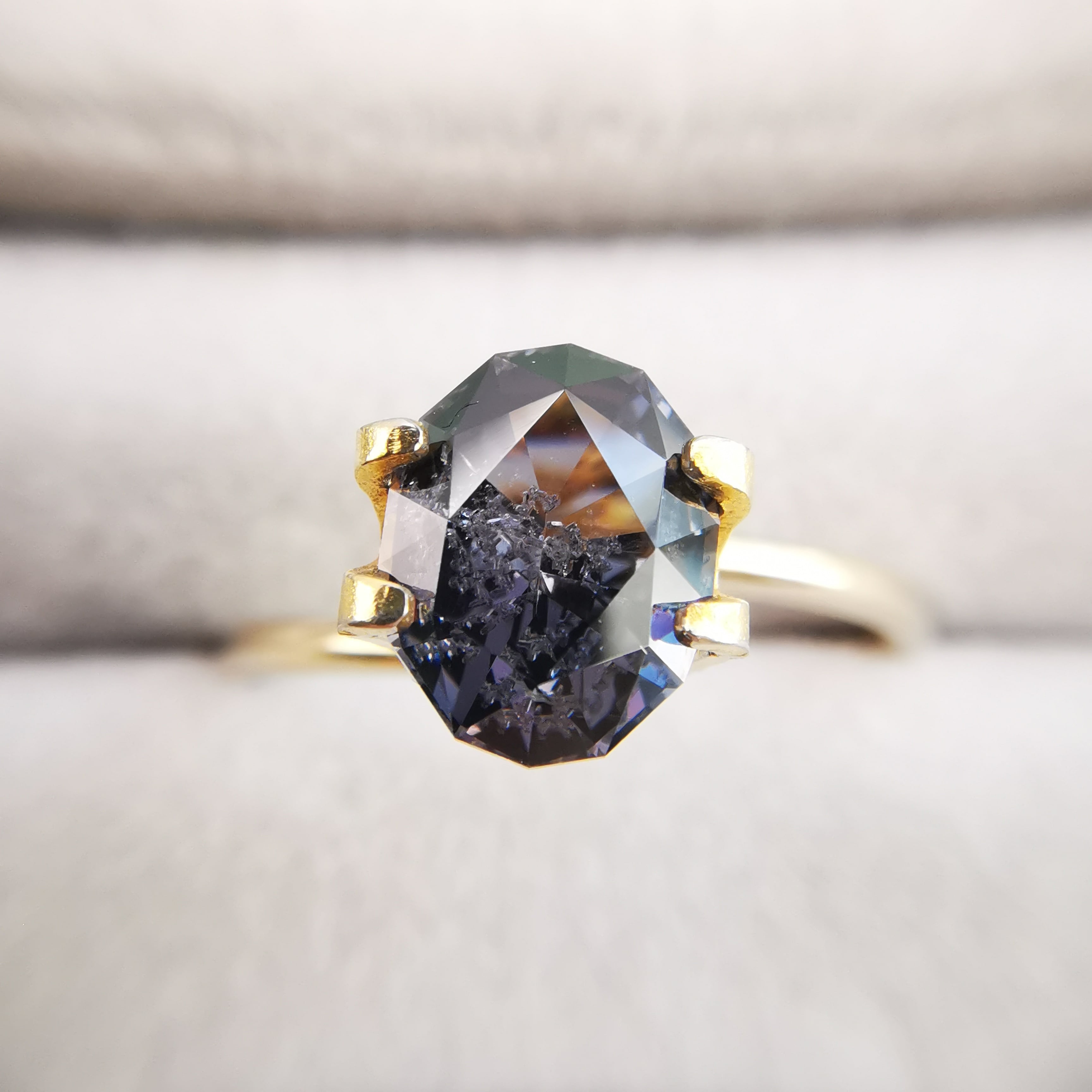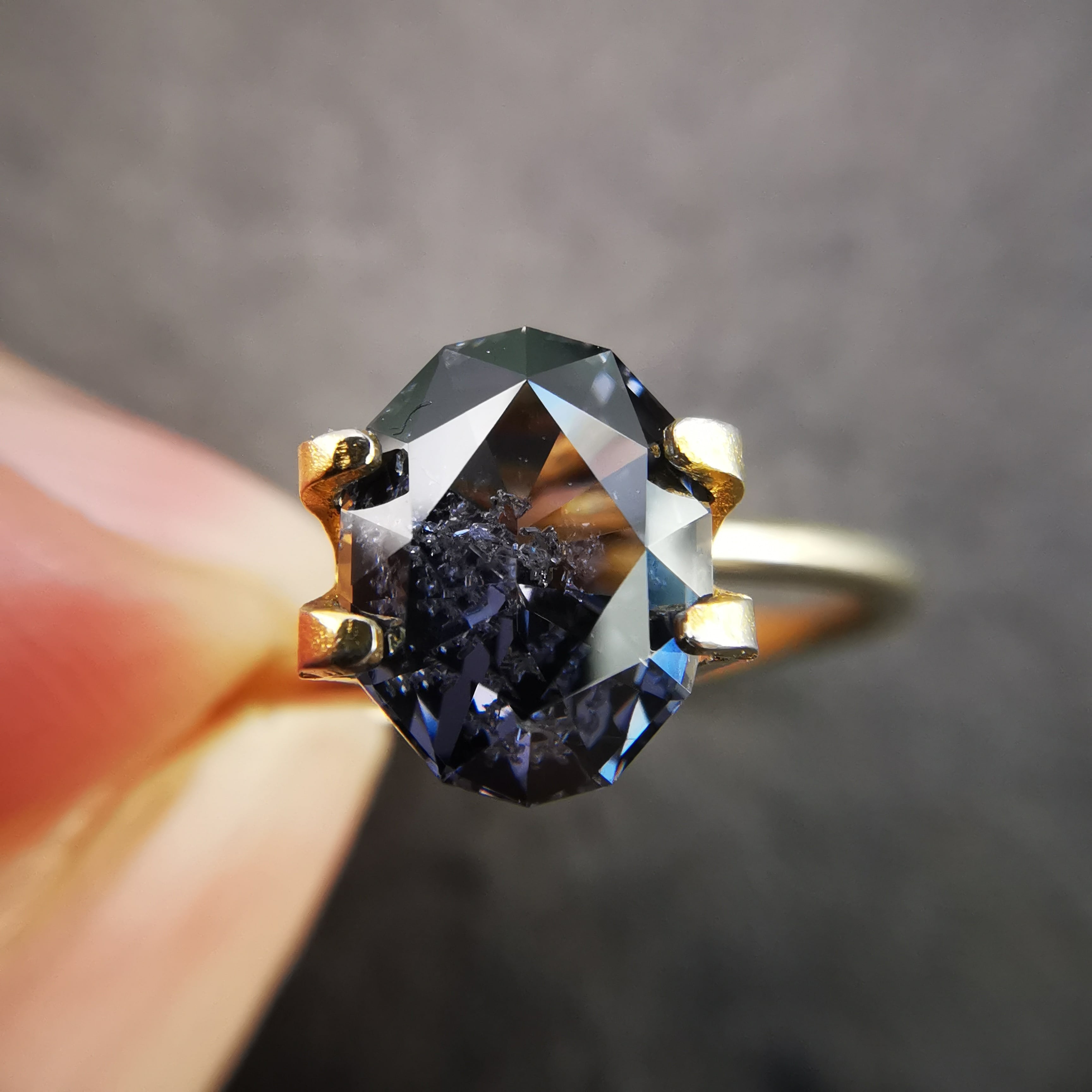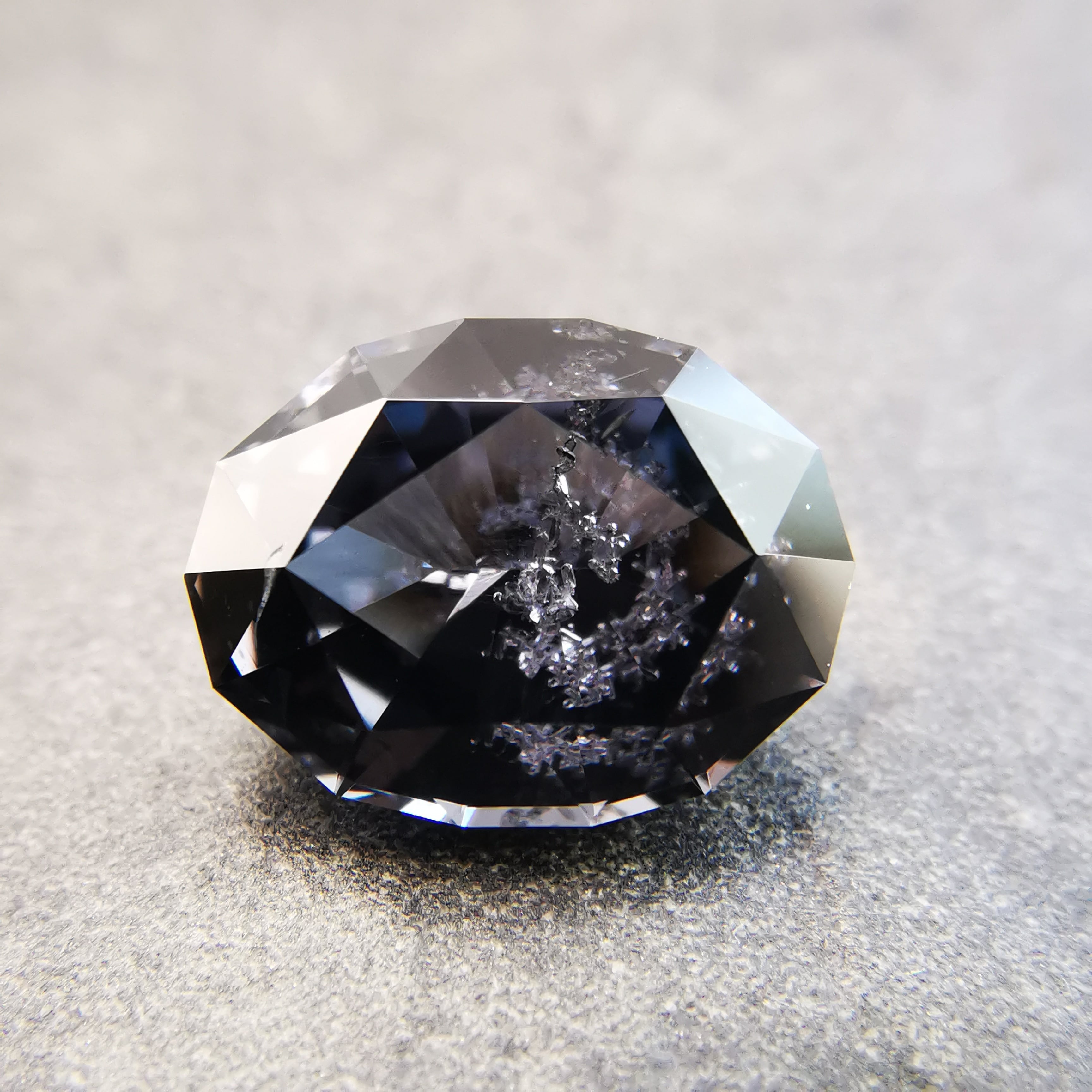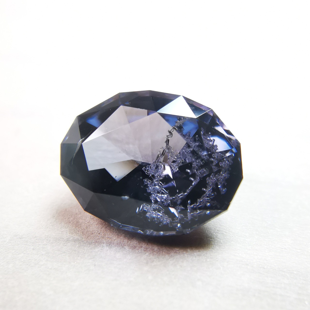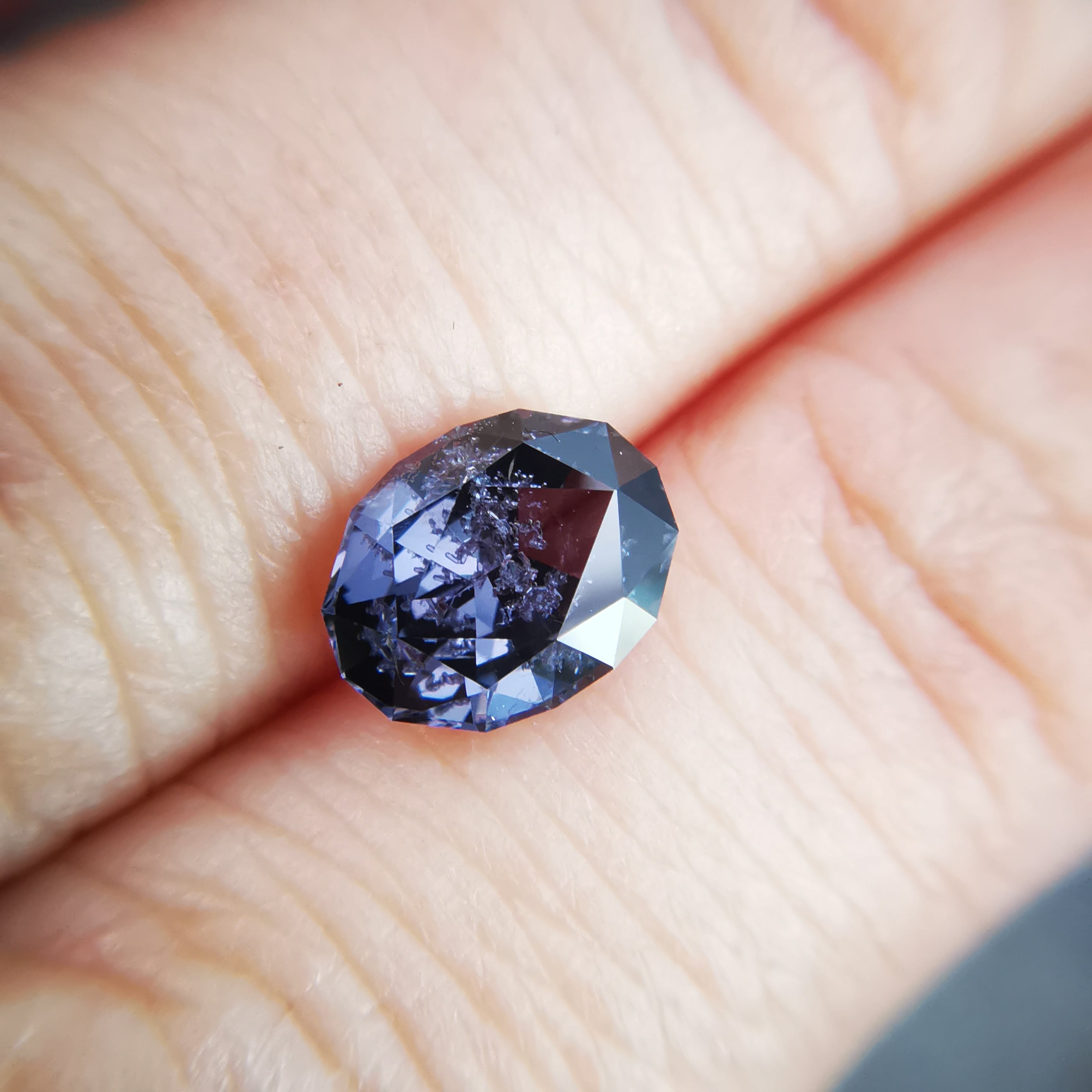 無彩色に近い、暗い灰みの紫/滅紫色のスピネルです。