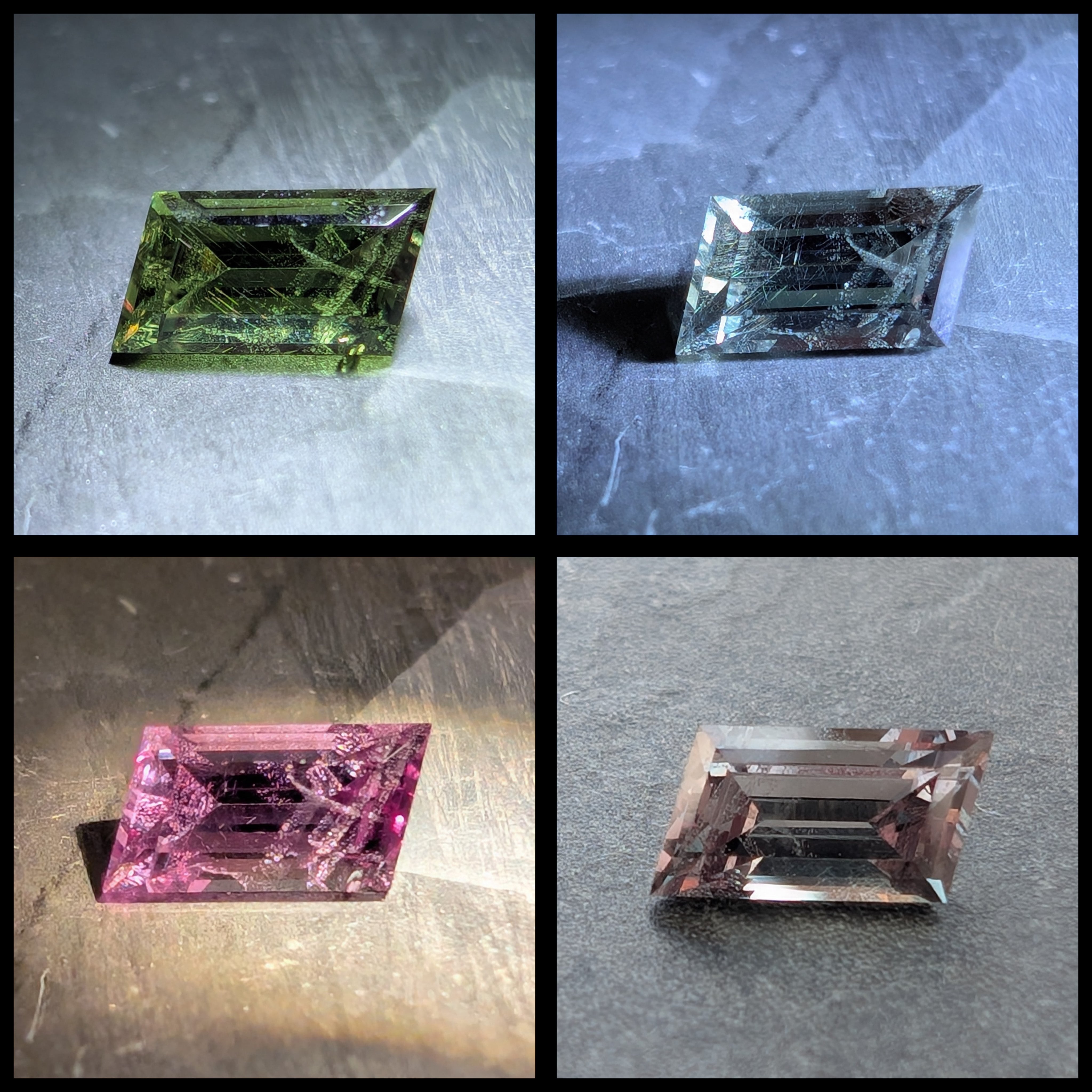 左上から時計回りで、LEDペンライト、LEDペンライト、自然光日陰、電球ペンライトです。