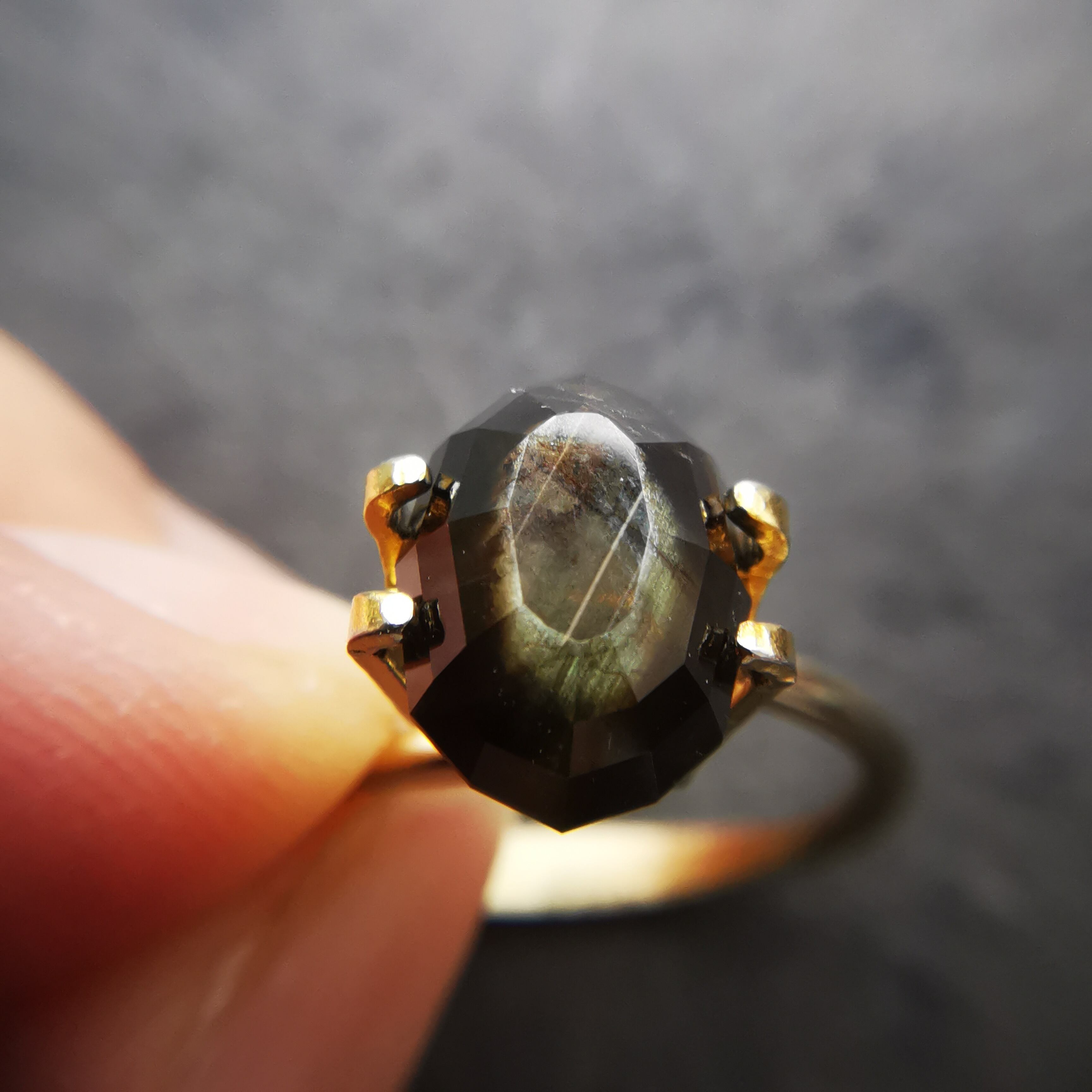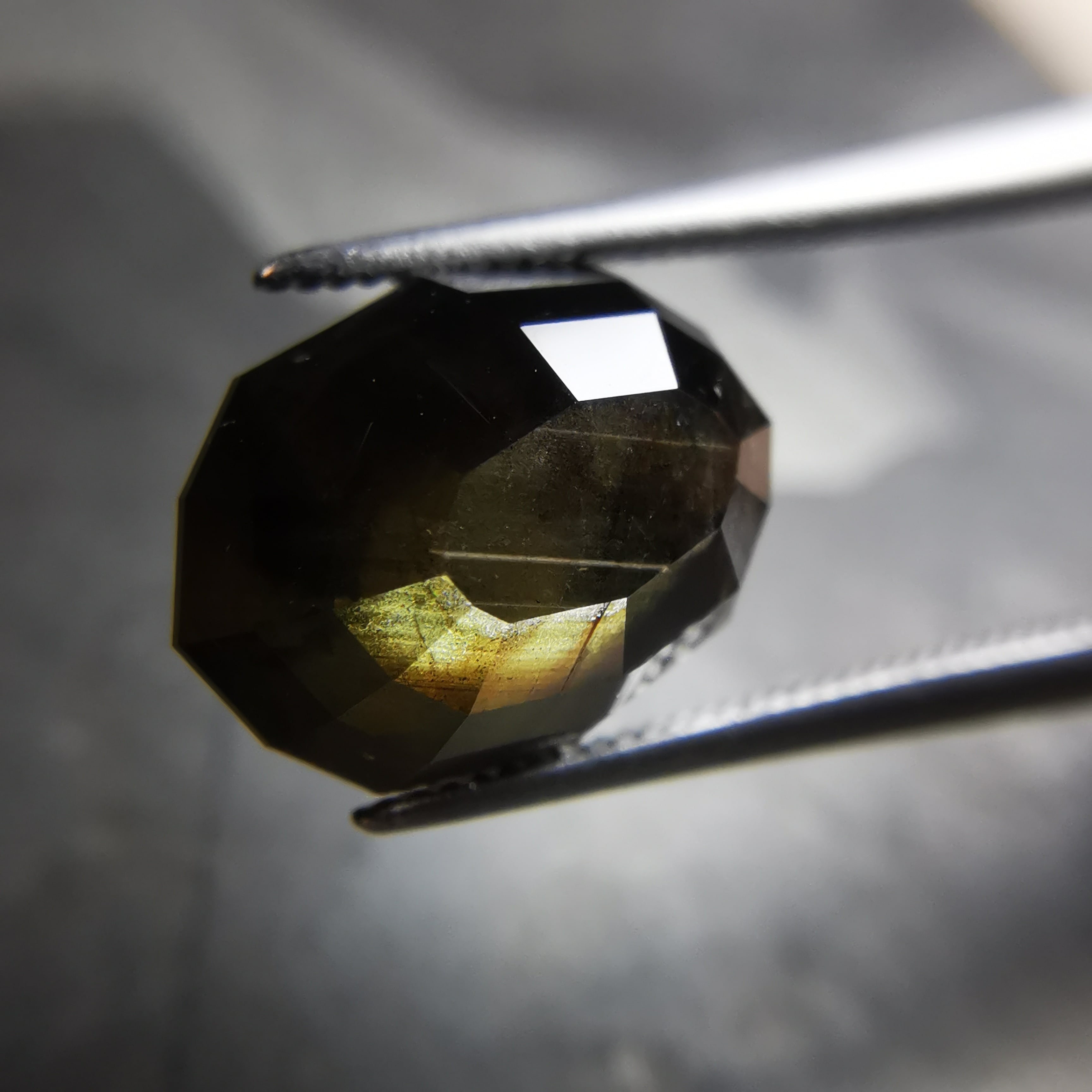 複雑な模様を描くやや緑みの淡い金色のシラーが、黒い石の表面できらめきます。