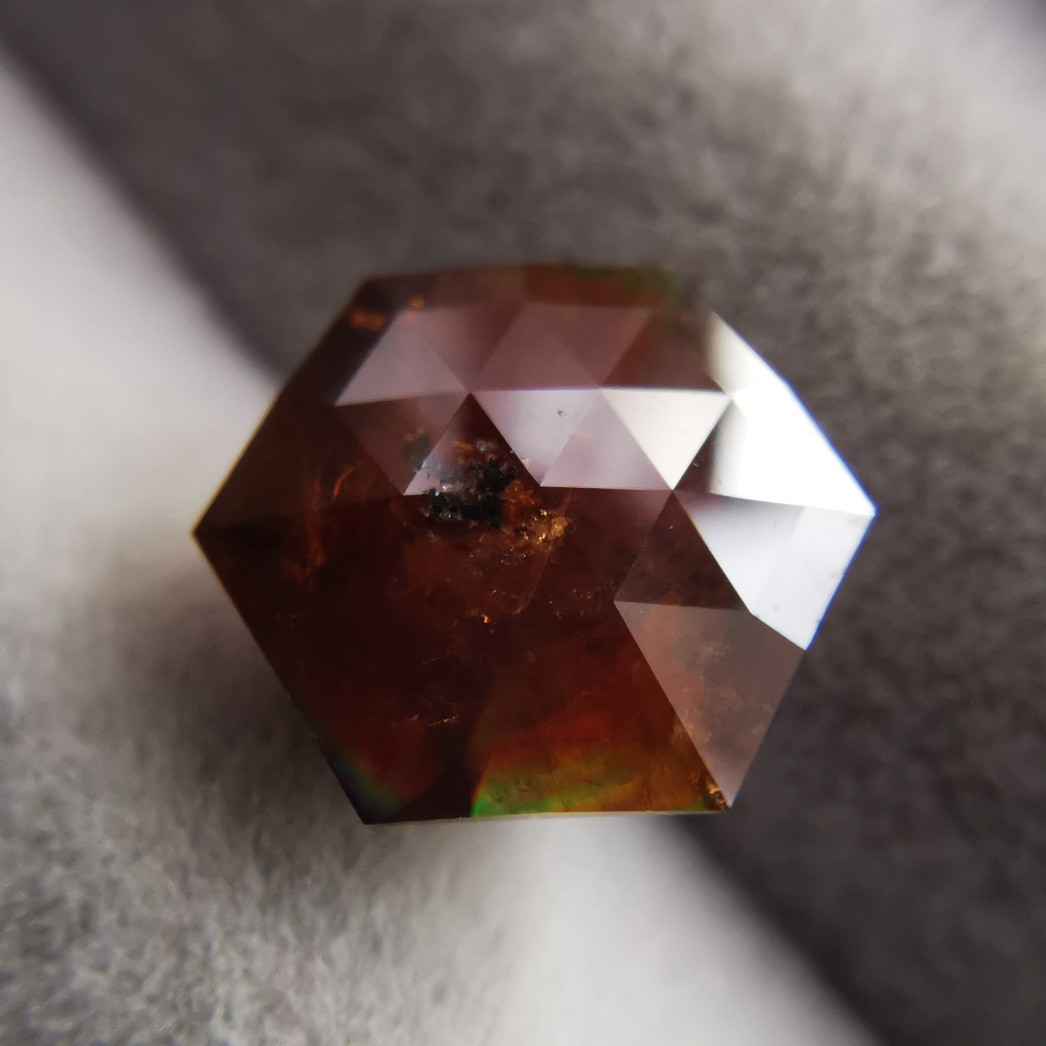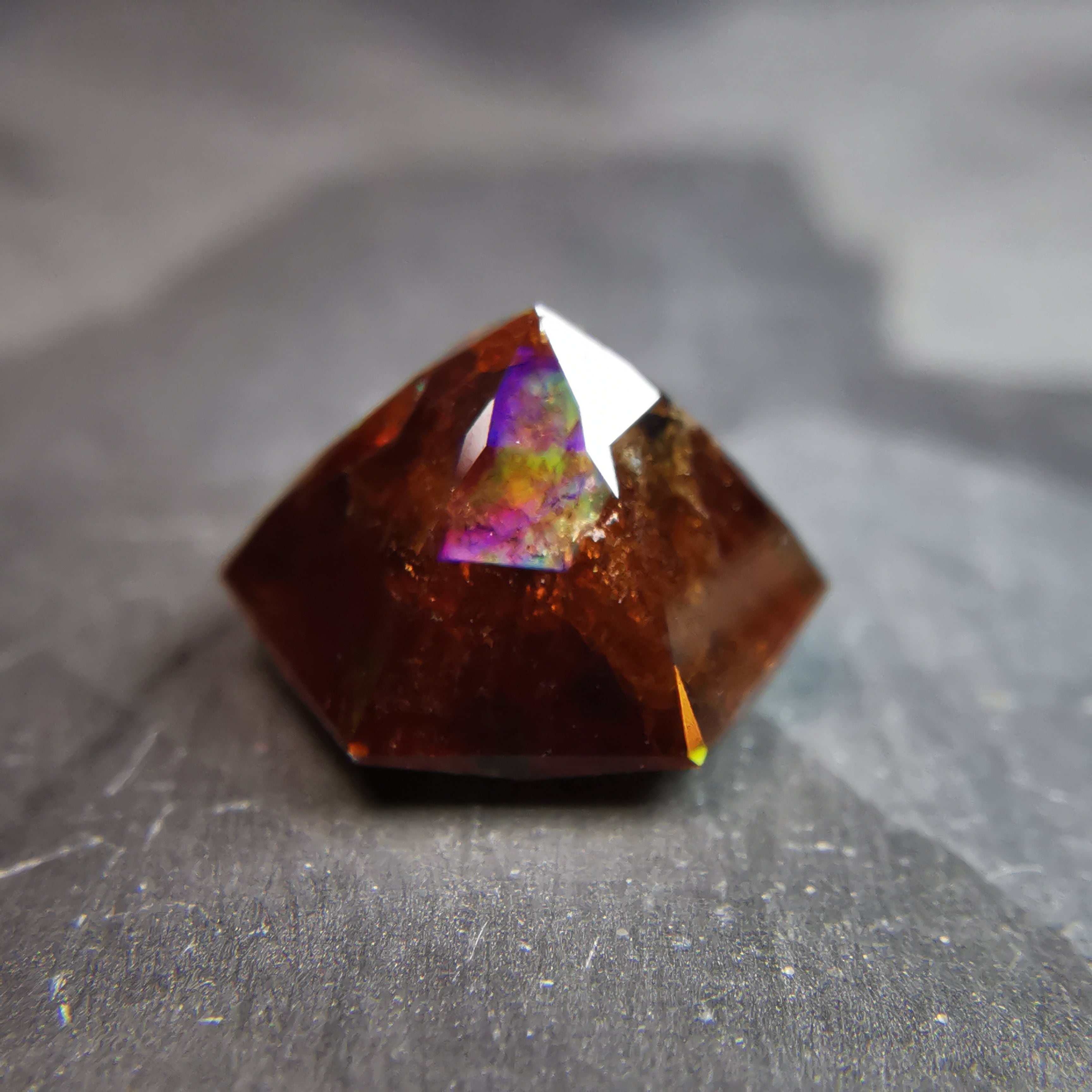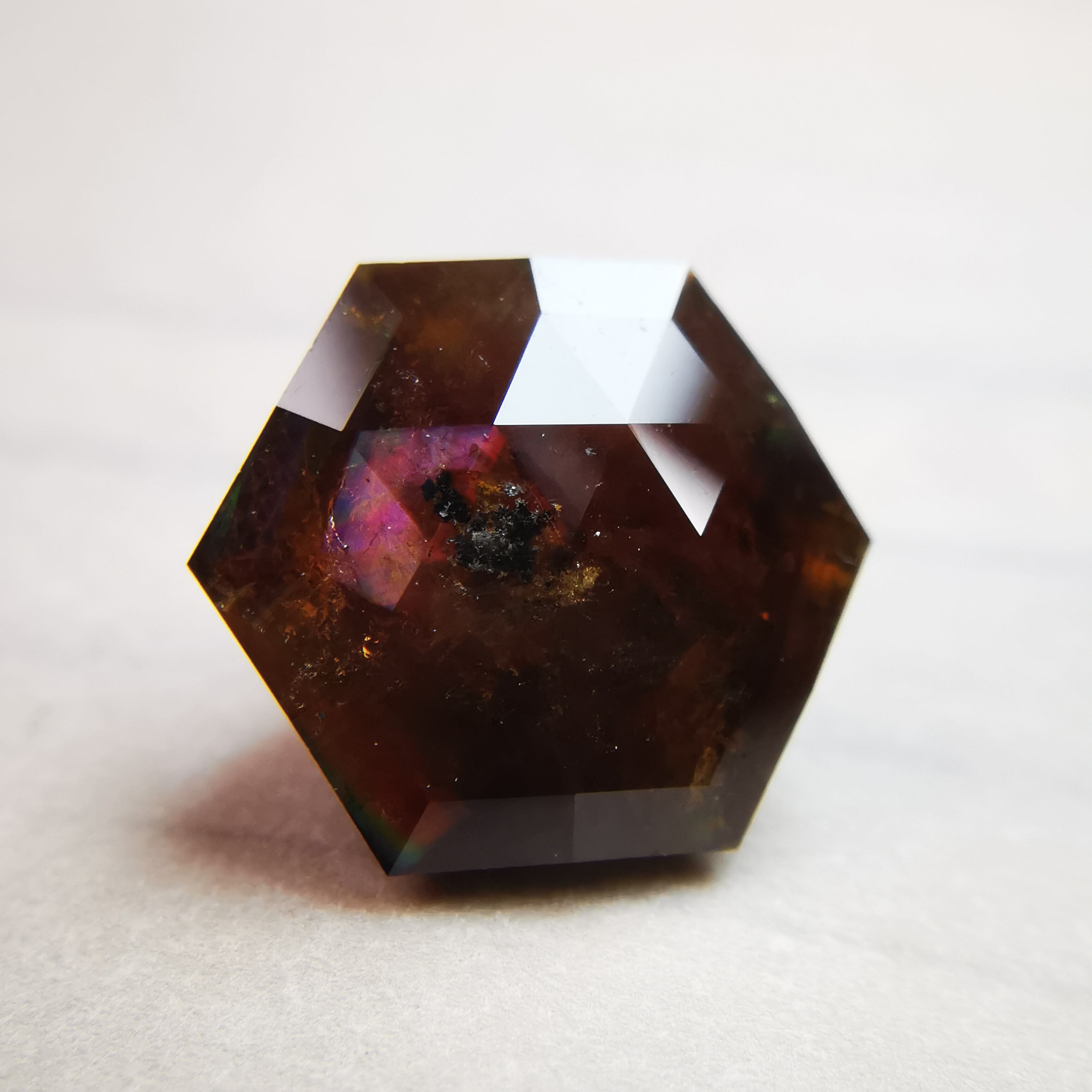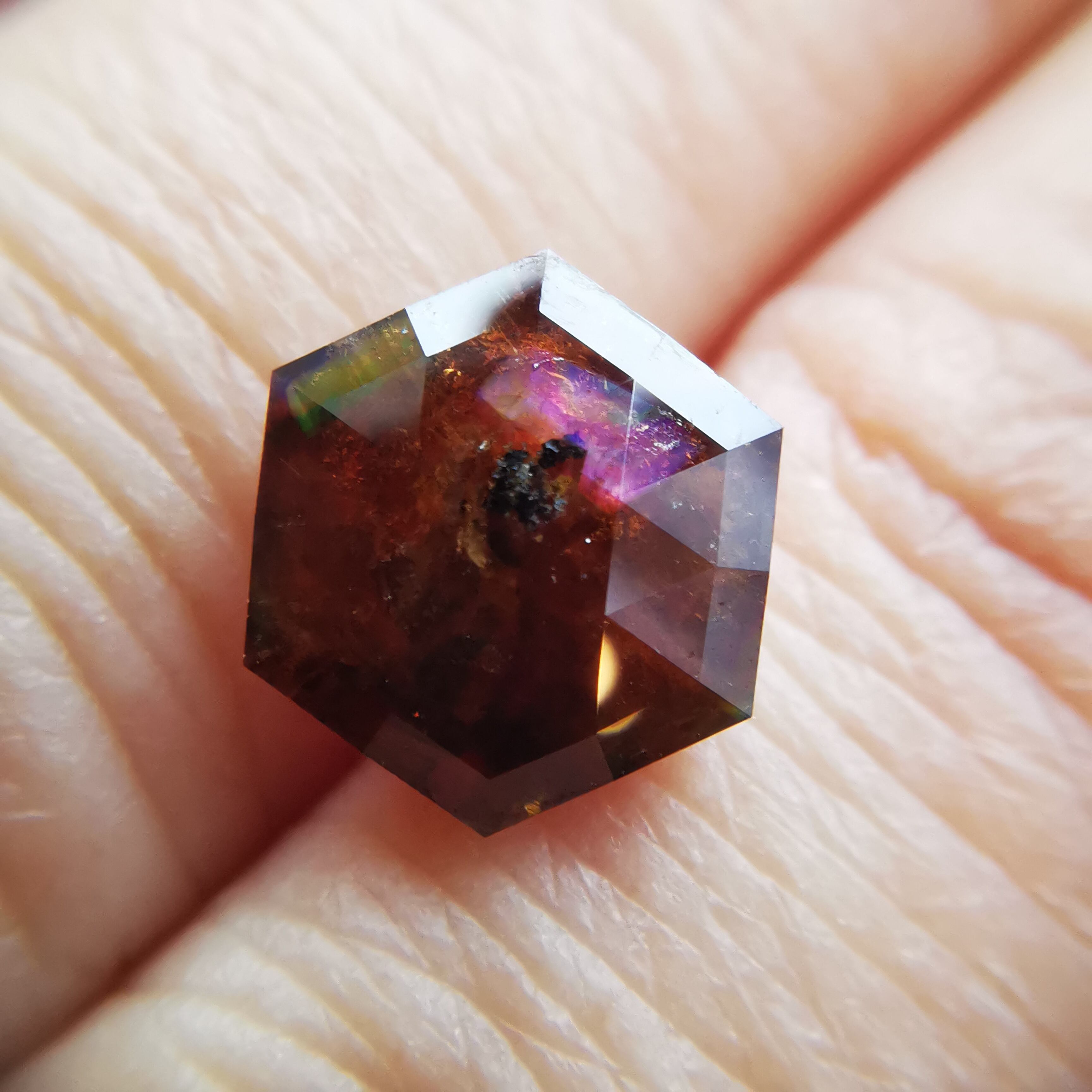 レインボーガーネットらしい虹色は強くありませんが、フェイスにビビットなピンク、縁の方には黄や緑の虹が掛かります。