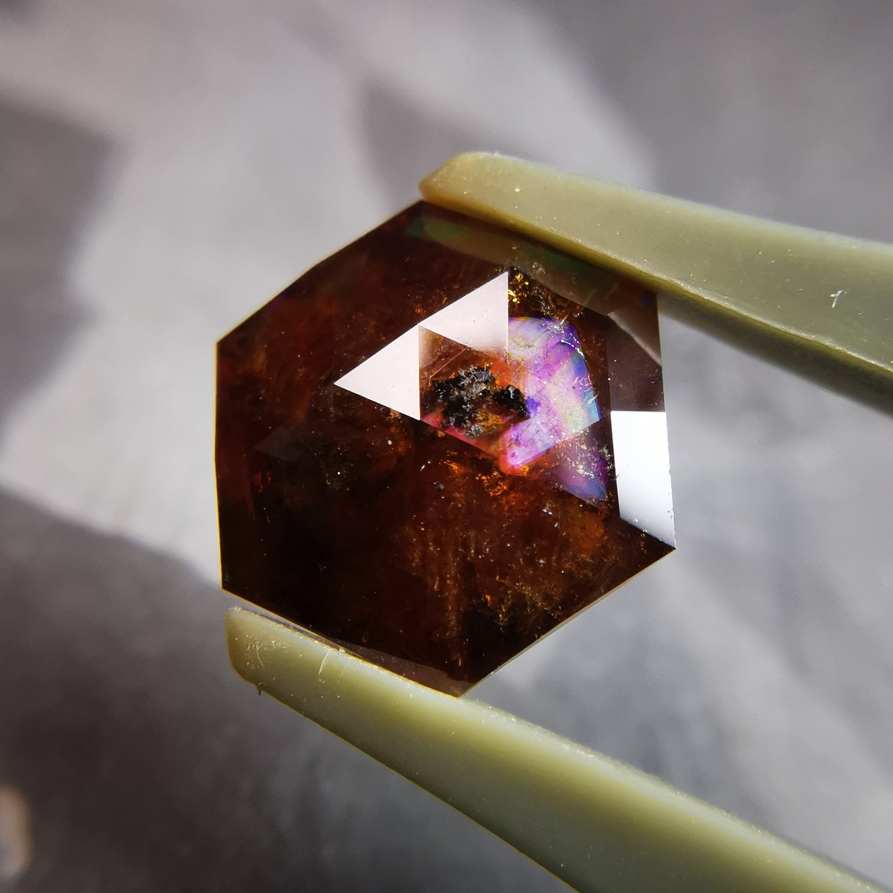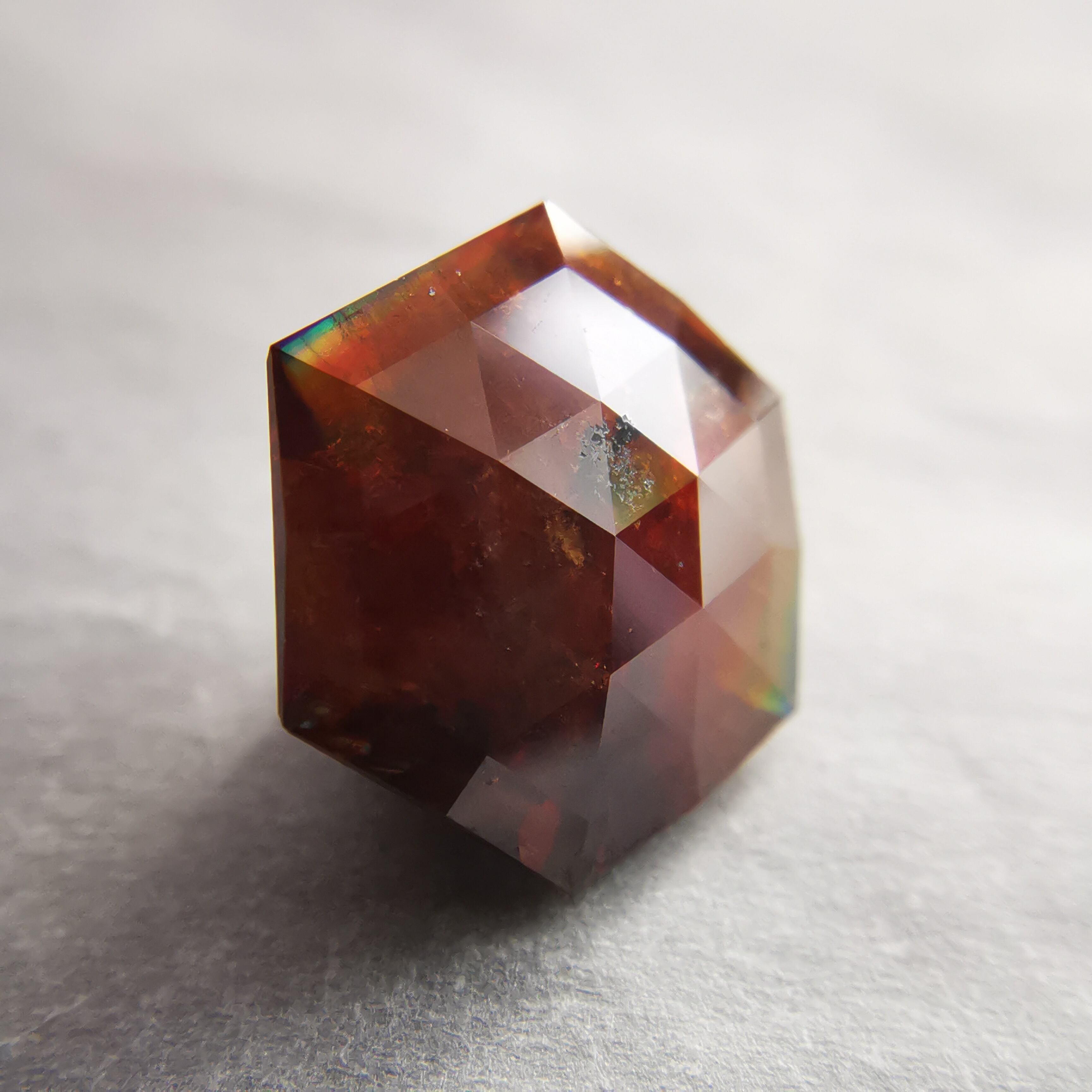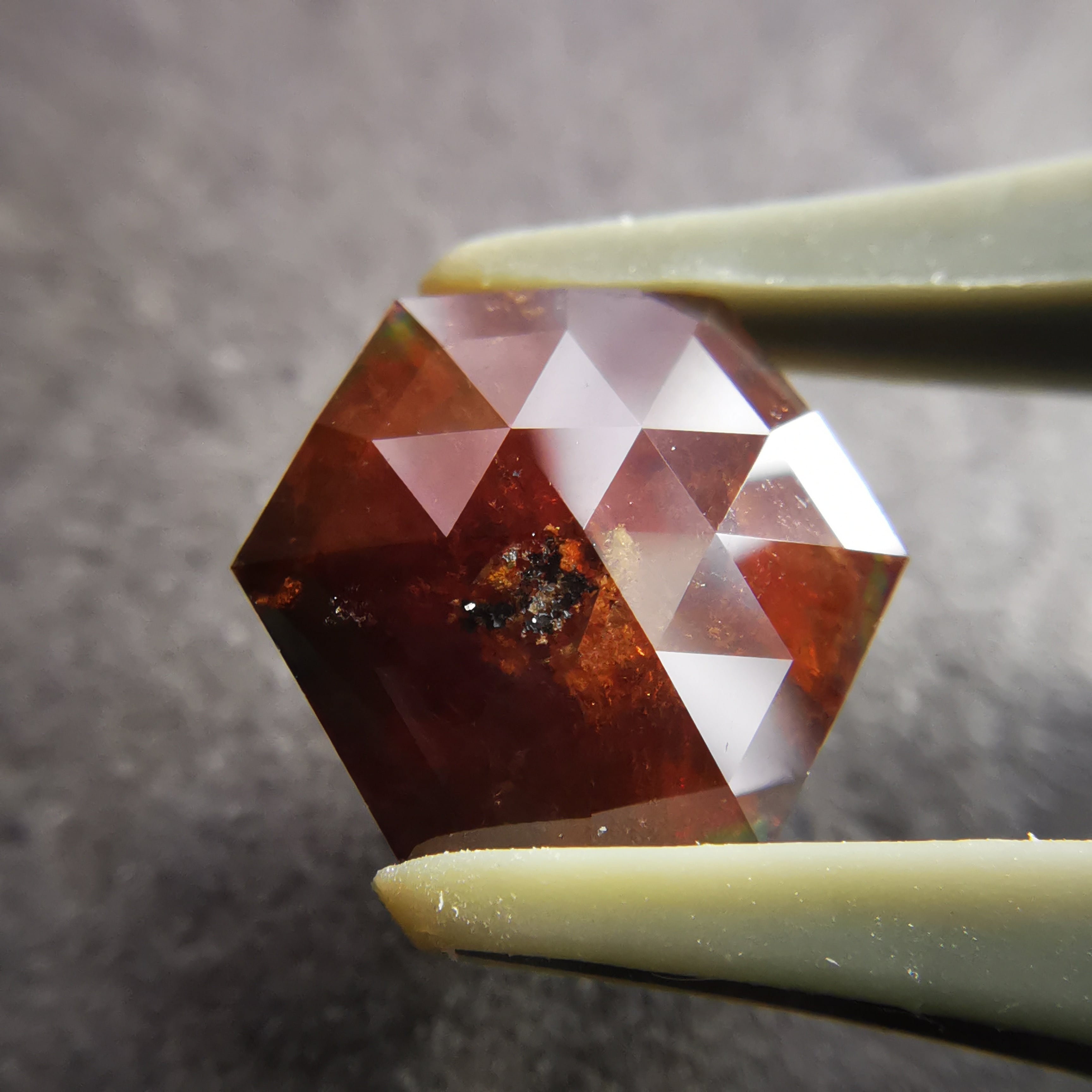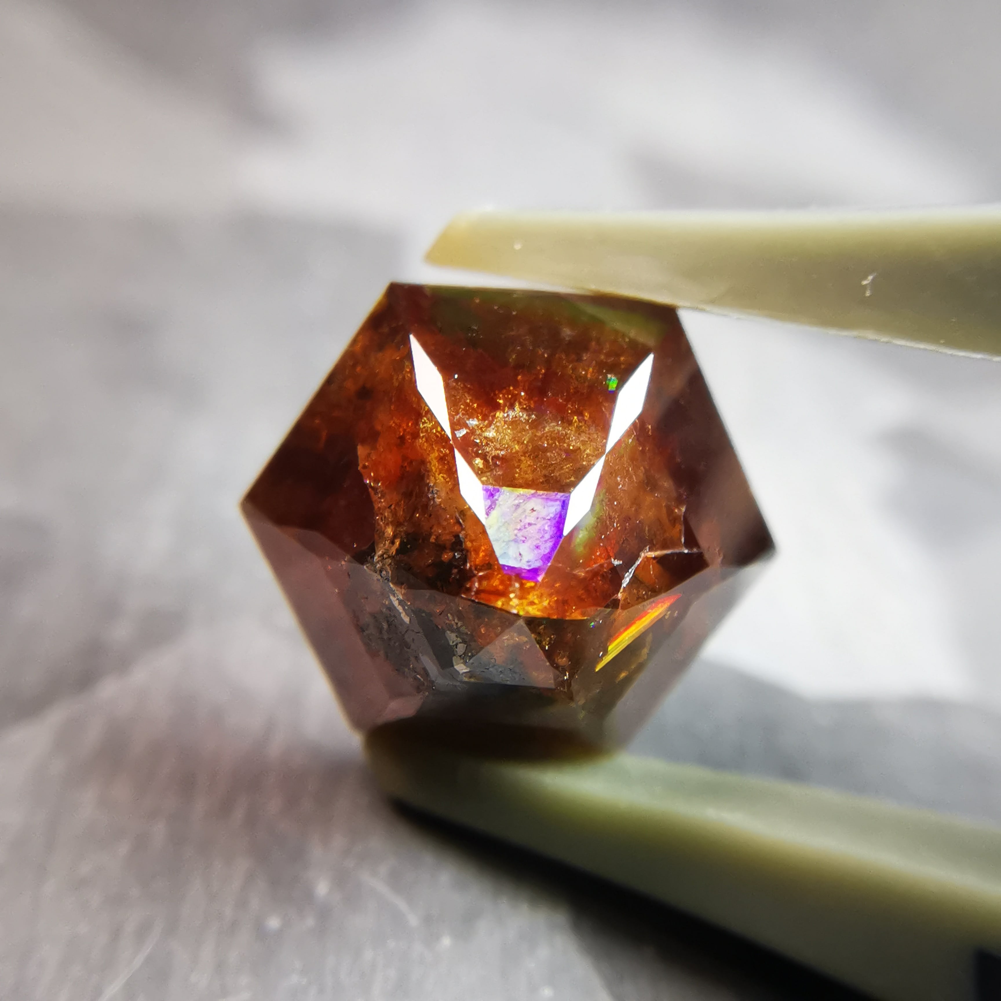 レインボーガーネットらしい虹色は強くありませんが、フェイスにビビットなピンク、縁の方には黄や緑の虹が掛かります。