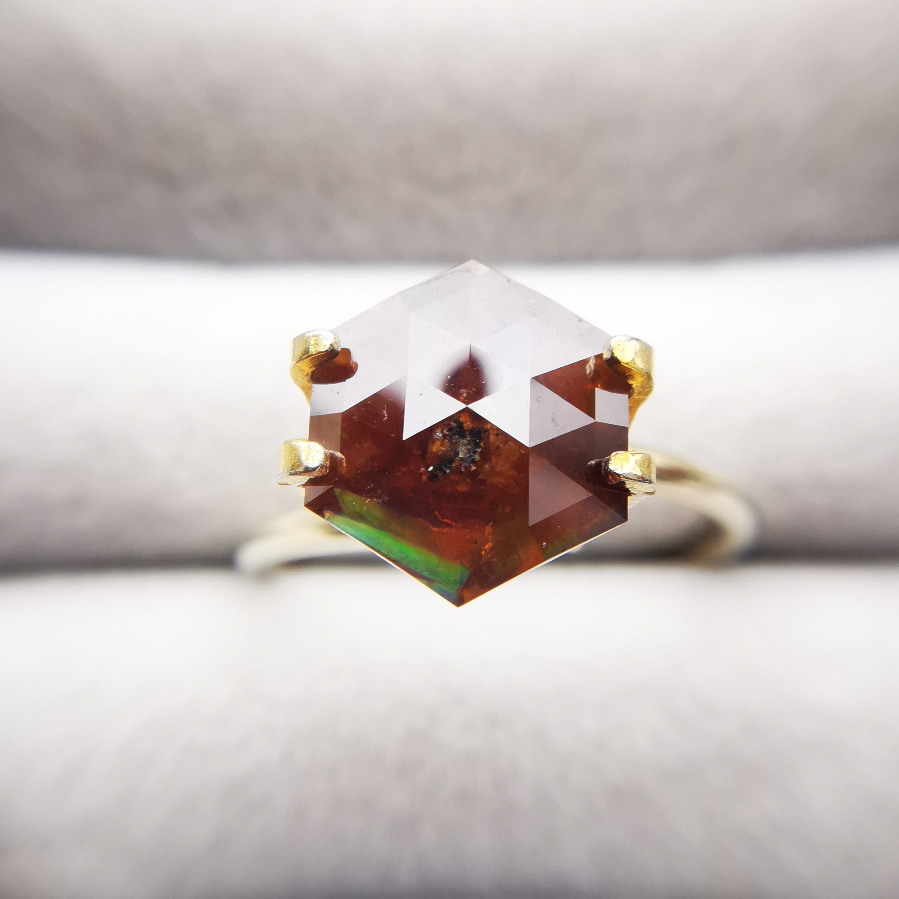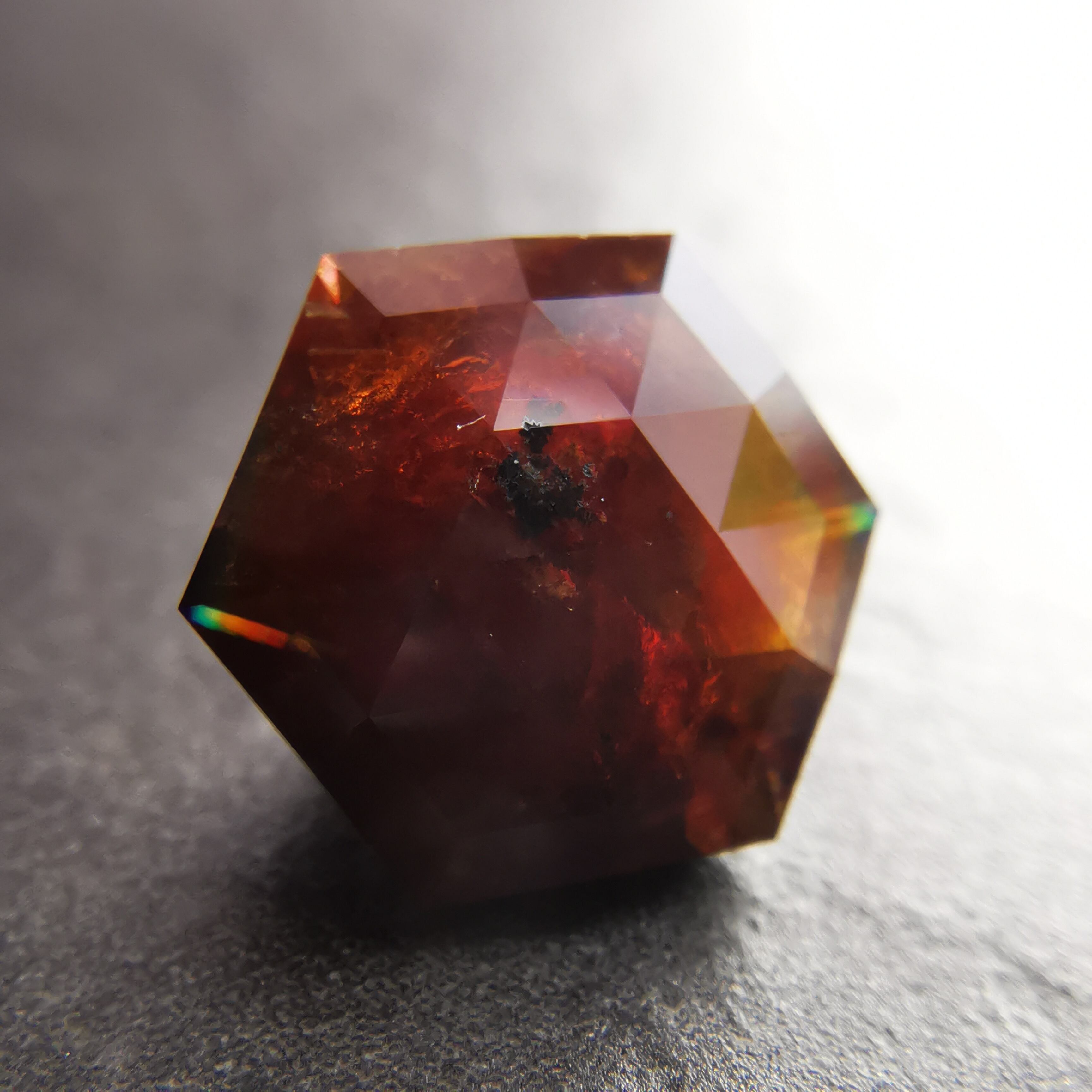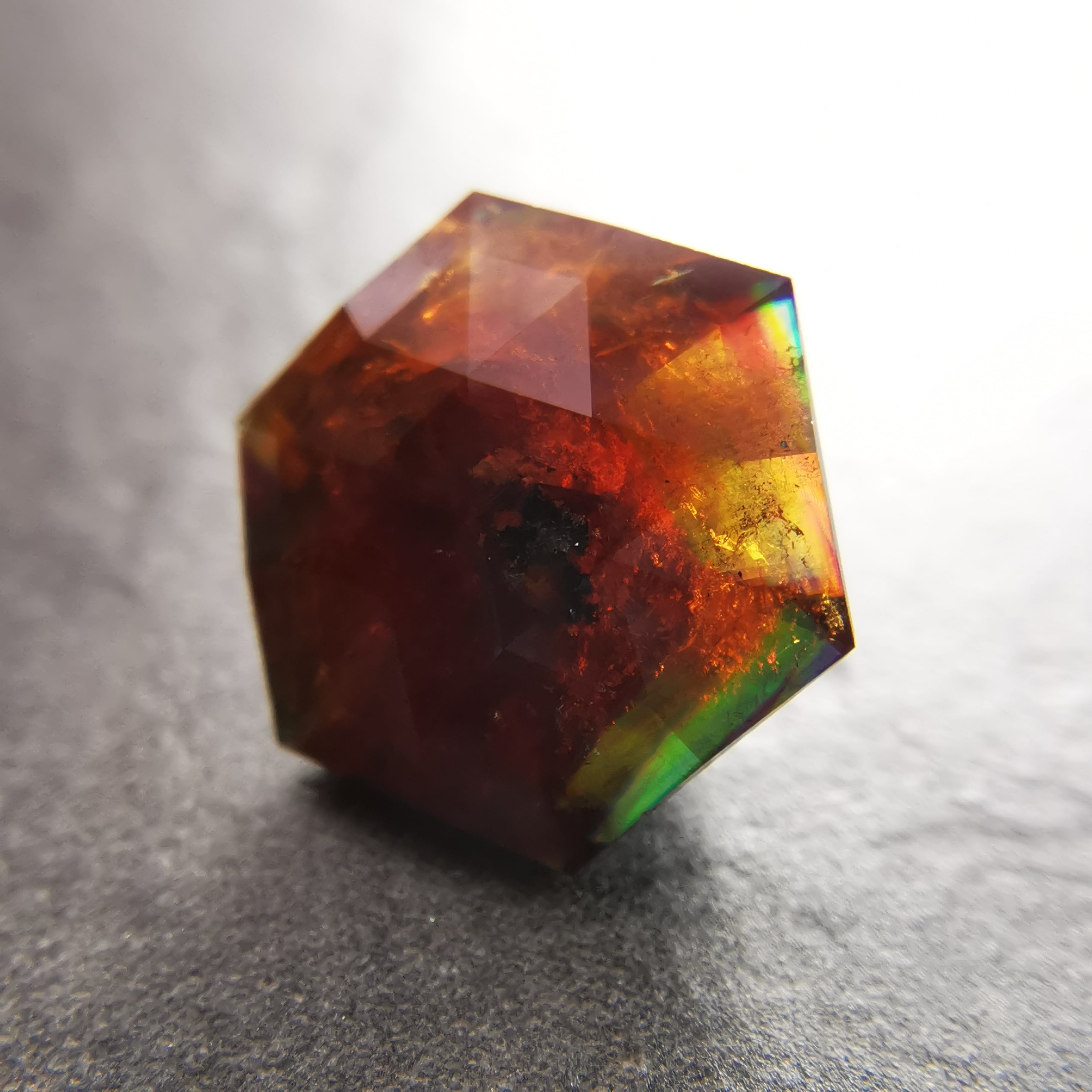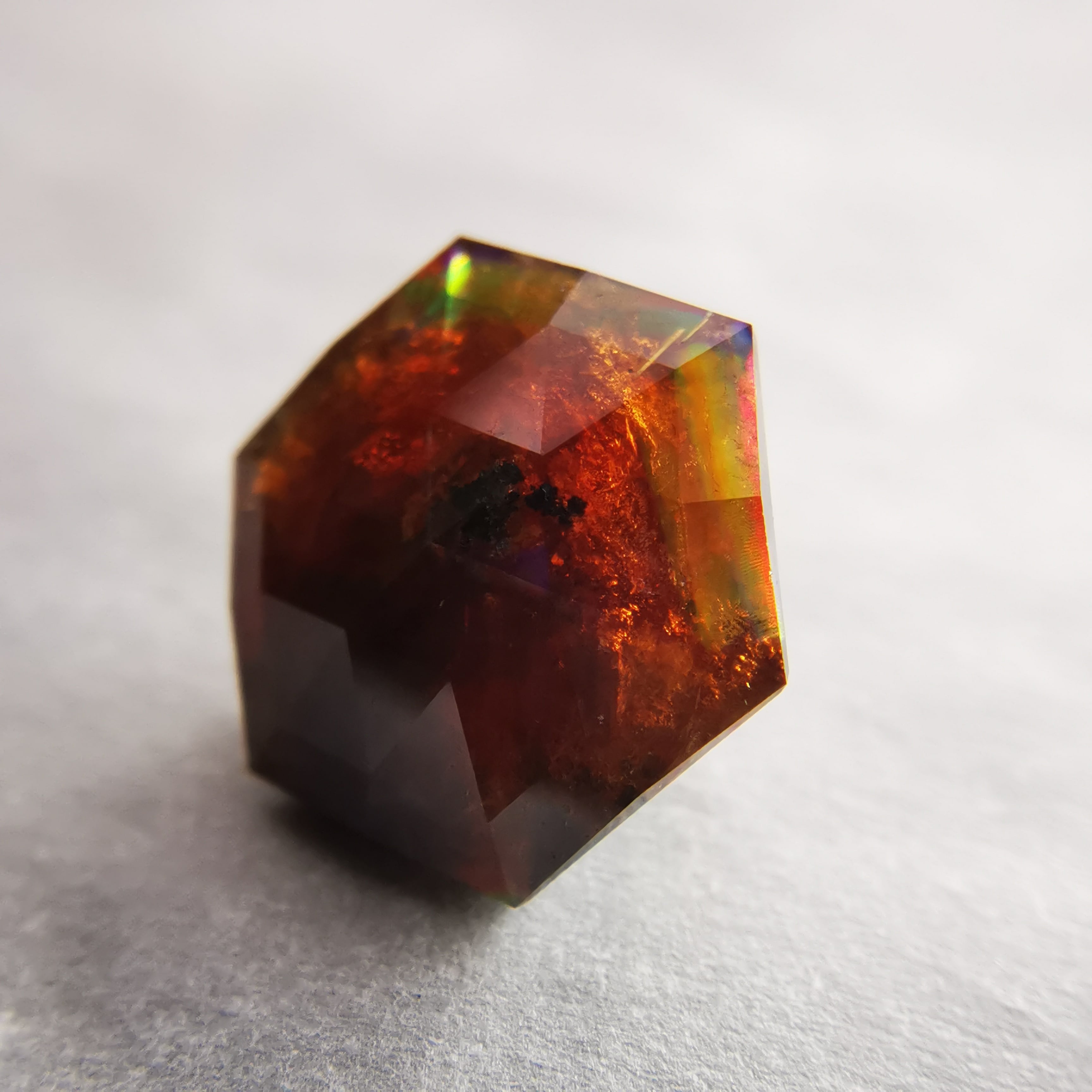 レインボーガーネットらしい虹色は強くありませんが、フェイスにビビットなピンク、縁の方には黄や緑の虹が掛かります。