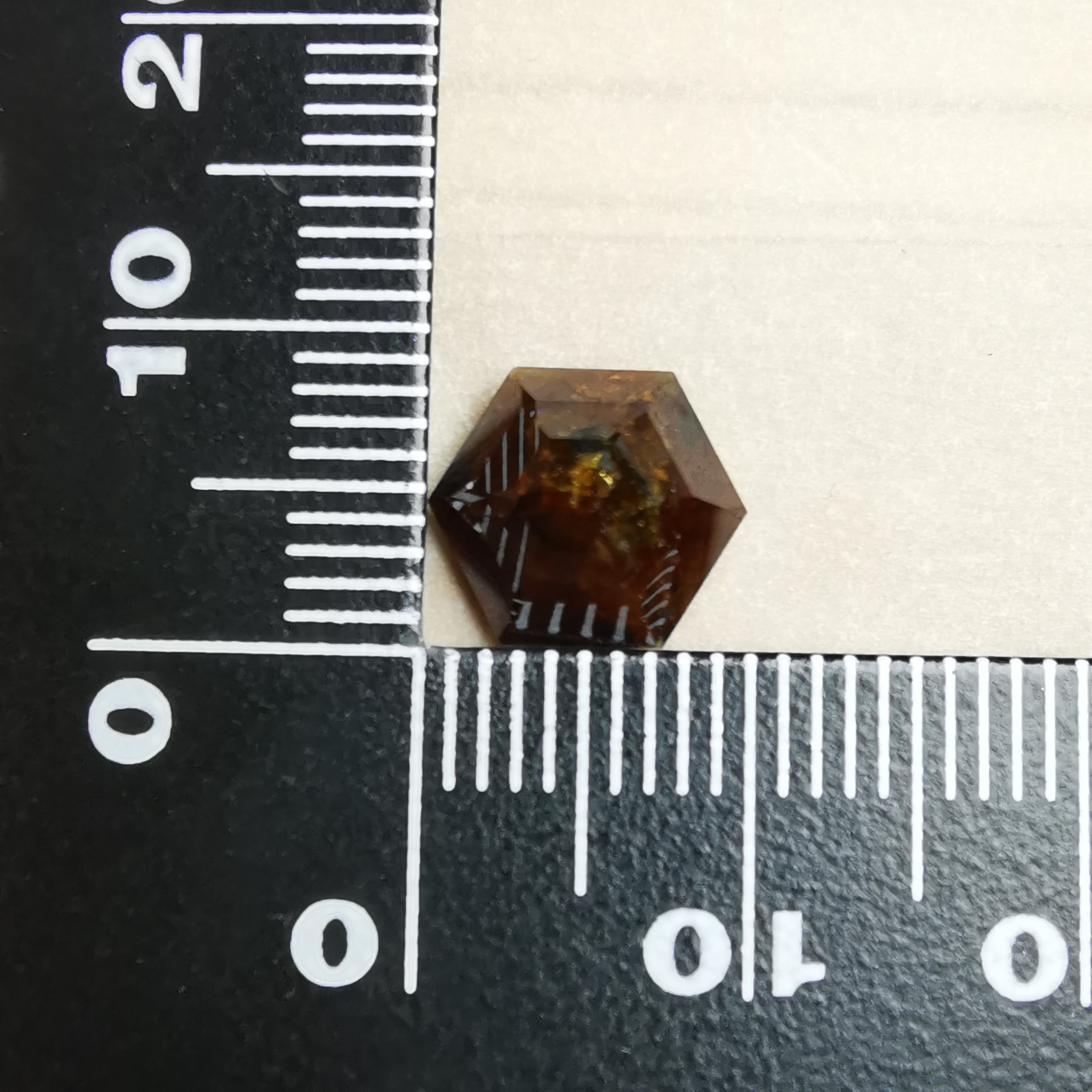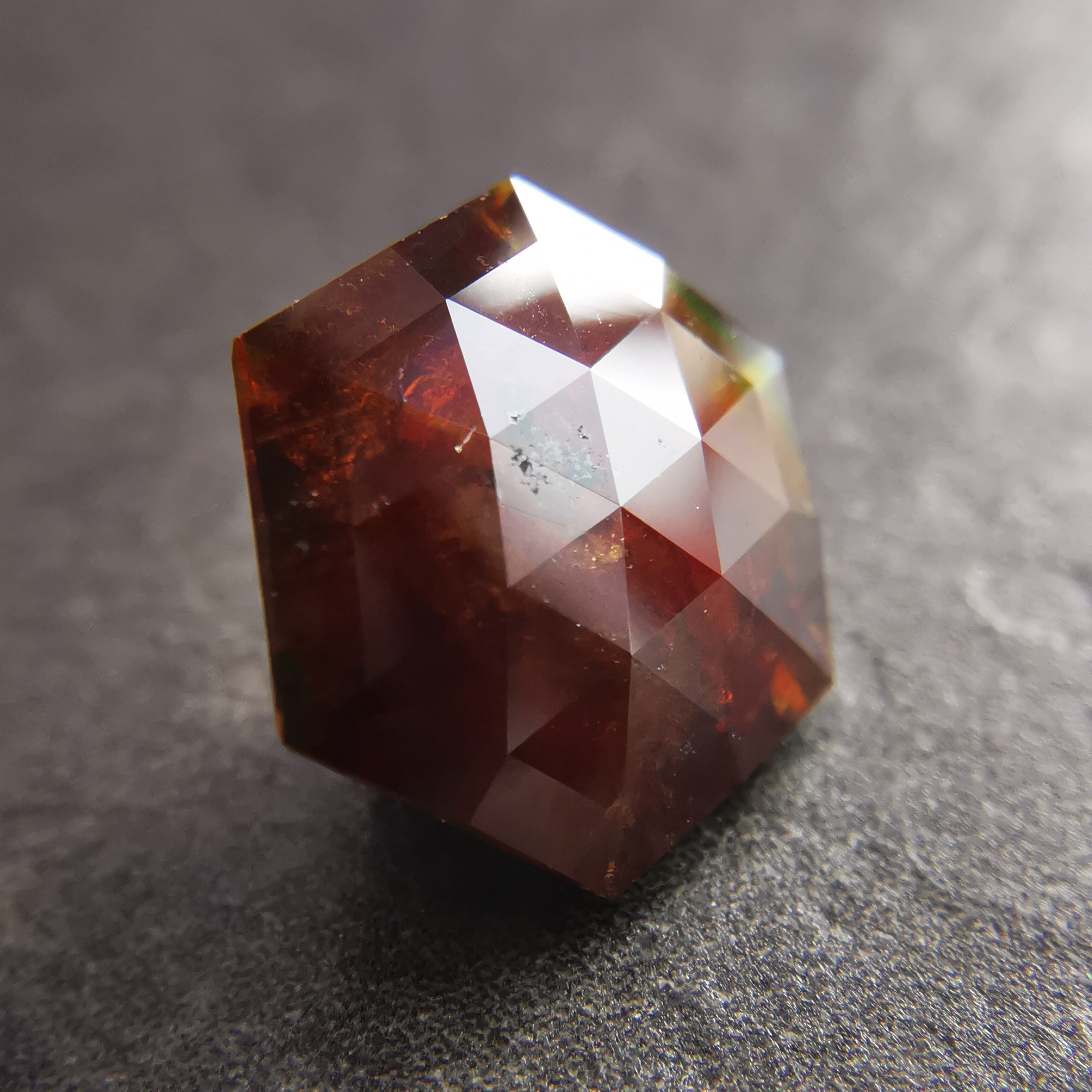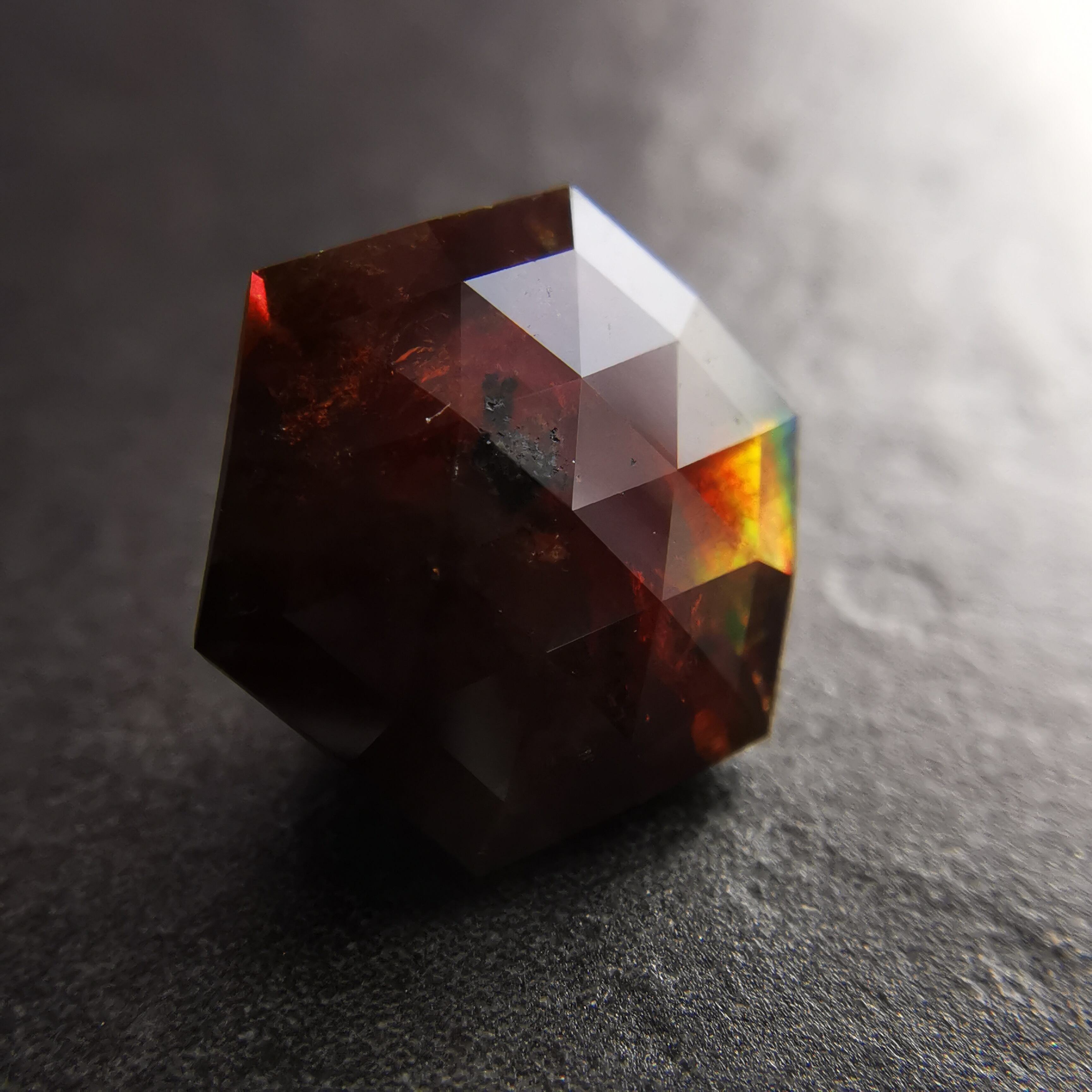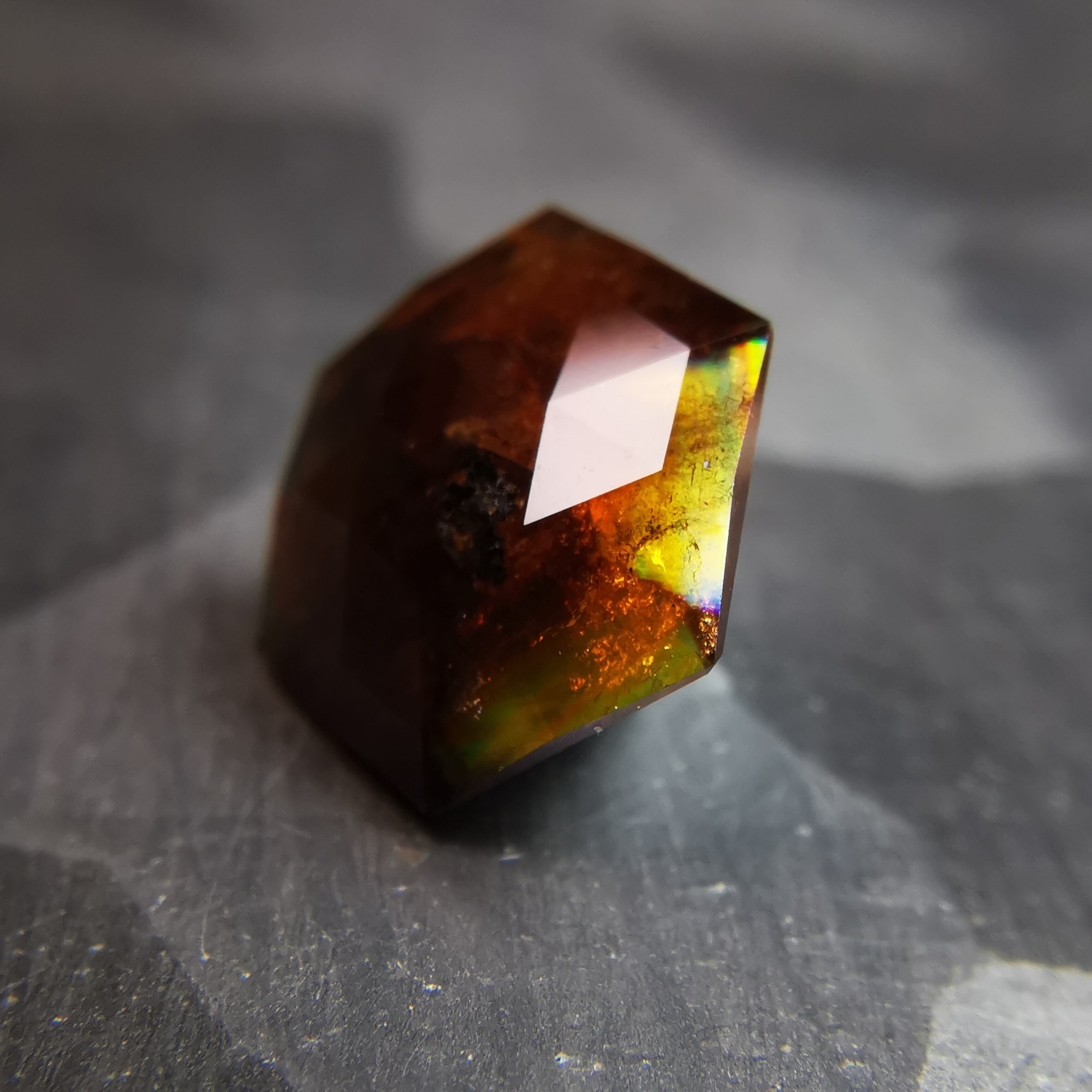レインボーガーネットらしい虹色は強くありませんが、フェイスにビビットなピンク、縁の方には黄や緑の虹が掛かります。