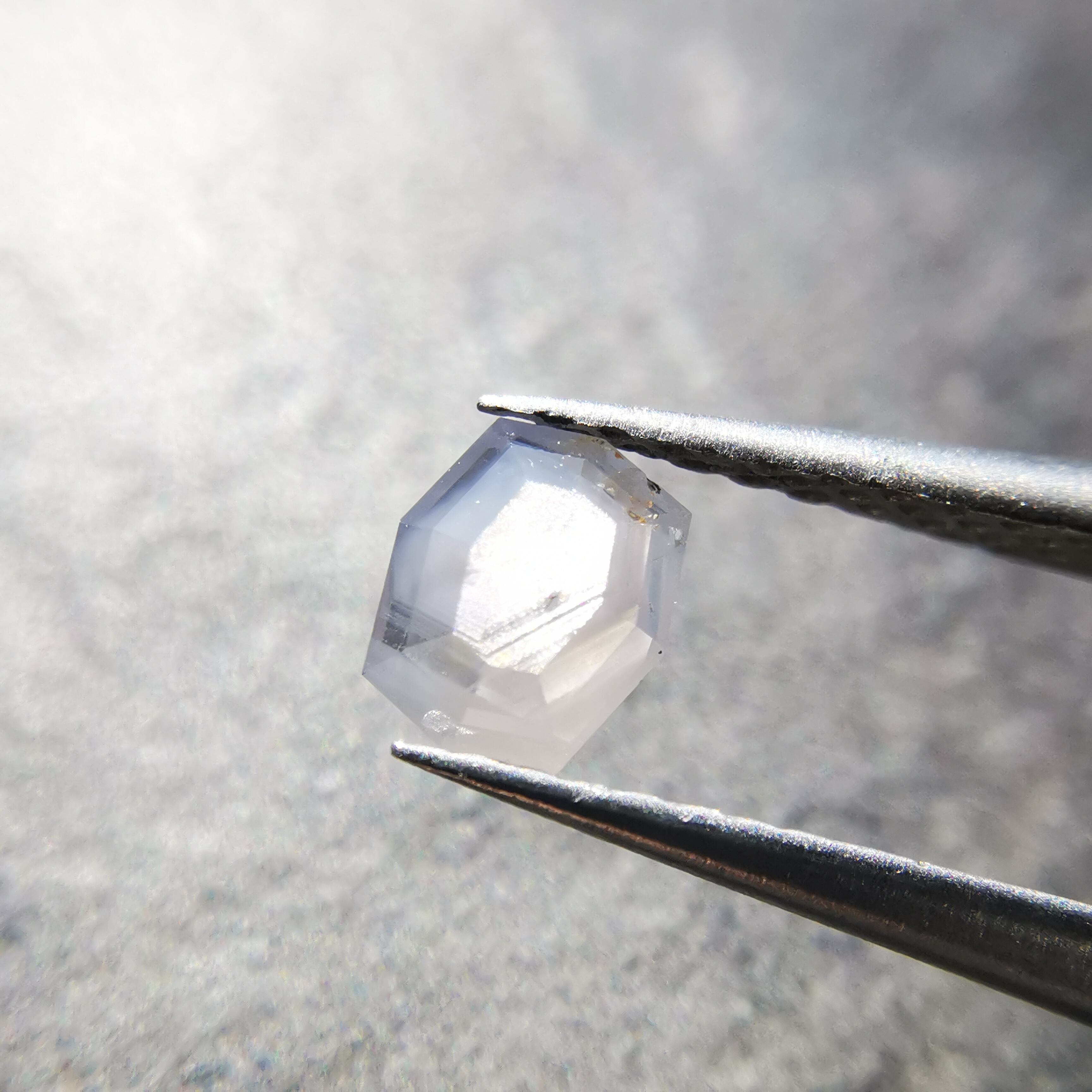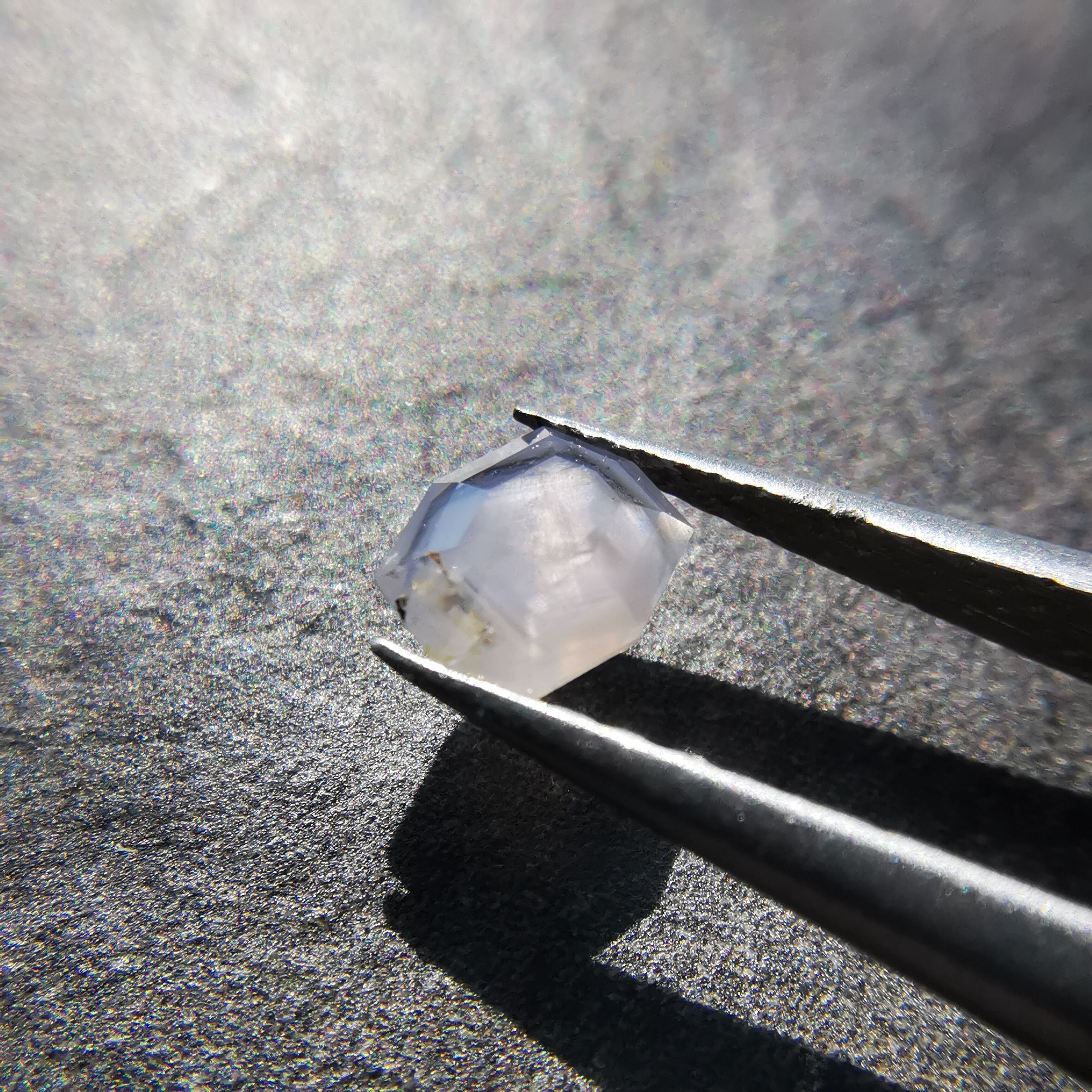 ごくごく淡い灰みの紫色のサファイアに、シルバーホワイトの濃厚なシルクが入っています。