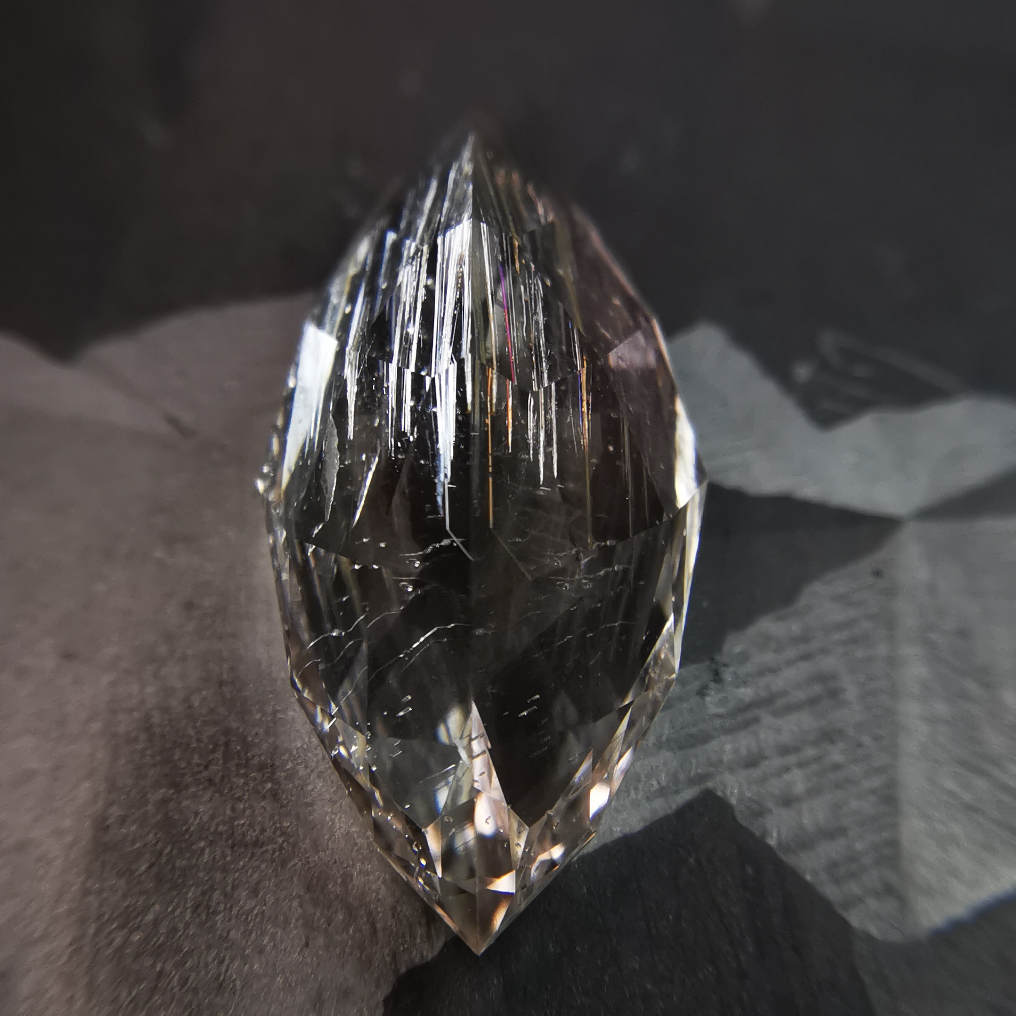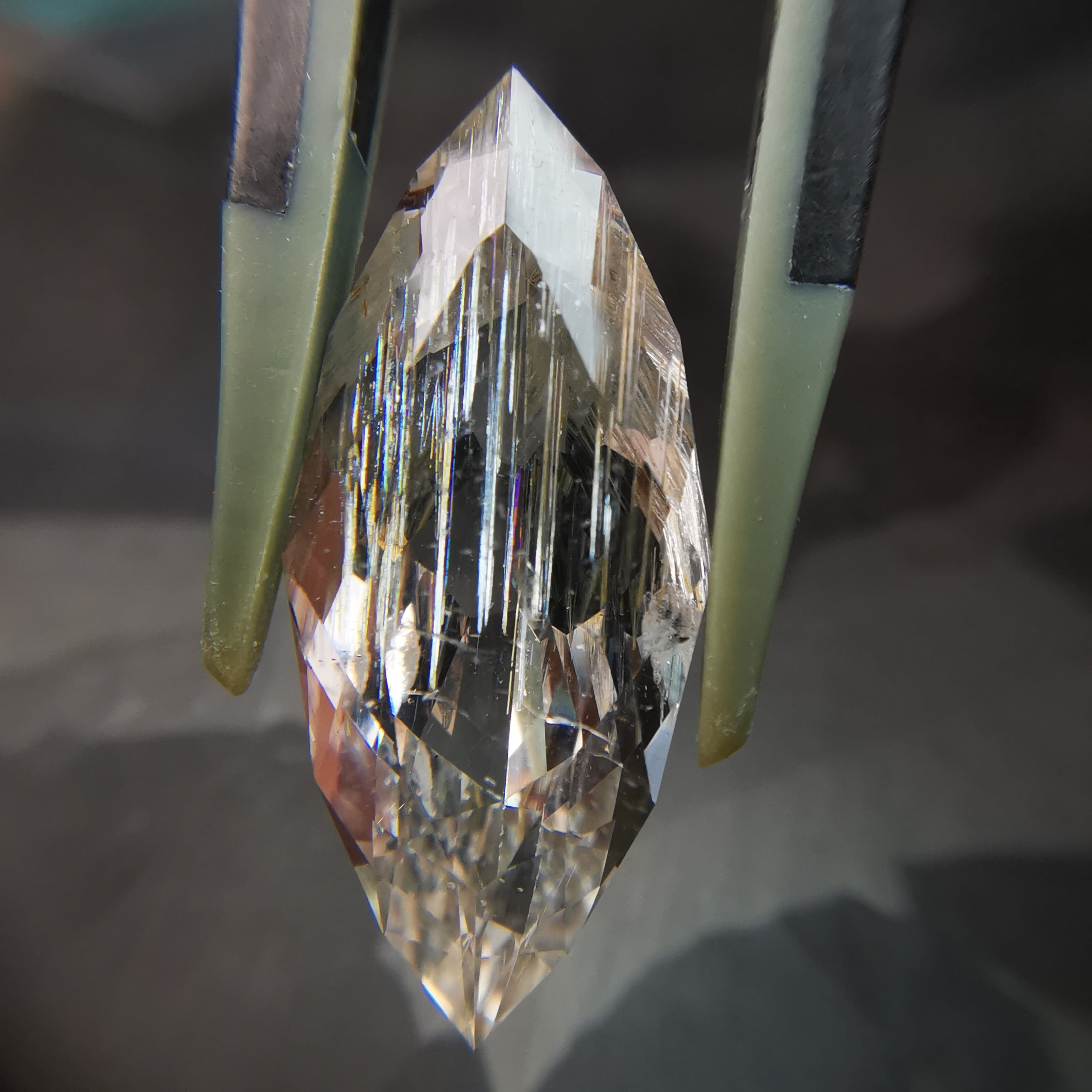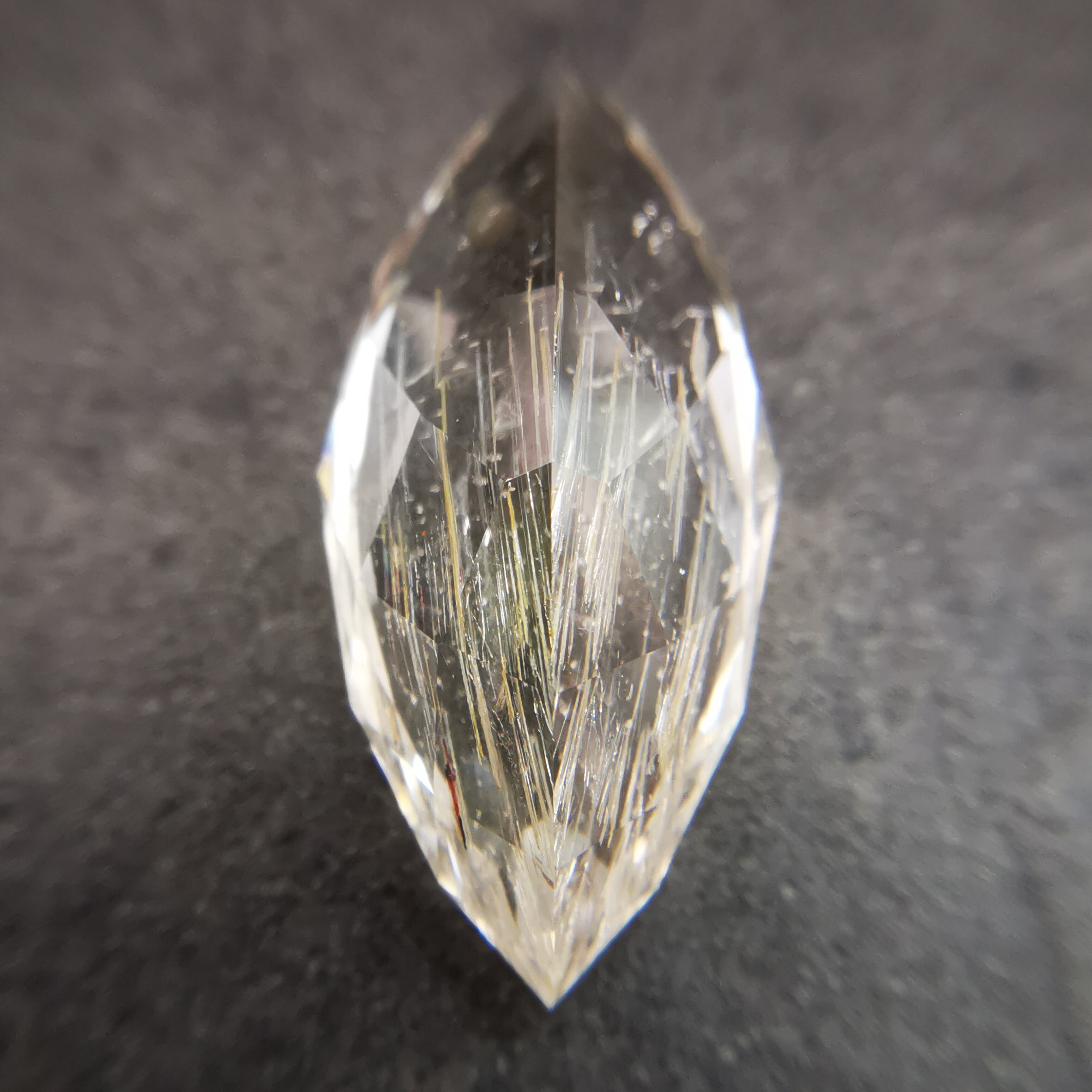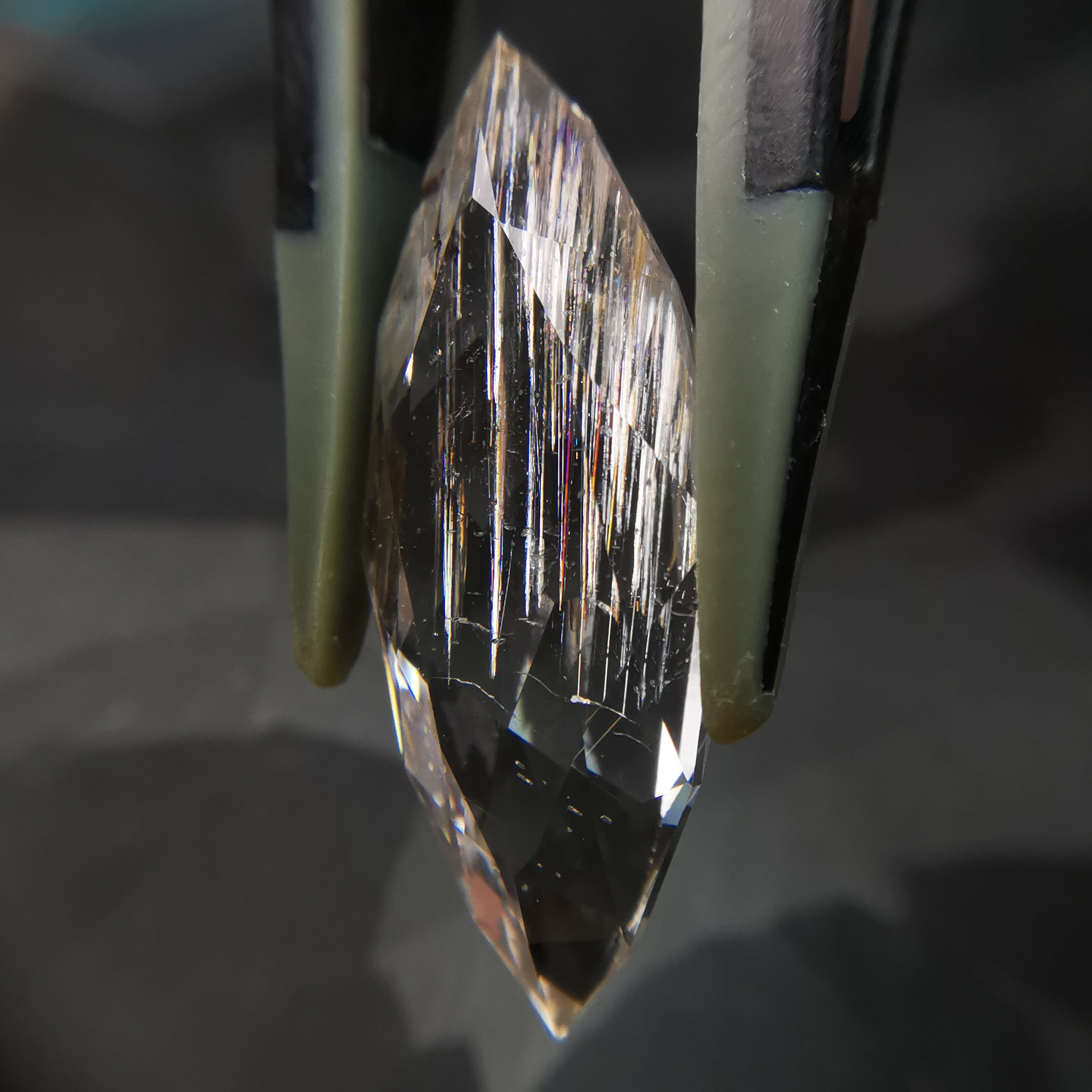 針状のインクルージョンは一定の方向で並び、端から石の中心の辺りまで伸びています。