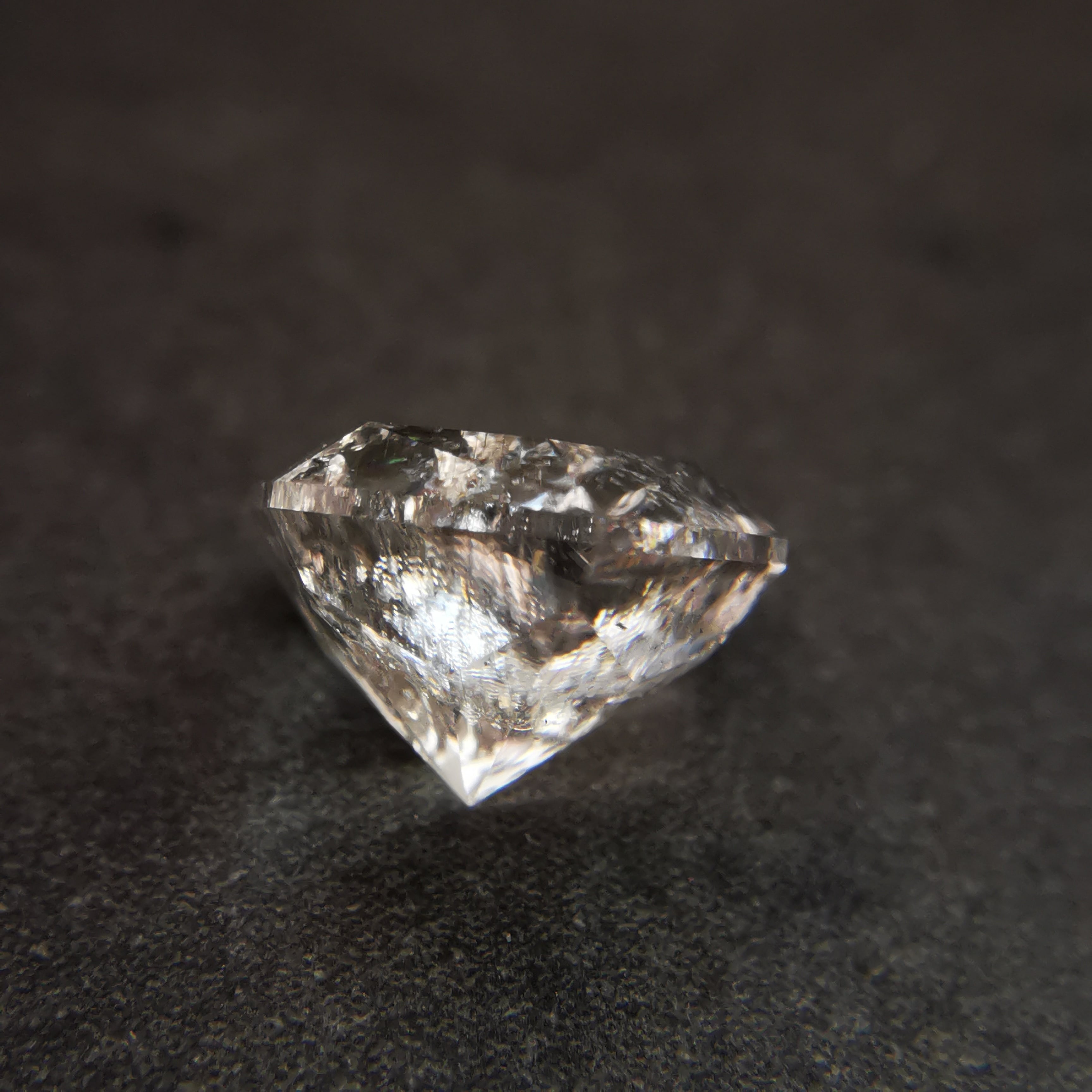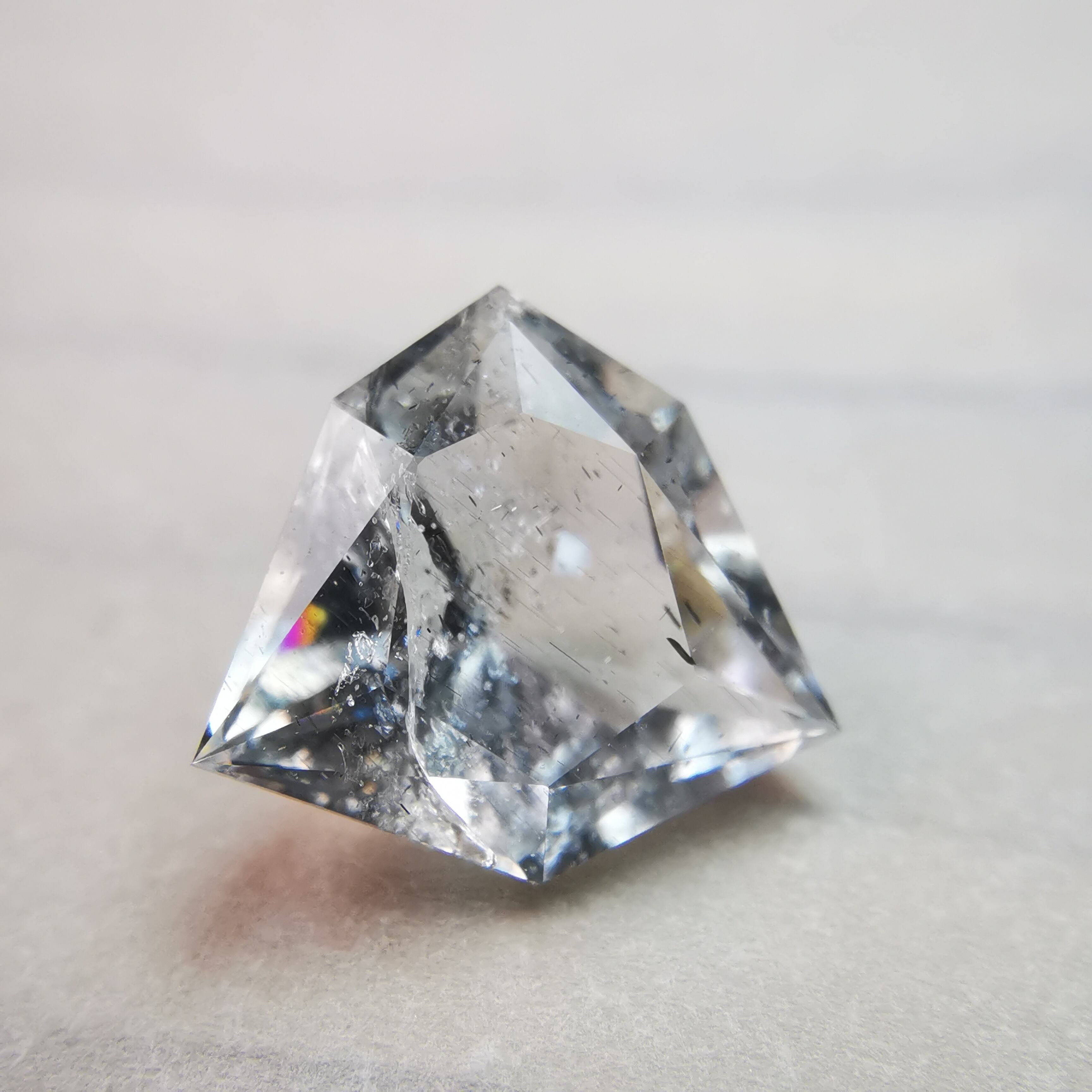インクルージョン、クラックが多数あり、クラックに生じた虹が石の内部に反射して、あちこちでカラフルな色が零れます。
