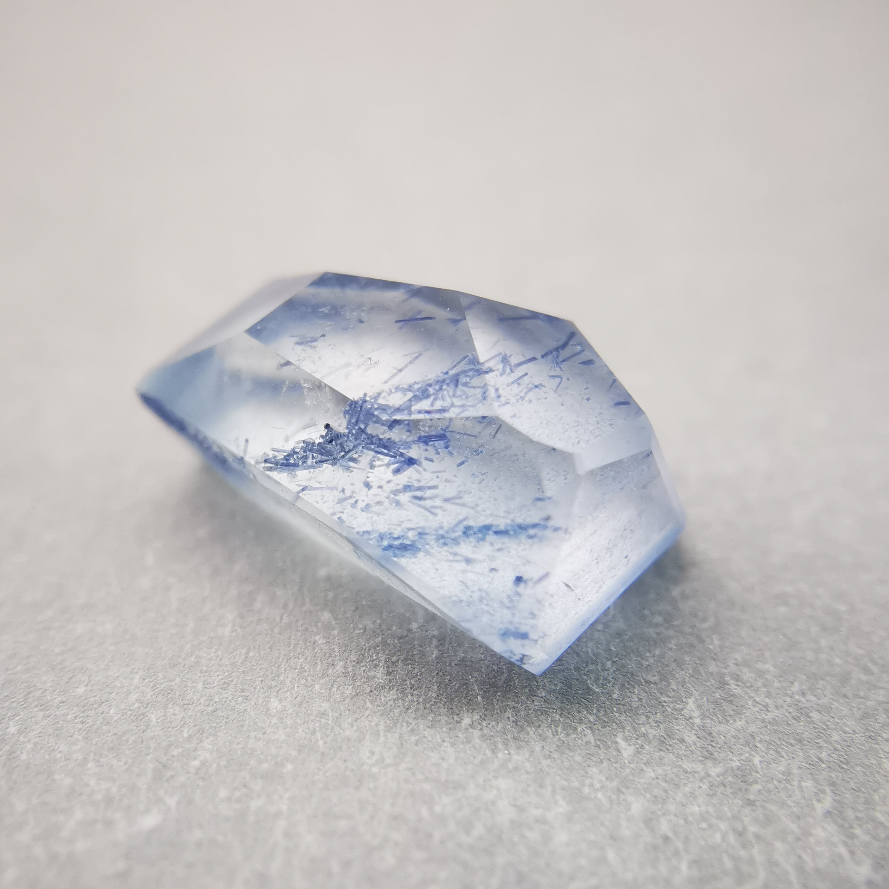 クリアなクォーツに、パラパラとデュモルチェライトの青い結晶が入っています。