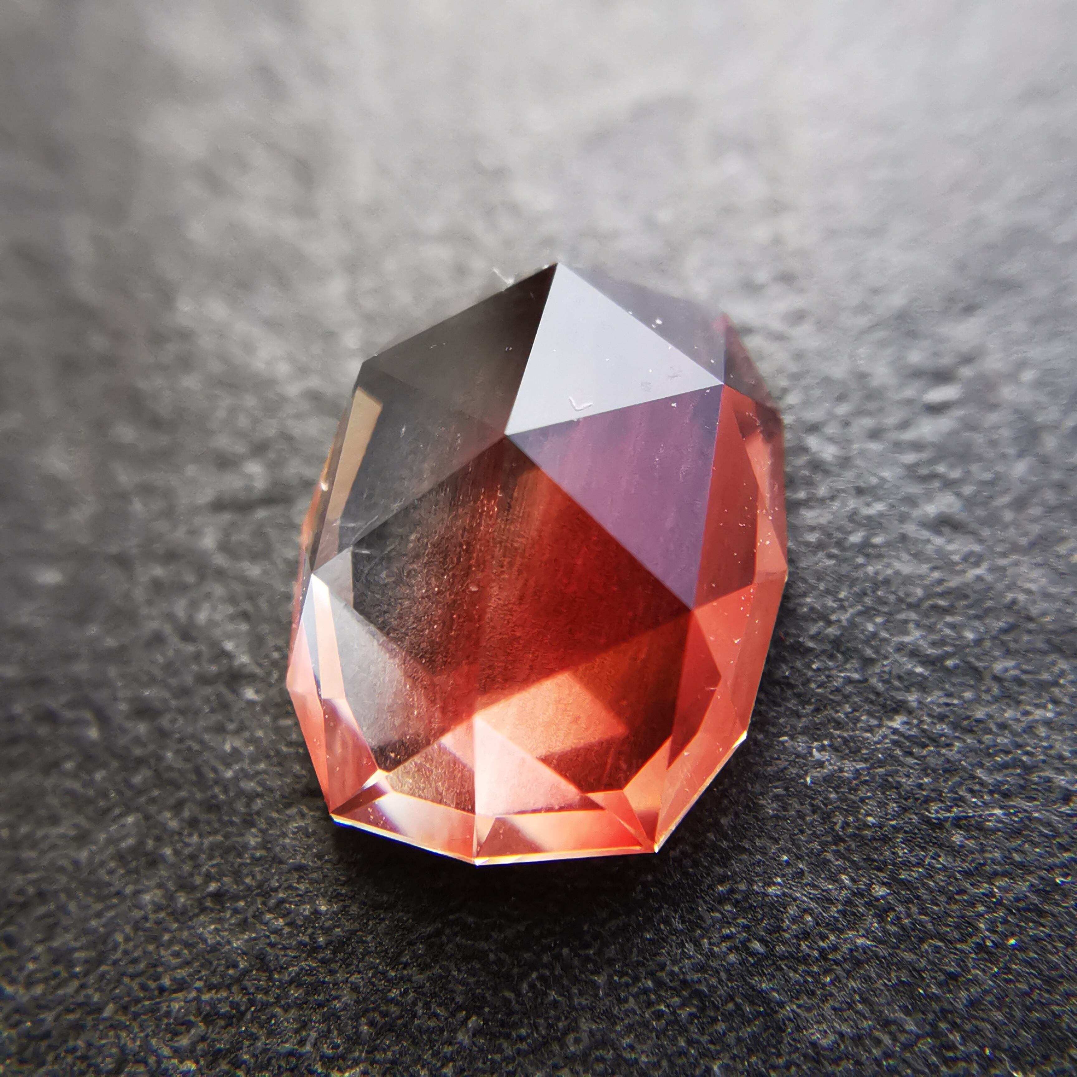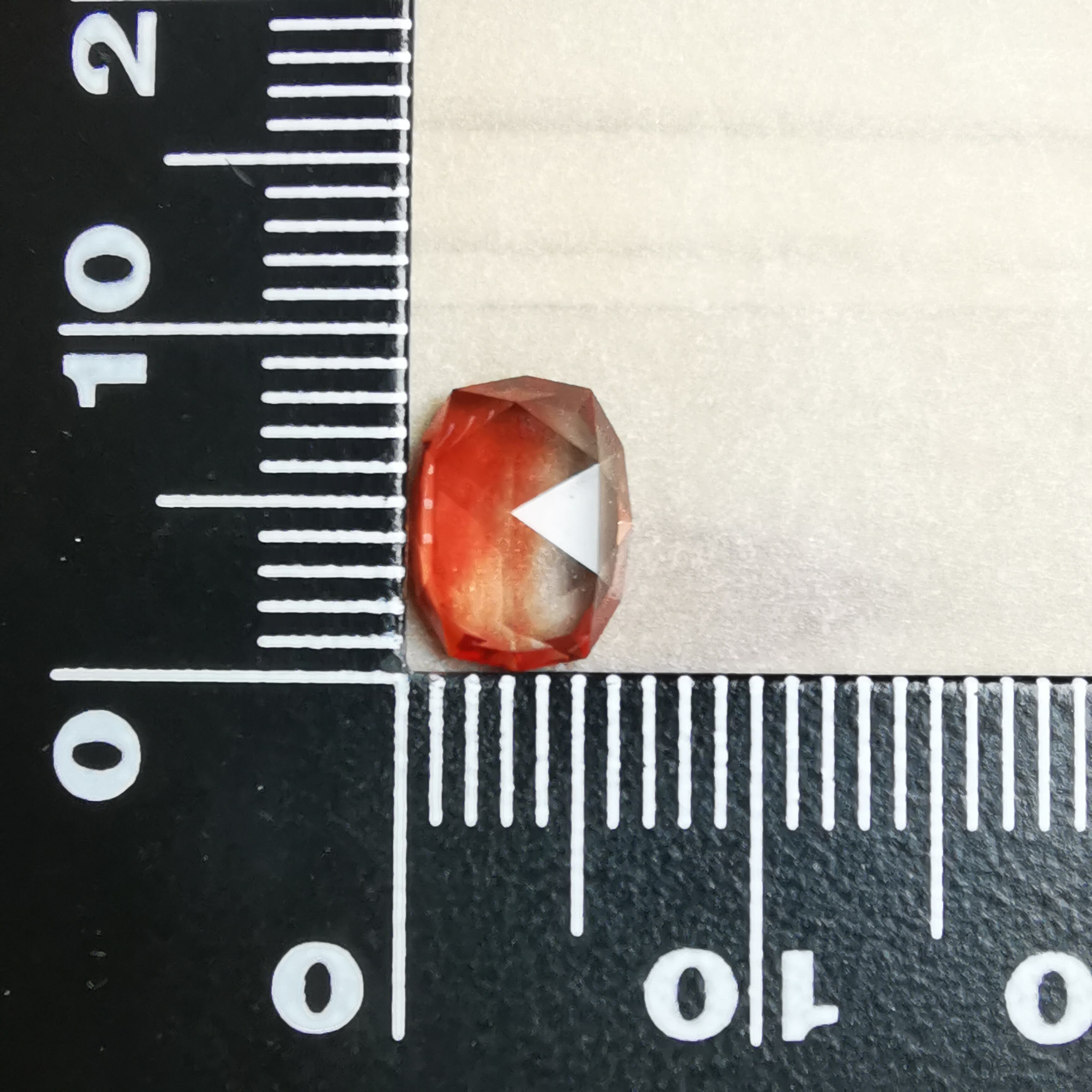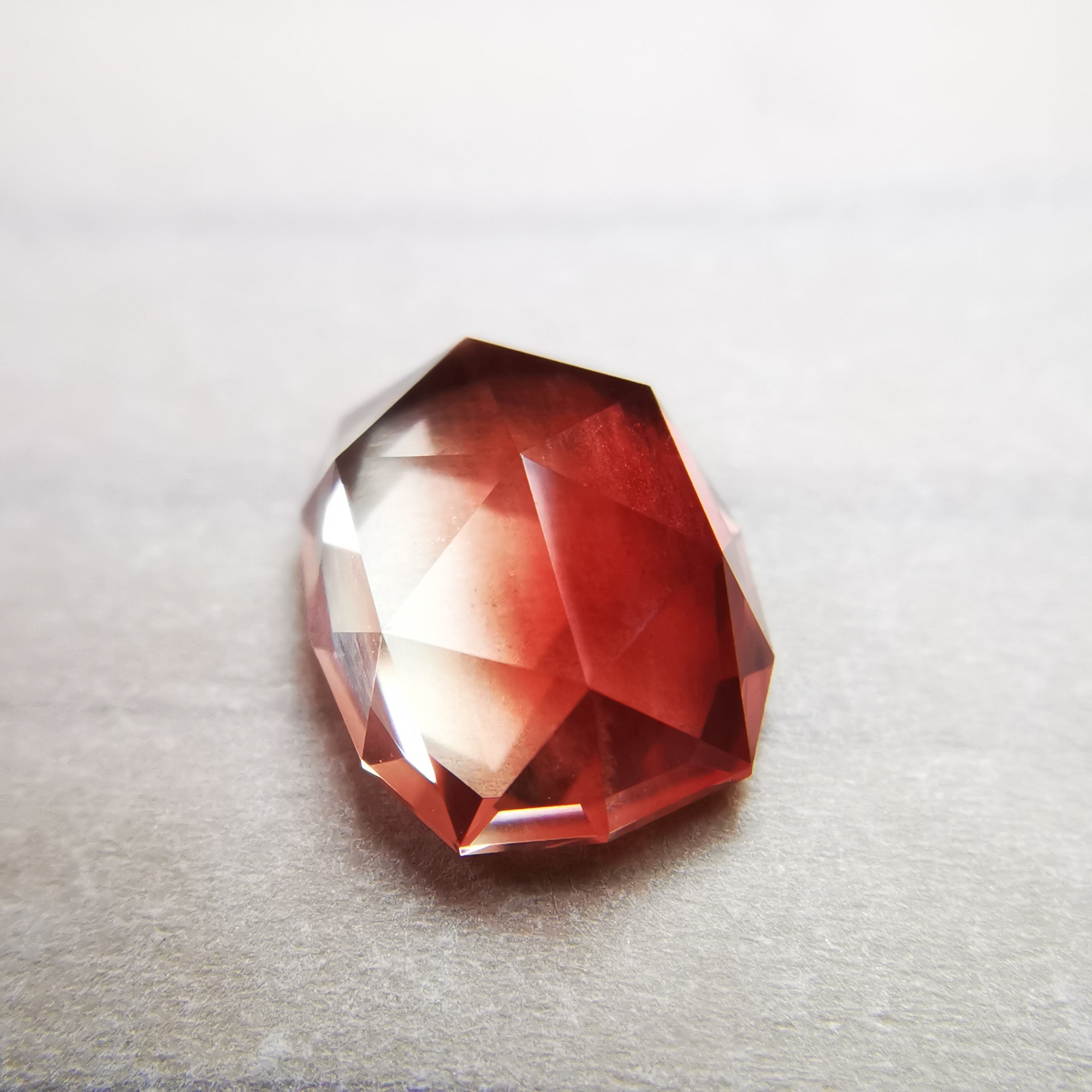 真上から見ると、ローズカットの中心の峰を少し超える辺りまで赤みが広がります。