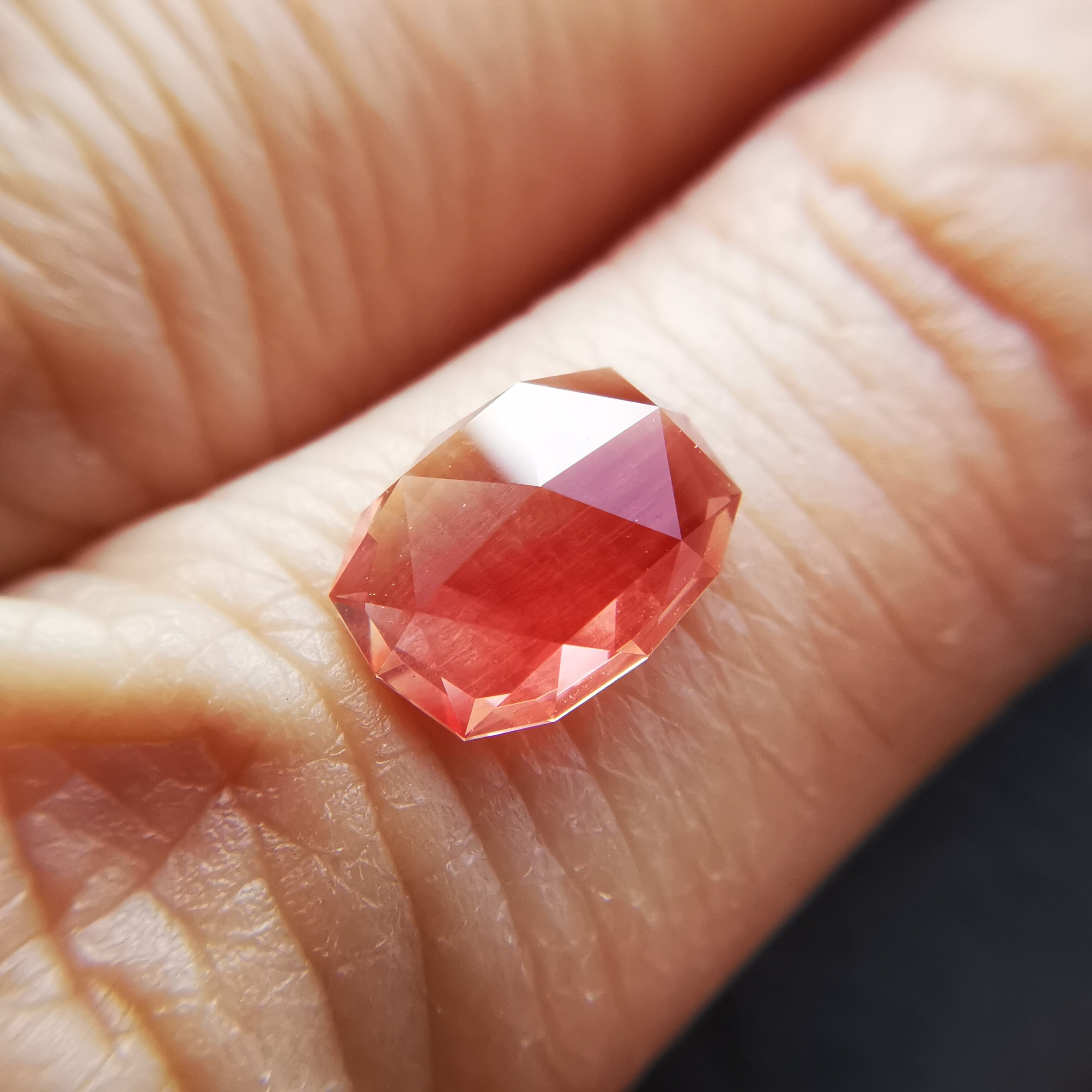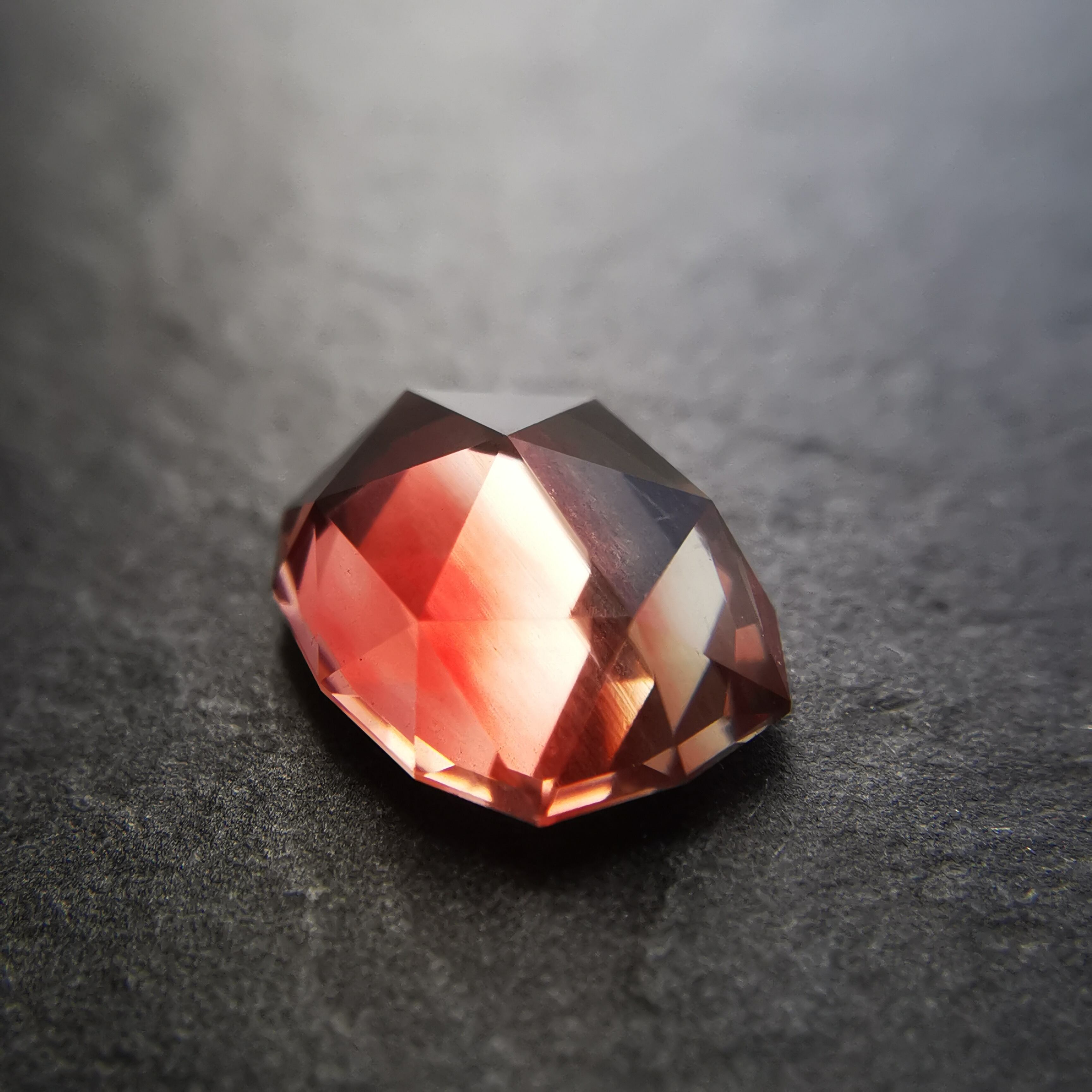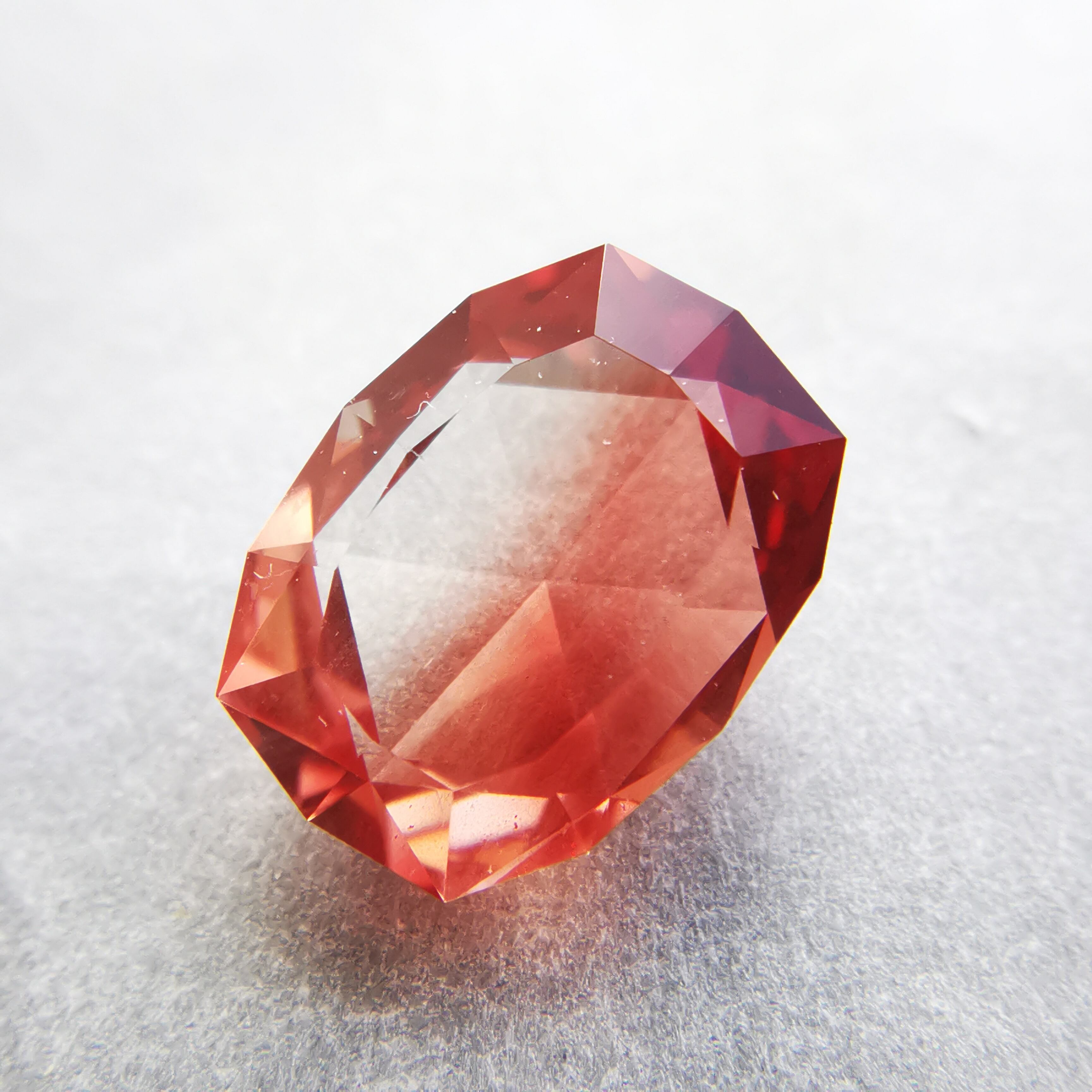 真上から見ると、ローズカットの中心の峰を少し超える辺りまで赤みが広がります。
