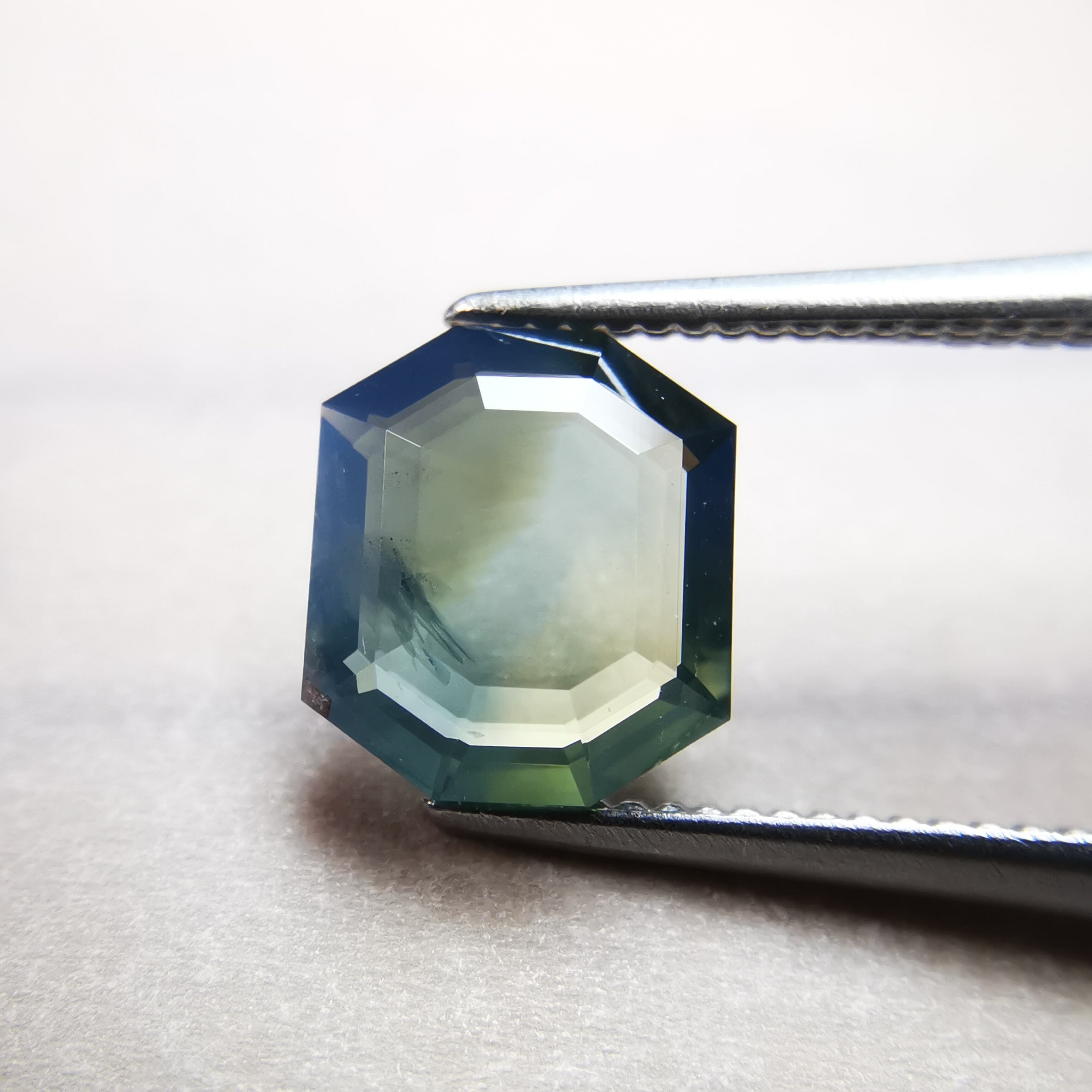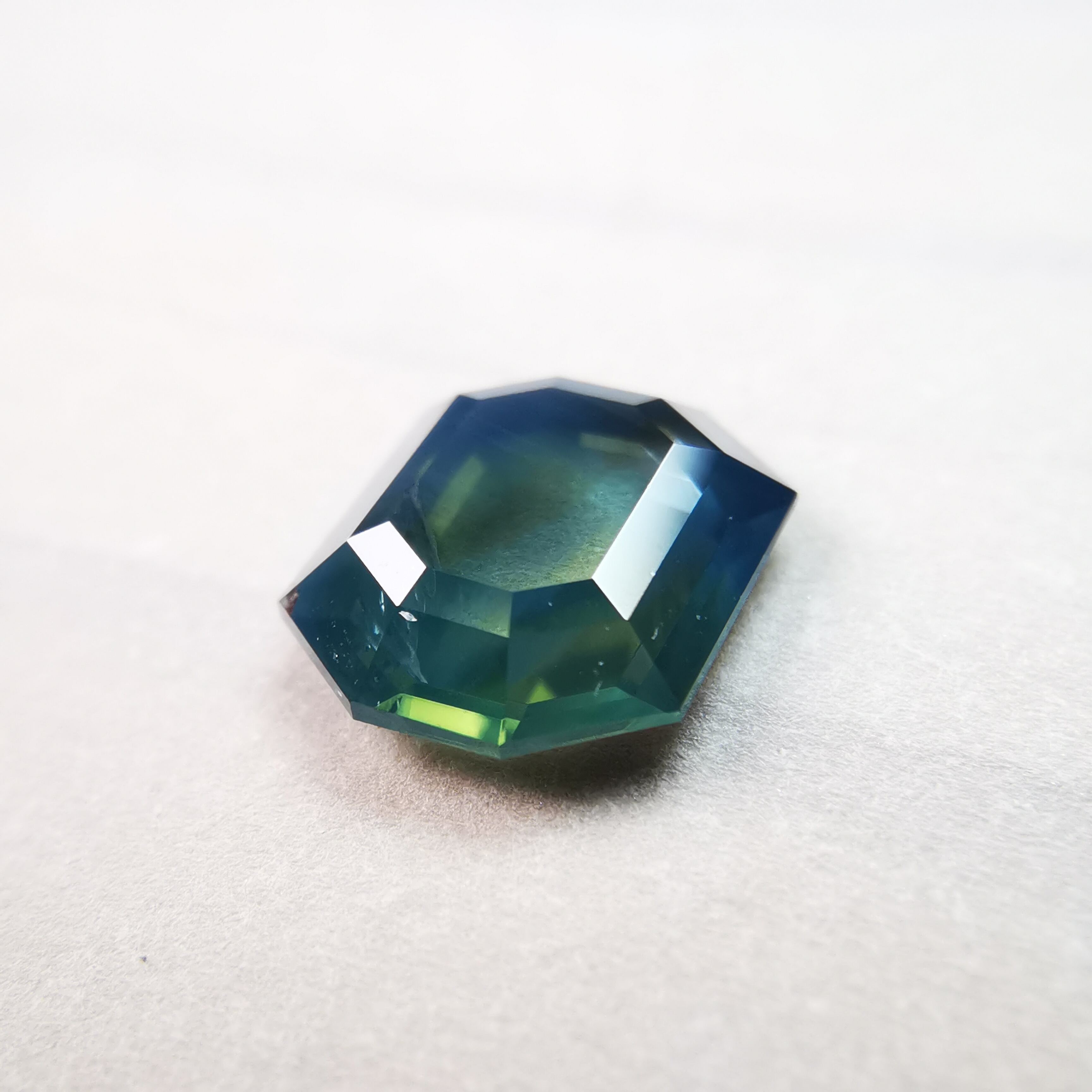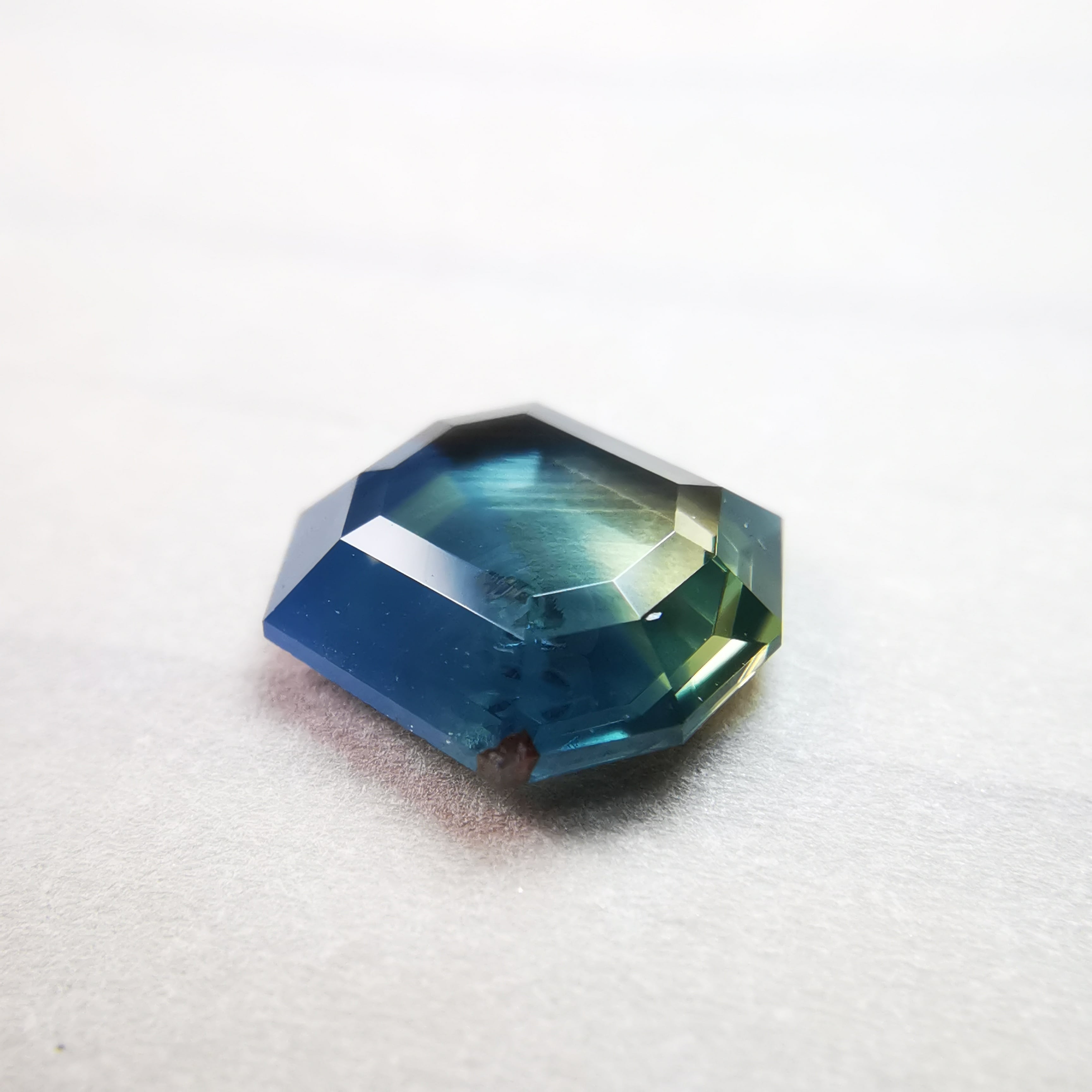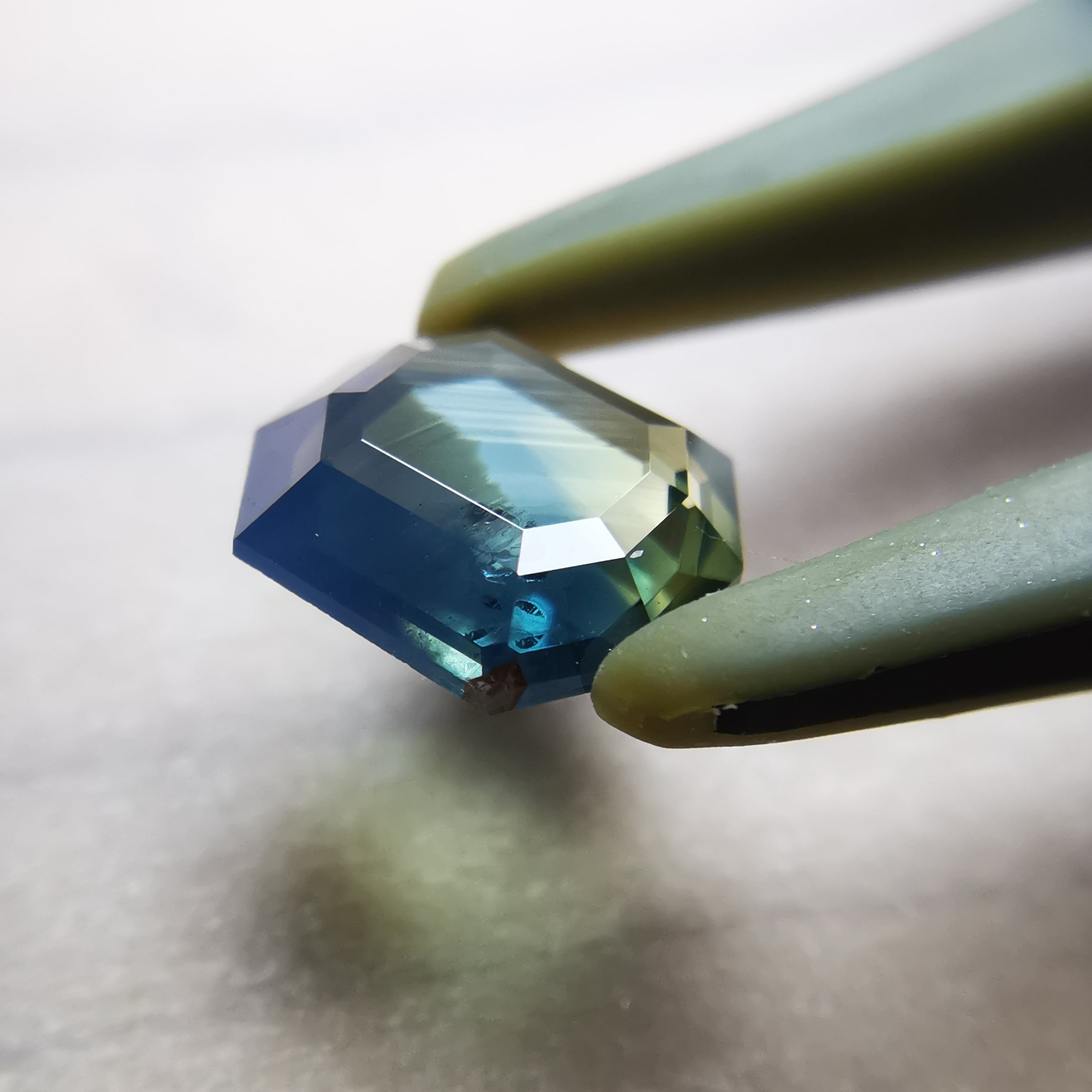 薄い緑みの黃/刈安色と、くすんだ緑みの青/錆納戸色のバイカラーに、灰みの黄/灰汁色のシルクが入った、バイカラーどころじゃない、色々見えてるサファイアです。