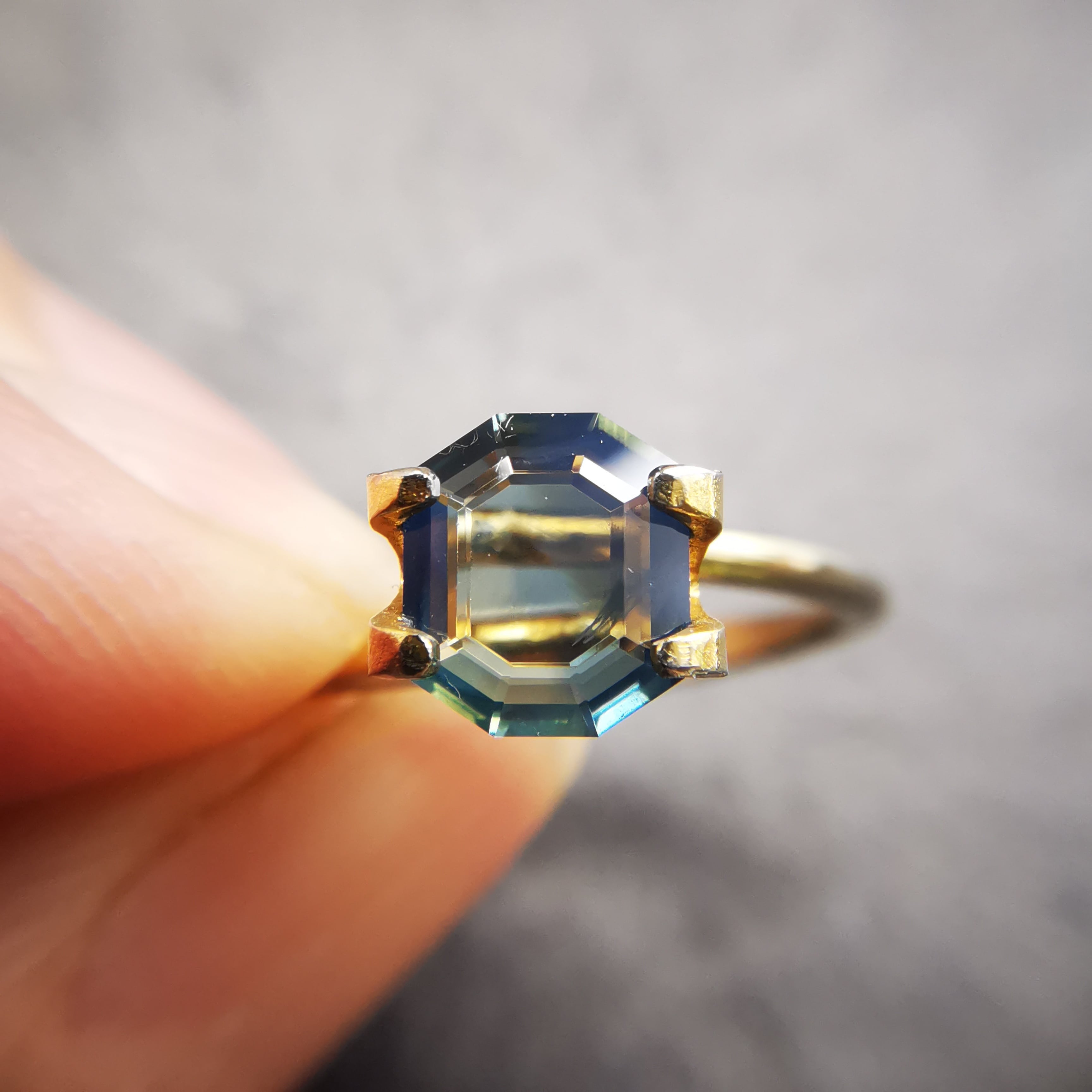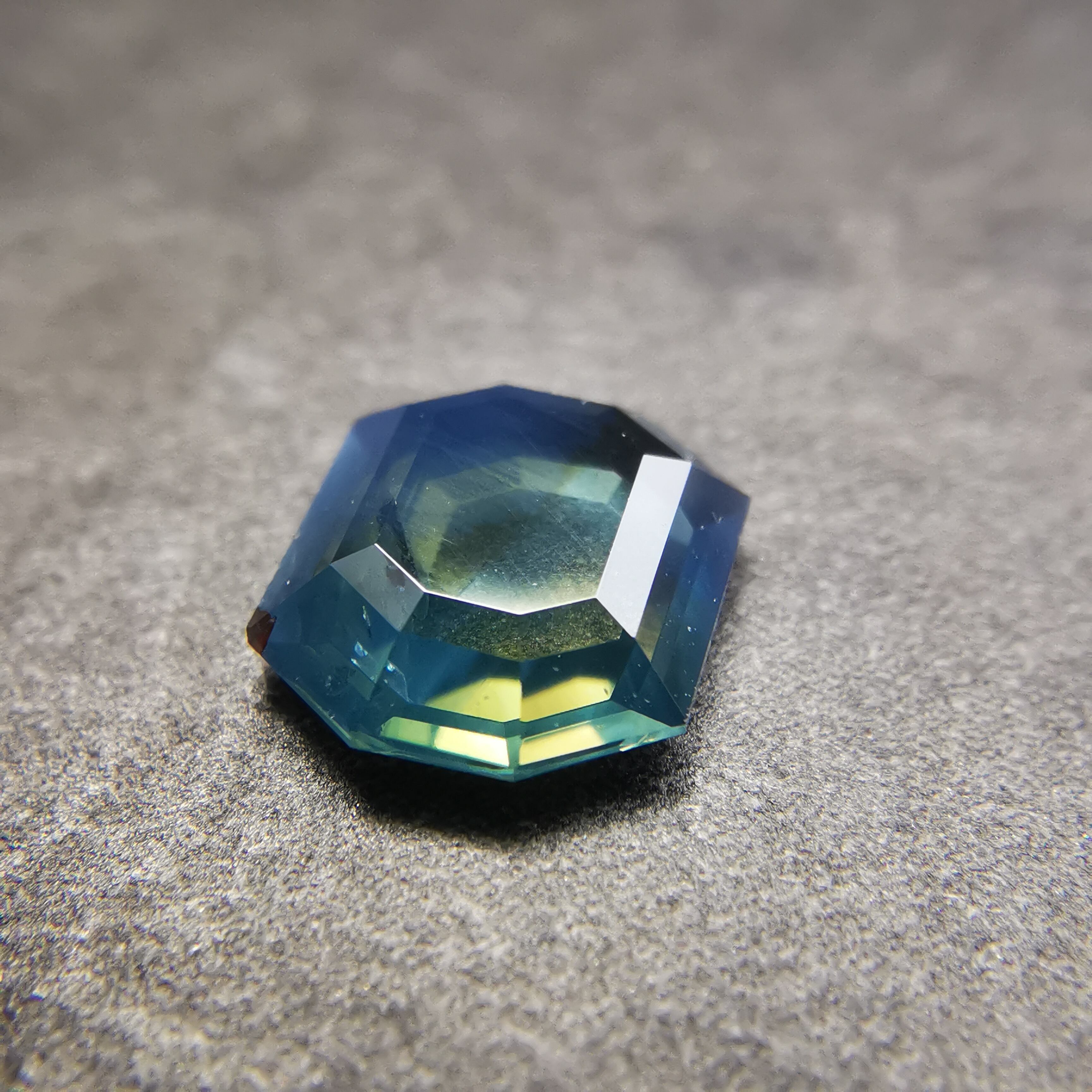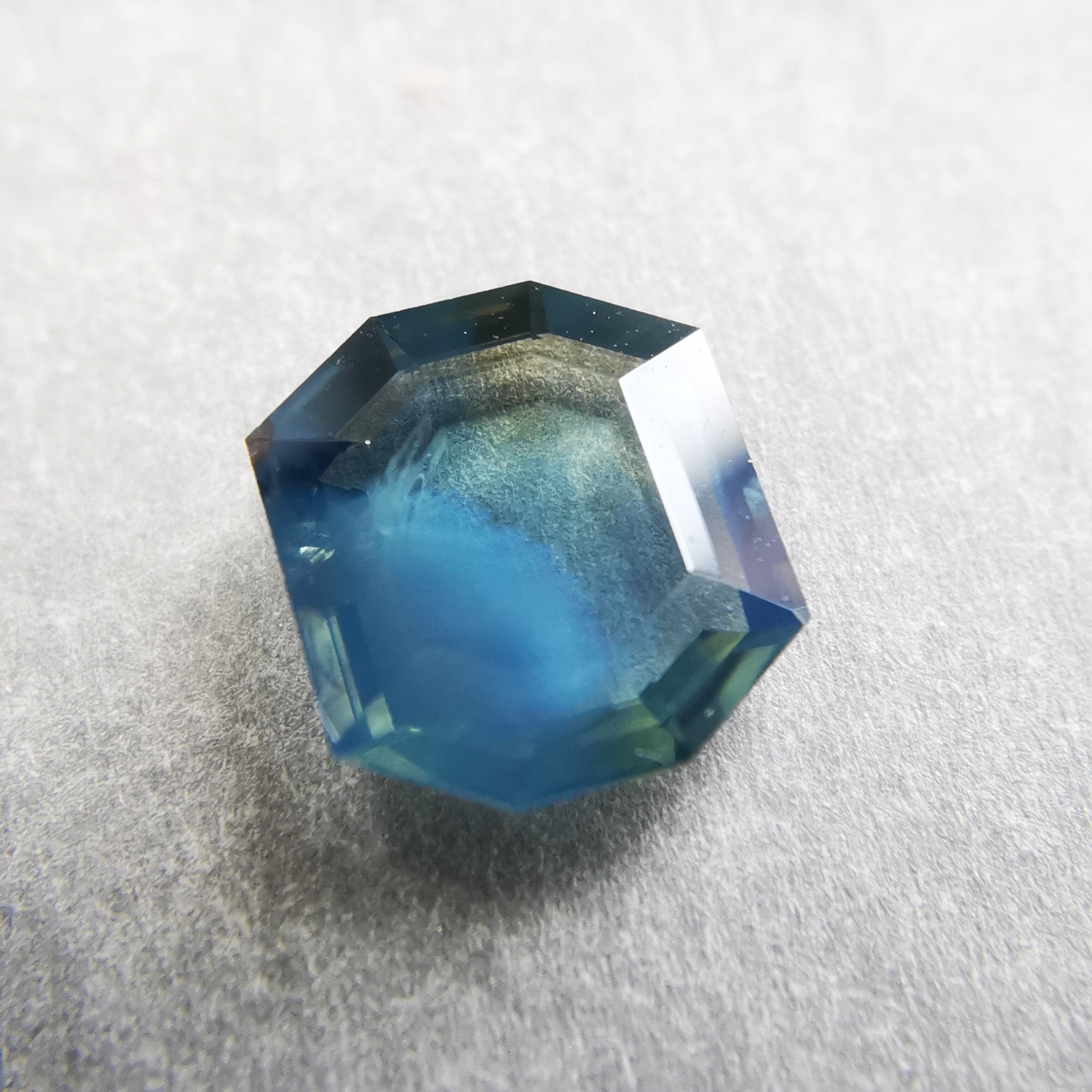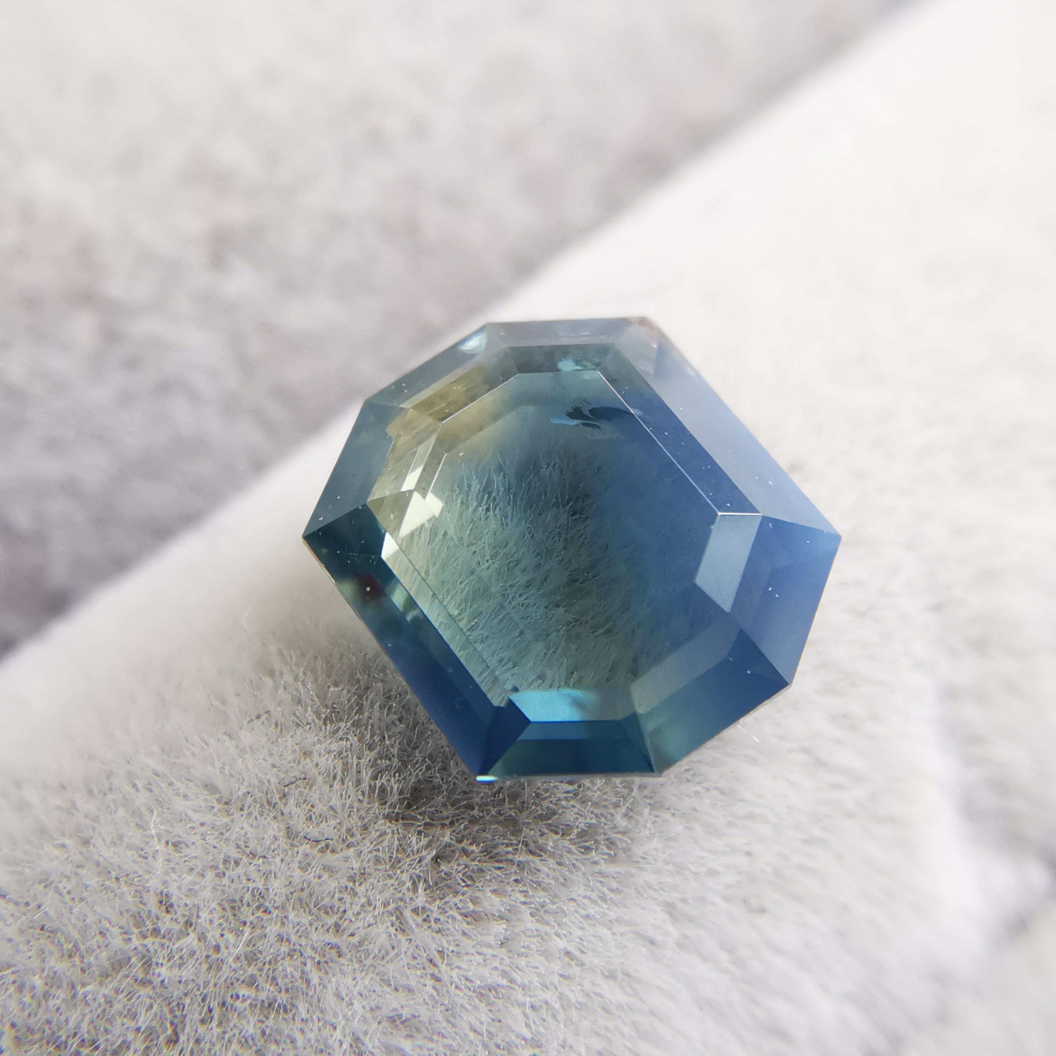 薄い緑みの黃/刈安色と、くすんだ緑みの青/錆納戸色のバイカラーに、灰みの黄/灰汁色のシルクが入った、バイカラーどころじゃない、色々見えてるサファイアです。