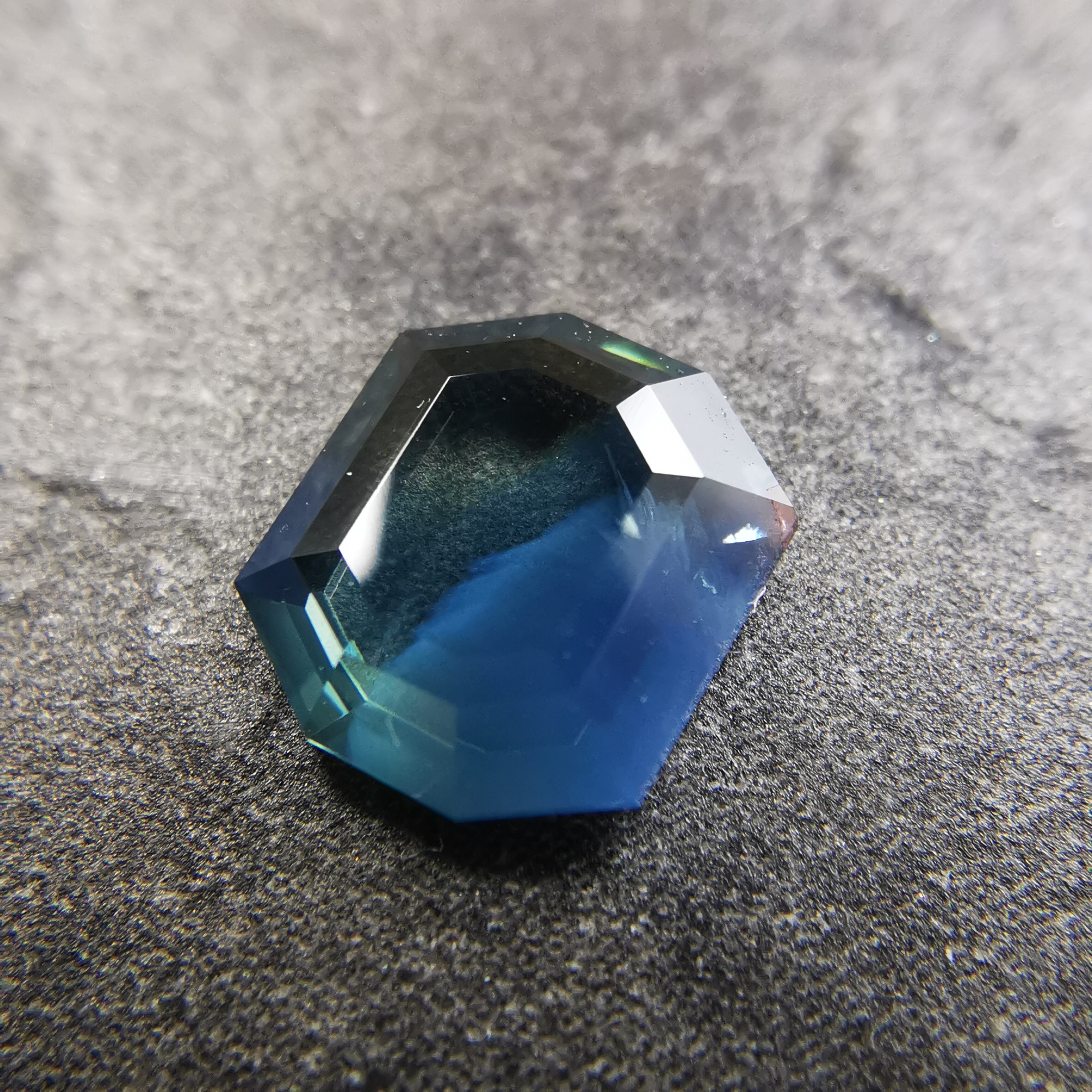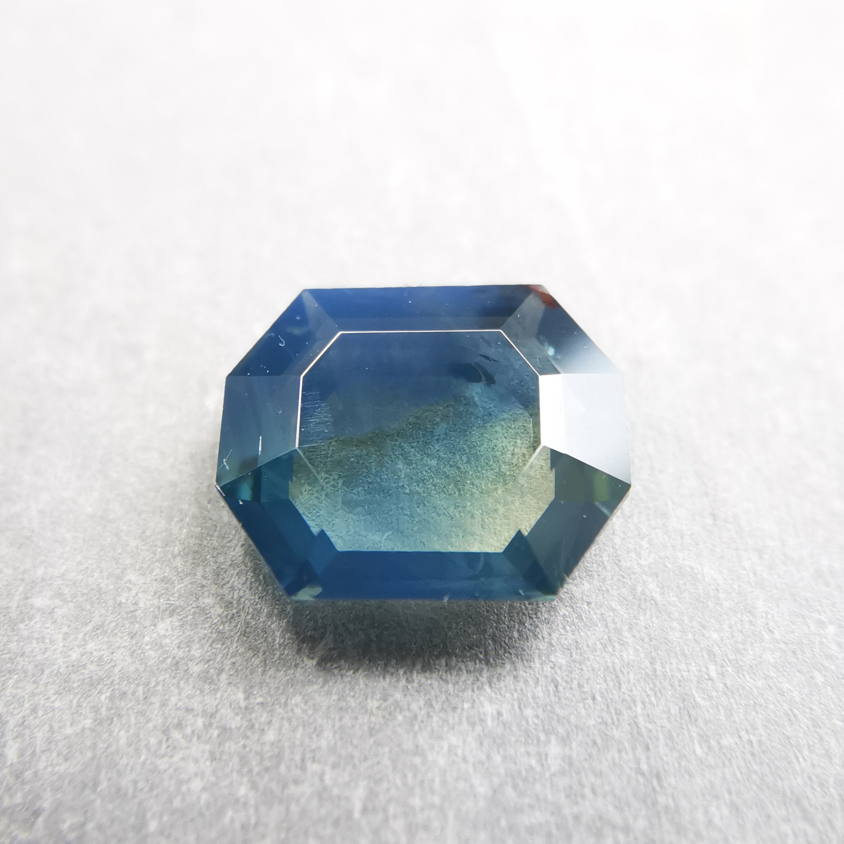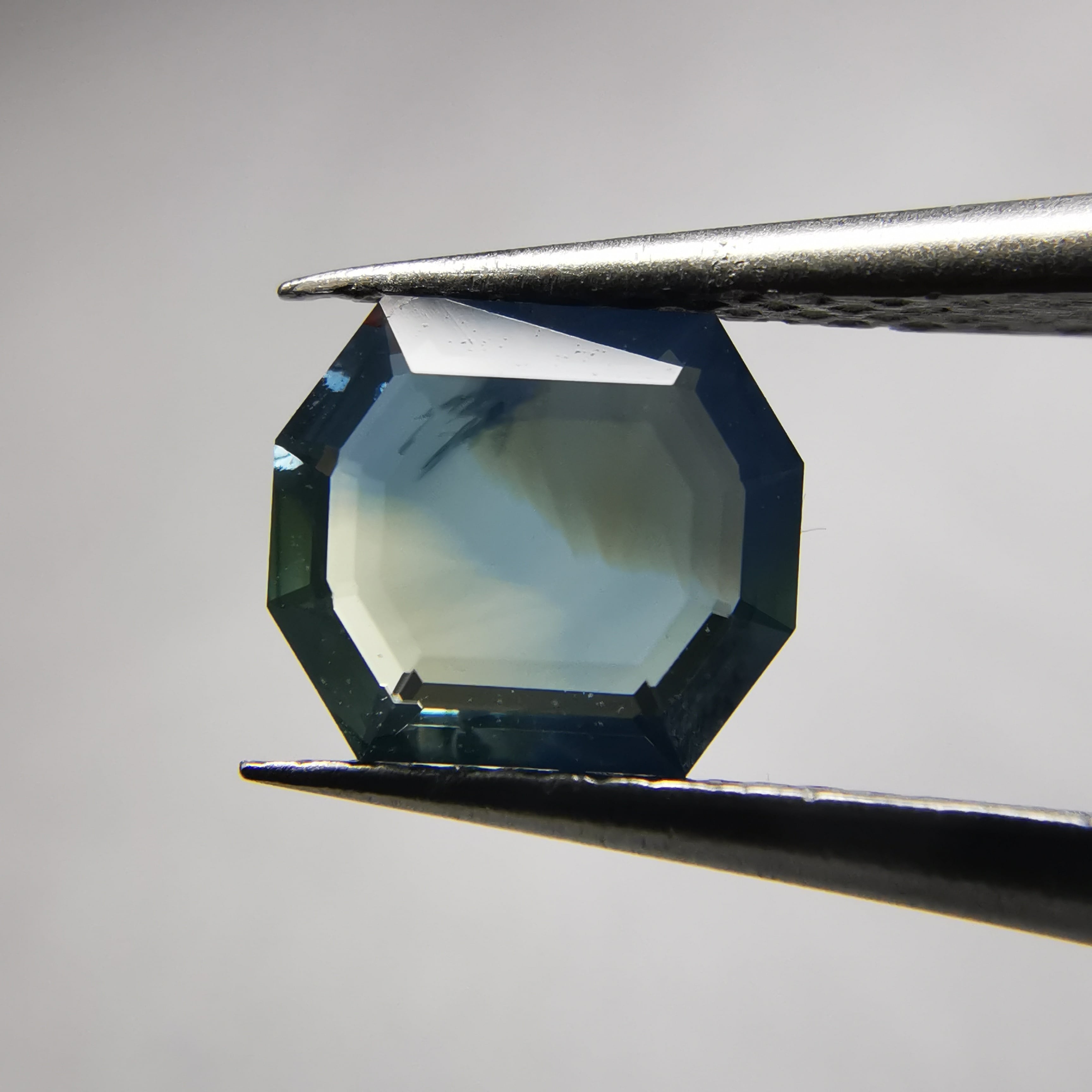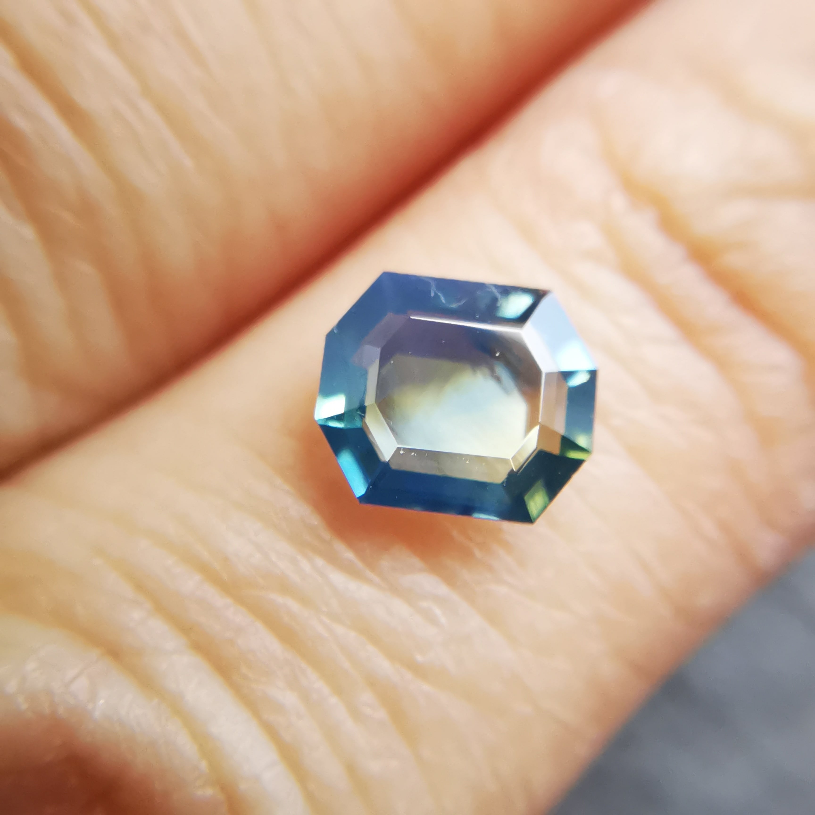 薄い緑みの黃/刈安色と、くすんだ緑みの青/錆納戸色のバイカラーに、灰みの黄/灰汁色のシルクが入った、バイカラーどころじゃない、色々見えてるサファイアです。
