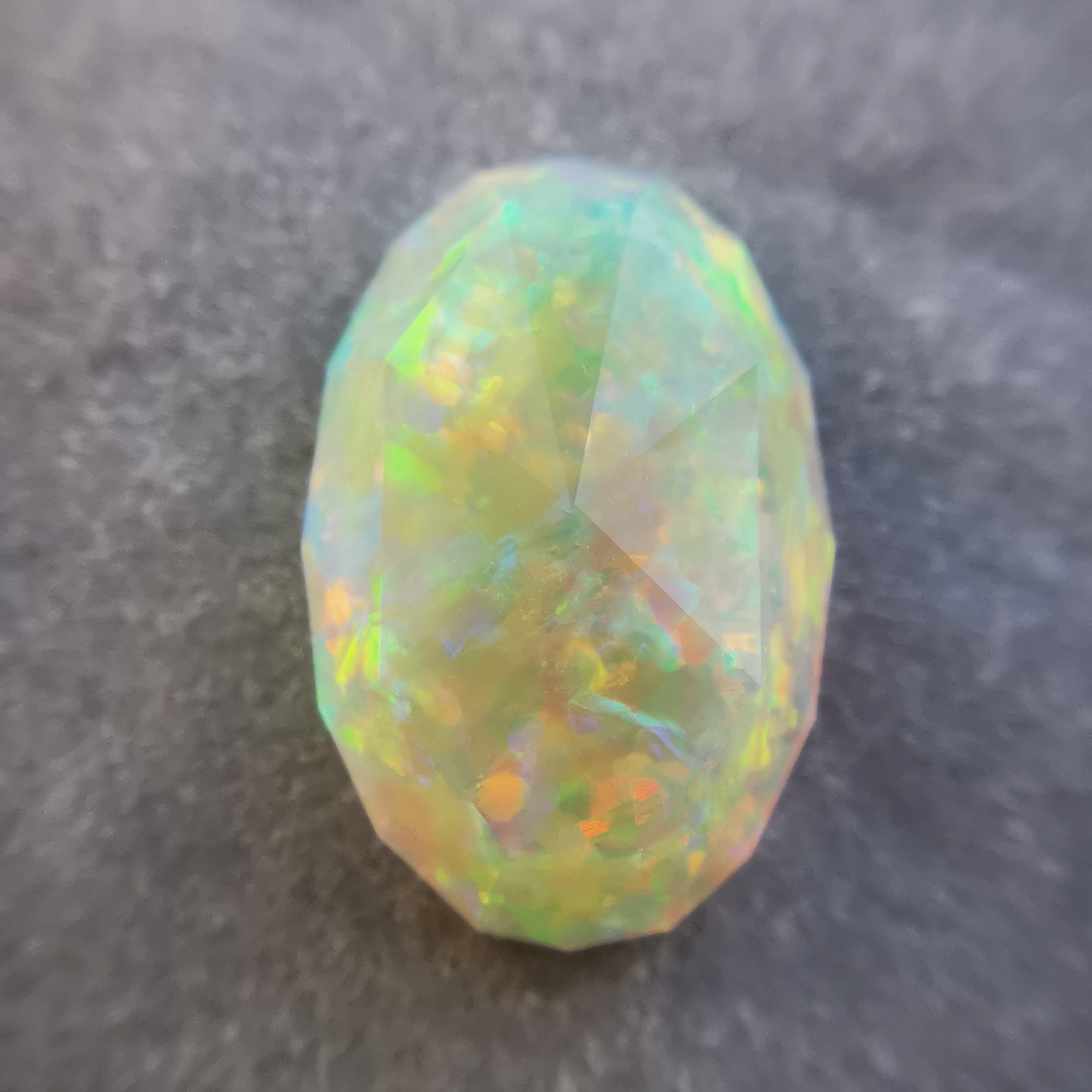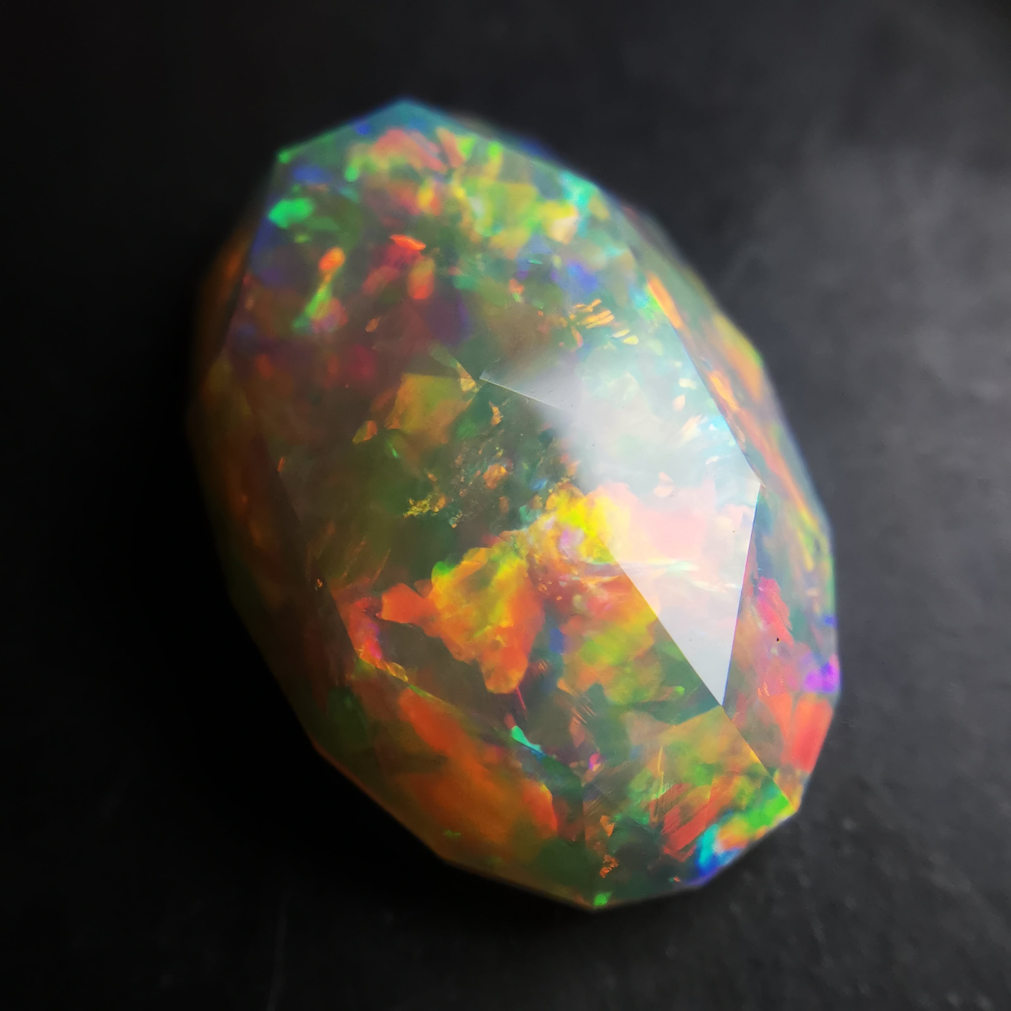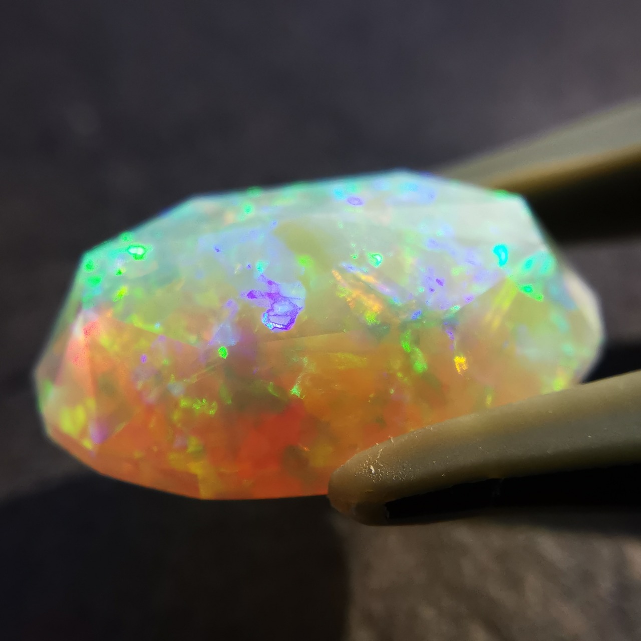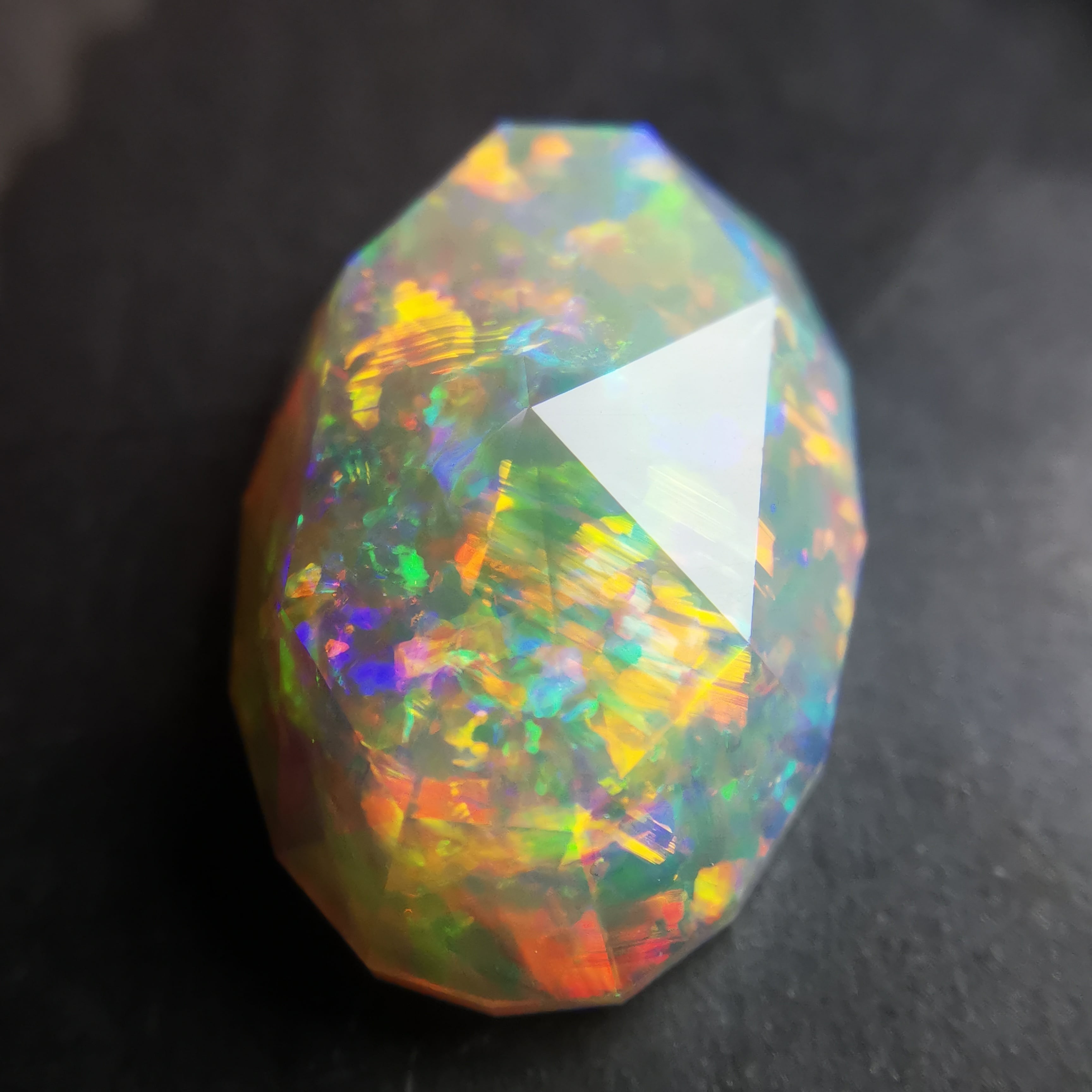 表面が曇っていて遊色が隠れていたので、カボションカットからローズカットにリカットしたところ、想像以上の遊色が現れ驚きました。