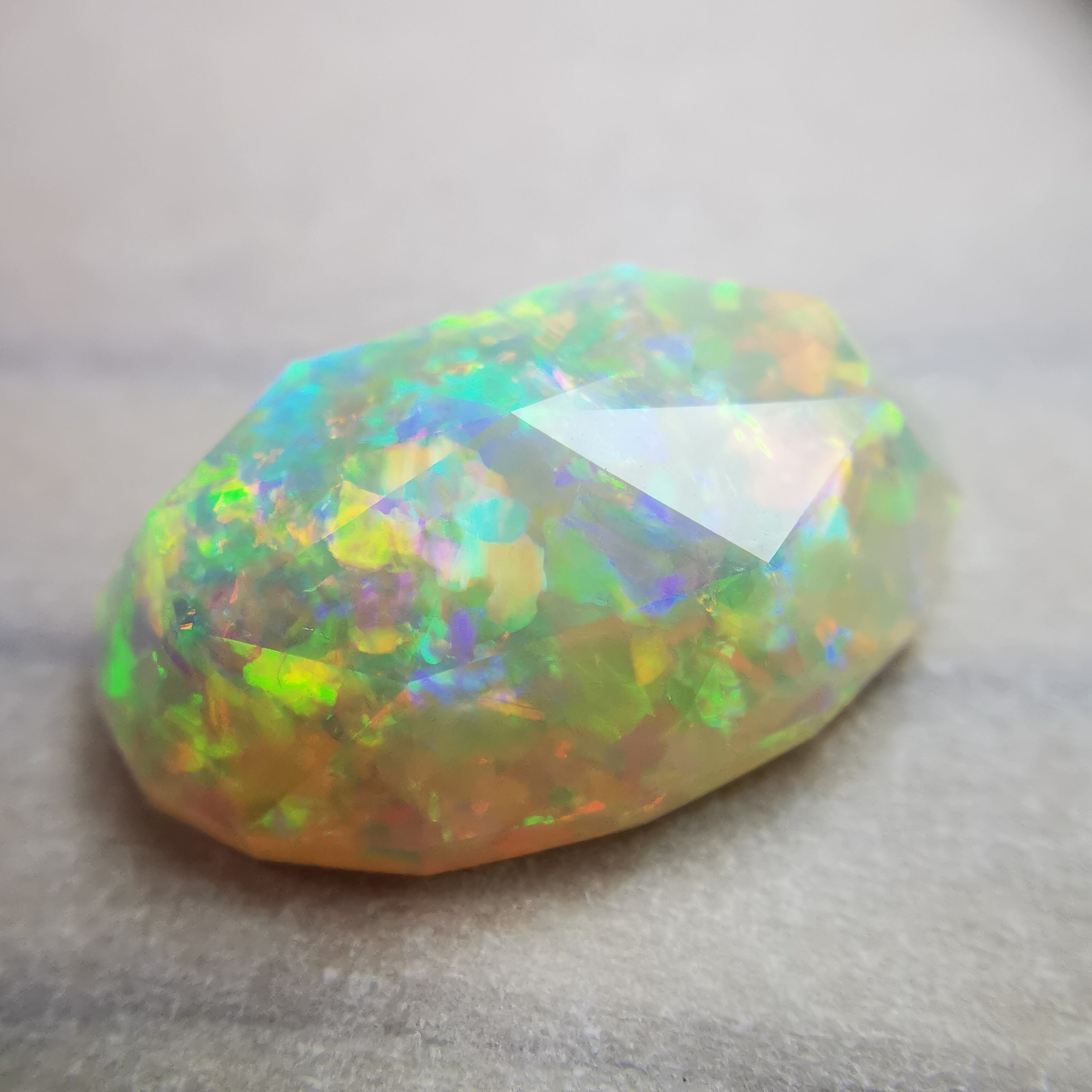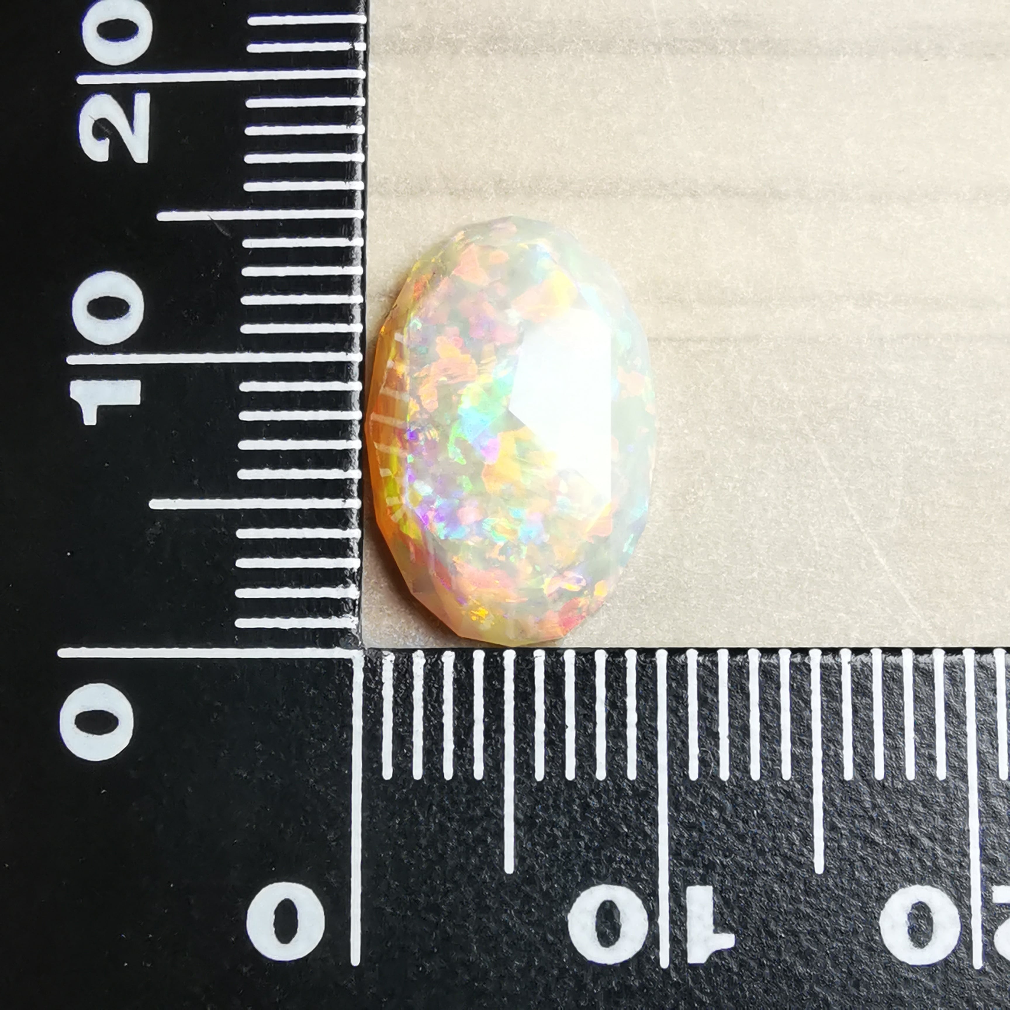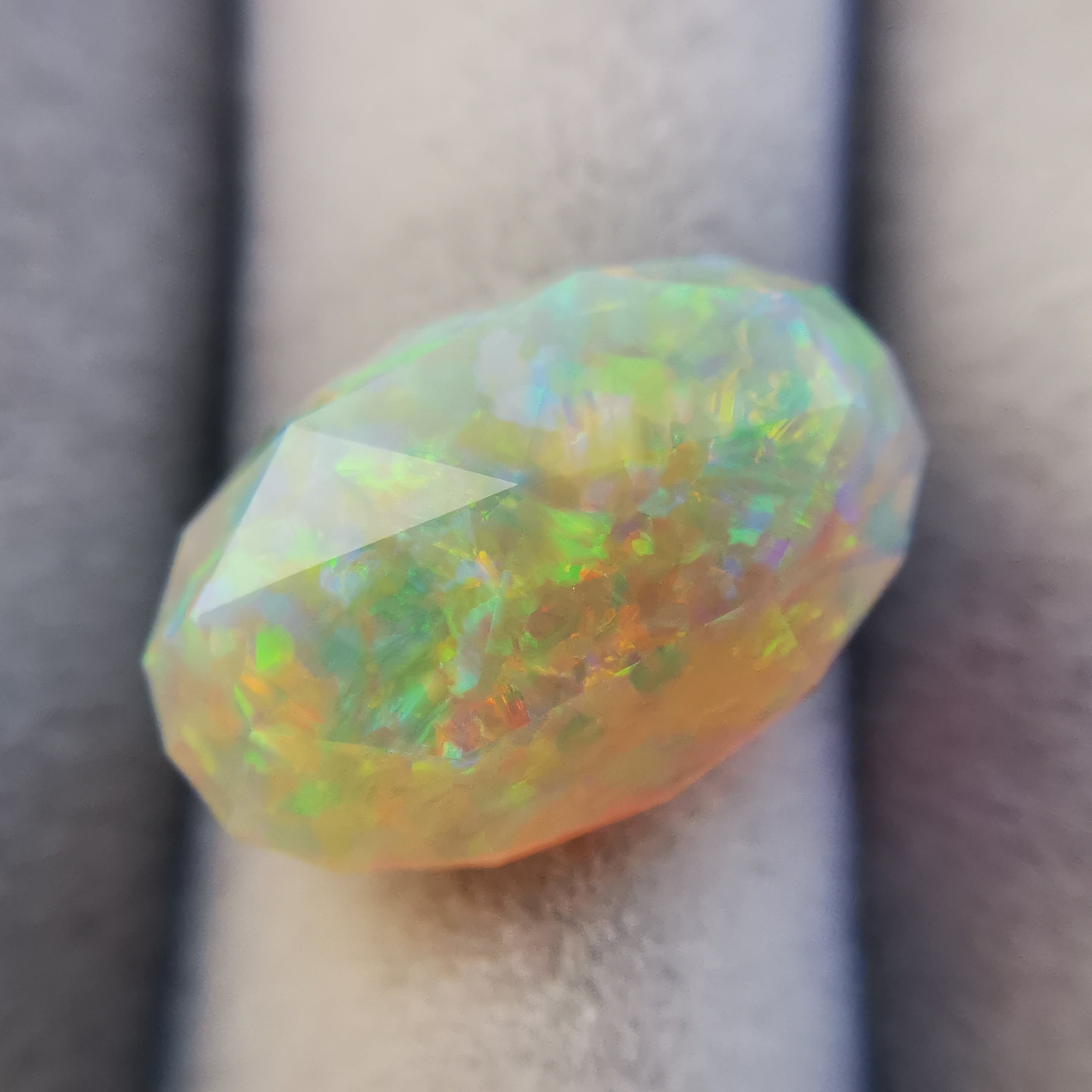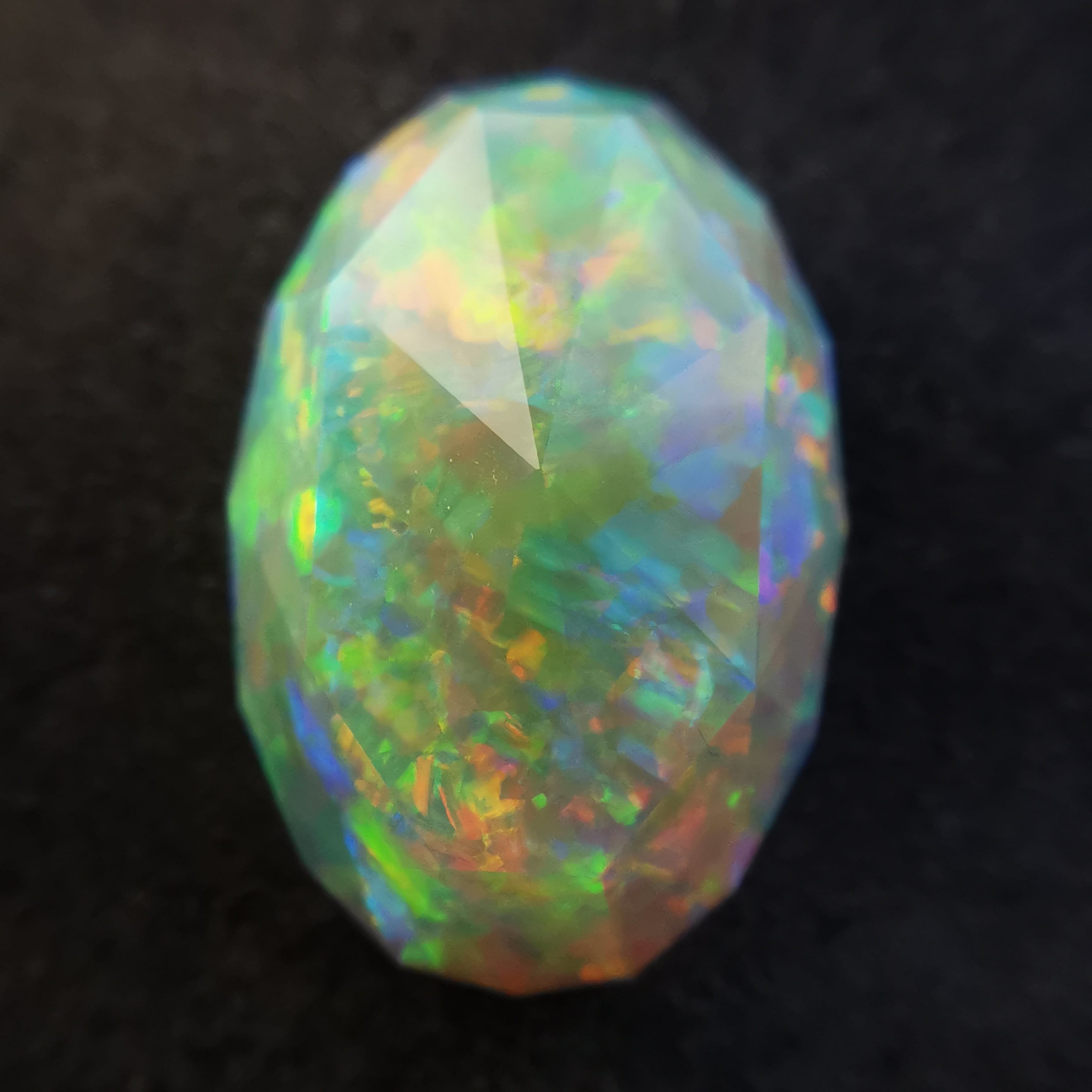 表面が曇っていて遊色が隠れていたので、カボションカットからローズカットにリカットしたところ、想像以上の遊色が現れ驚きました。