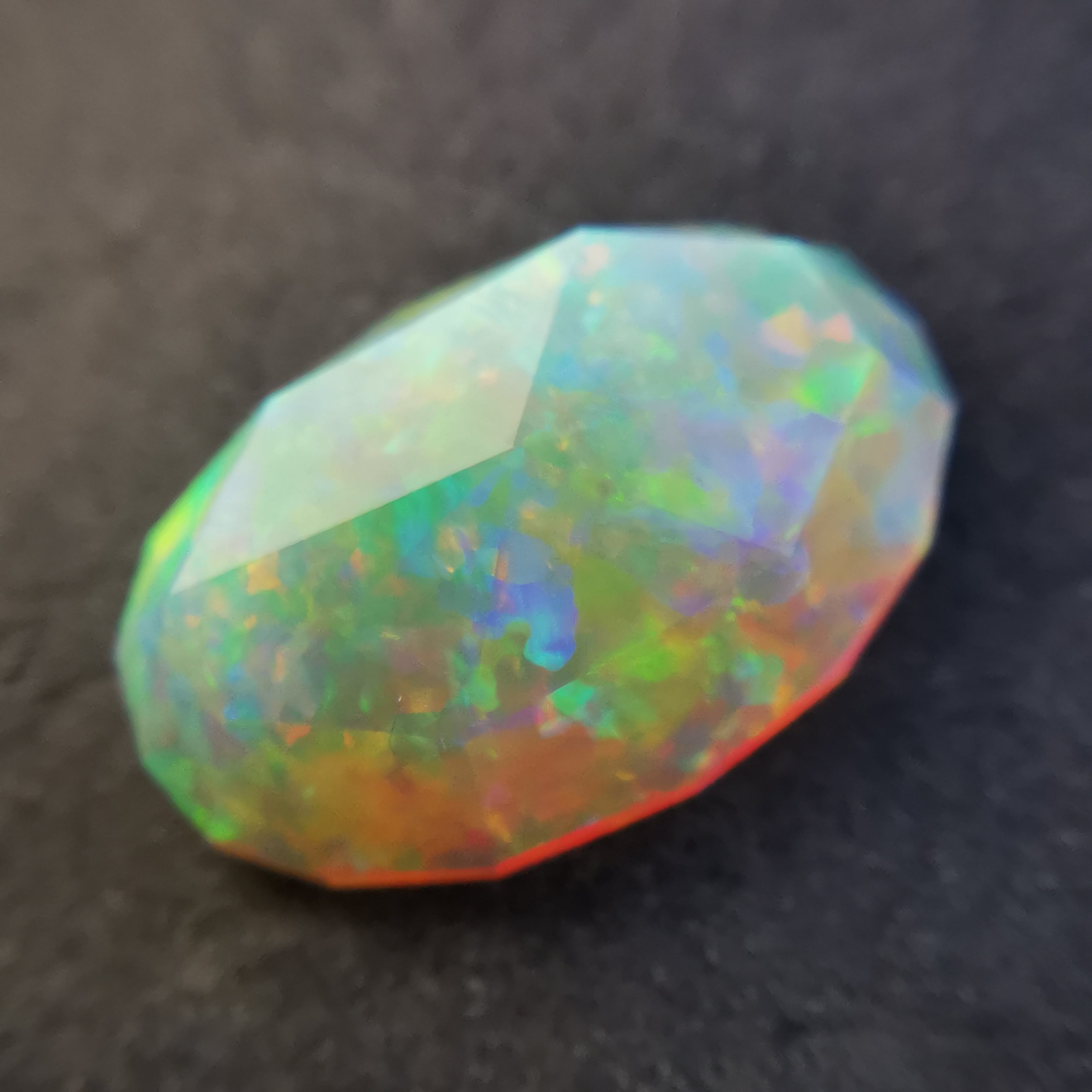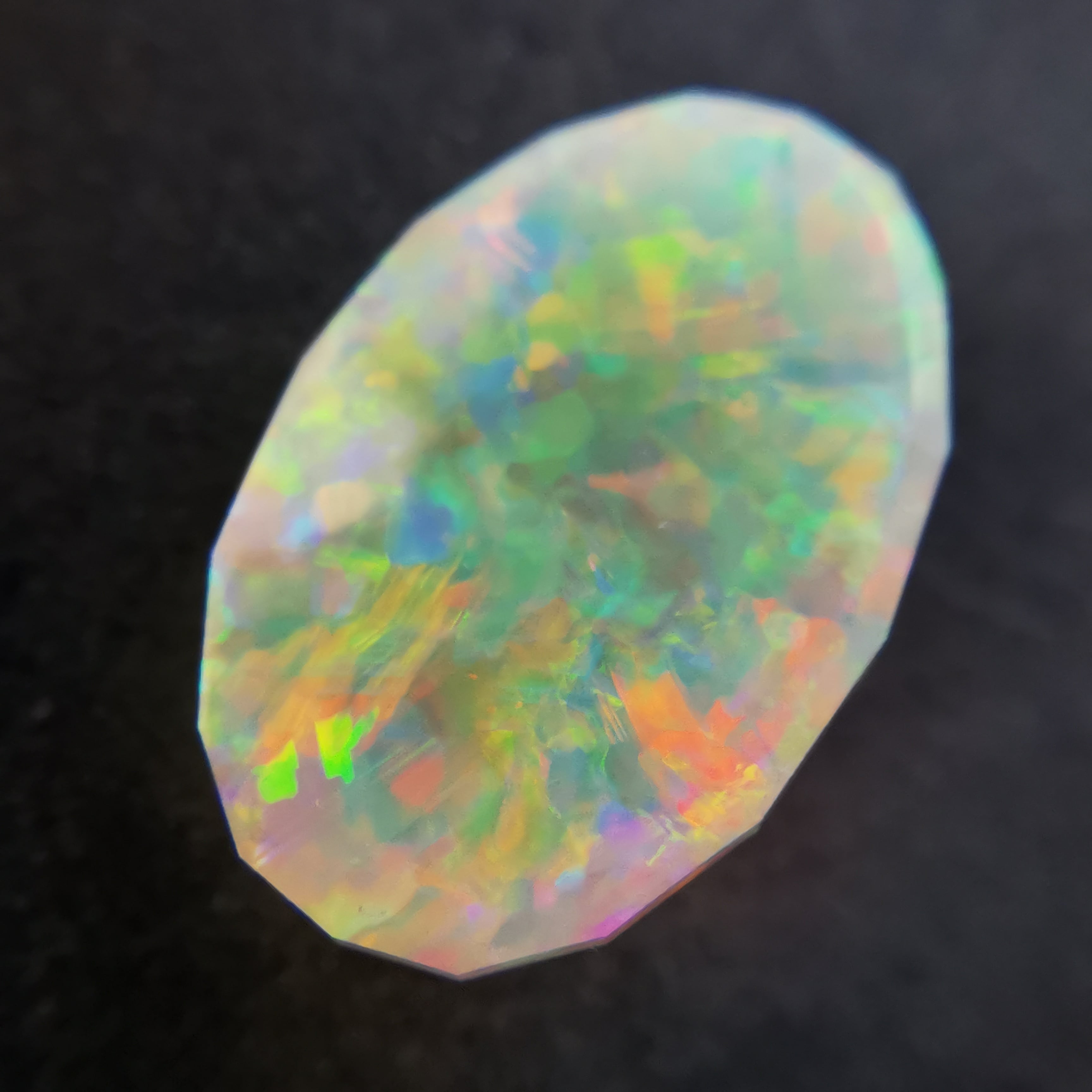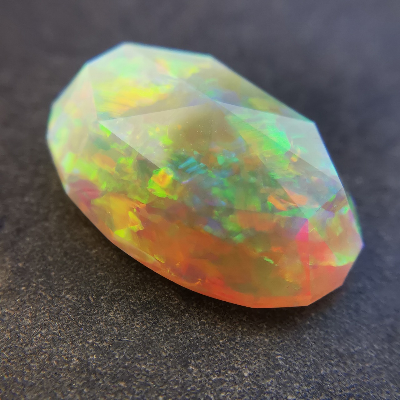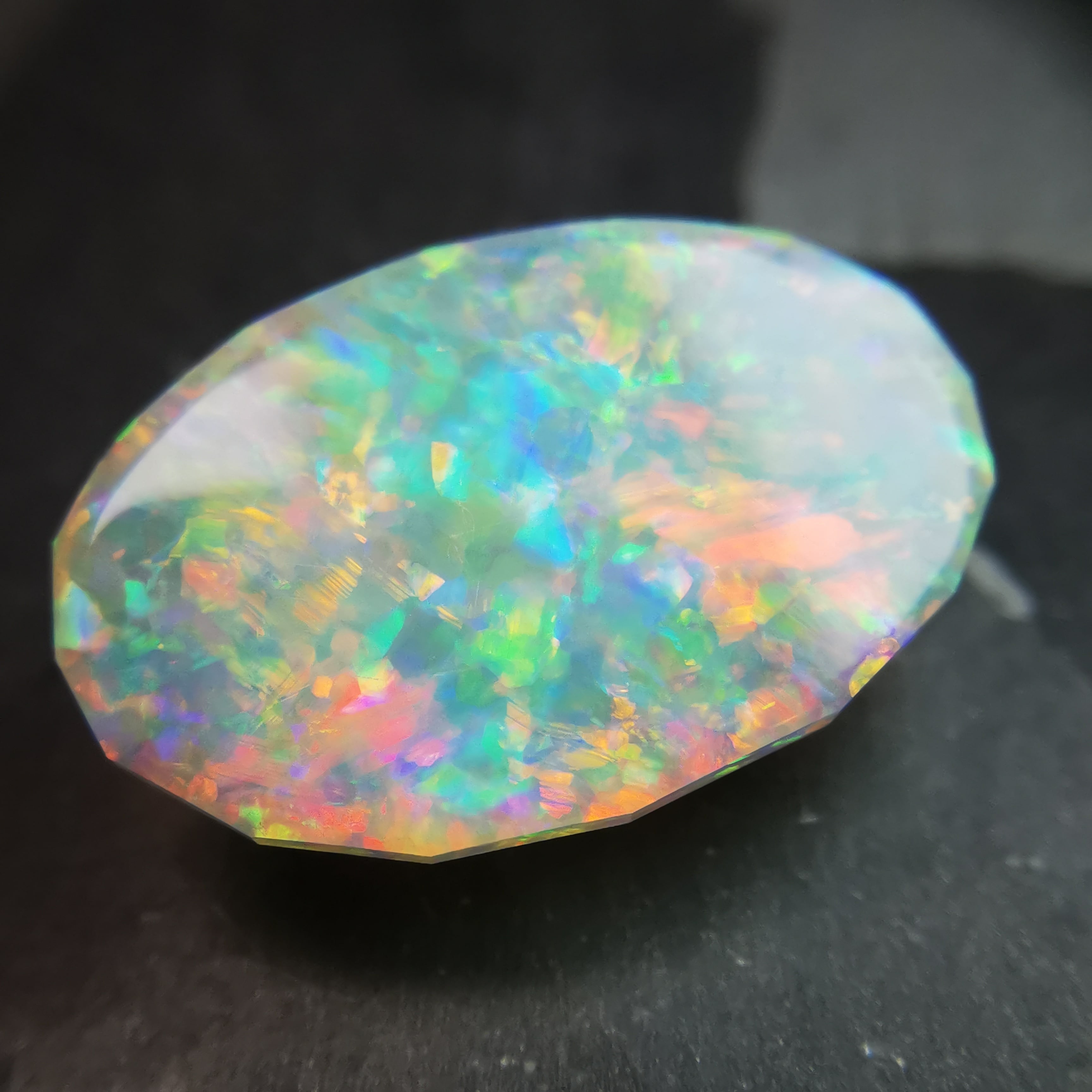 表面が曇っていて遊色が隠れていたので、カボションカットからローズカットにリカットしたところ、想像以上の遊色が現れ驚きました。