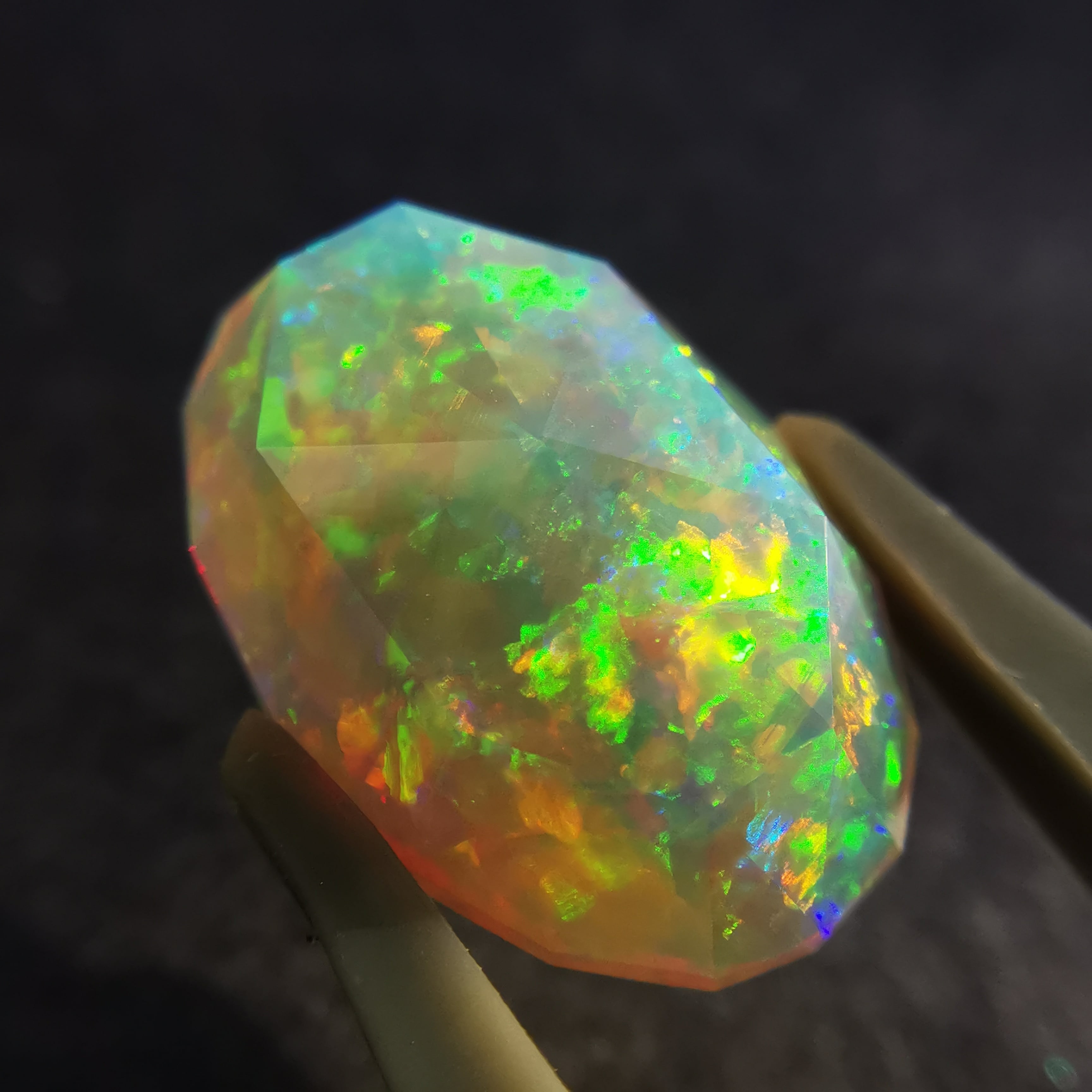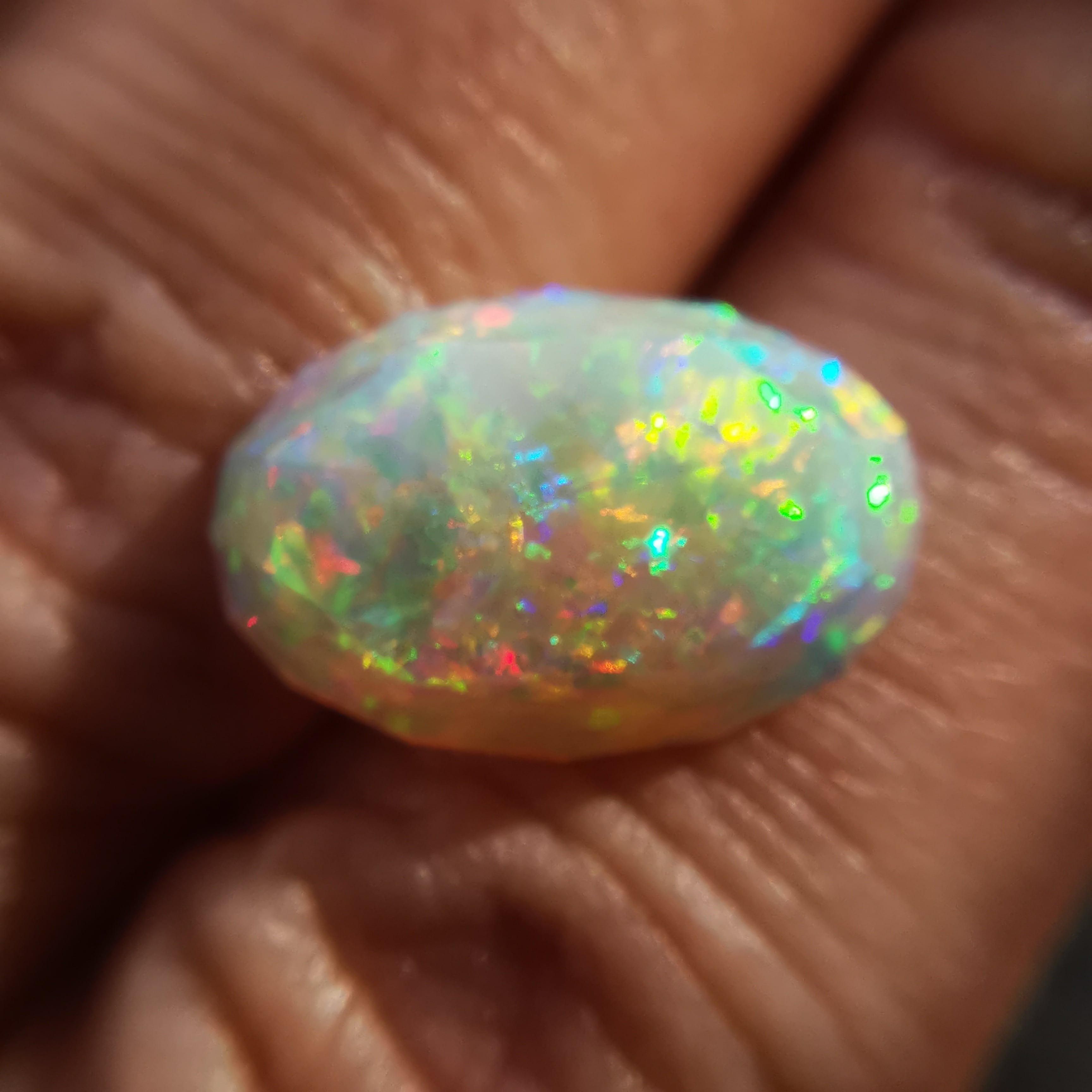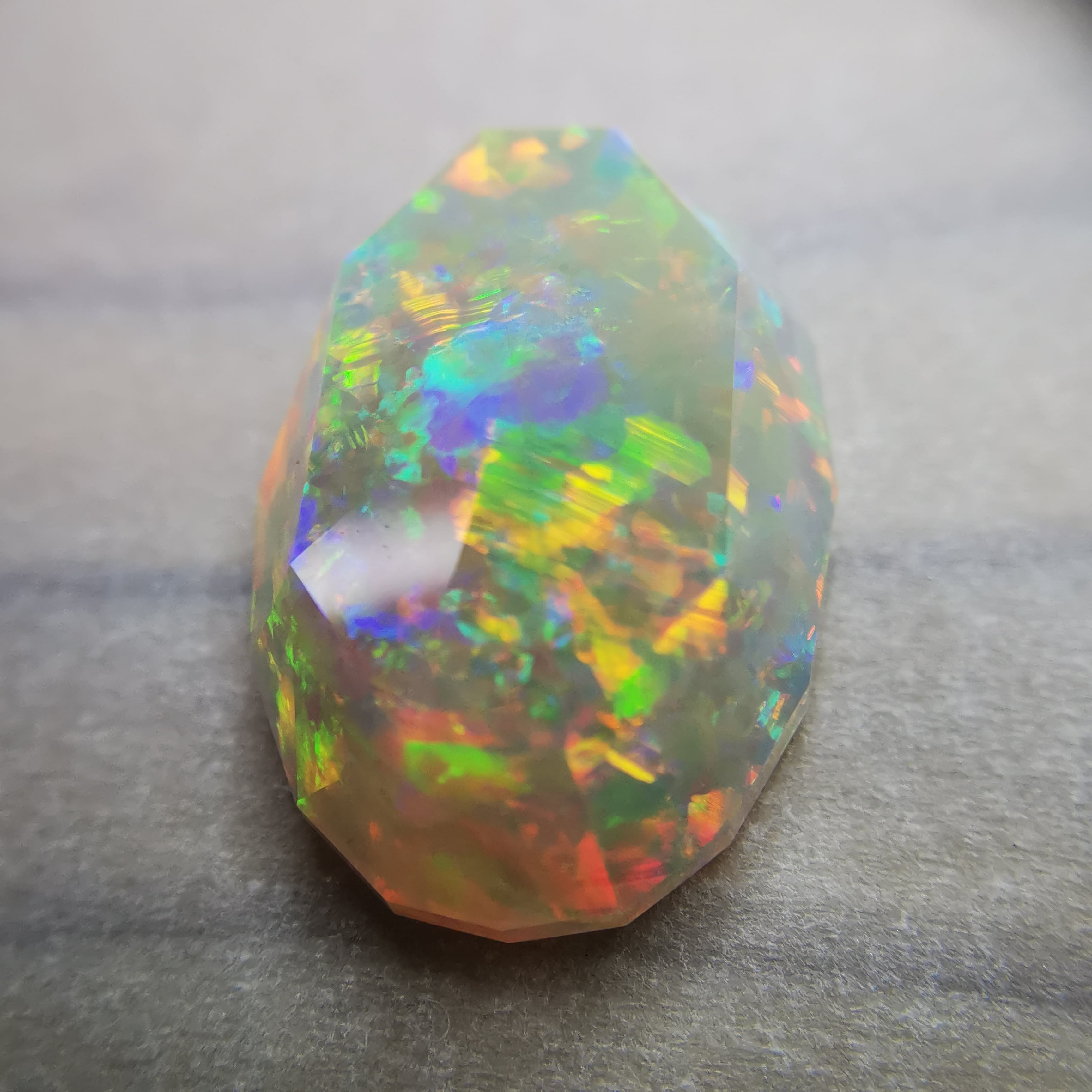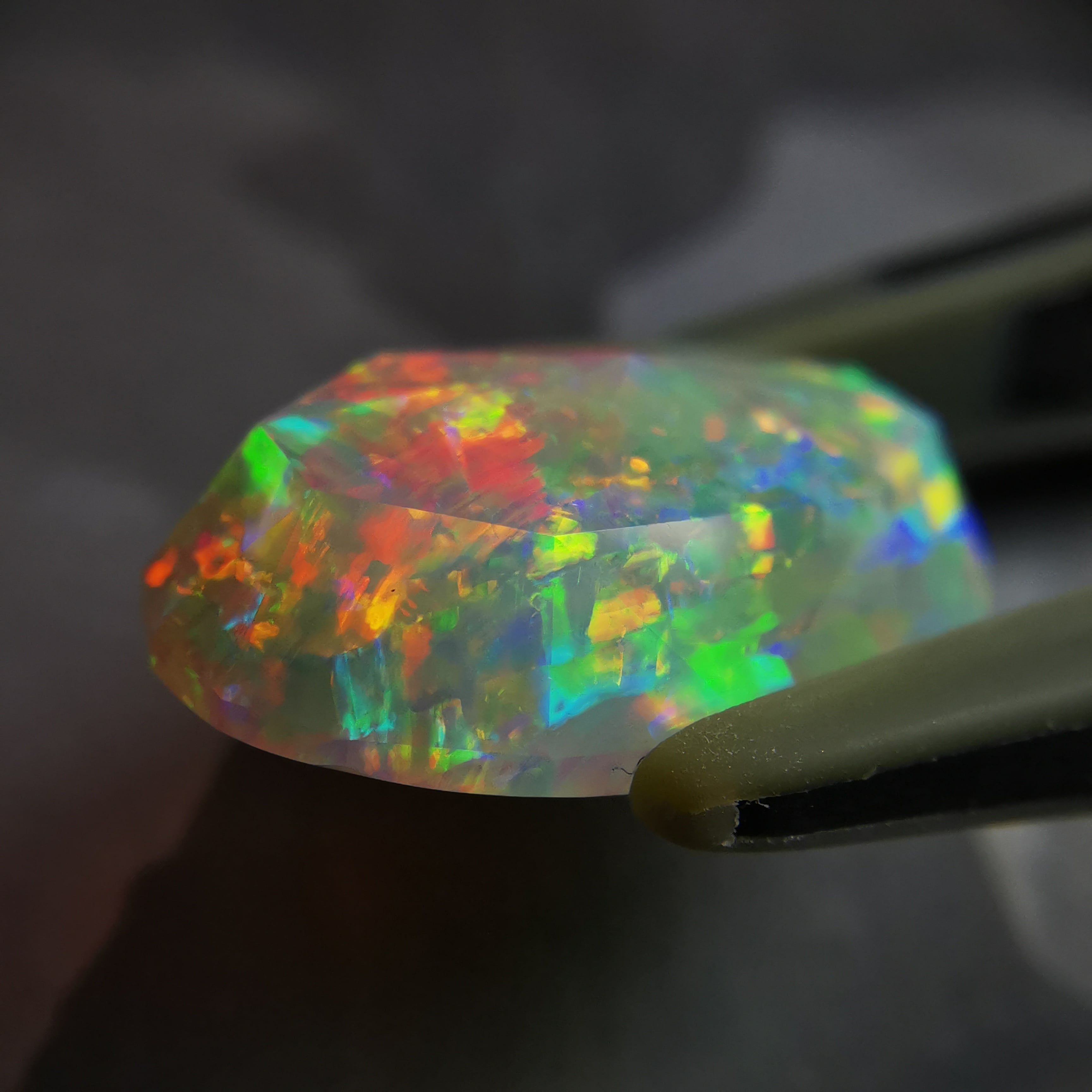 表面が曇っていて遊色が隠れていたので、カボションカットからローズカットにリカットしたところ、想像以上の遊色が現れ驚きました。