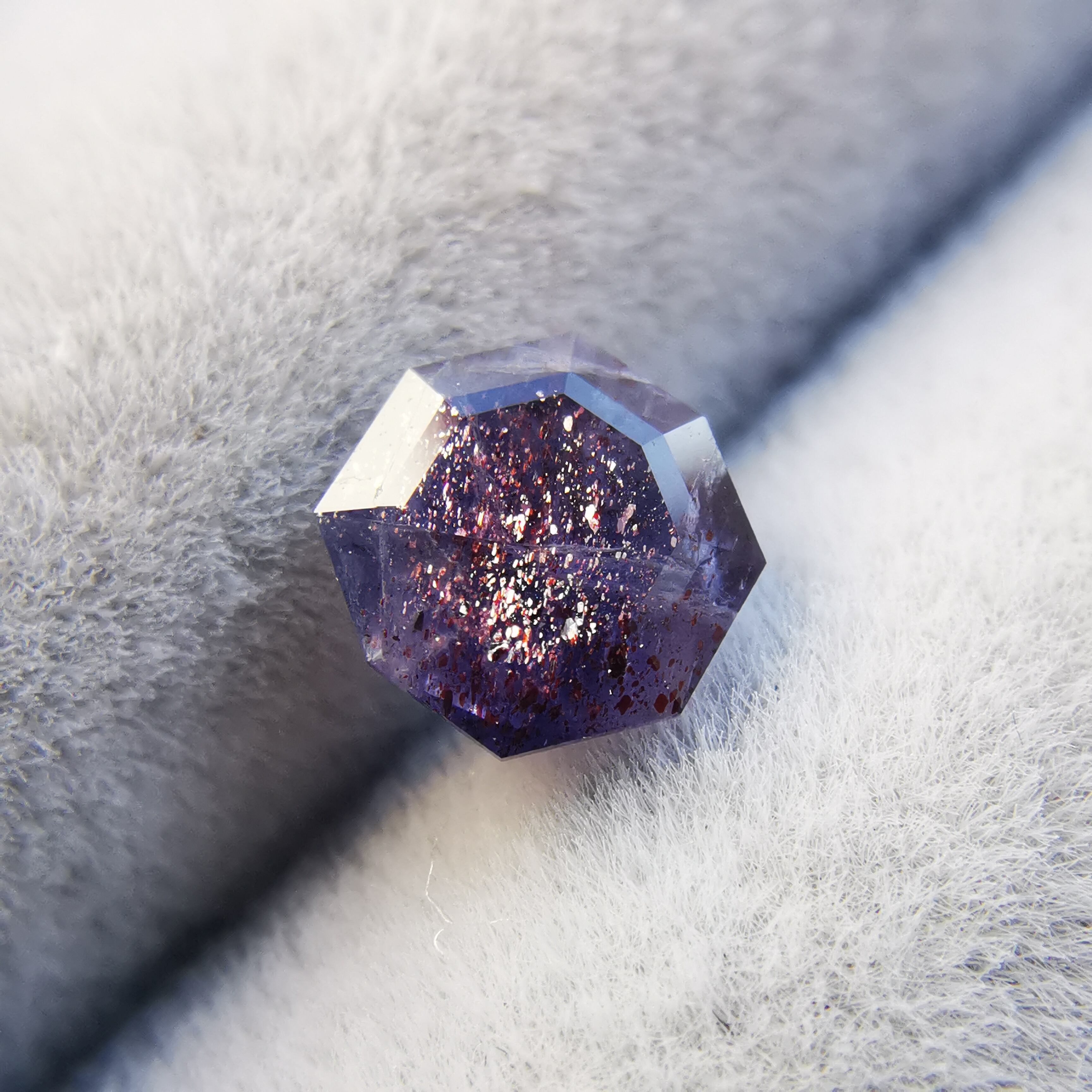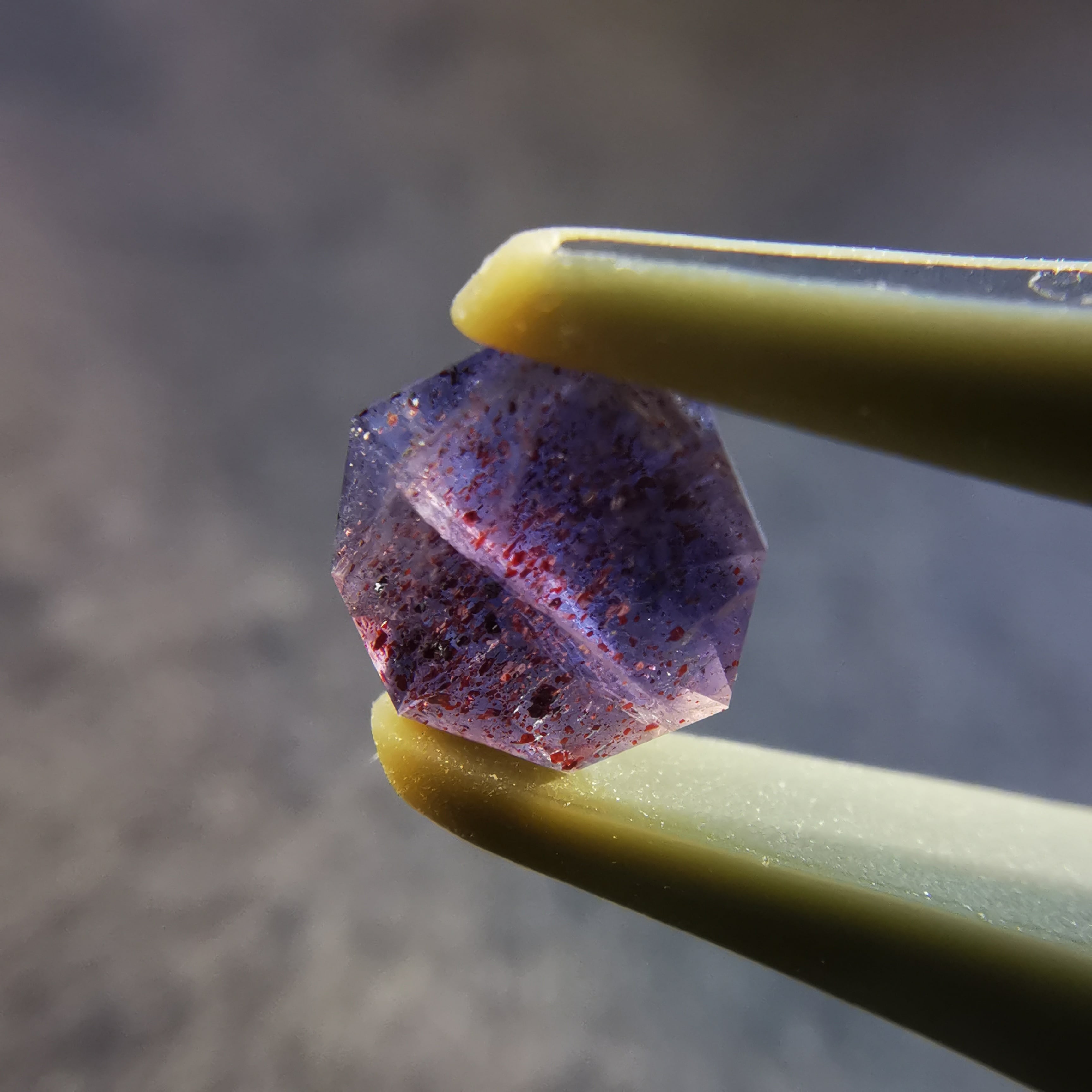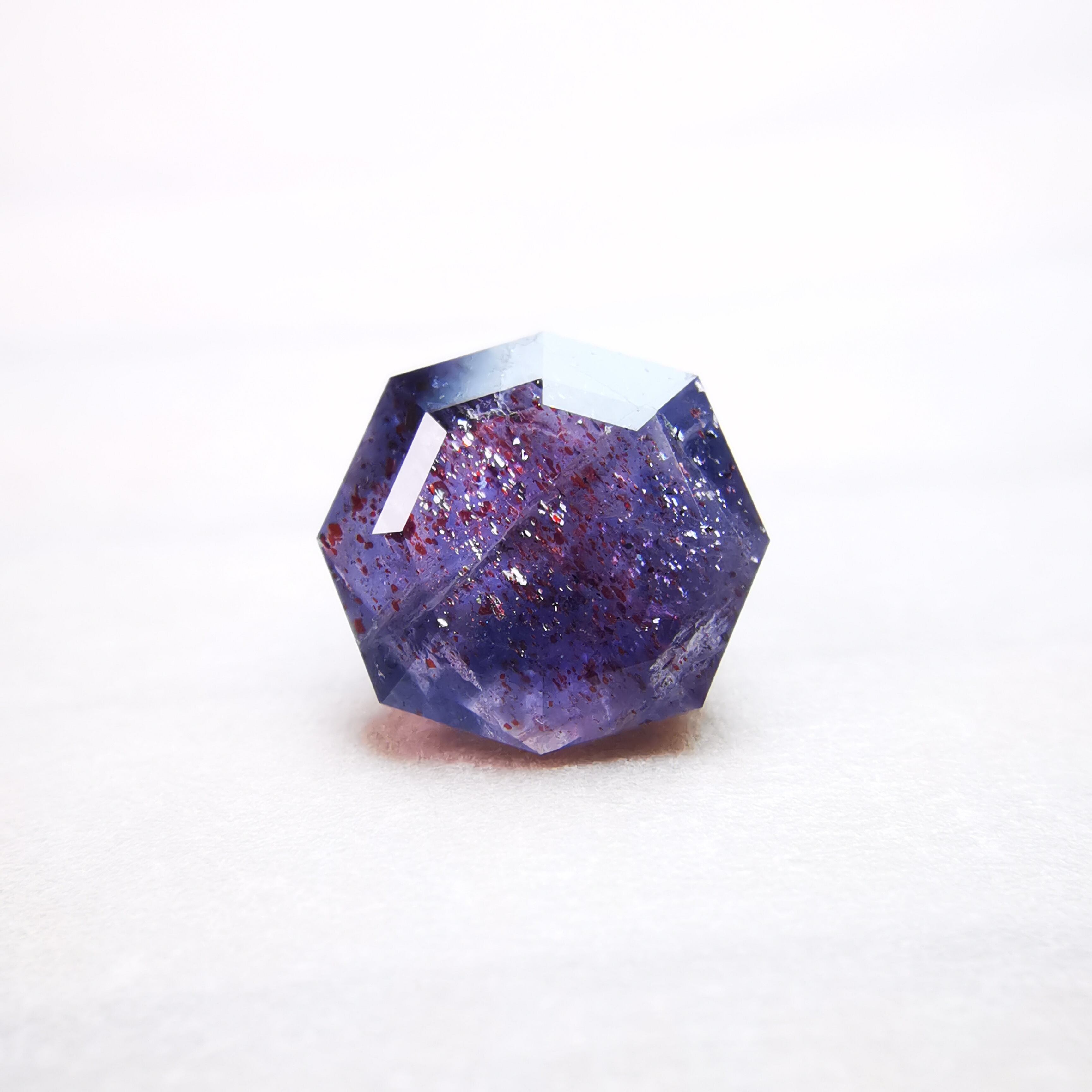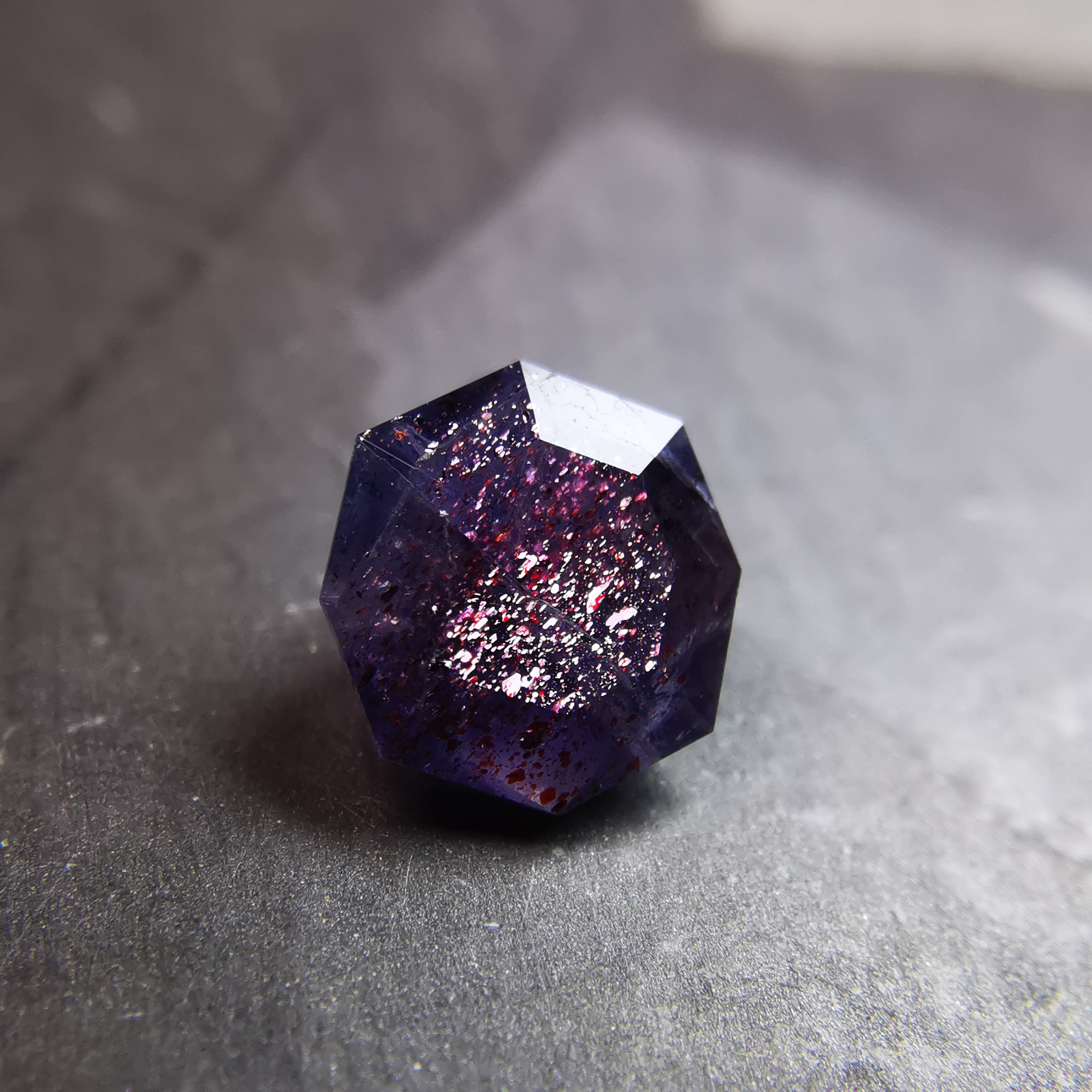 暗い紫みの灰色/トープ色の石に入った赤いインクルージョンが、光を受けてきらめくブラッドショットアイオライトです。