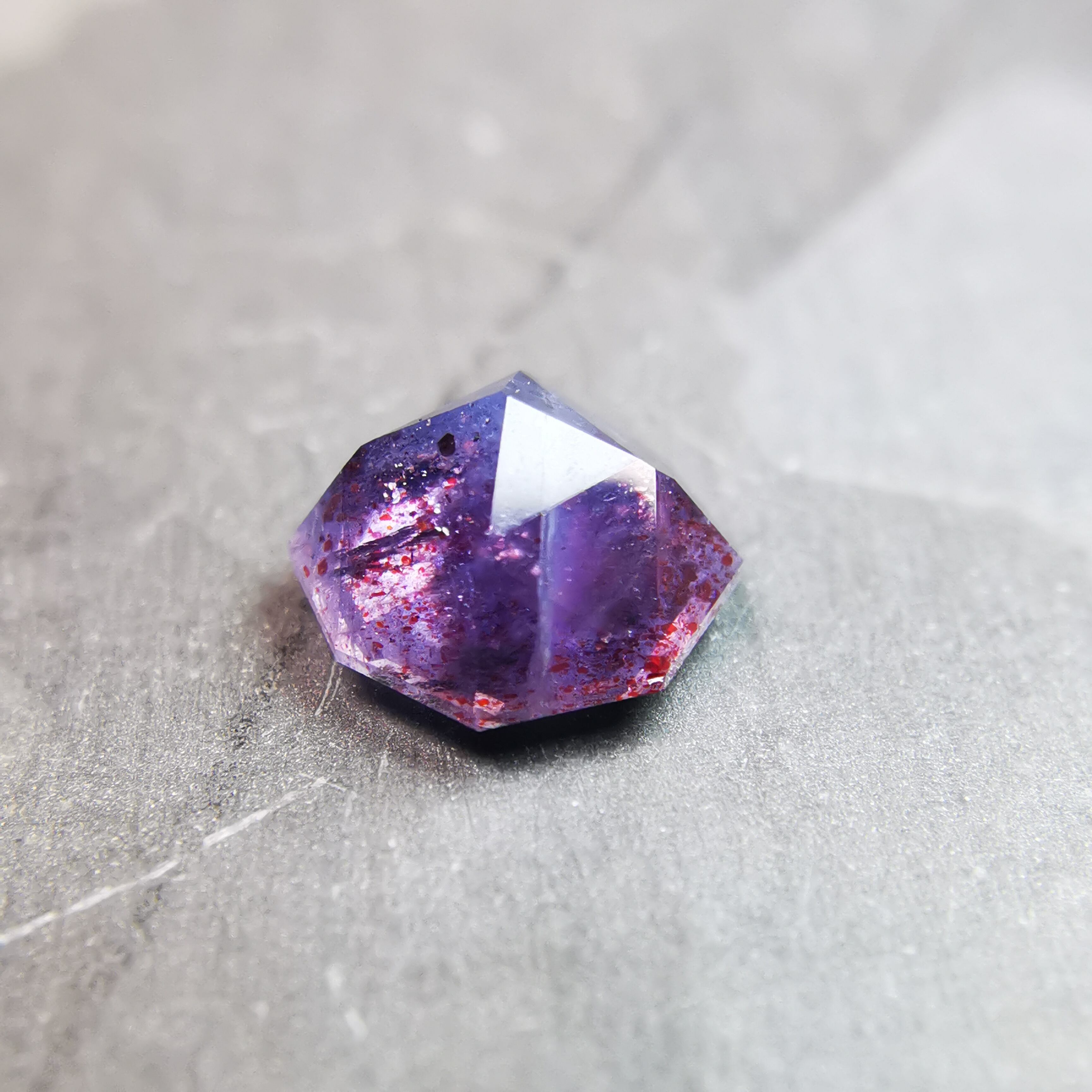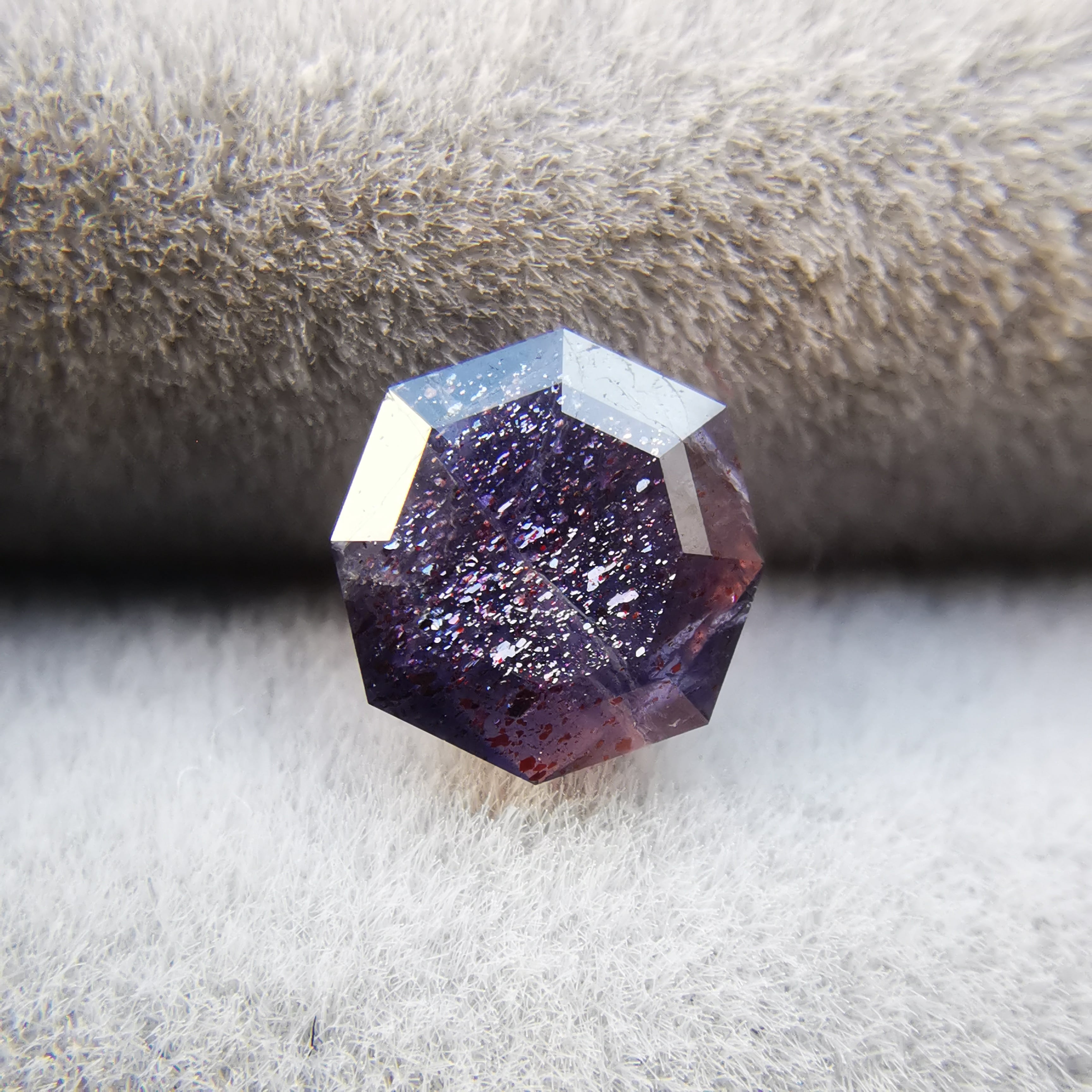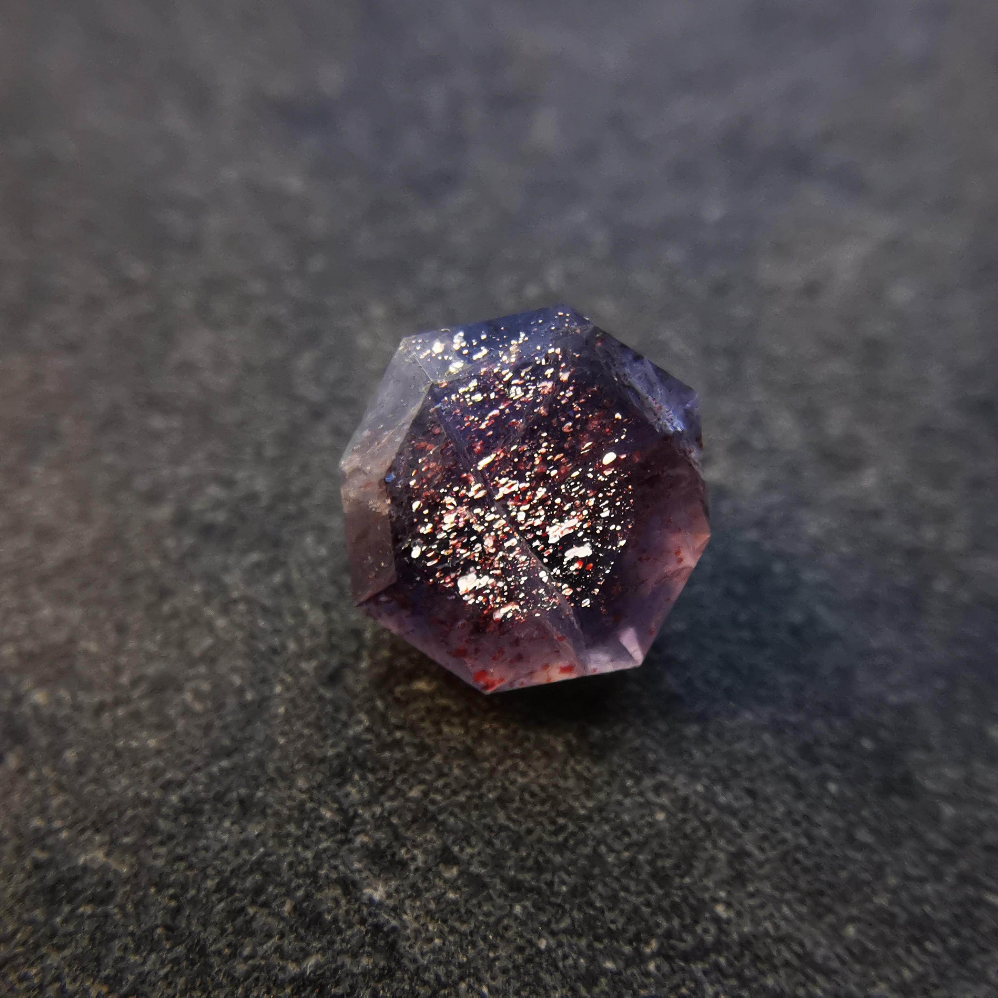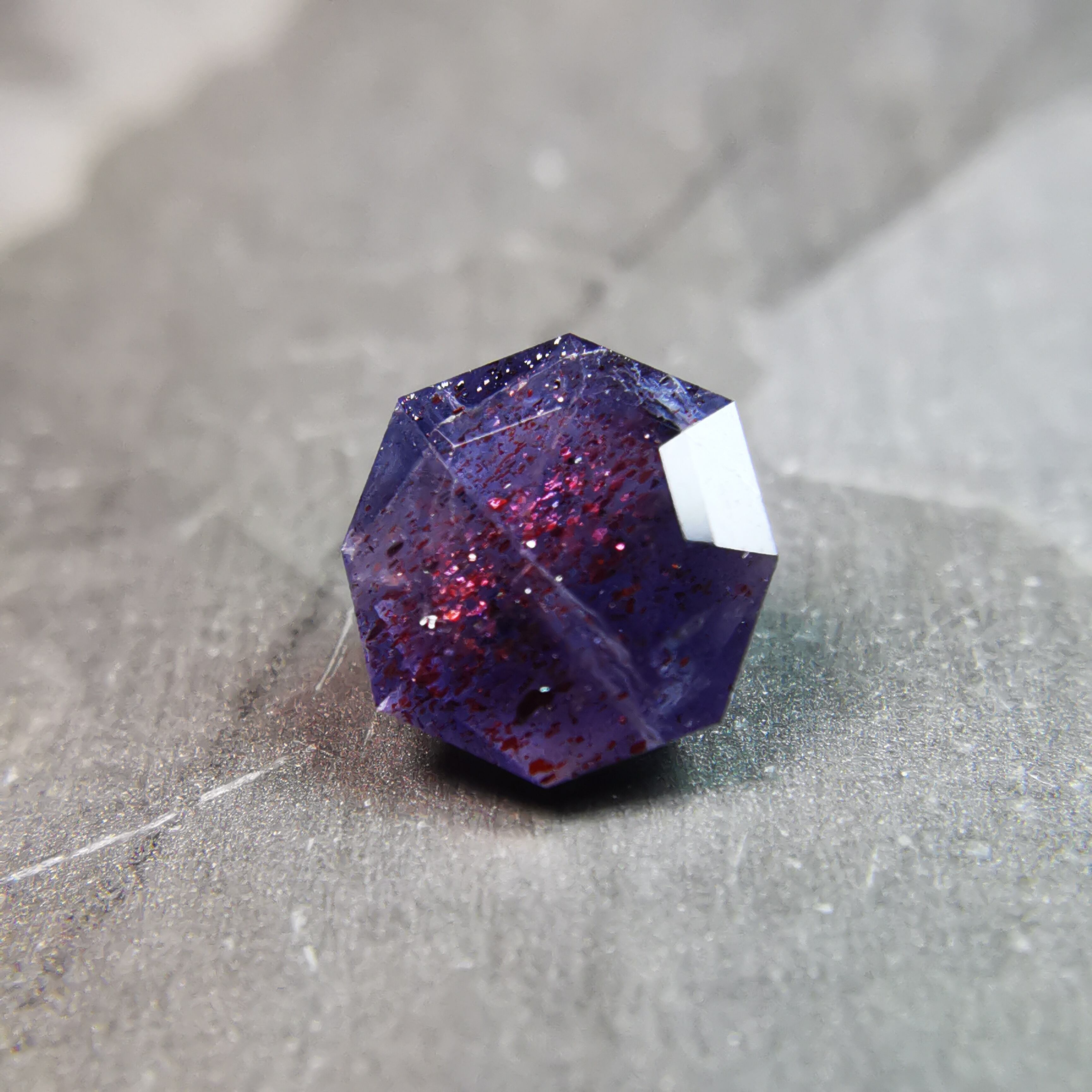 暗い紫みの灰色/トープ色の石に入った赤いインクルージョンが、光を受けてきらめくブラッドショットアイオライトです。
