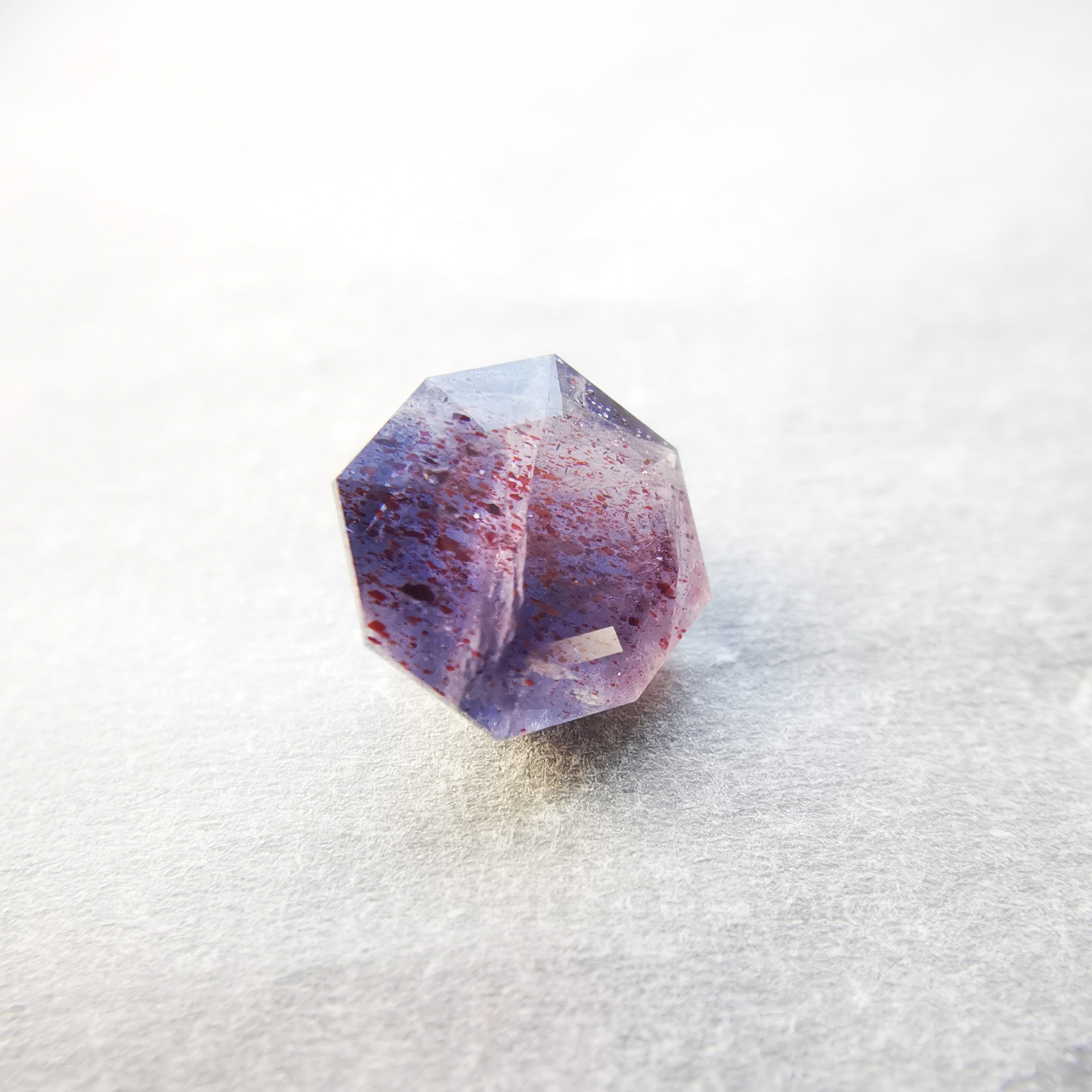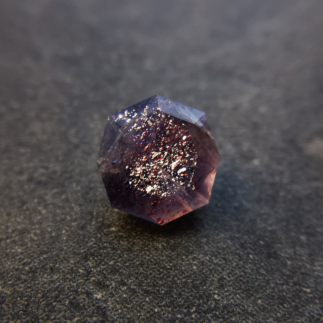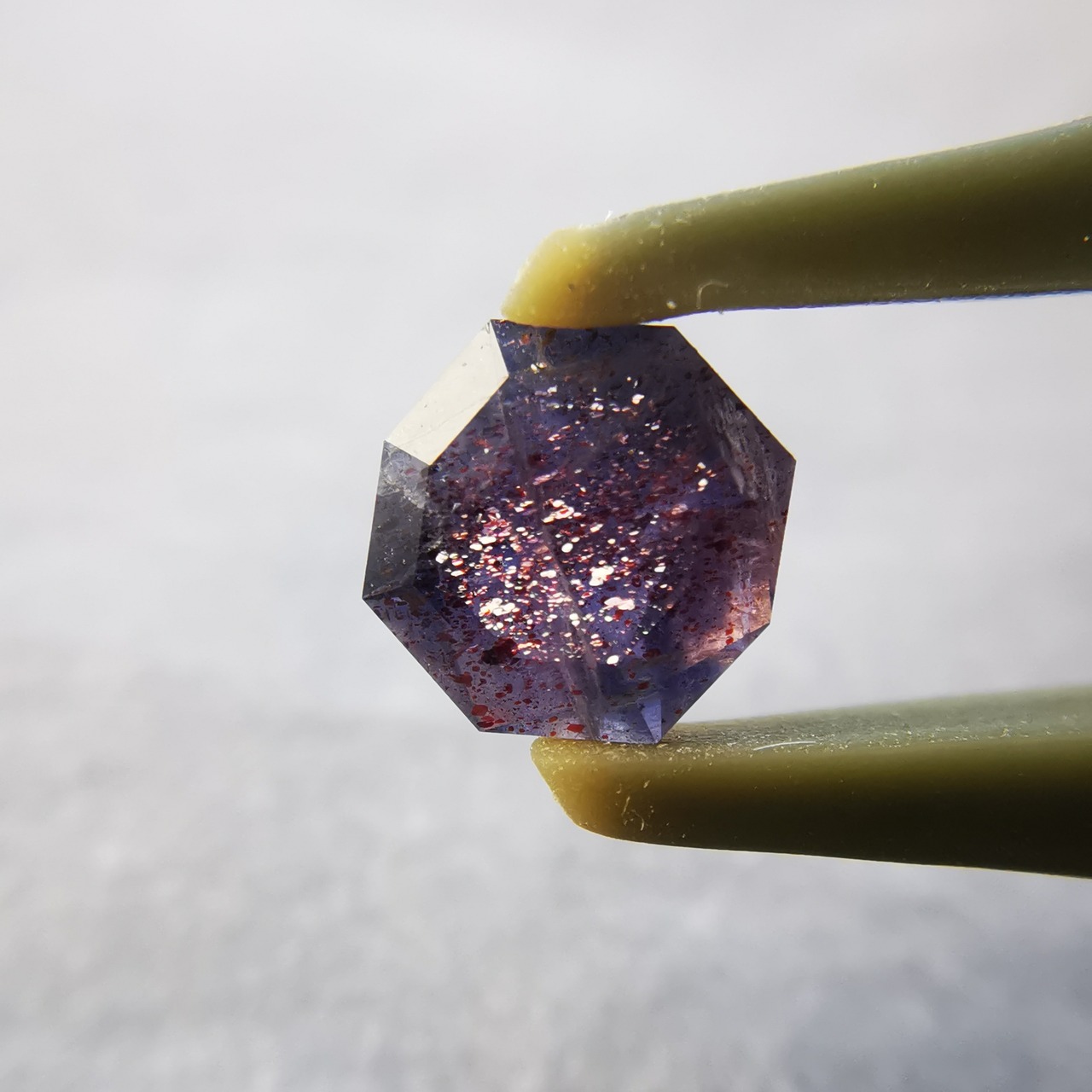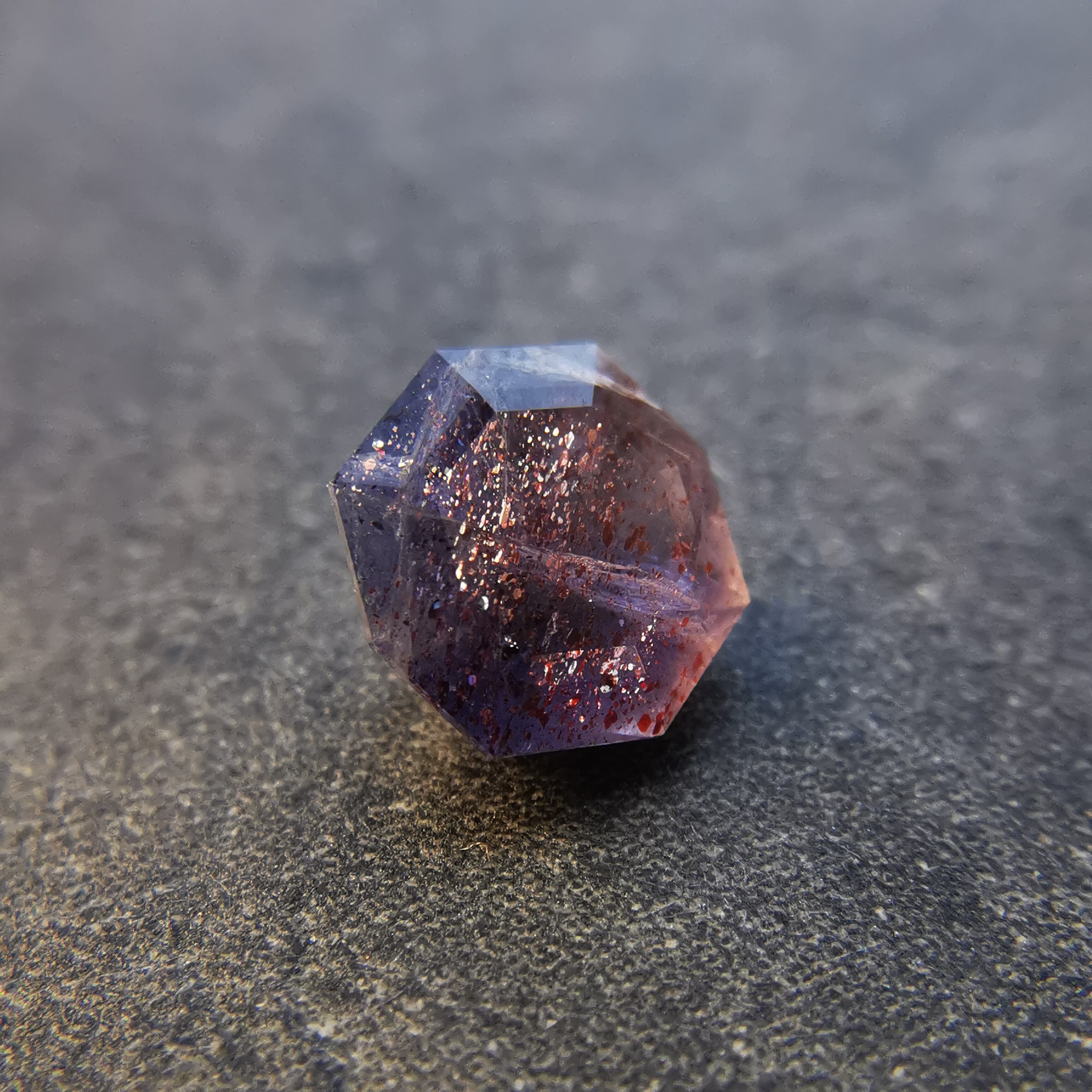 暗い紫みの灰色/トープ色の石に入った赤いインクルージョンが、光を受けてきらめくブラッドショットアイオライトです。