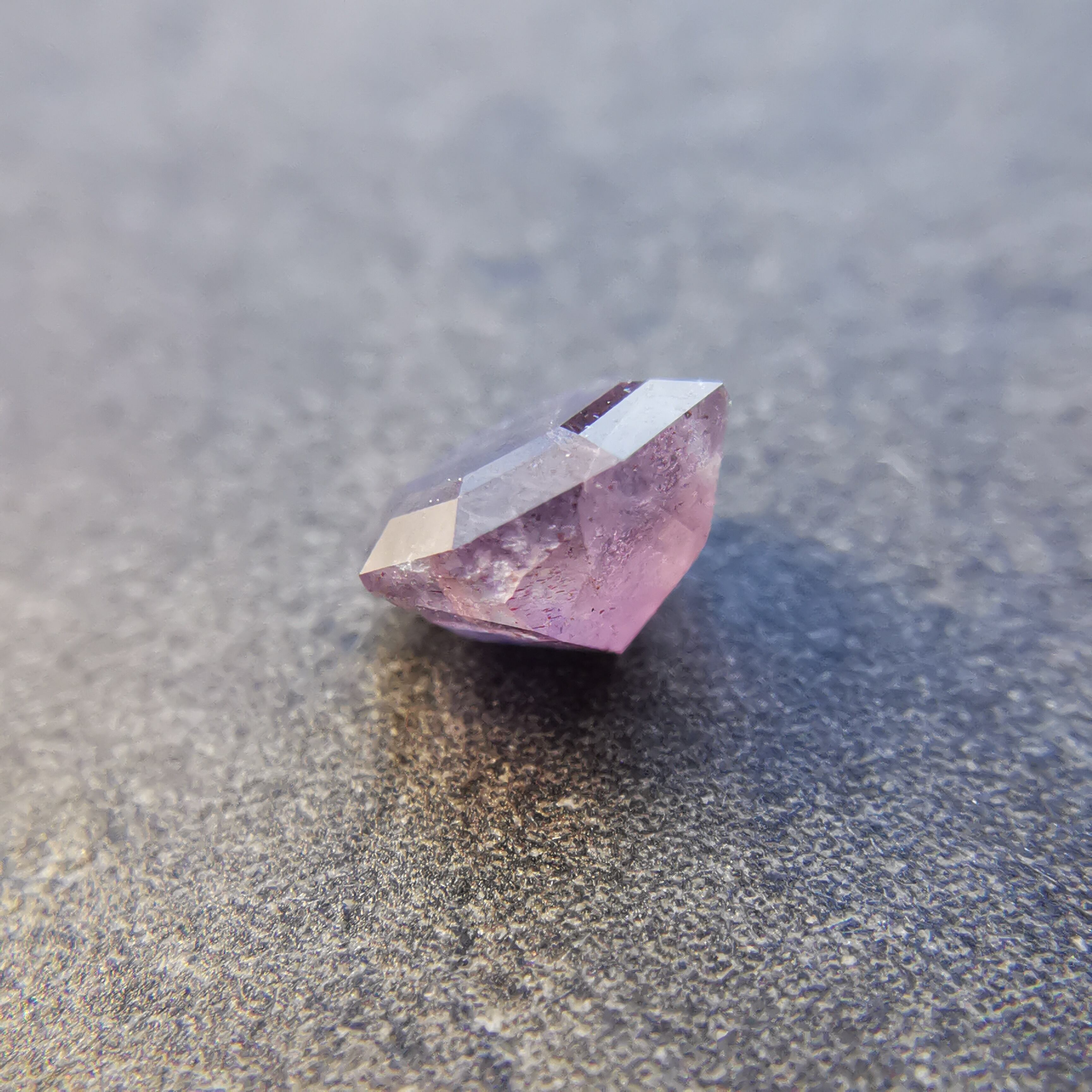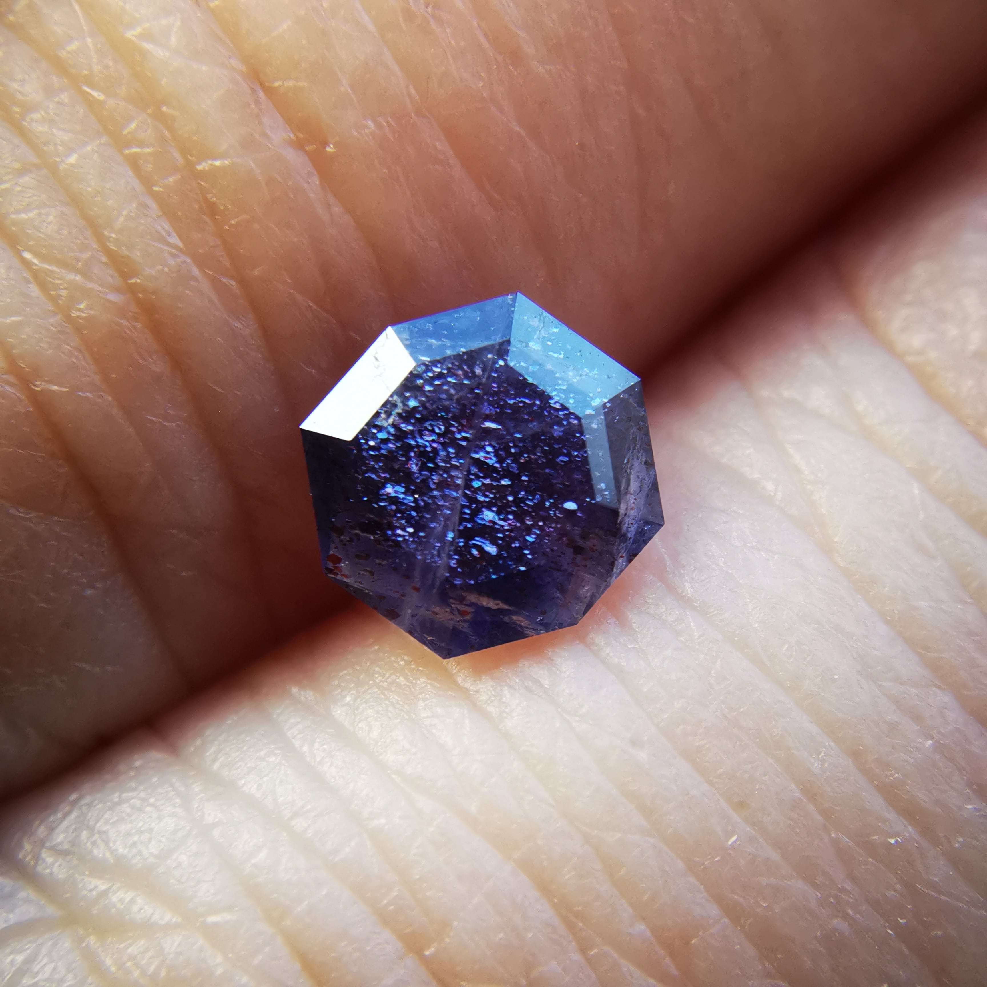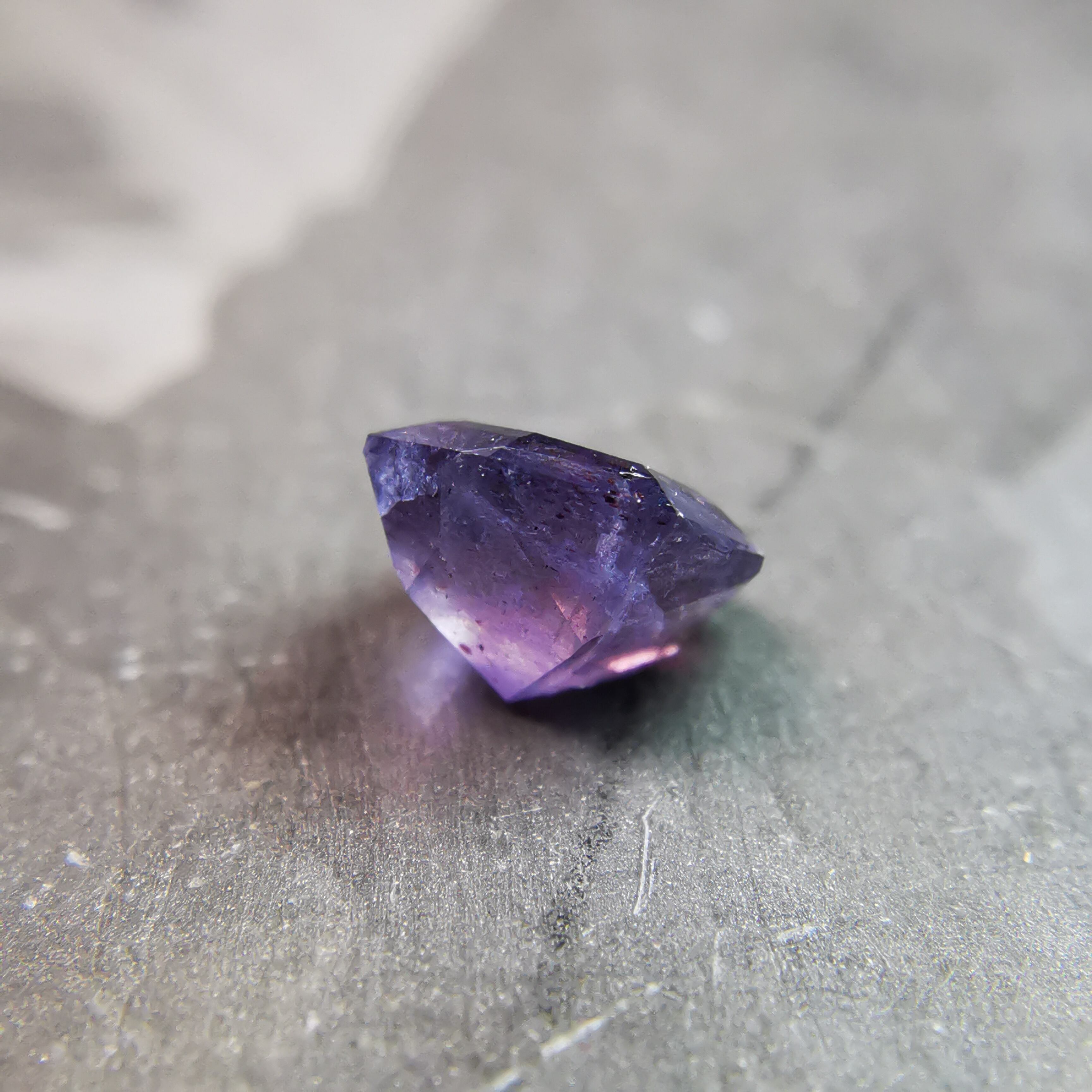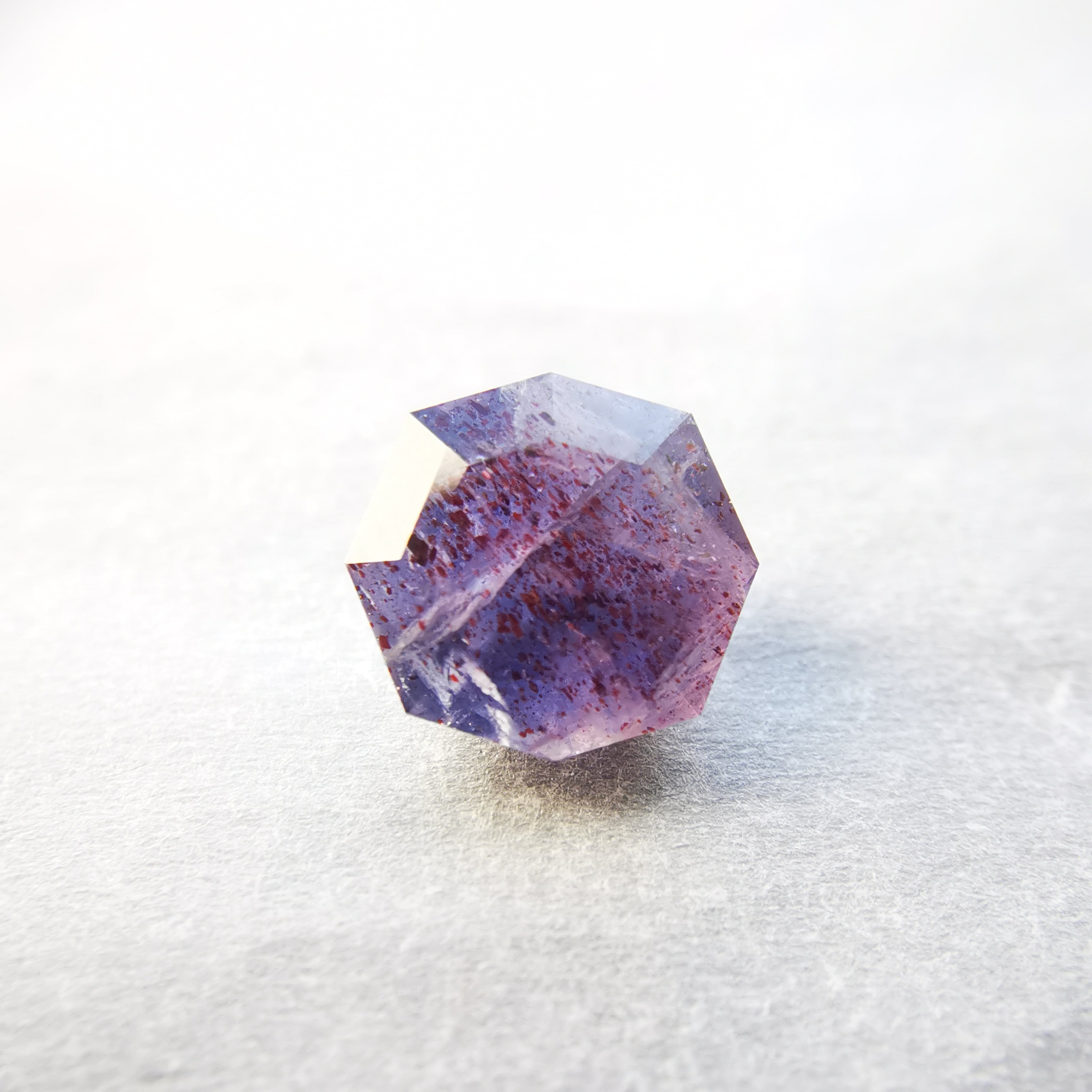 暗い紫みの灰色/トープ色の石に入った赤いインクルージョンが、光を受けてきらめくブラッドショットアイオライトです。