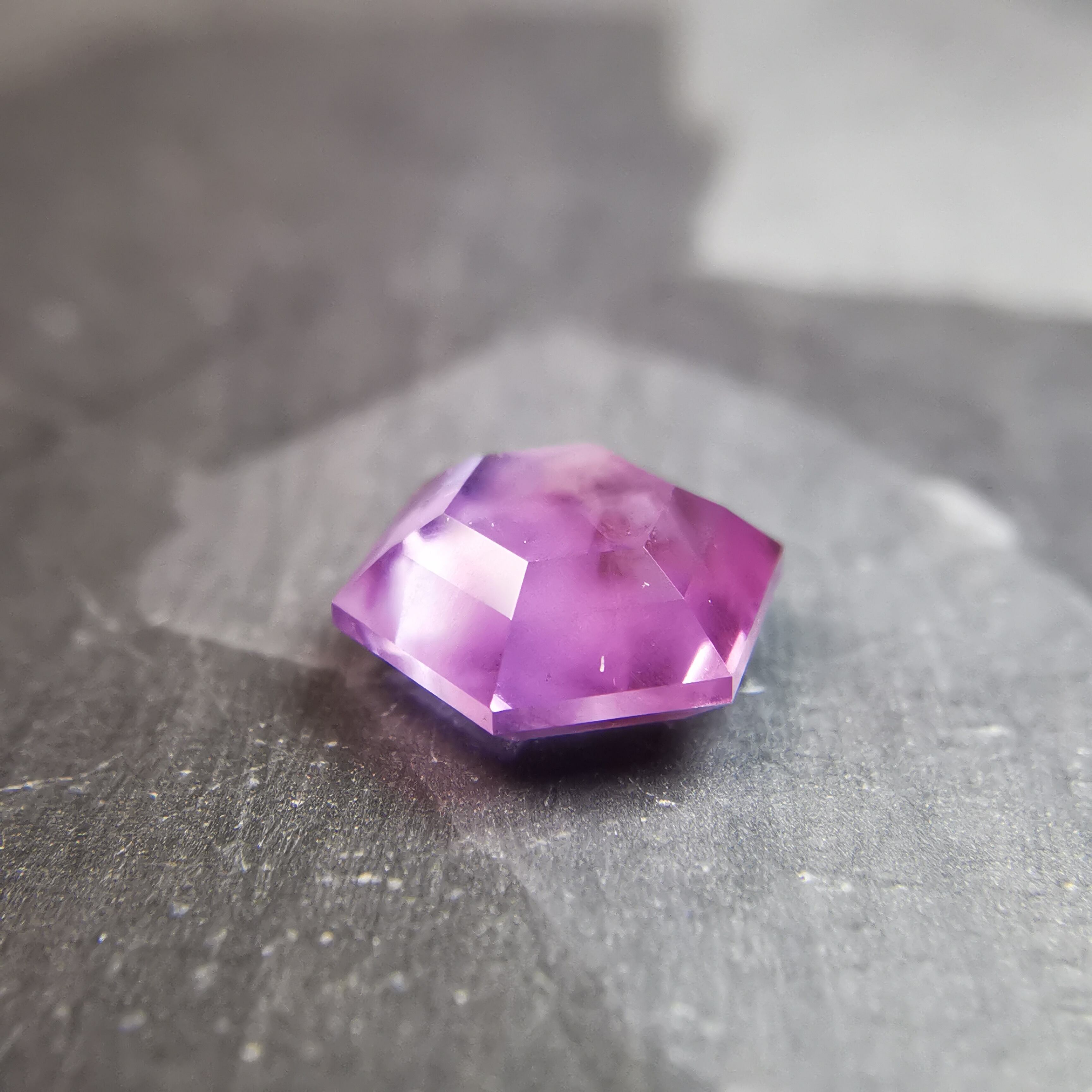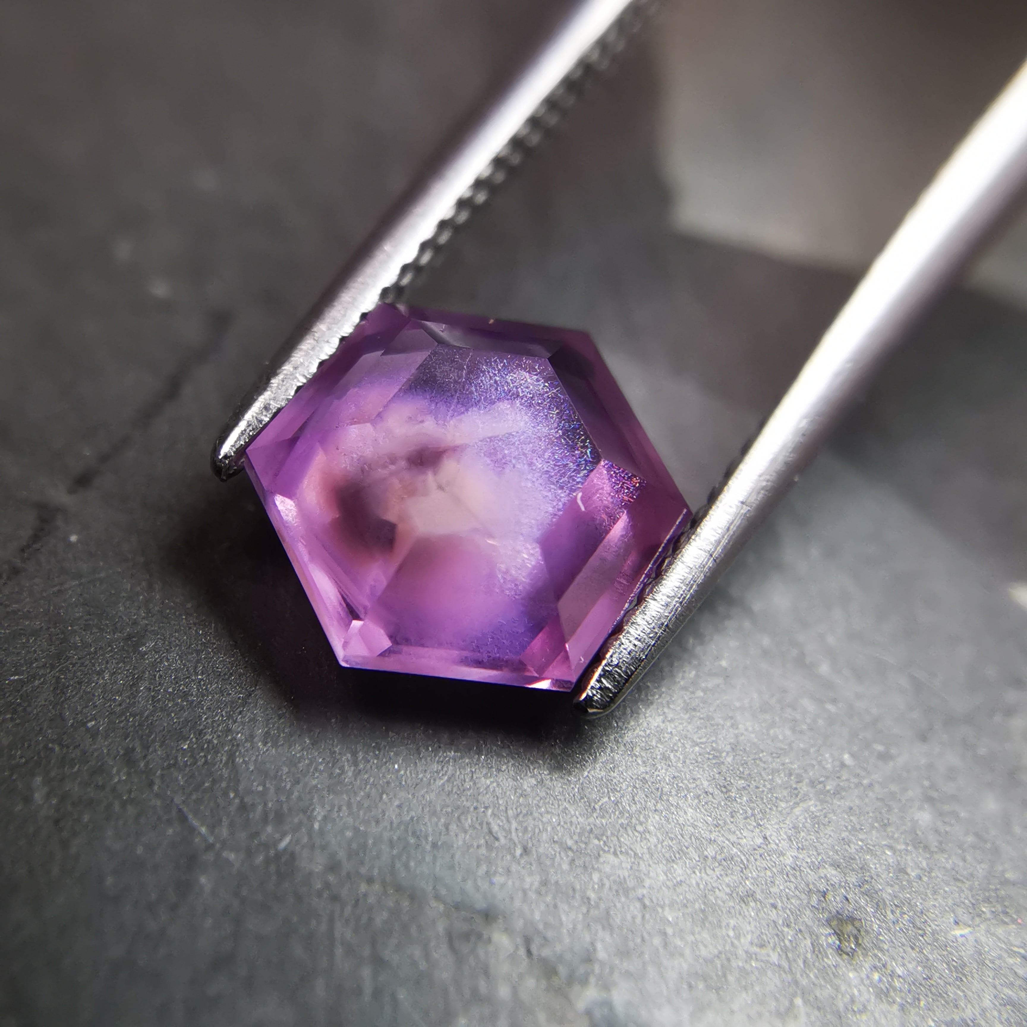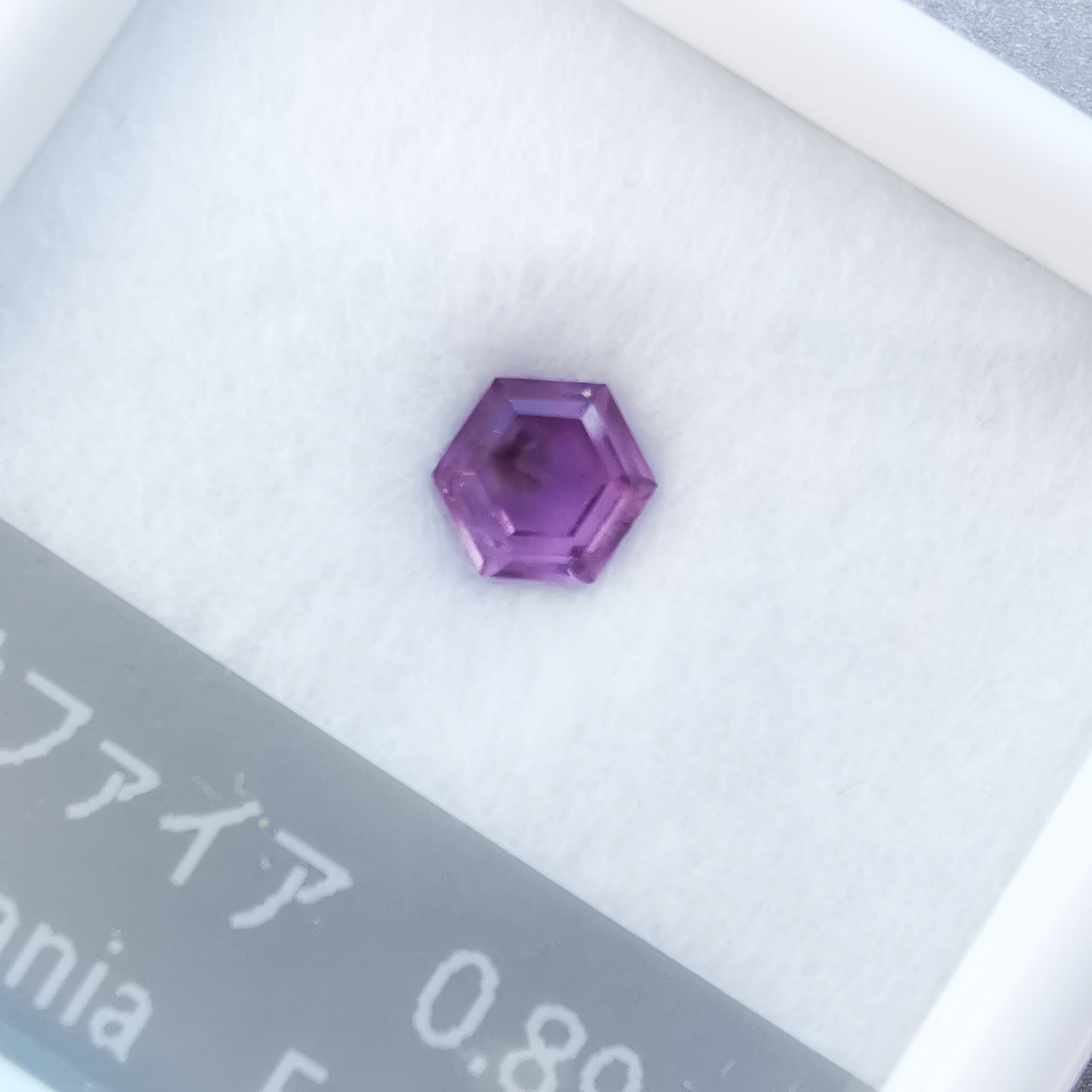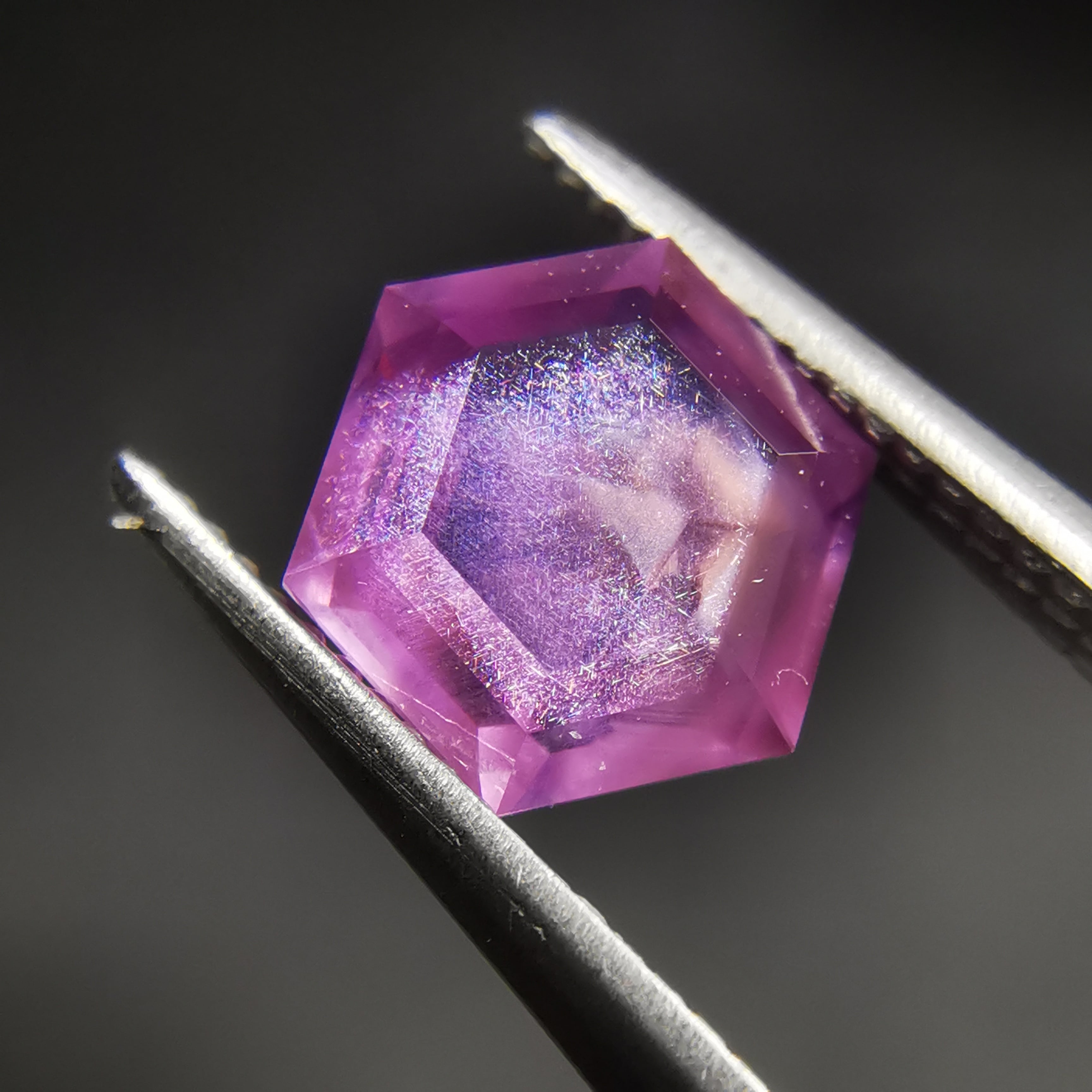 落ち着いた明るい赤紫/フクシアパープルのサファイアの中に、シルクインクルージョンの巣のような濃厚な内包物が入っています。