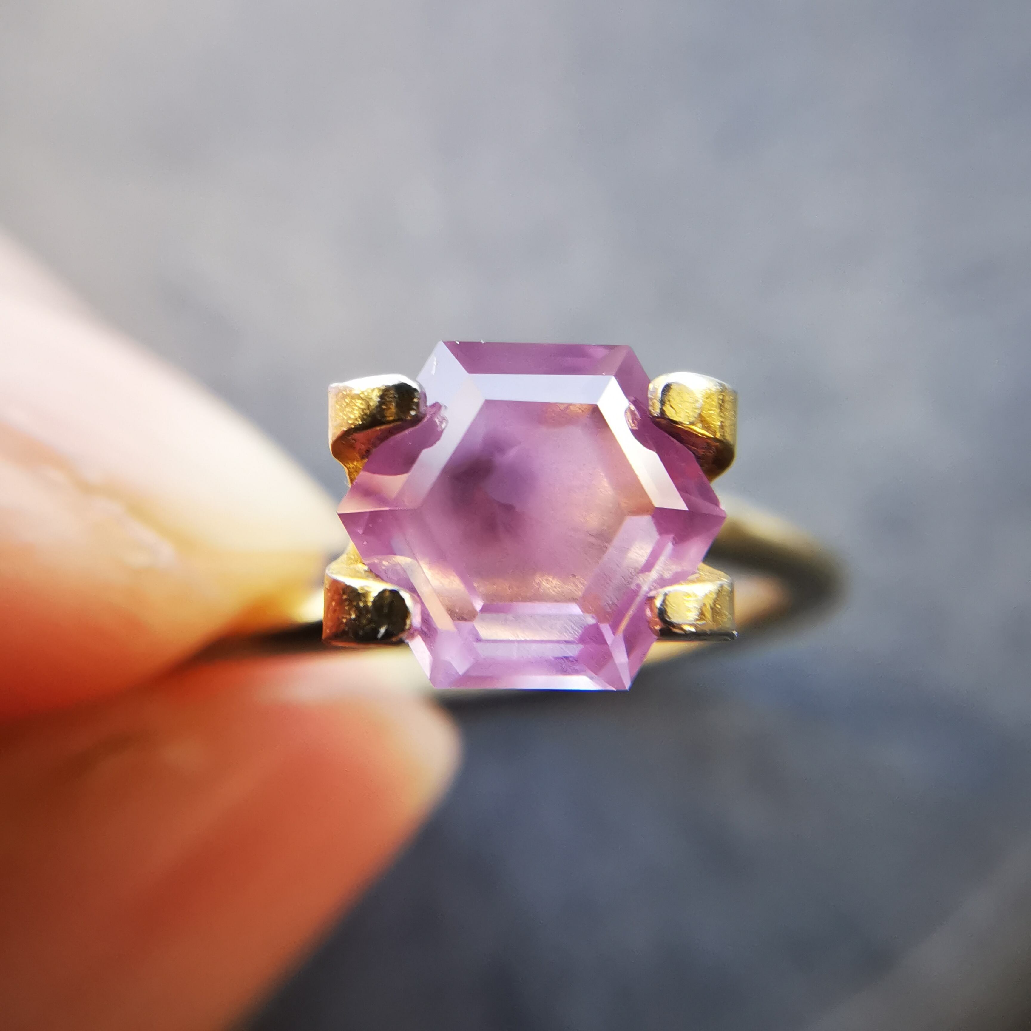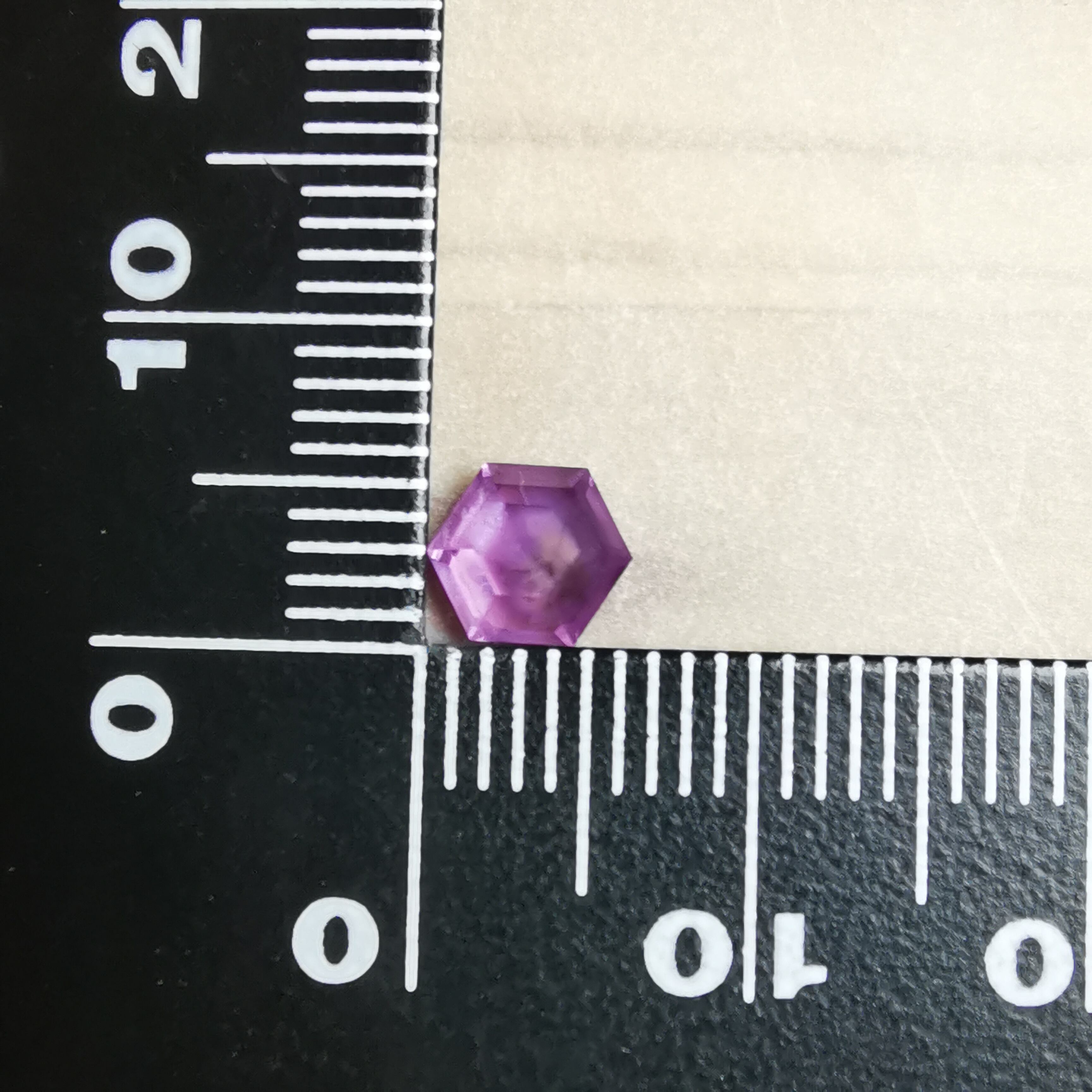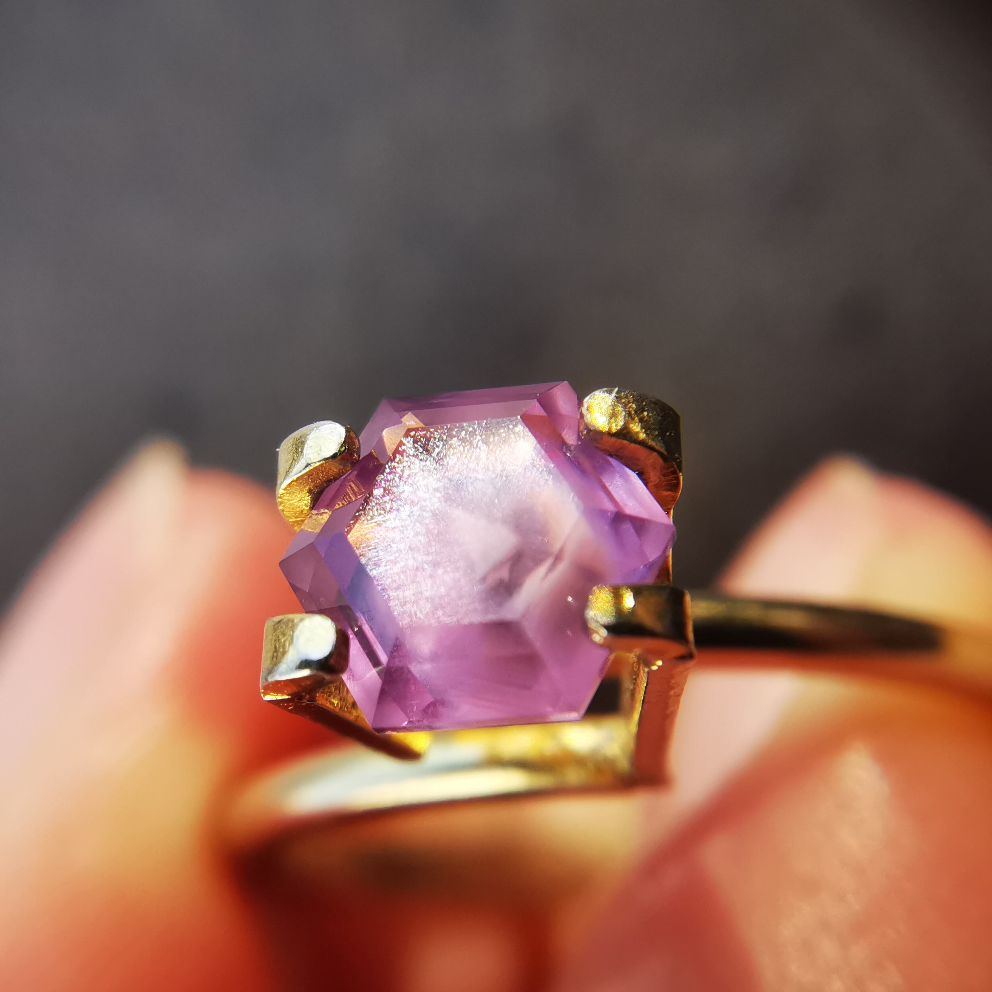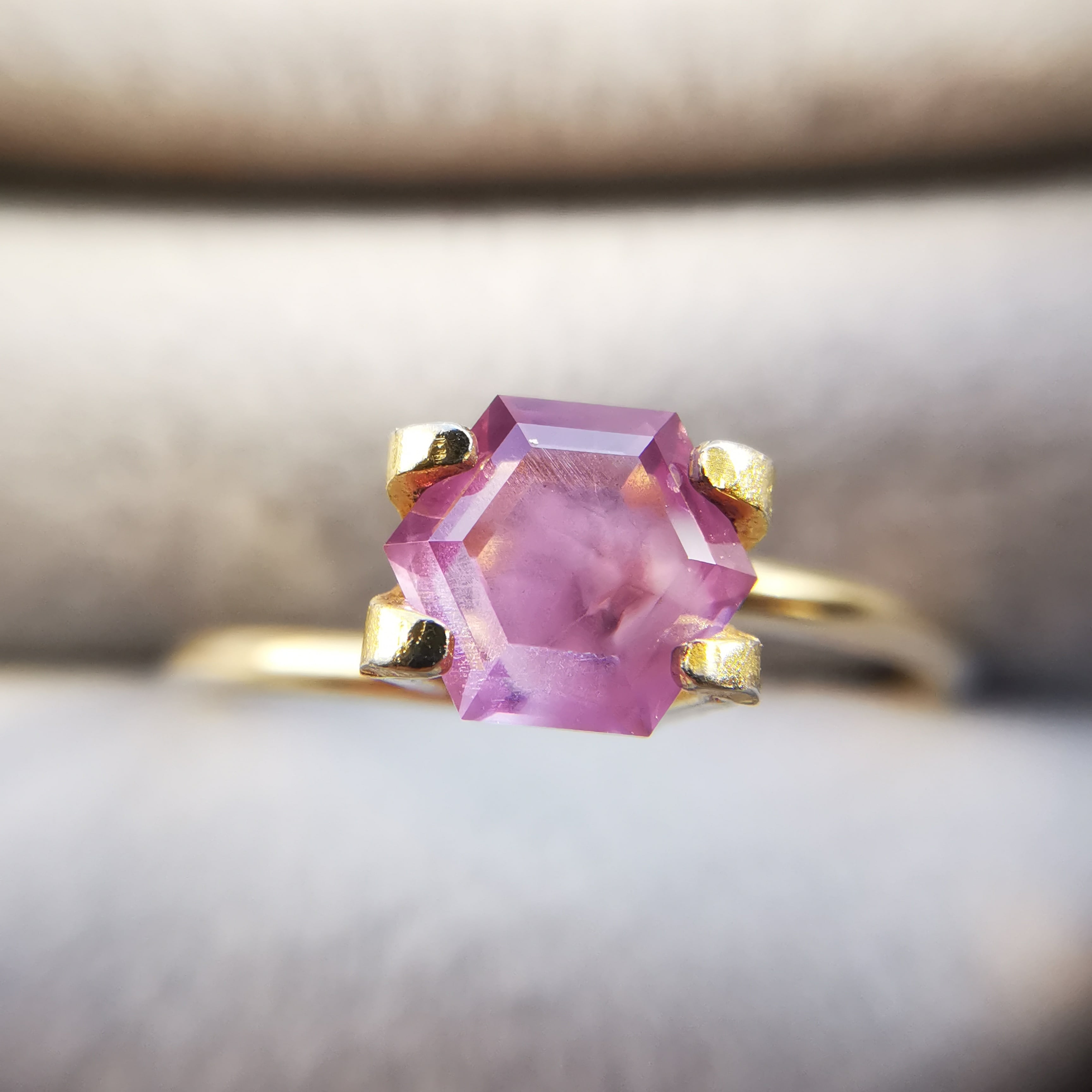 落ち着いた明るい赤紫/フクシアパープルのサファイアの中に、シルクインクルージョンの巣のような濃厚な内包物が入っています。