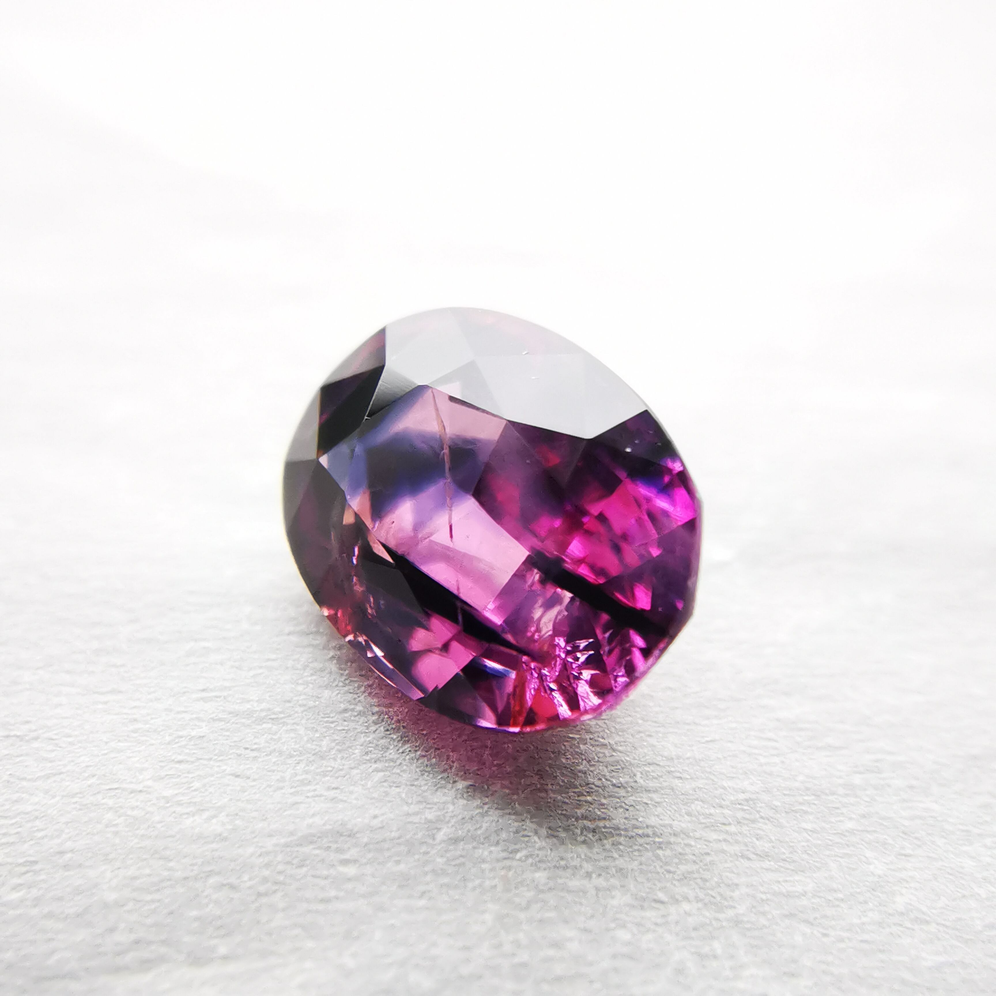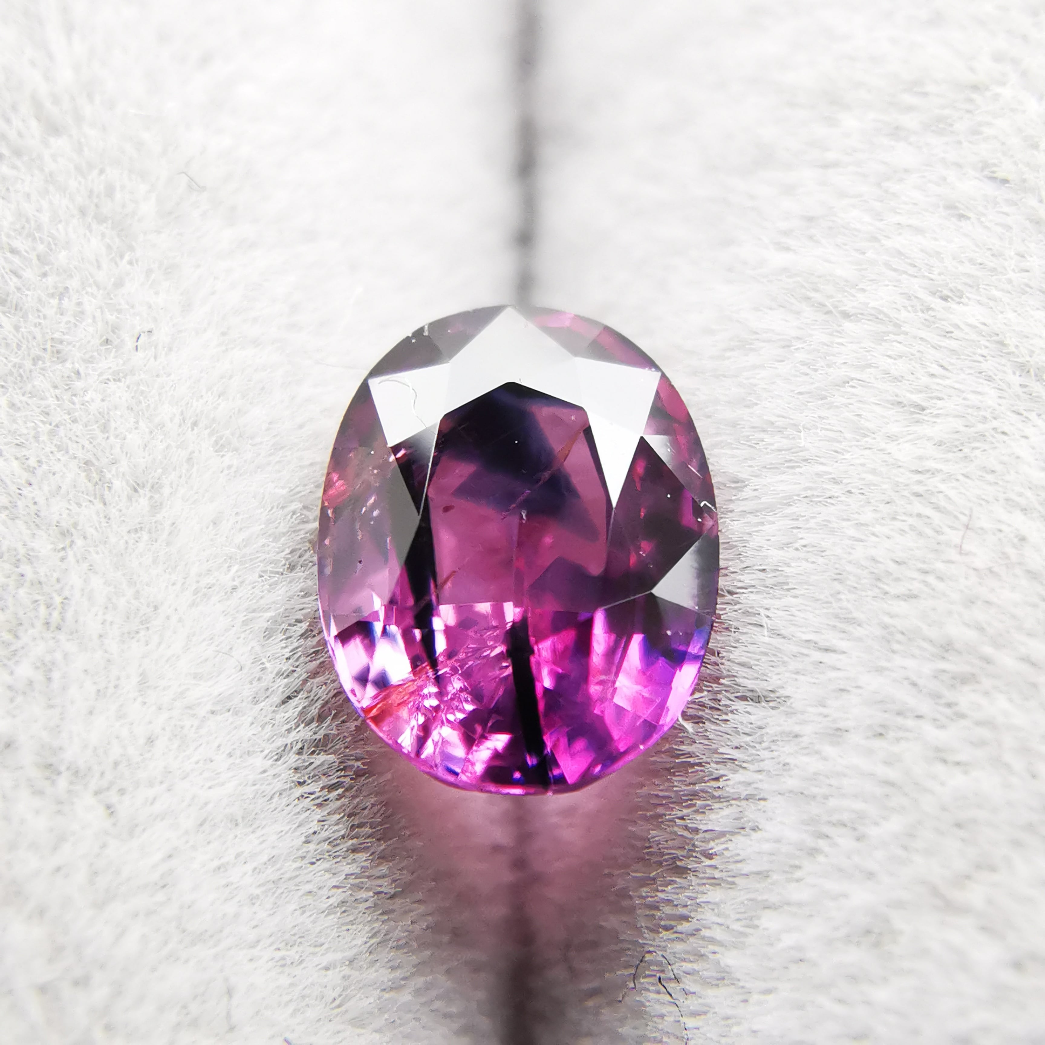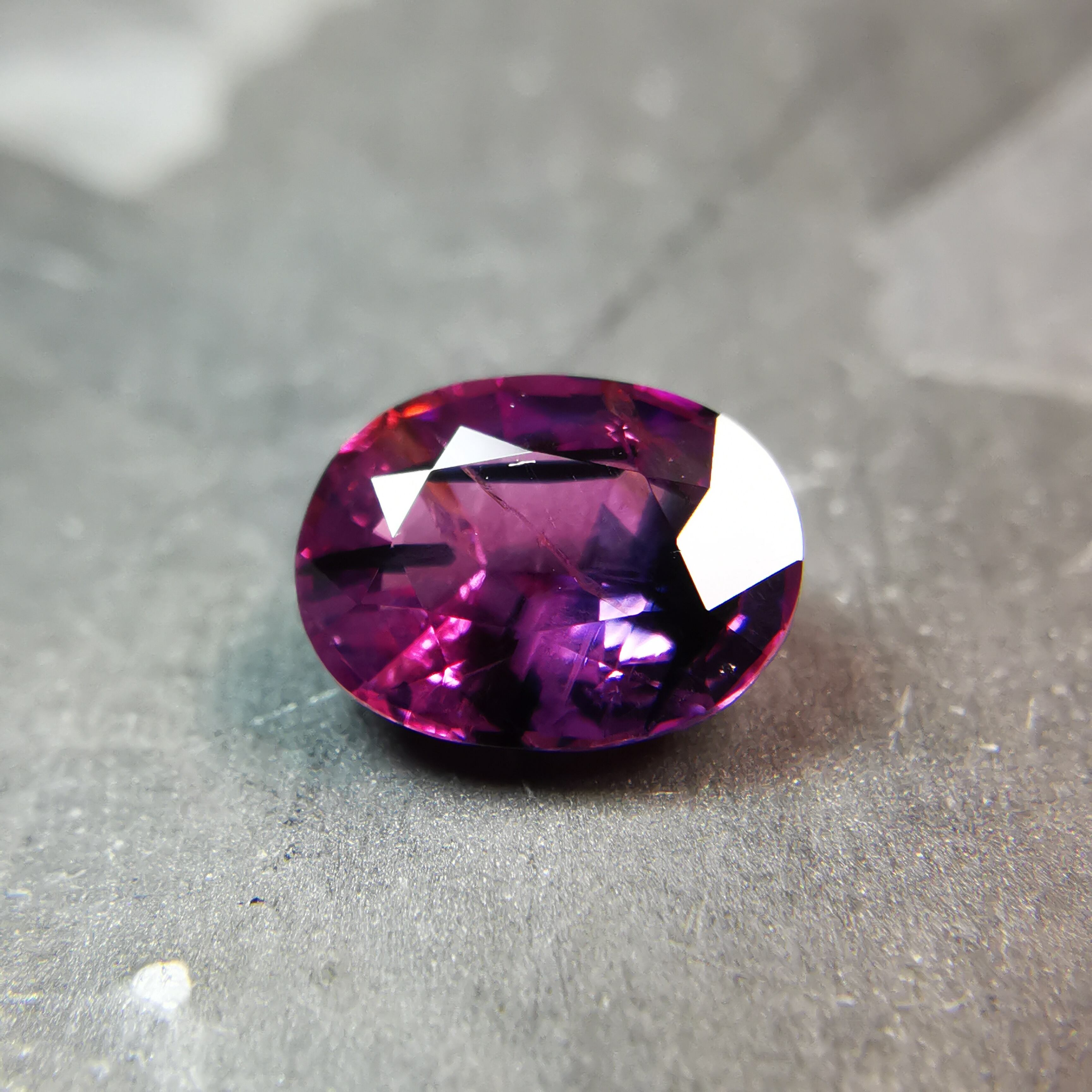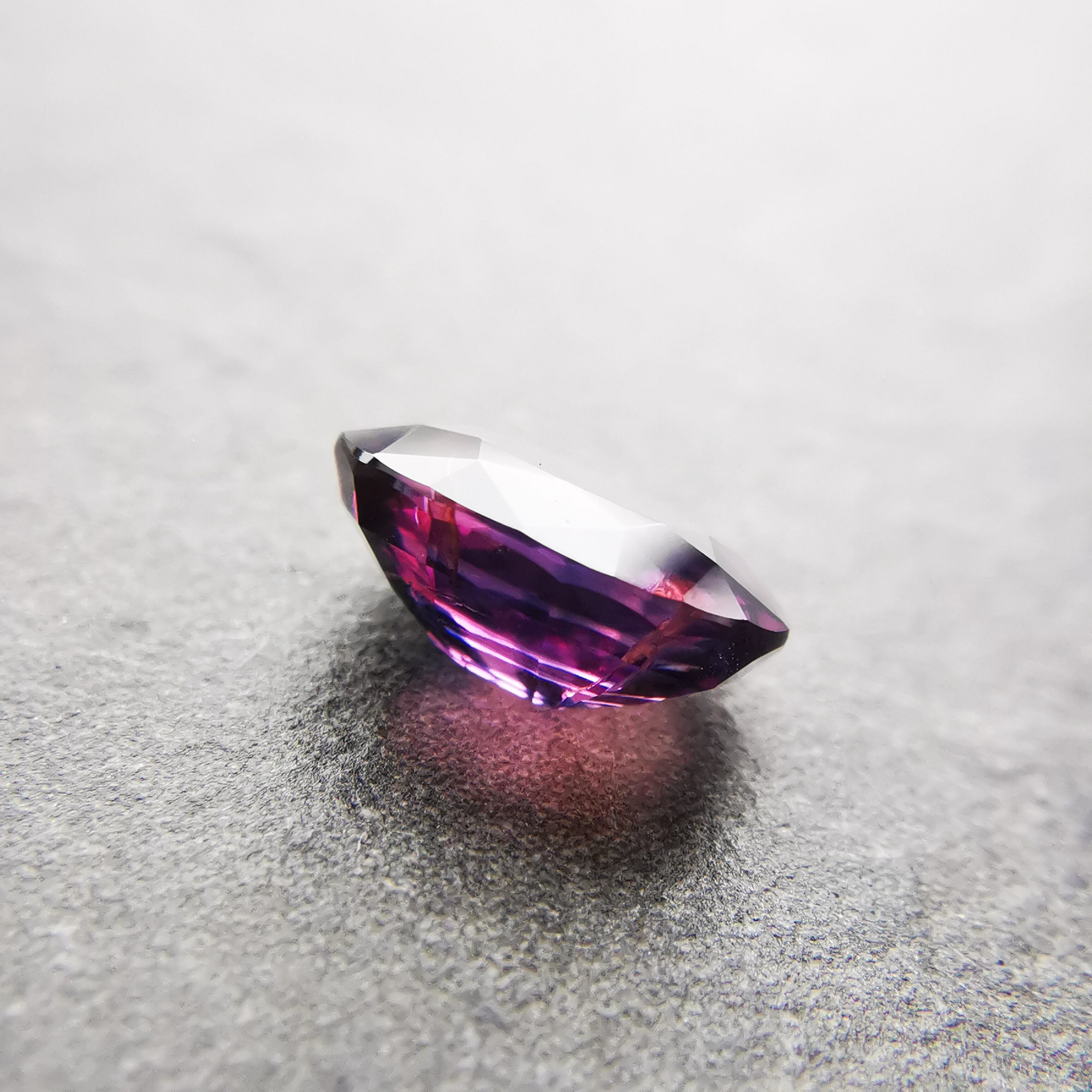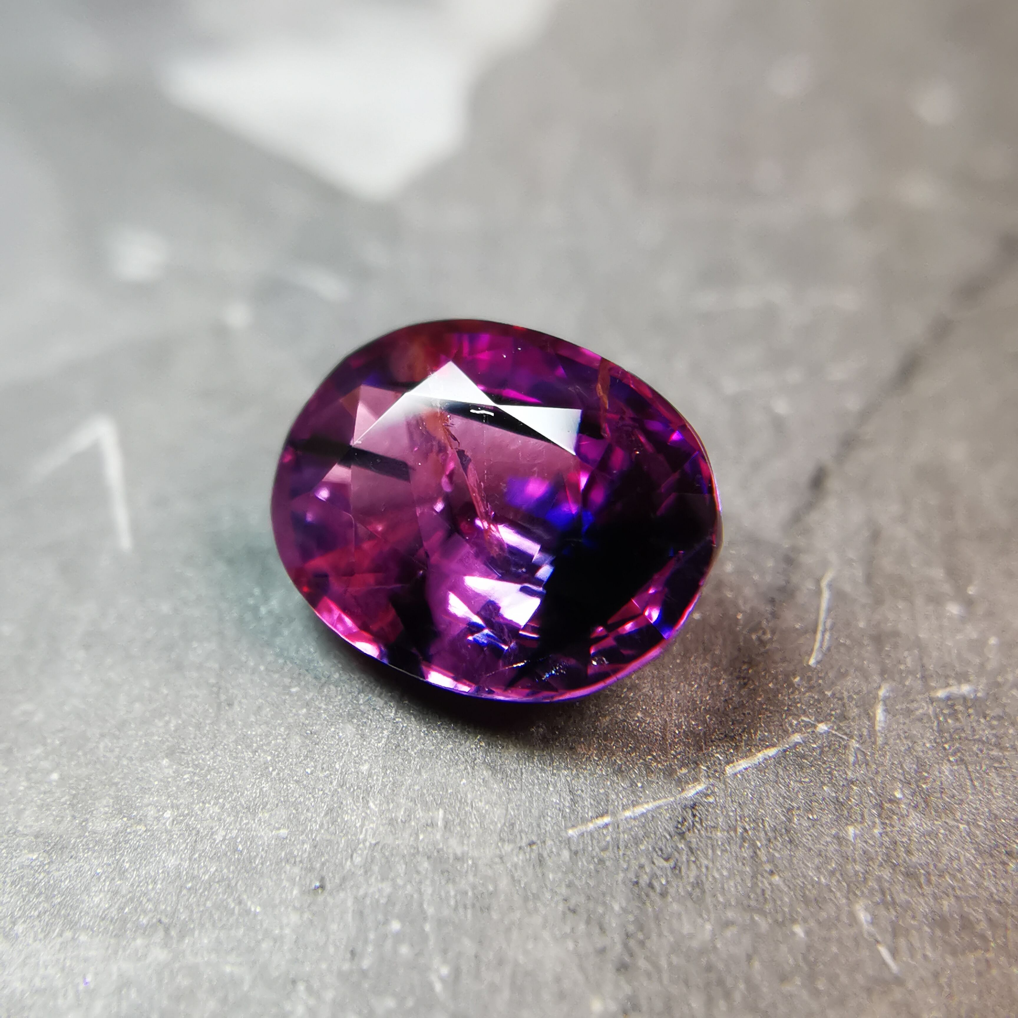 鮮やかな赤紫/クリムソン色に、帯状の紺色がいくつも走るバイカラーサファイアです。