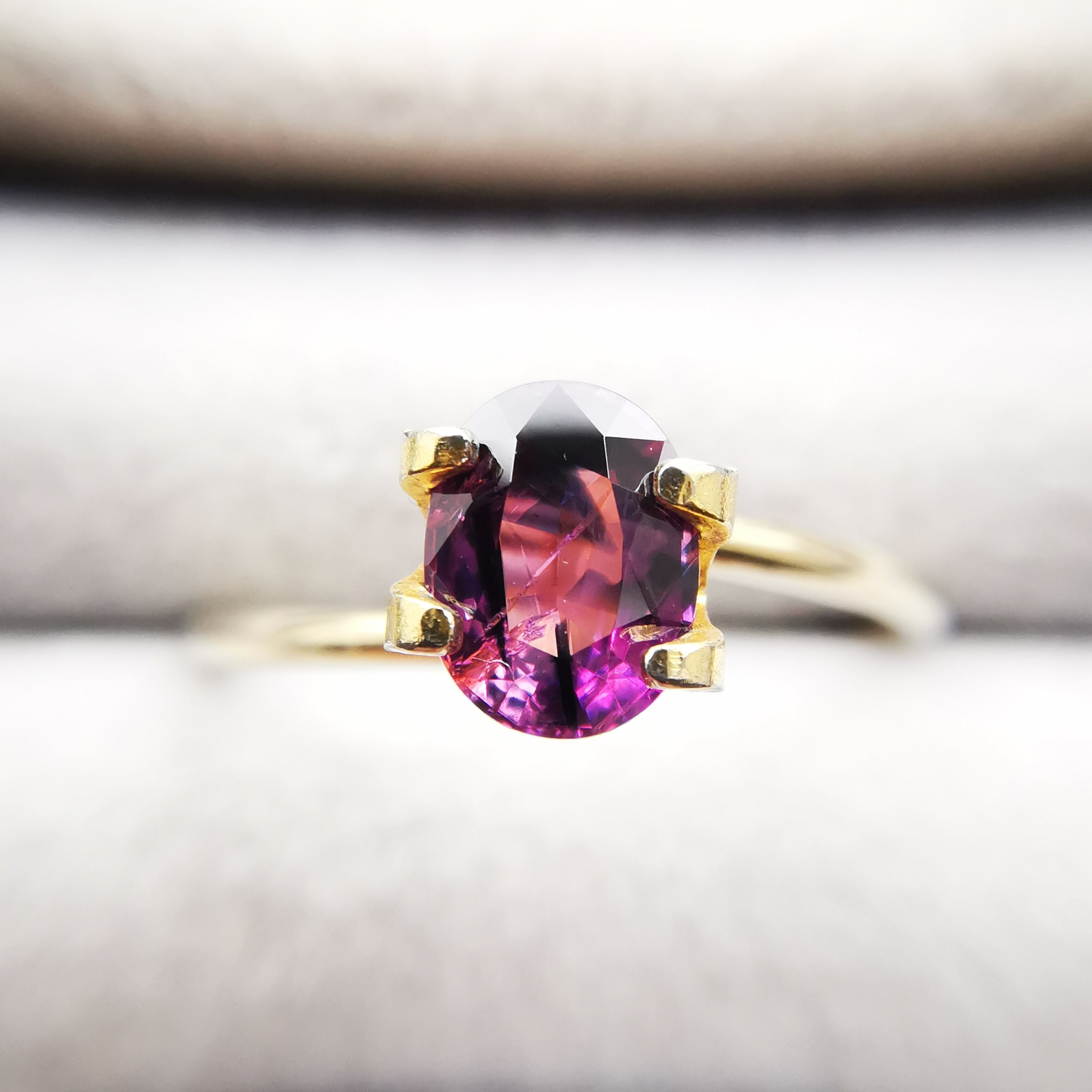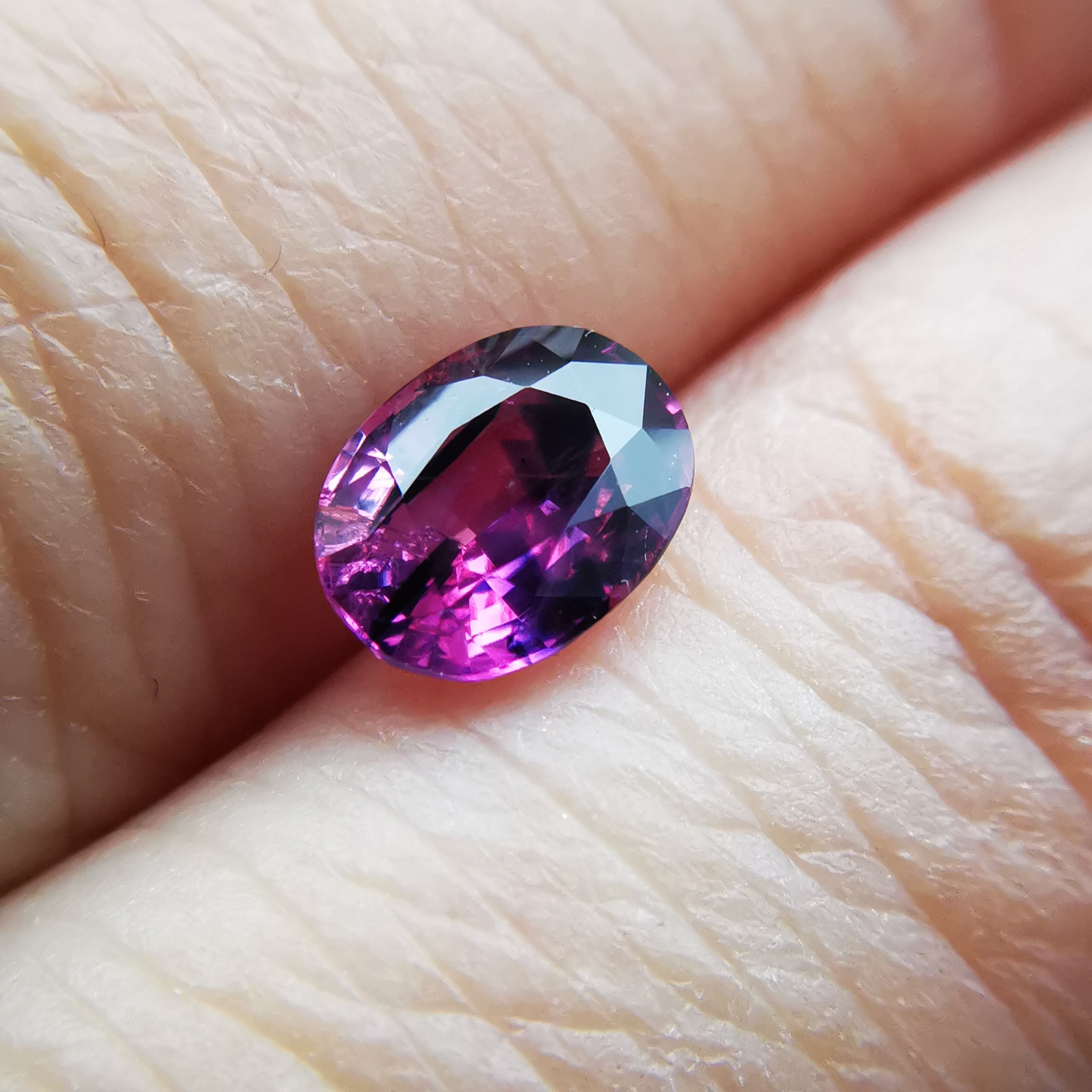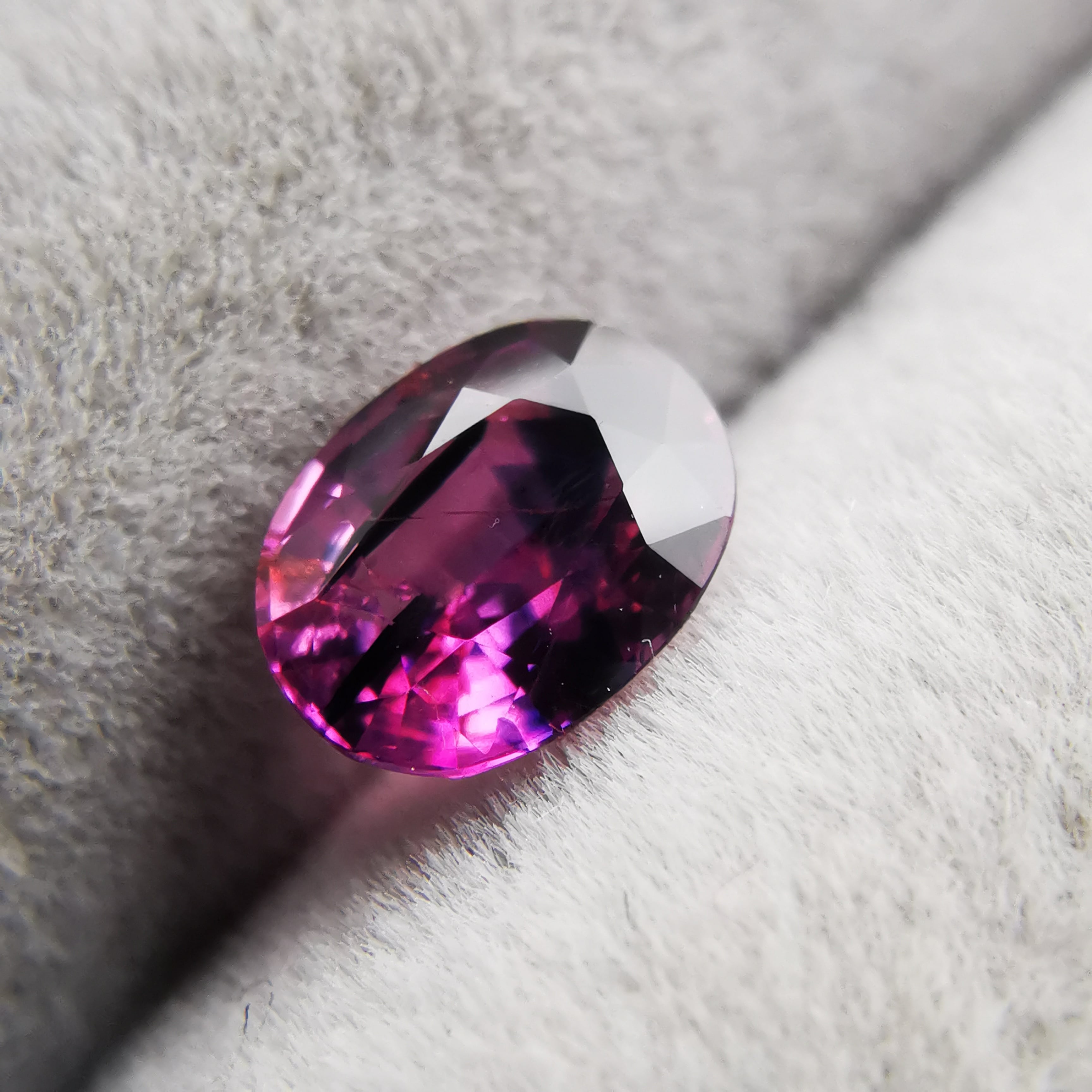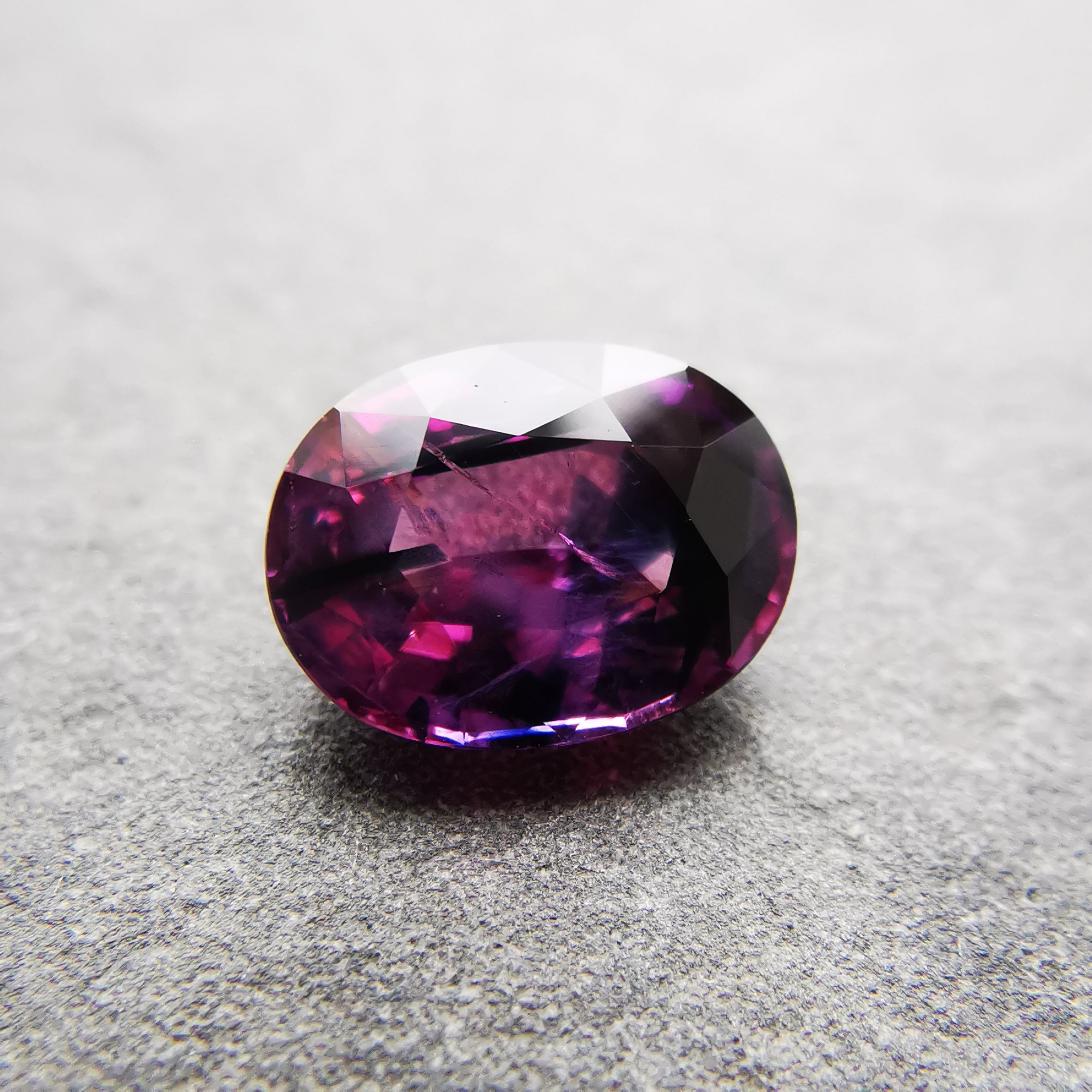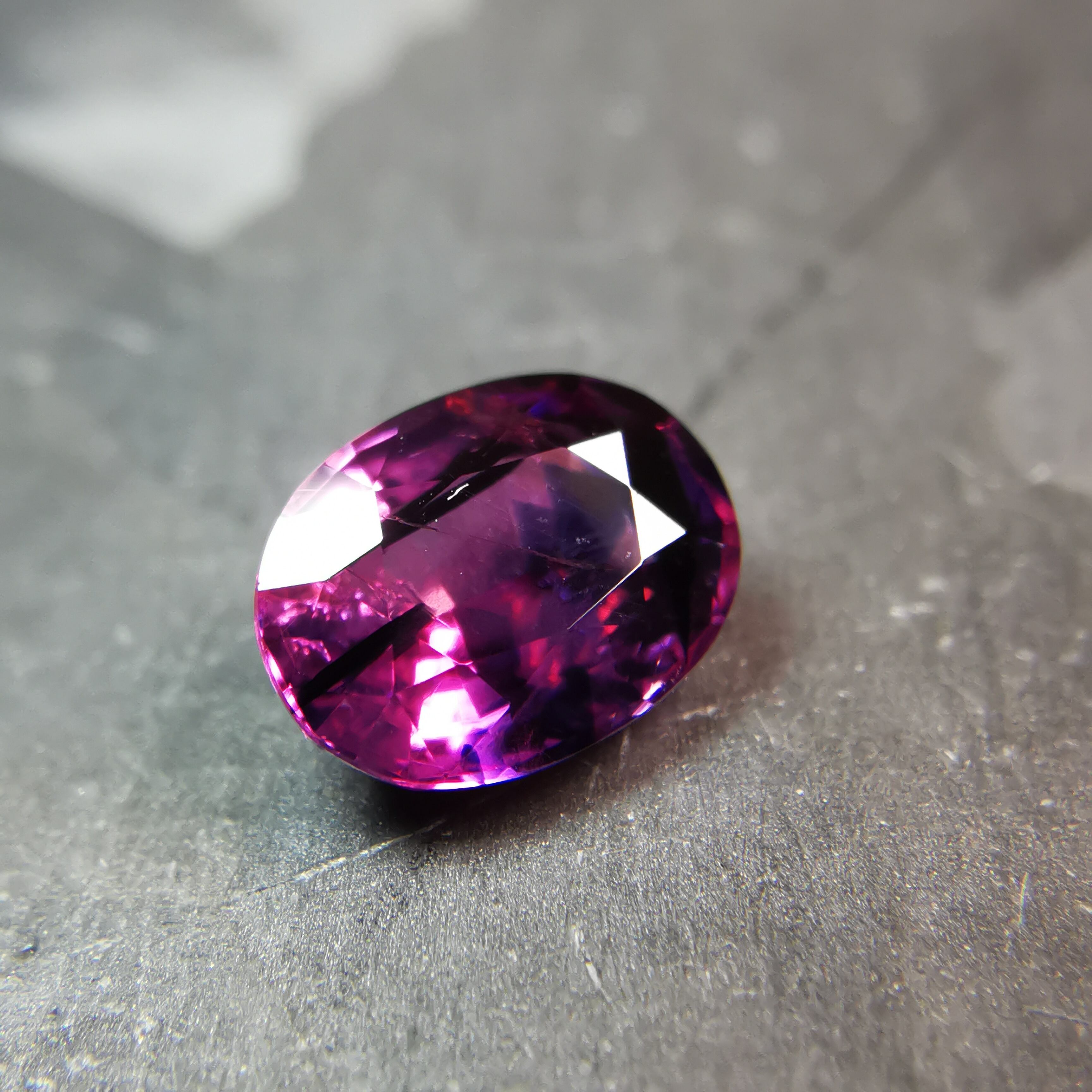 鮮やかな赤紫/クリムソン色に、帯状の紺色がいくつも走るバイカラーサファイアです。