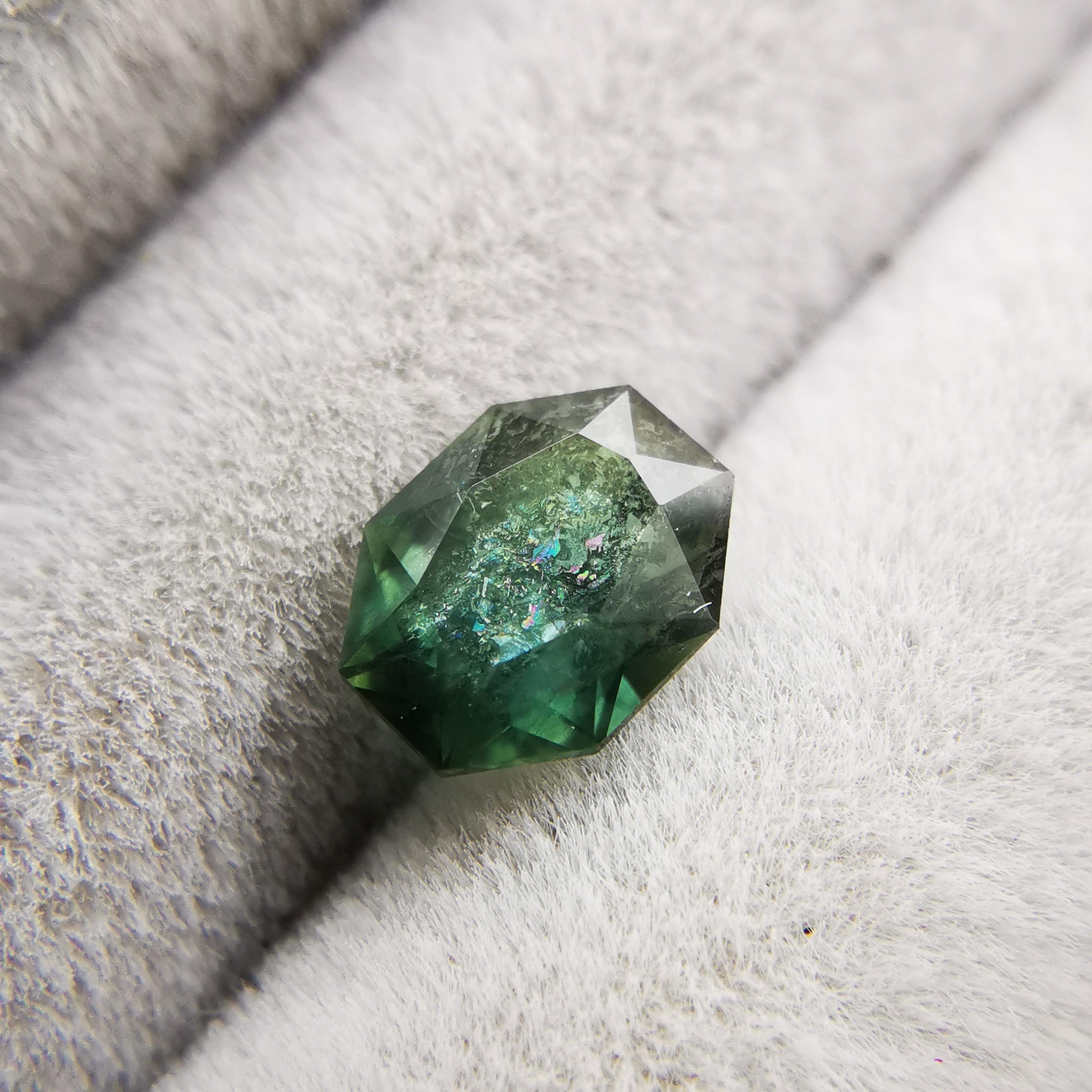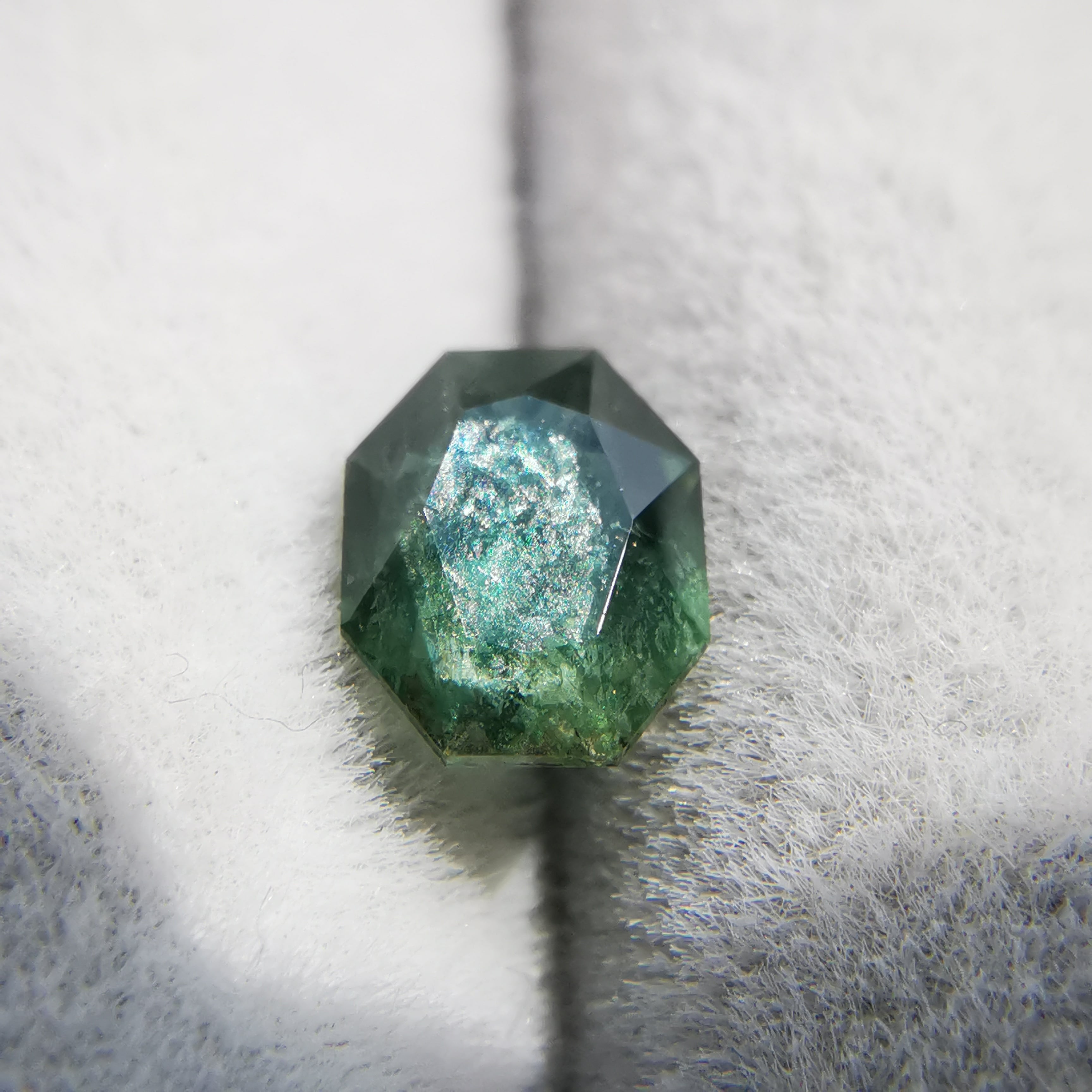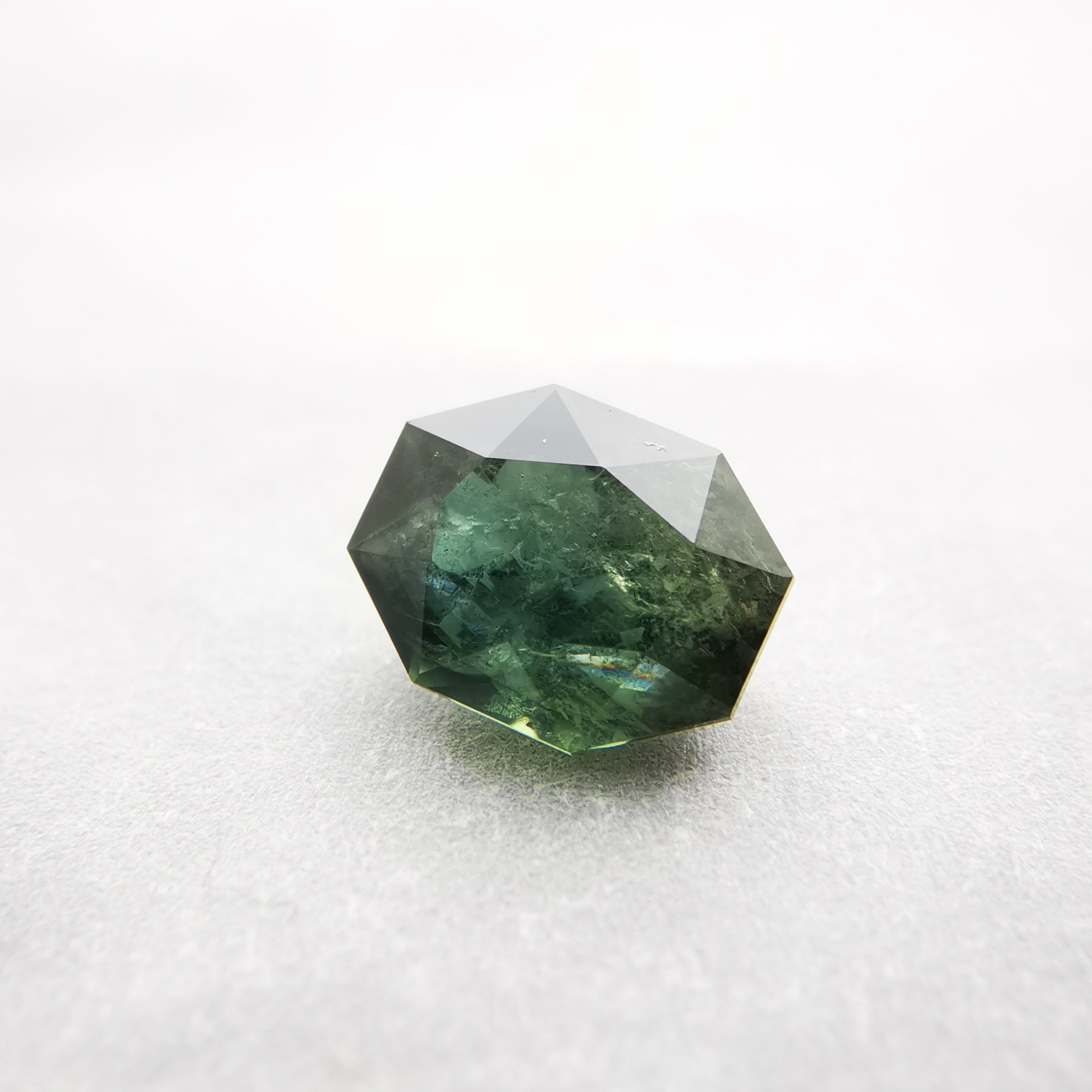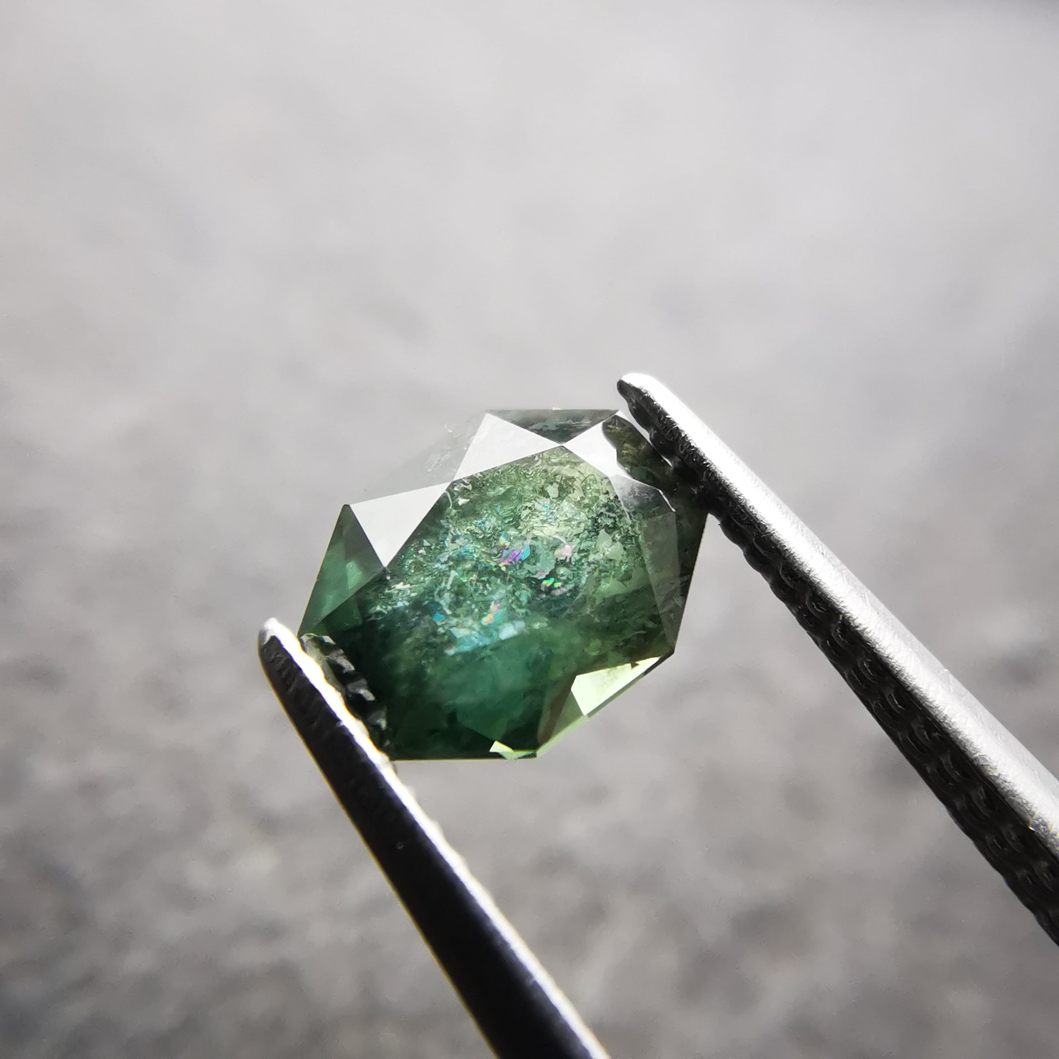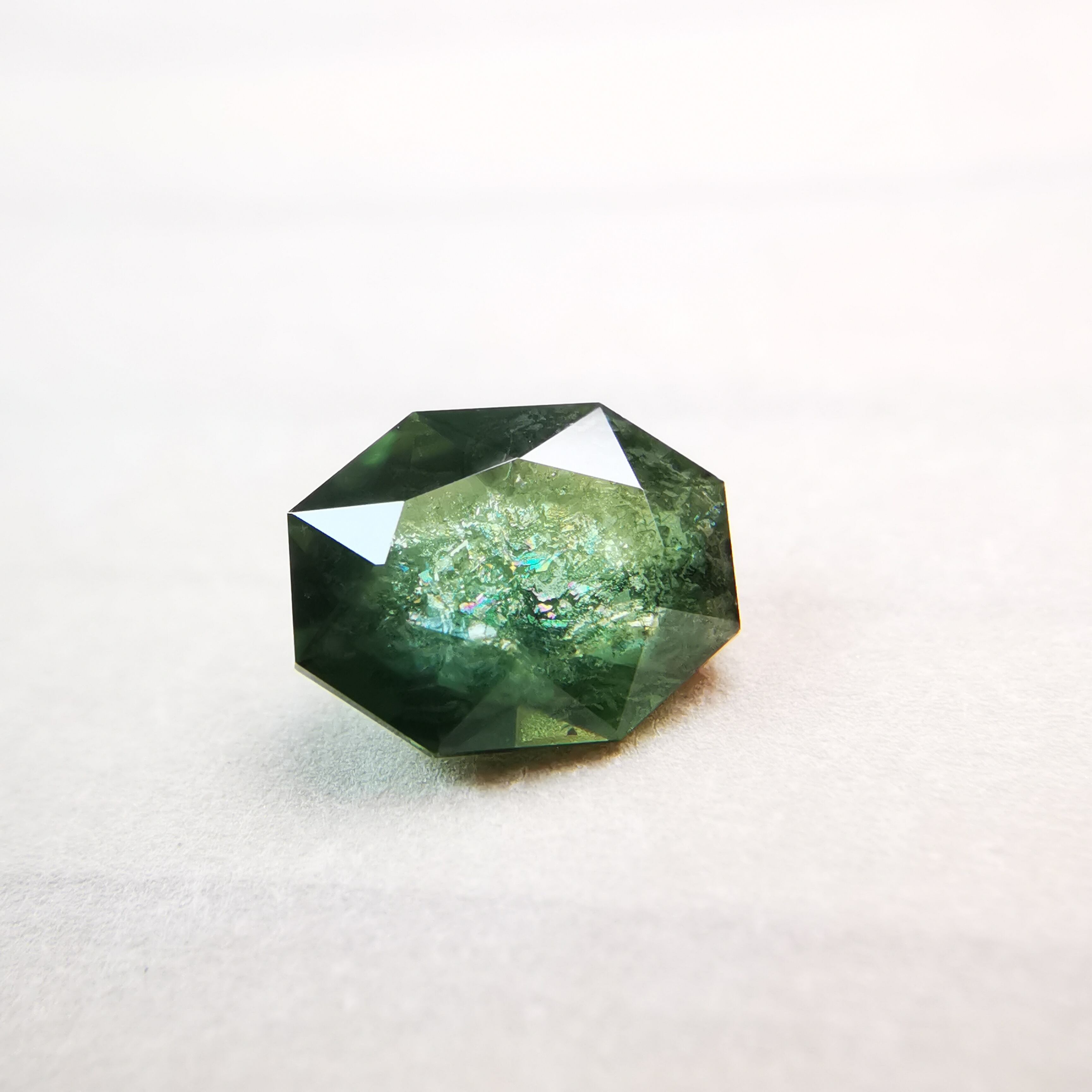 暗い灰みの緑/エバーグリーンのサファイアに、もやもやとしたインクルージョンが入っています。