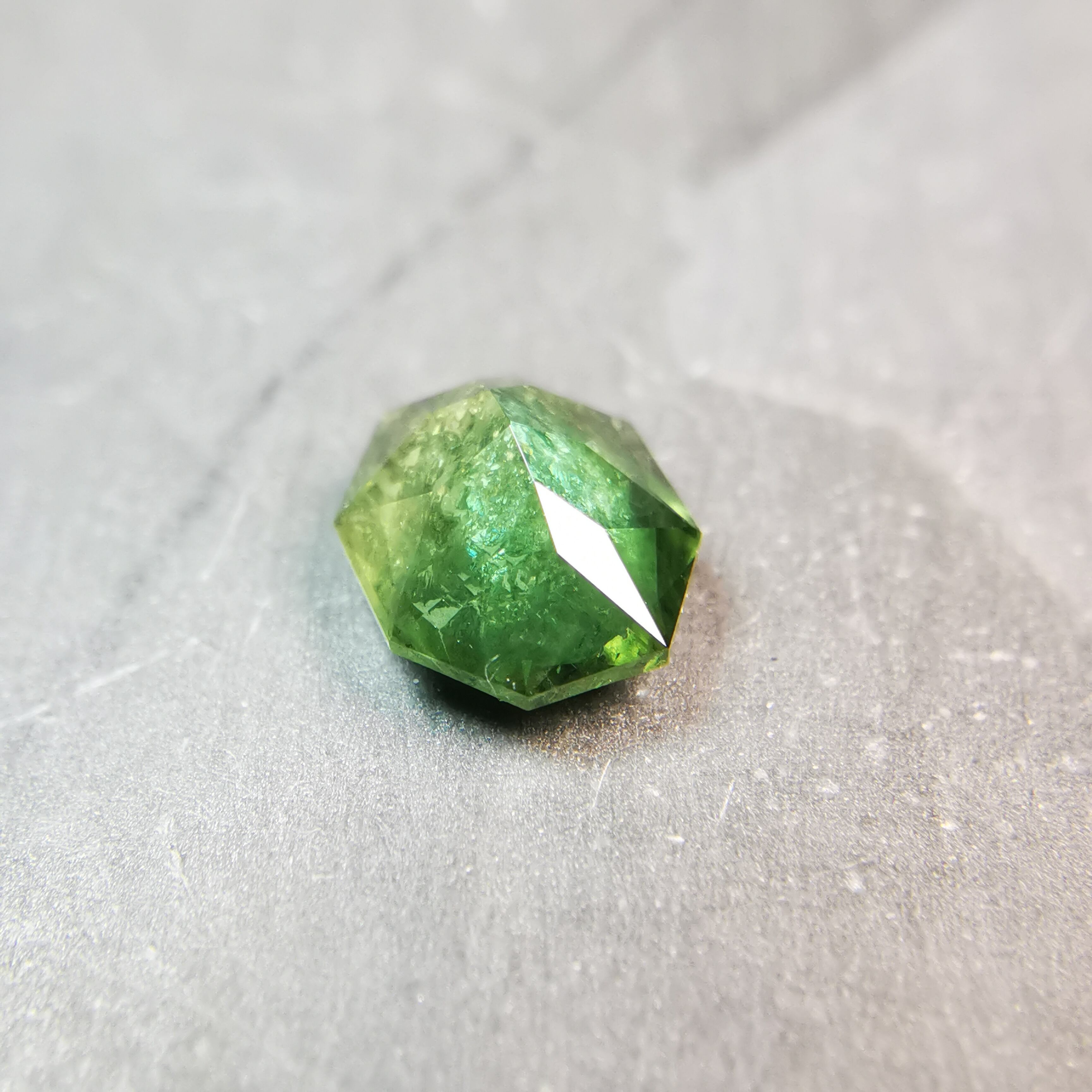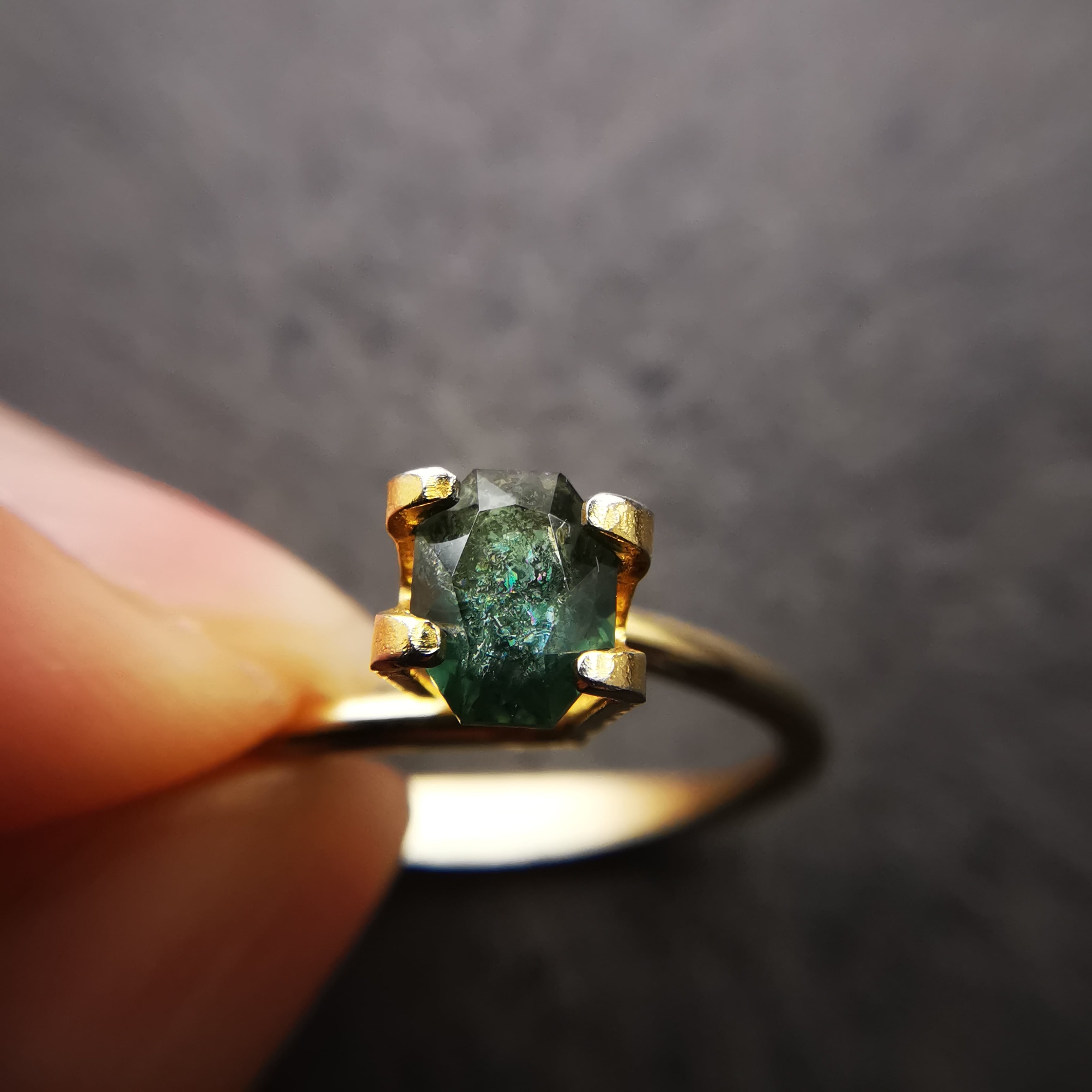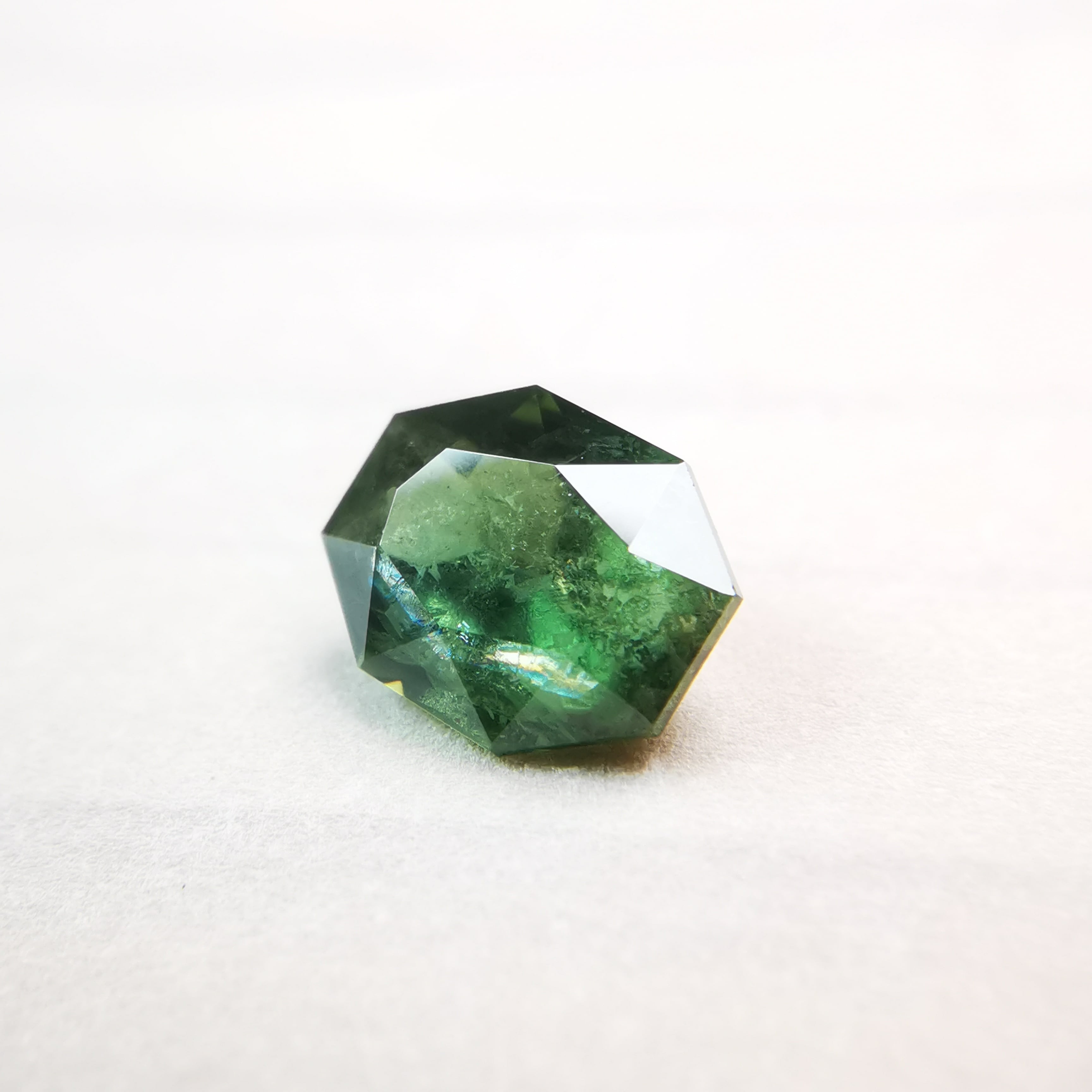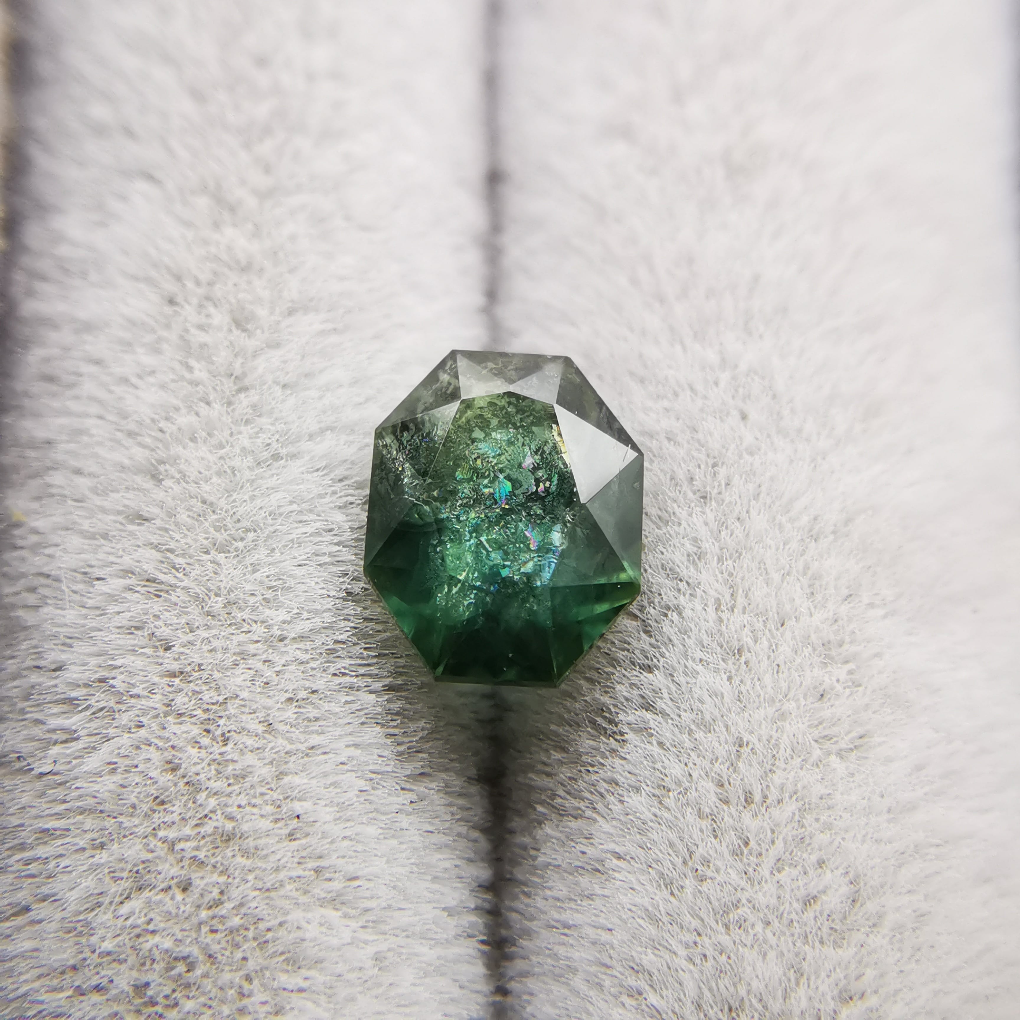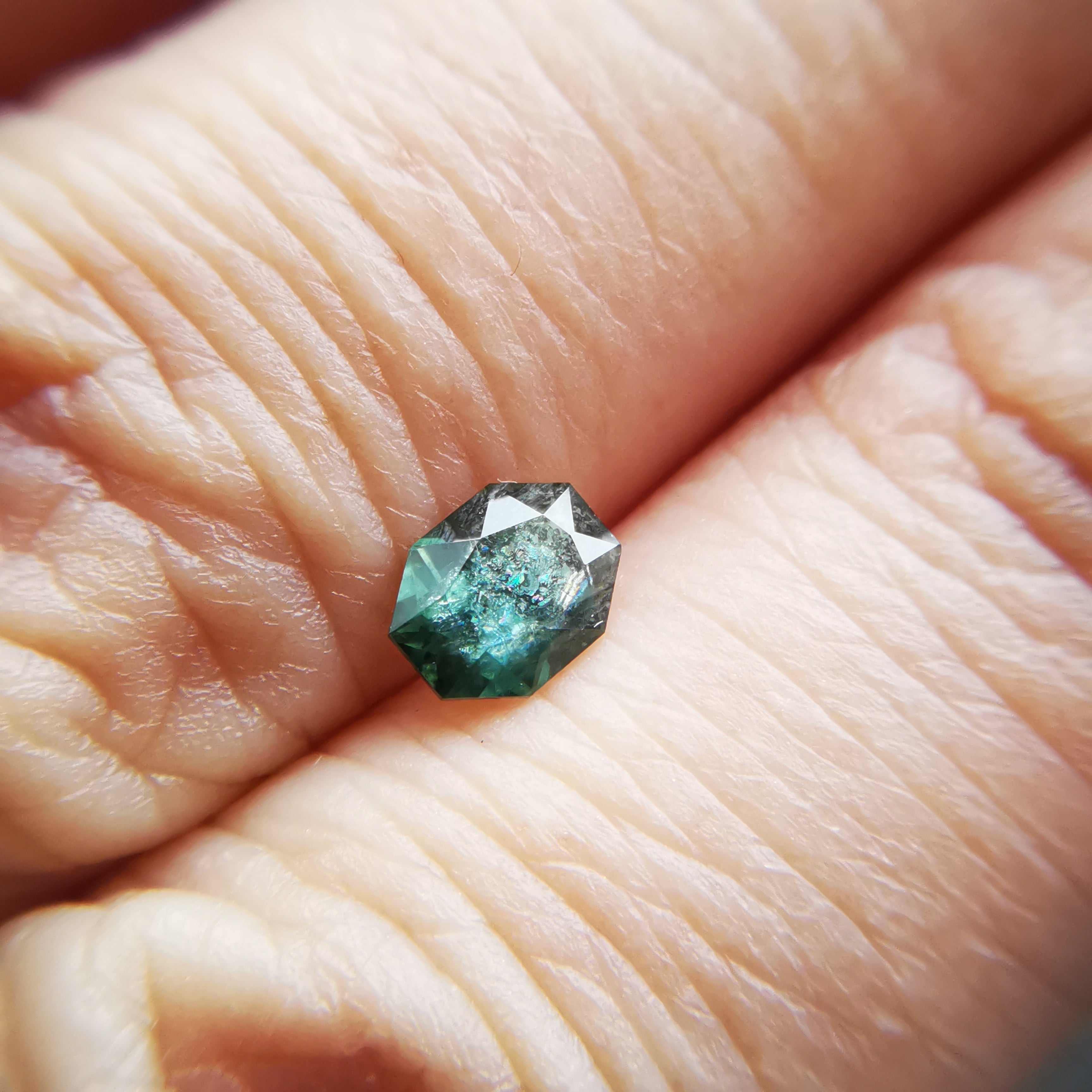 暗い灰みの緑/エバーグリーンのサファイアに、もやもやとしたインクルージョンが入っています。