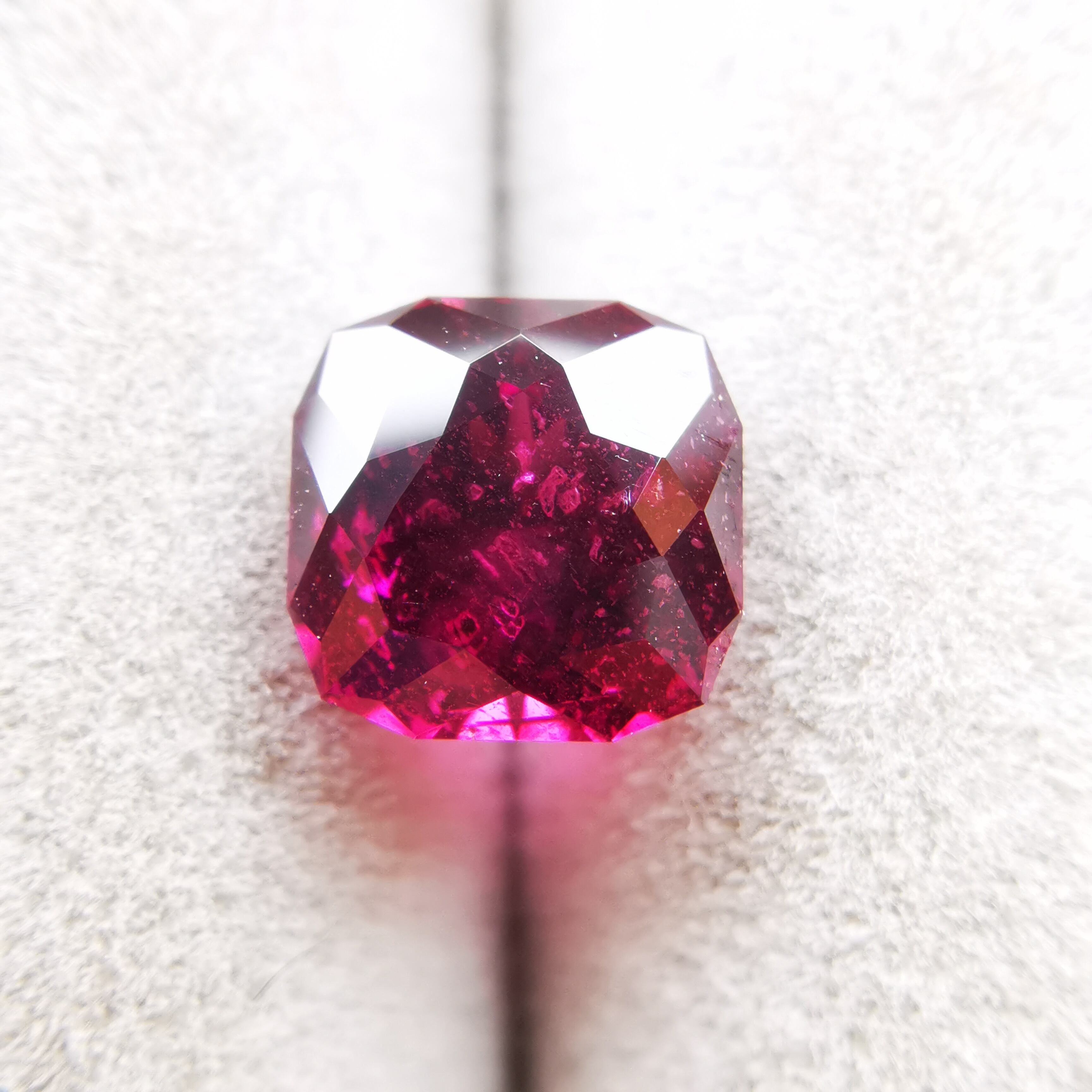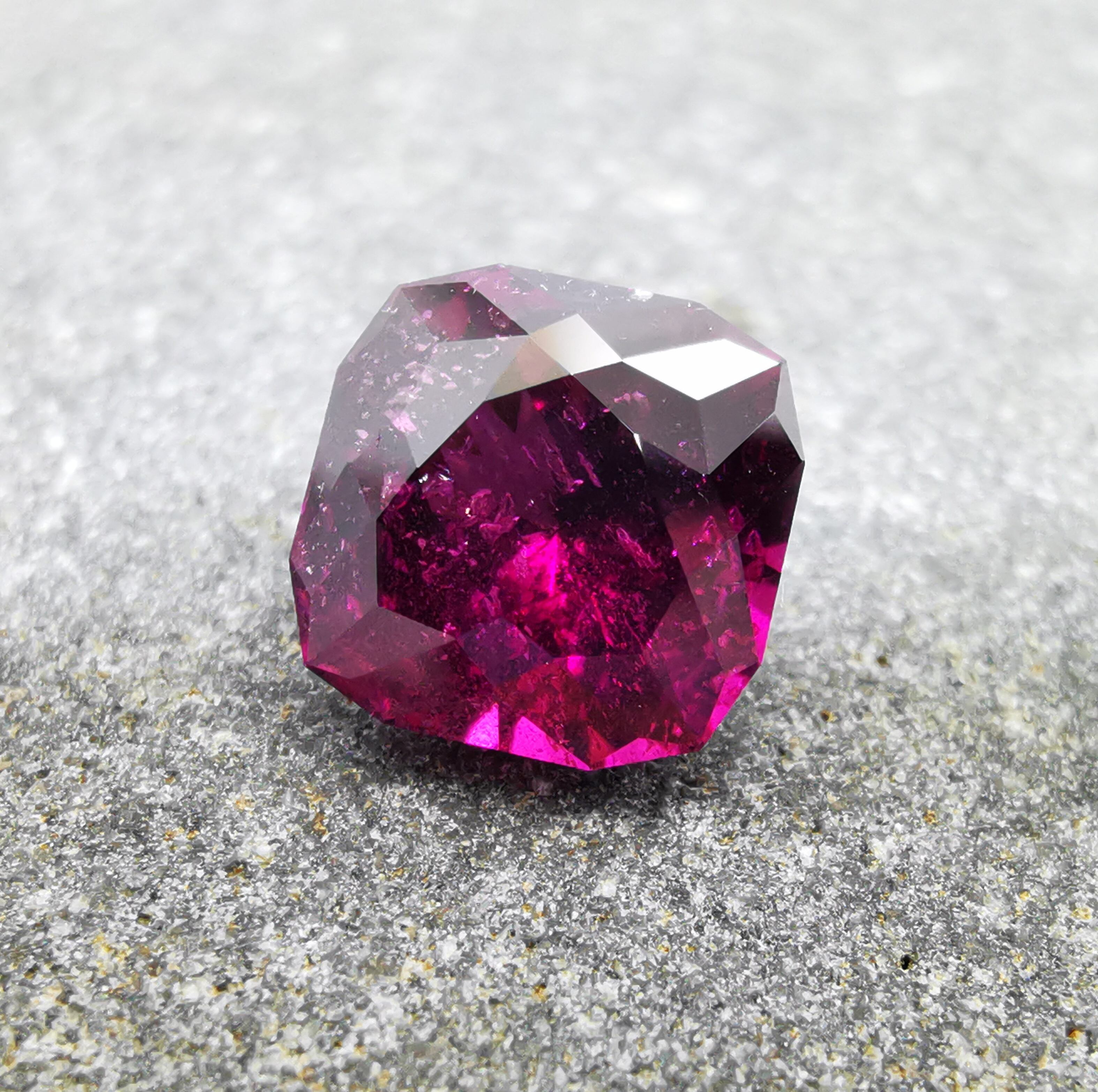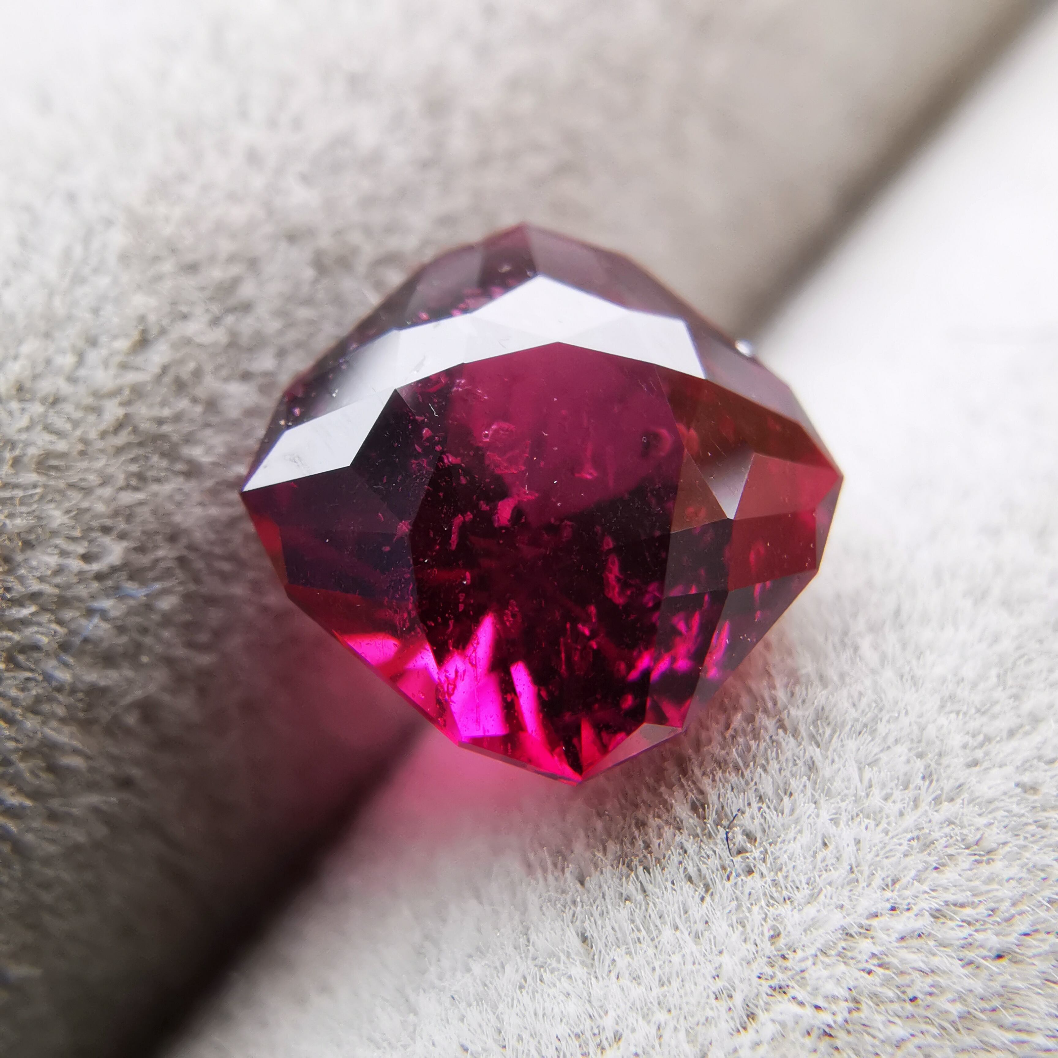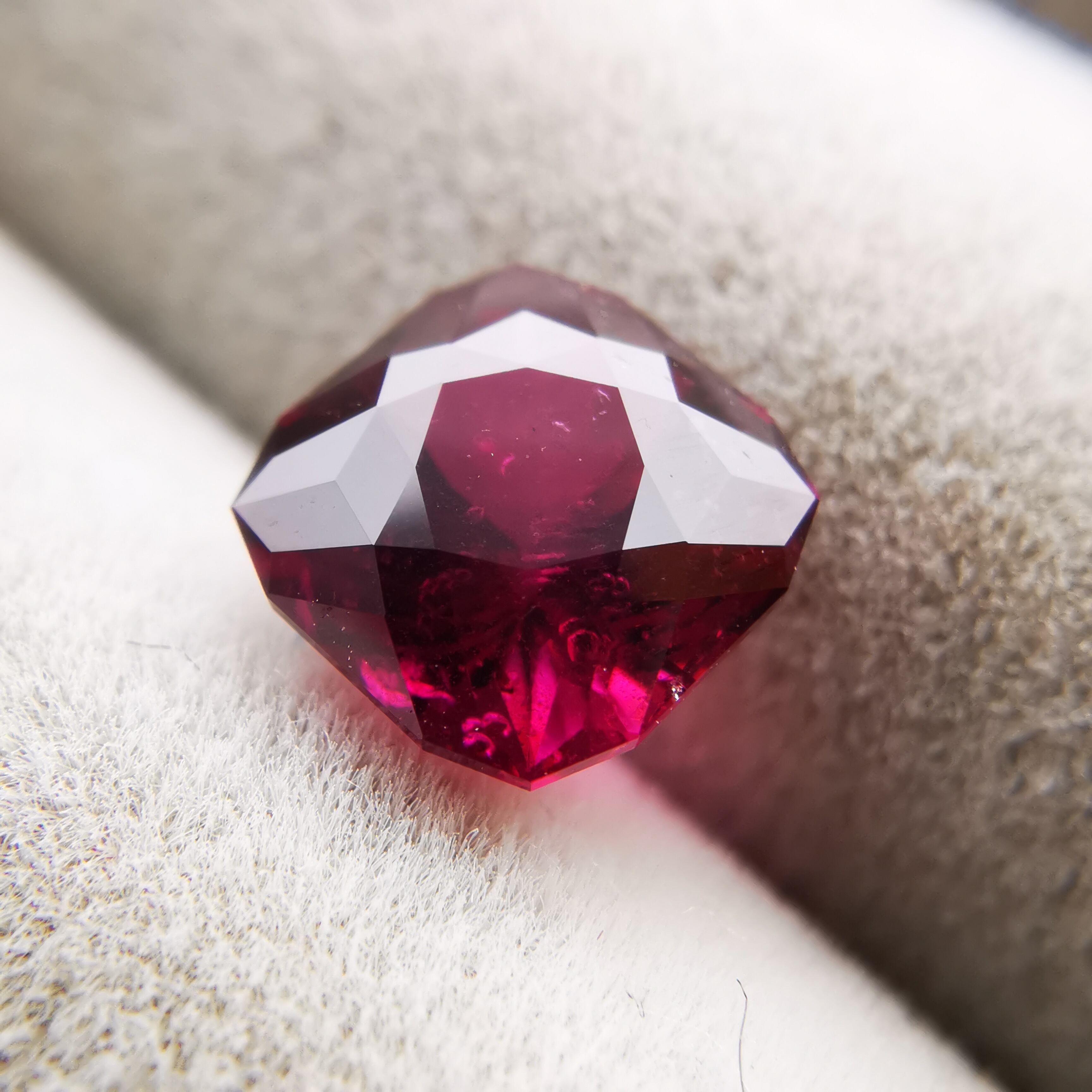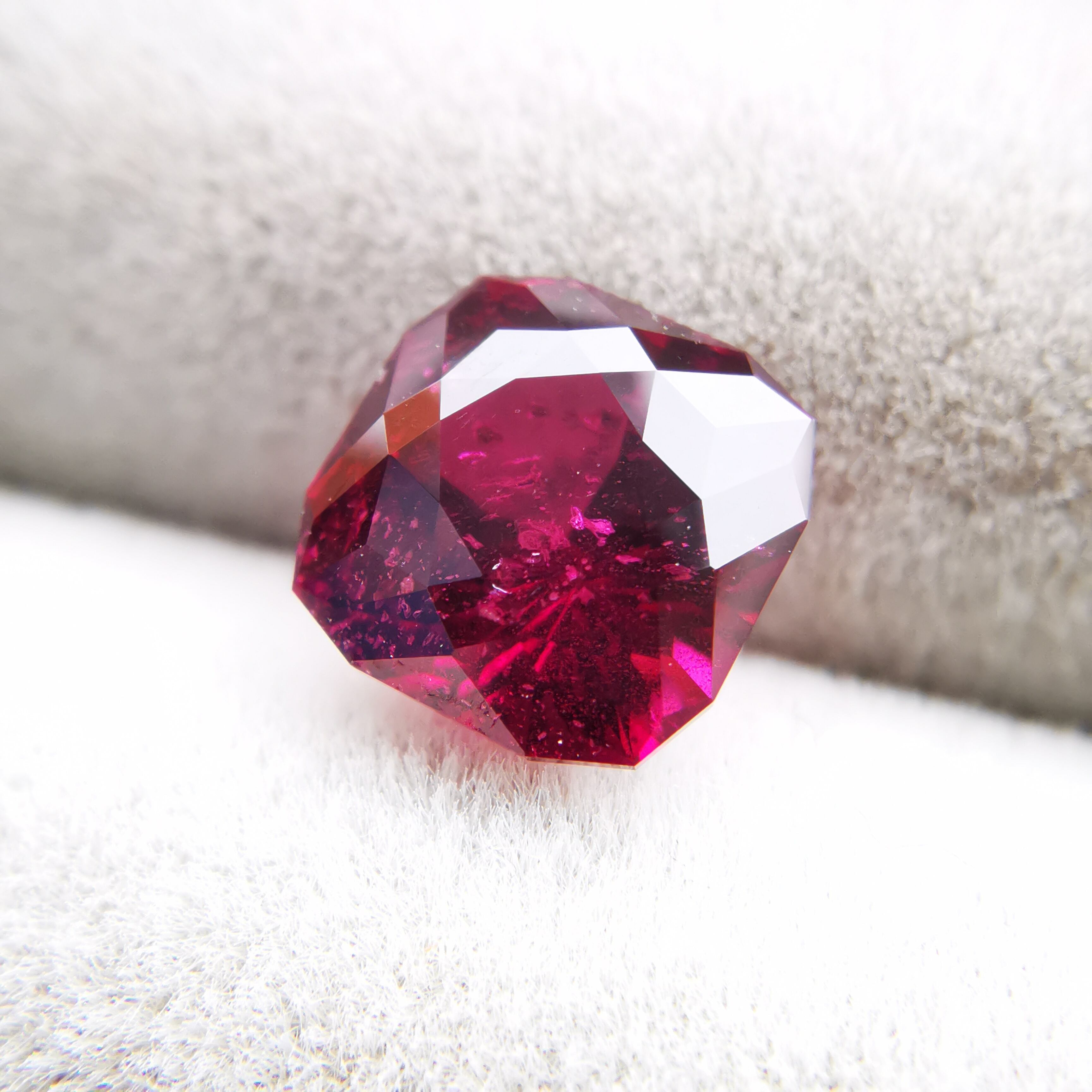 深い赤、インクルージョンに反射した複雑なきらめきが、花のような複雑なカットにより引き立てられます。