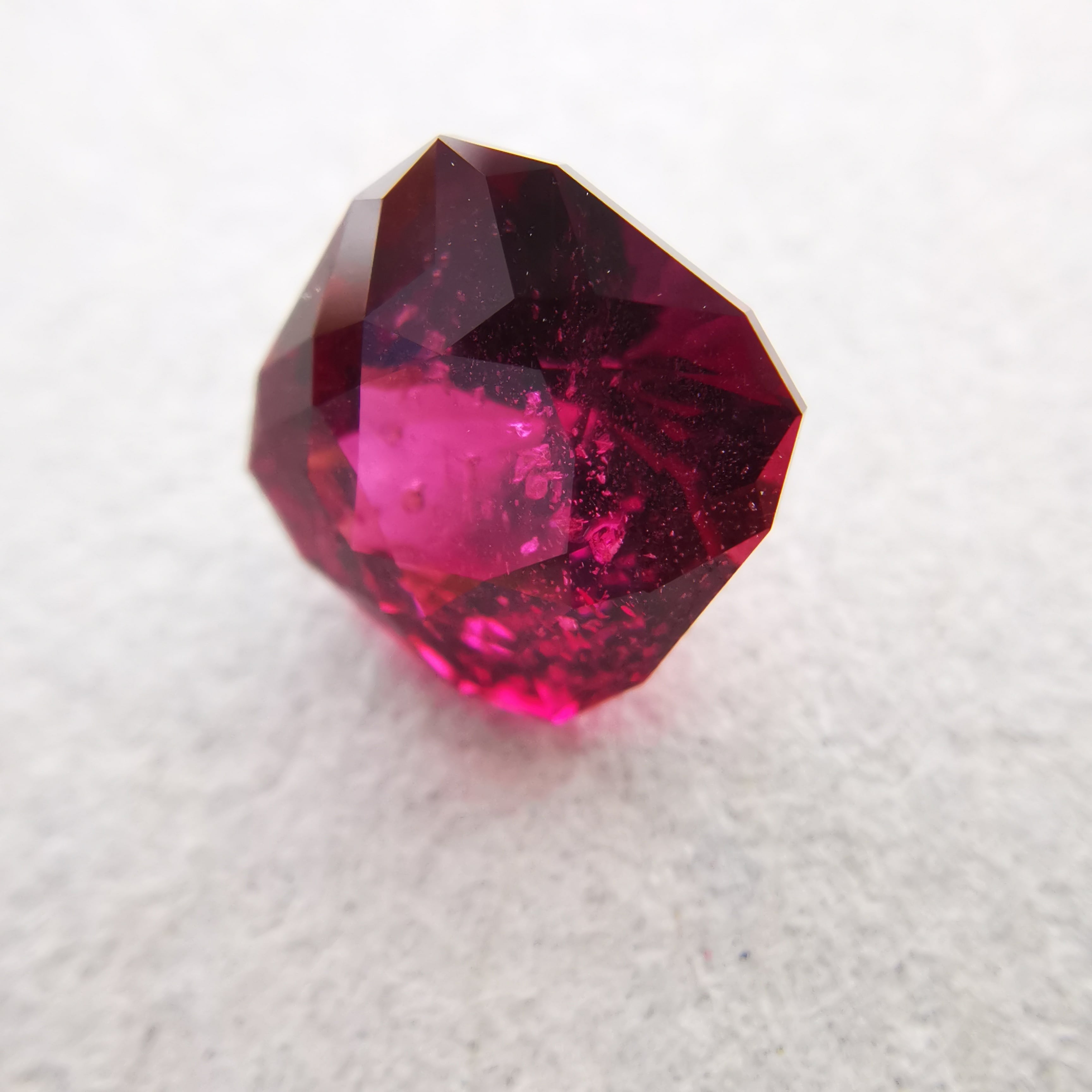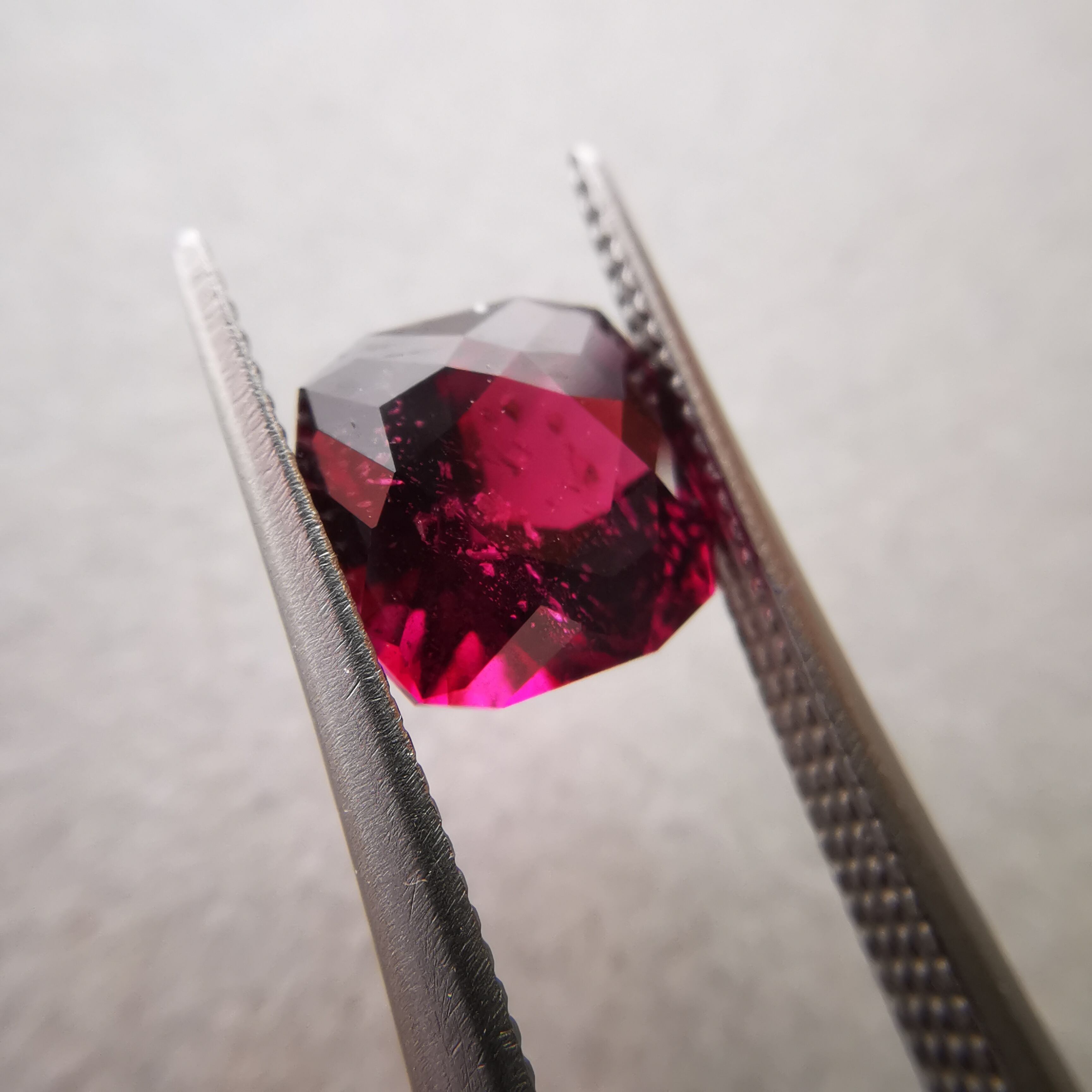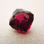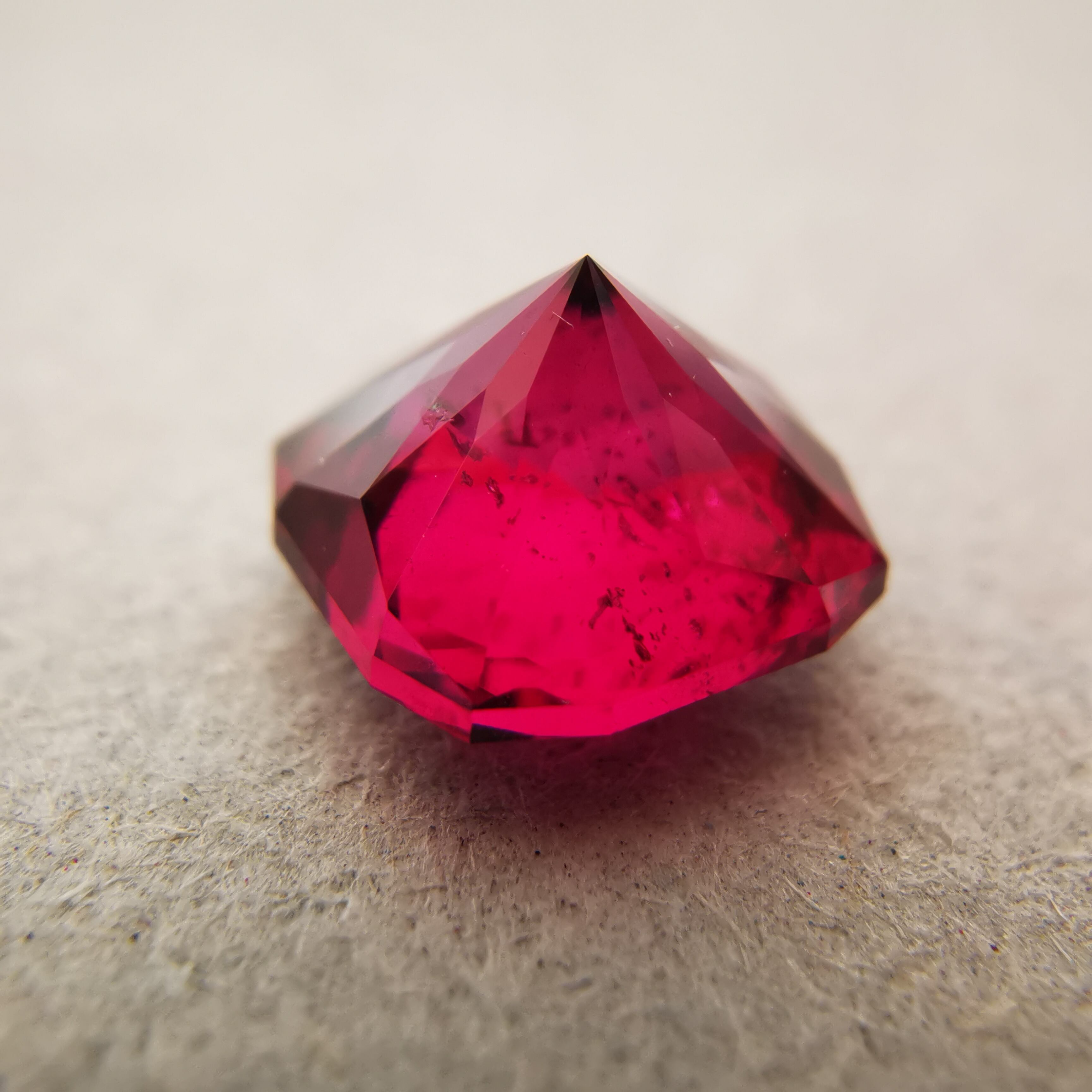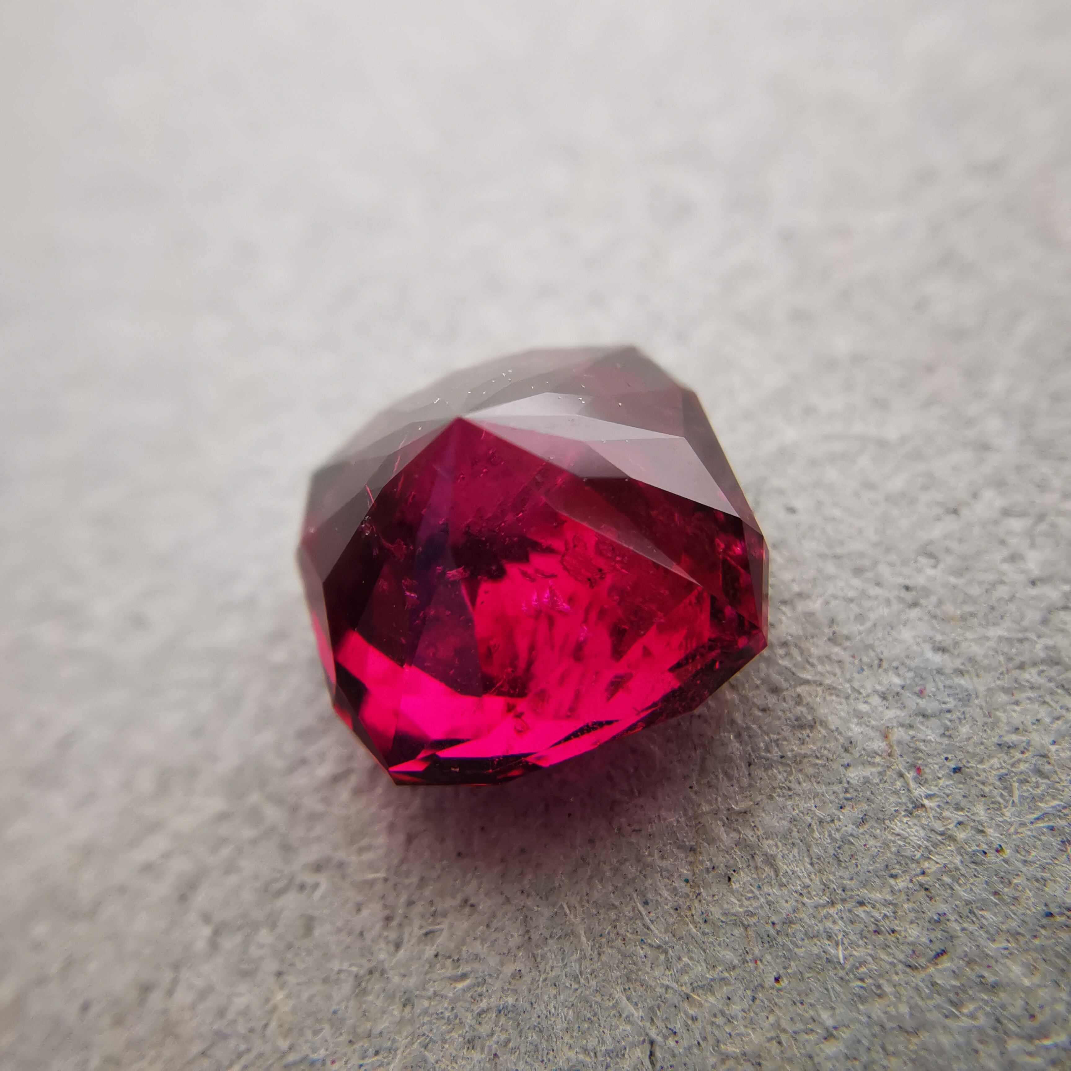 深い赤、インクルージョンに反射した複雑なきらめきが、花のような複雑なカットにより引き立てられます。