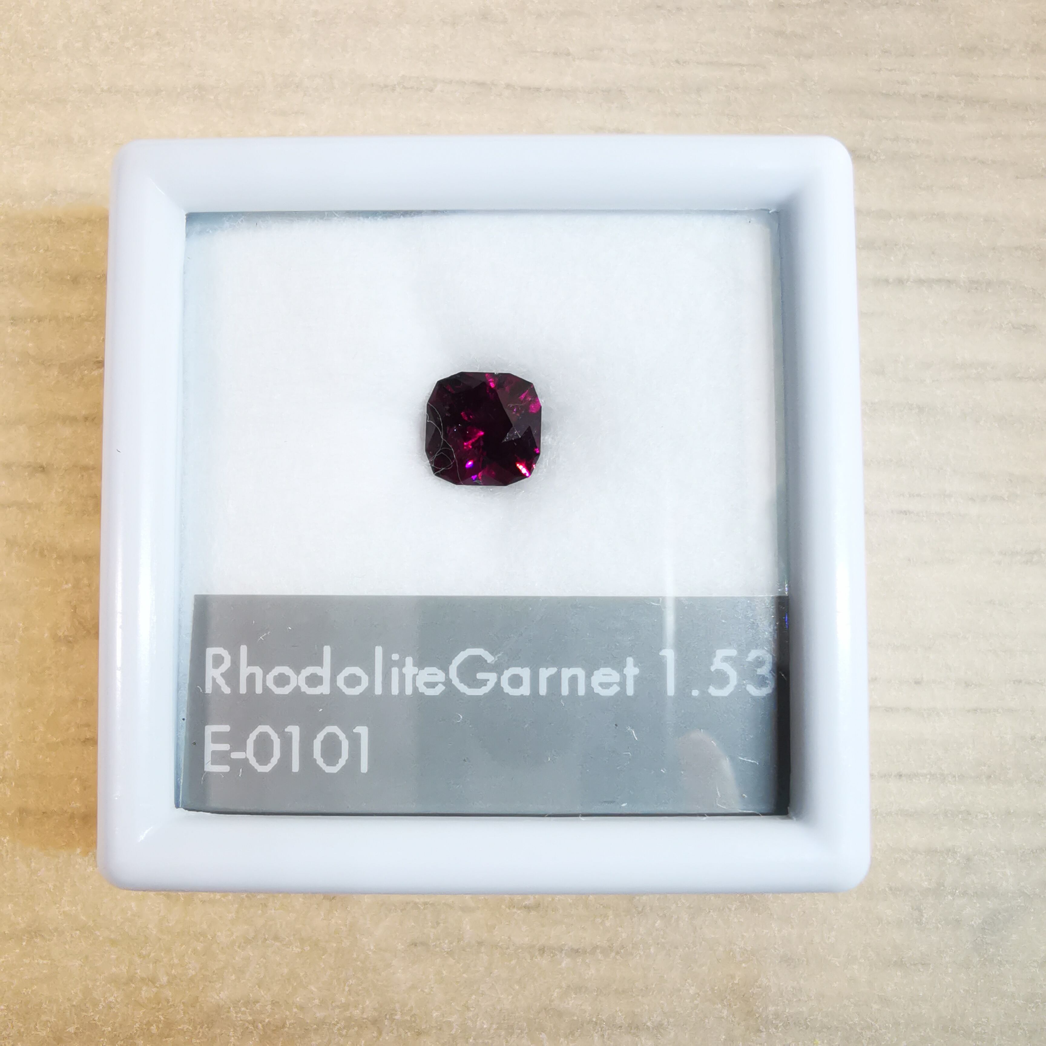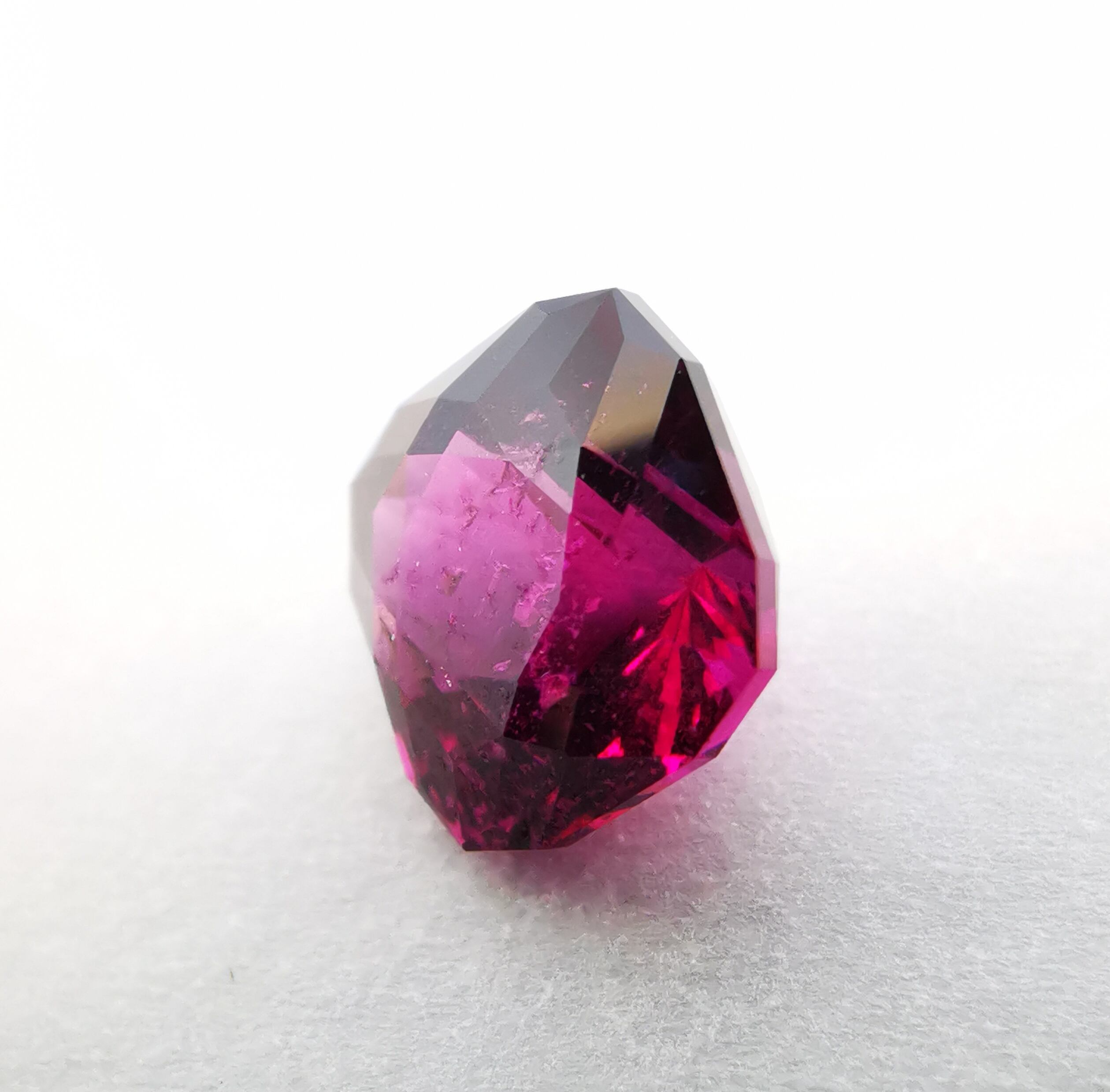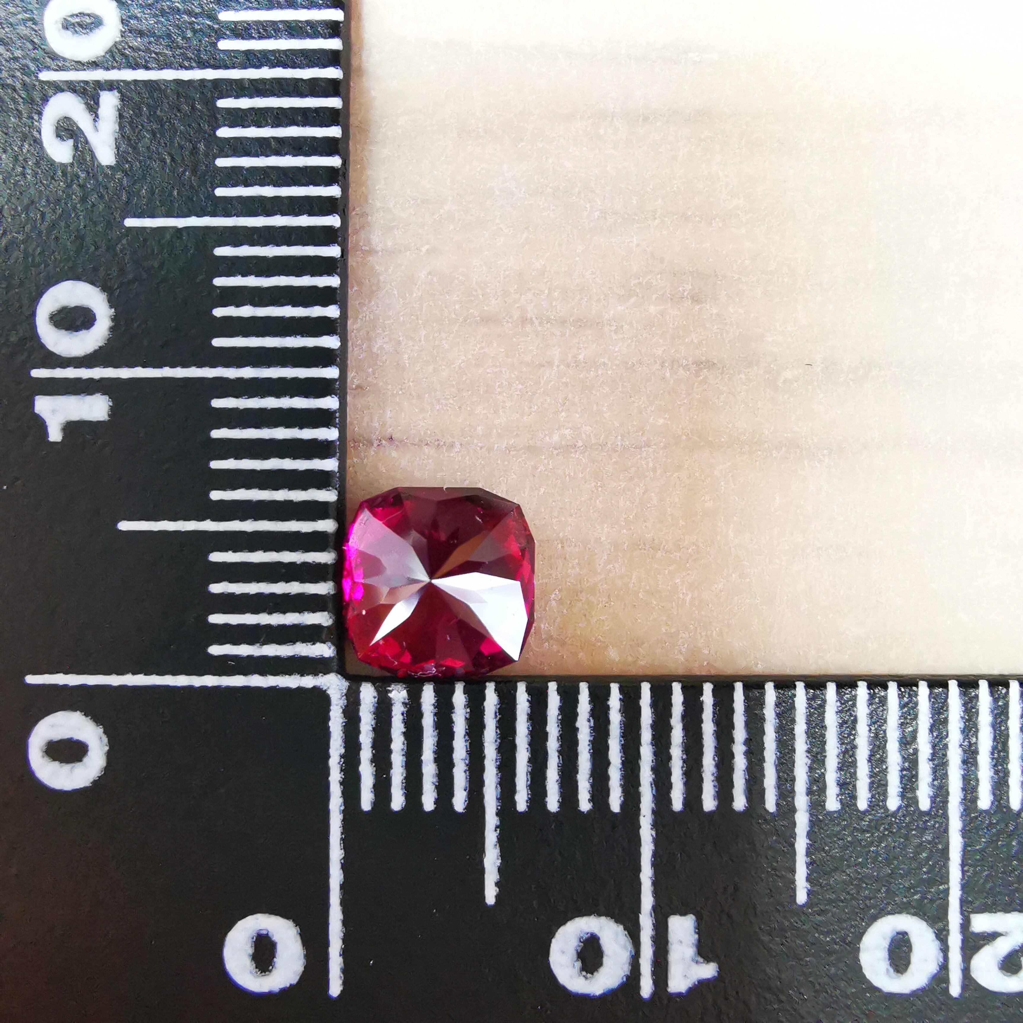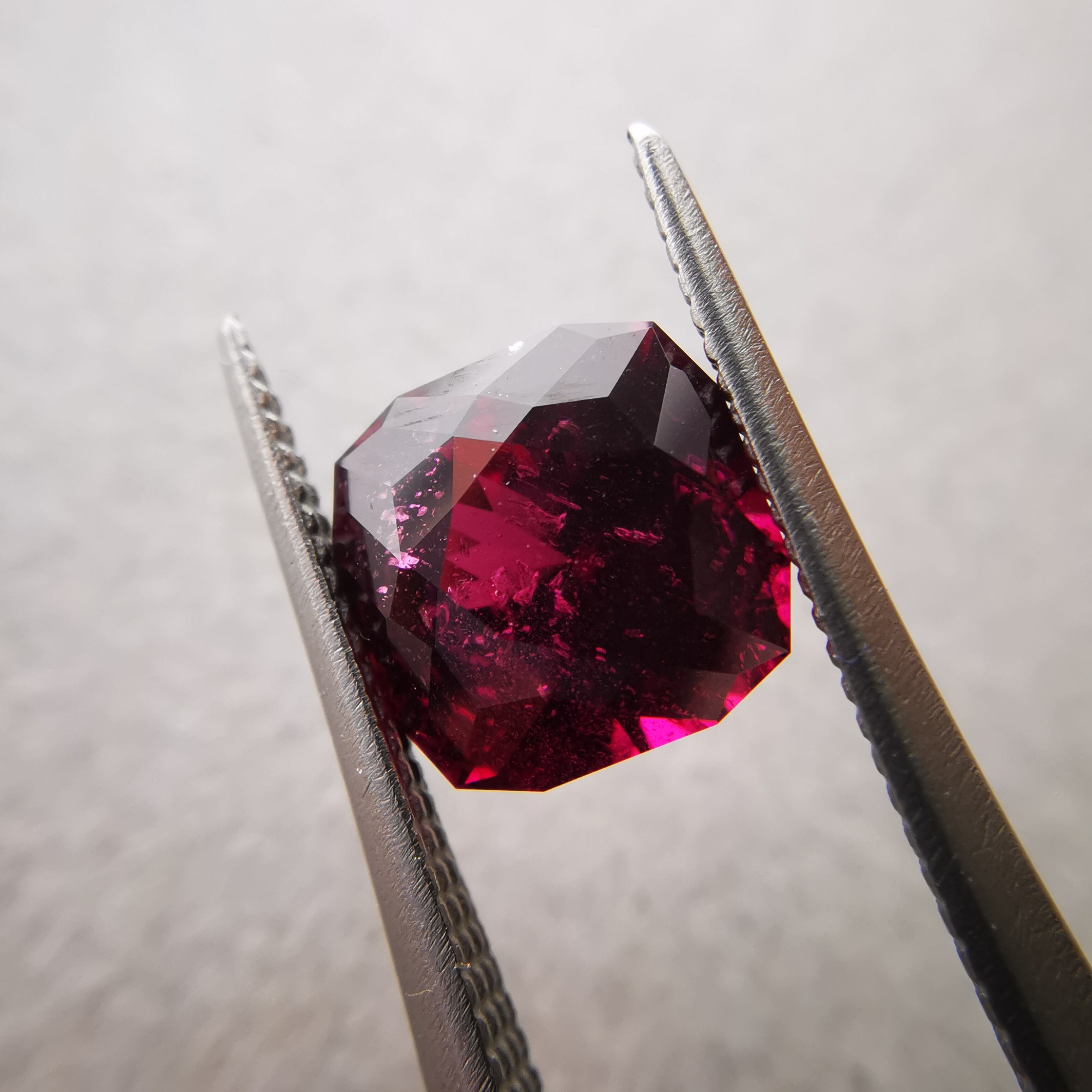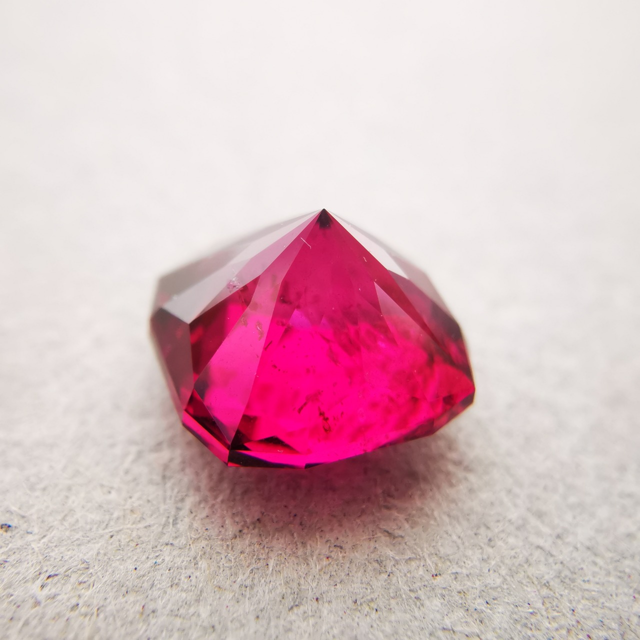 深い赤、インクルージョンに反射した複雑なきらめきが、花のような複雑なカットにより引き立てられます。