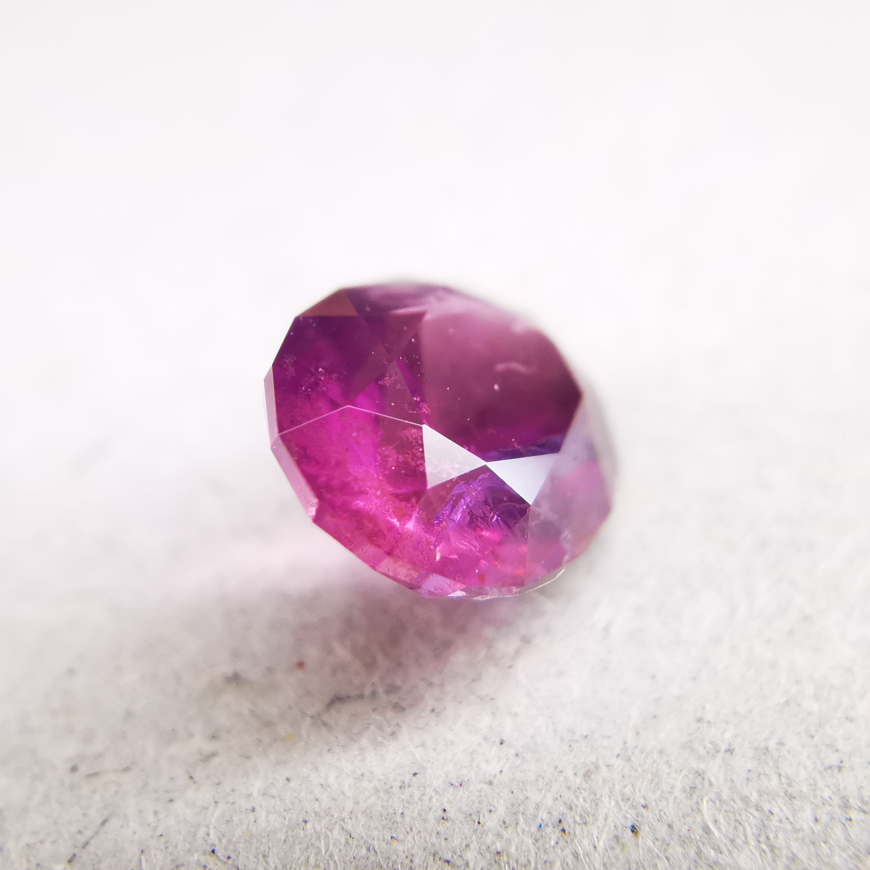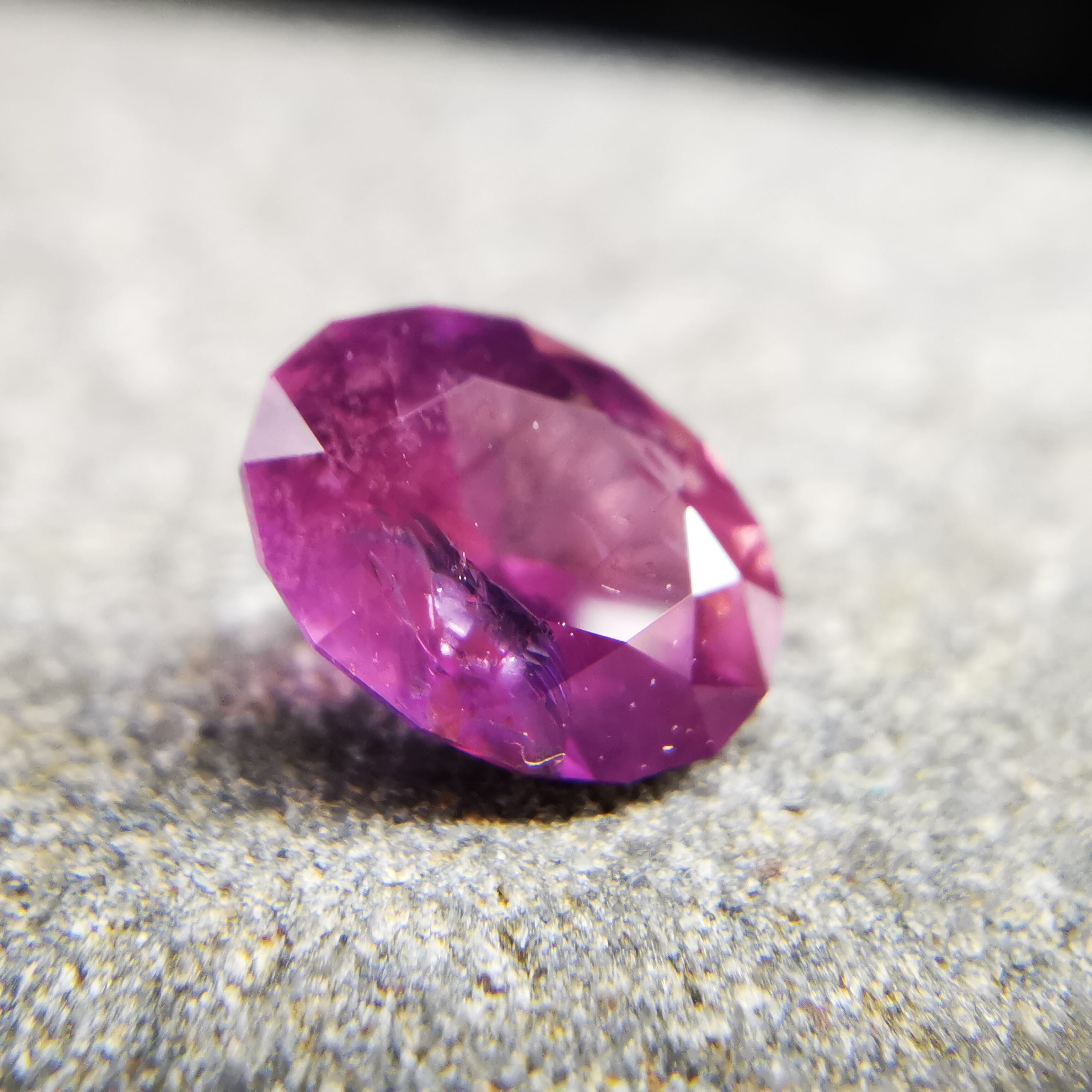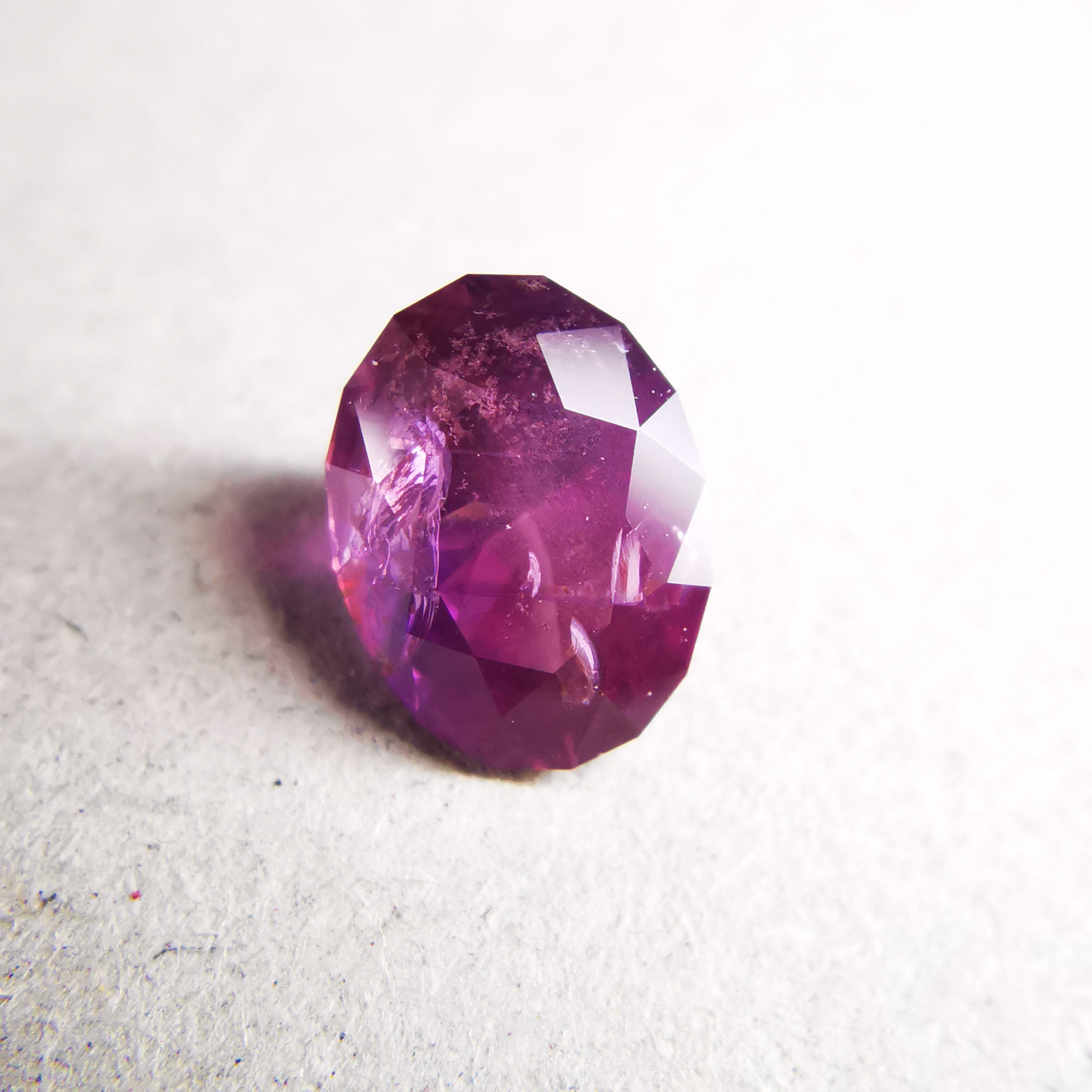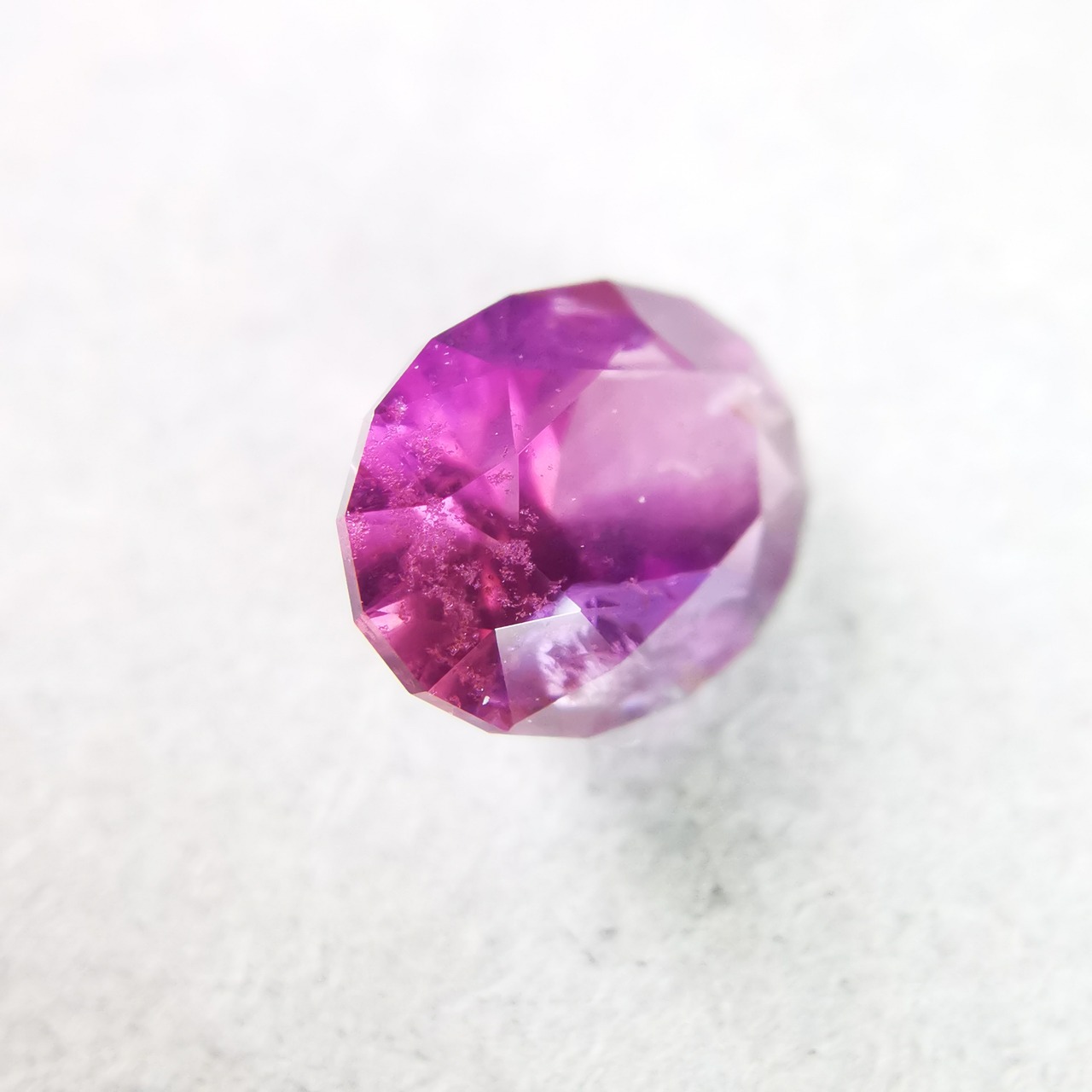 パープルピンクとオレンジピンクが混じり合い、全体に霧がかかったようなシルキーなインクルージョンで覆われています。