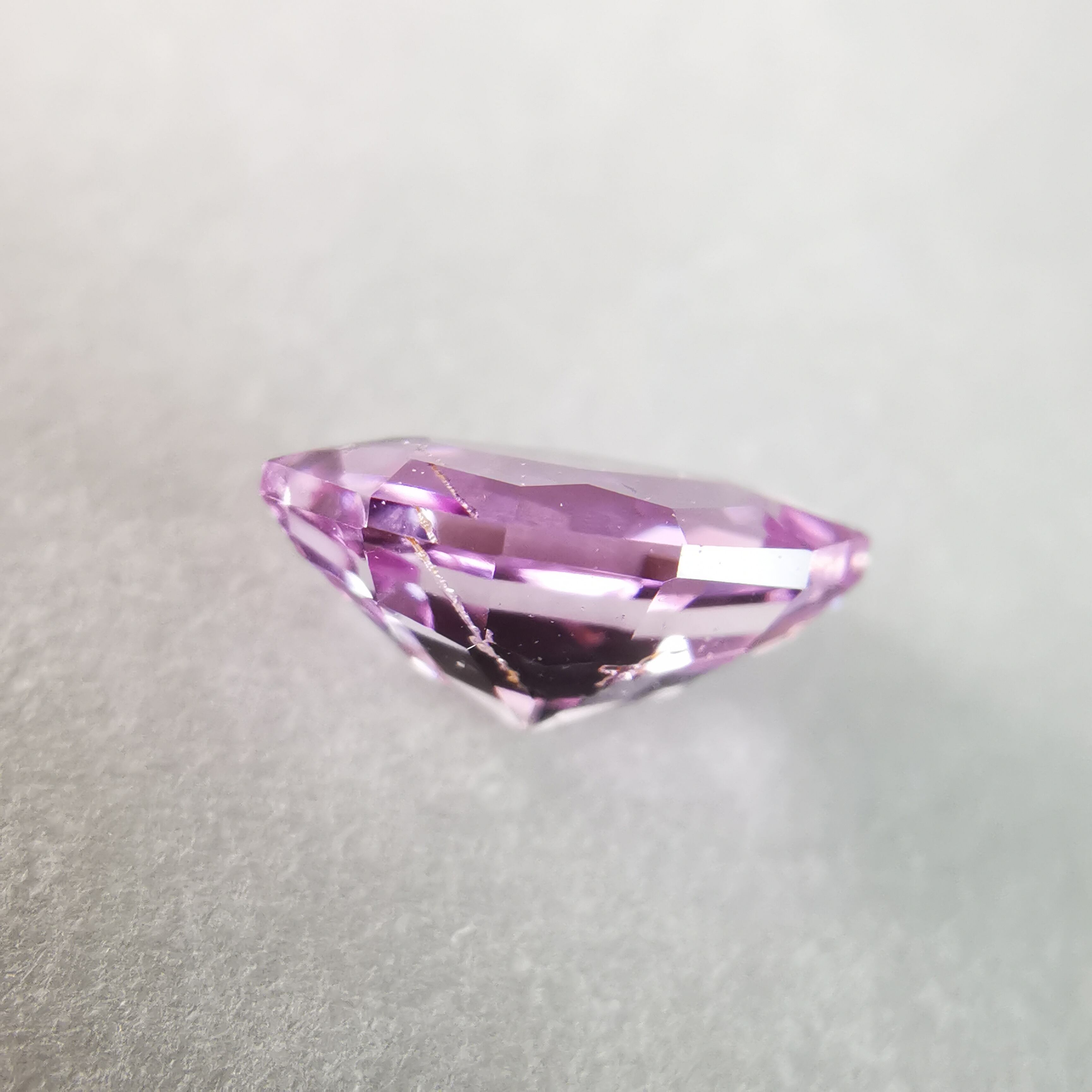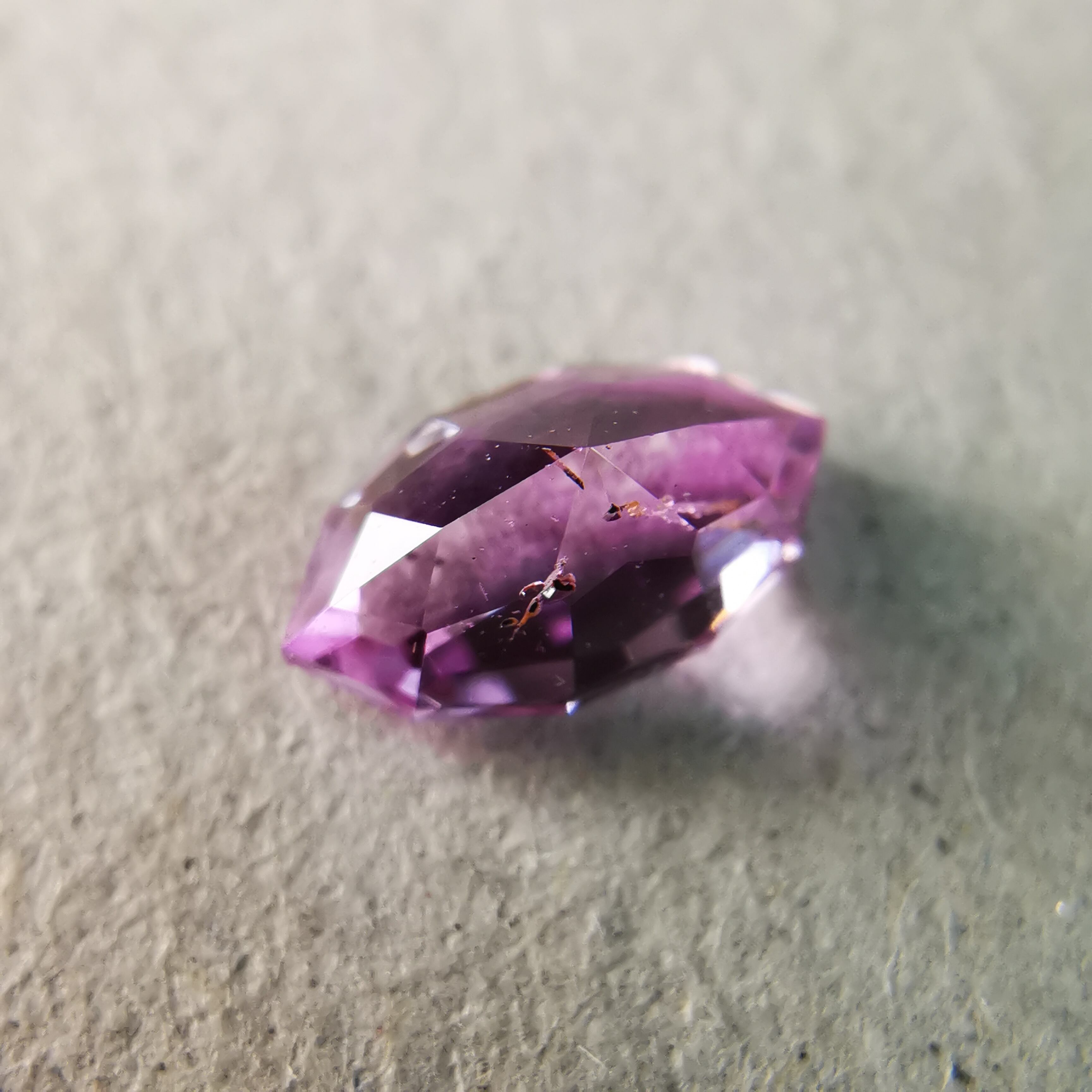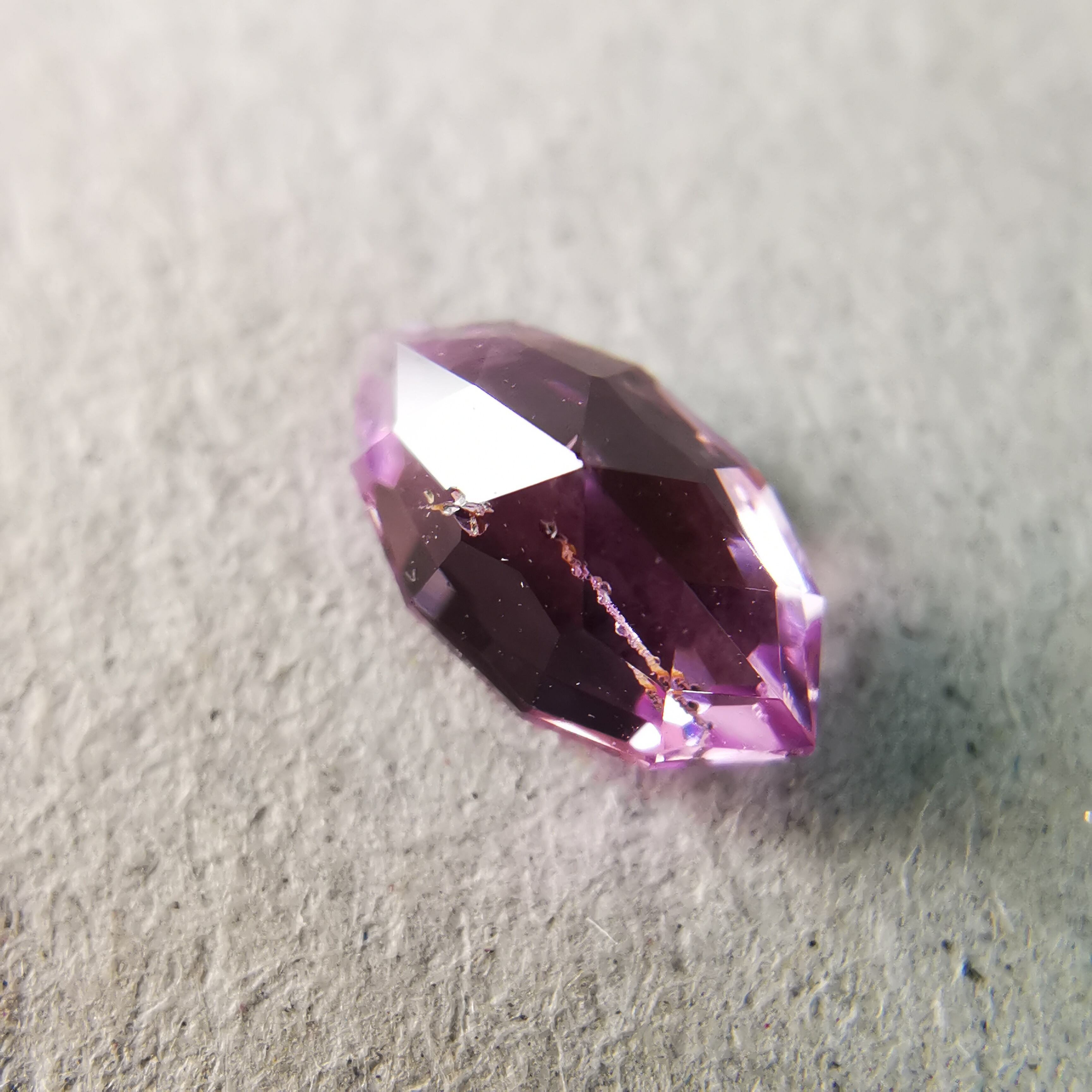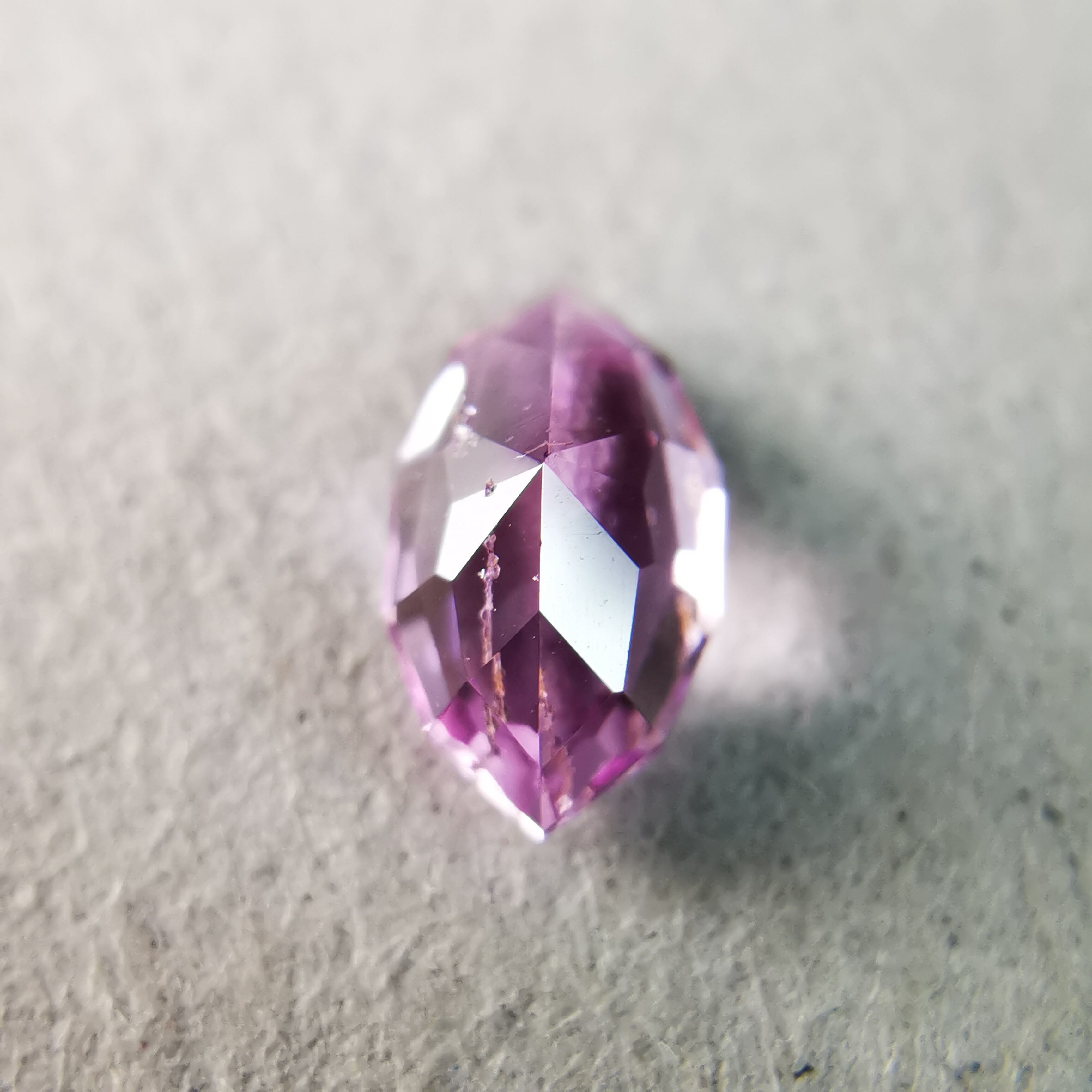 きらめきが強いため、フェイスのインクルージョンはそれほど目立ちませんが、パビリオン側のインクルージョンは表面に達しているので、欠けのようながたつきがあります。