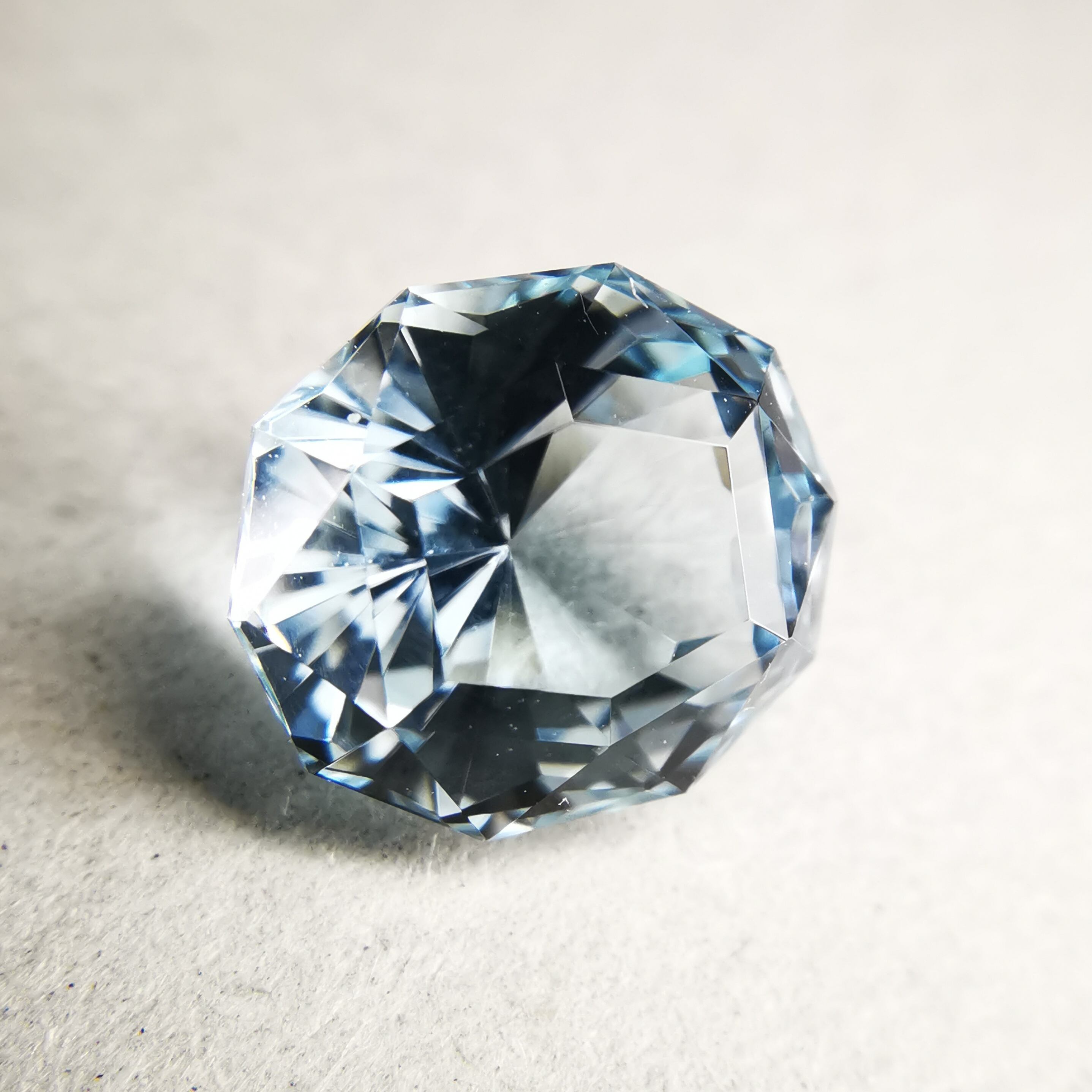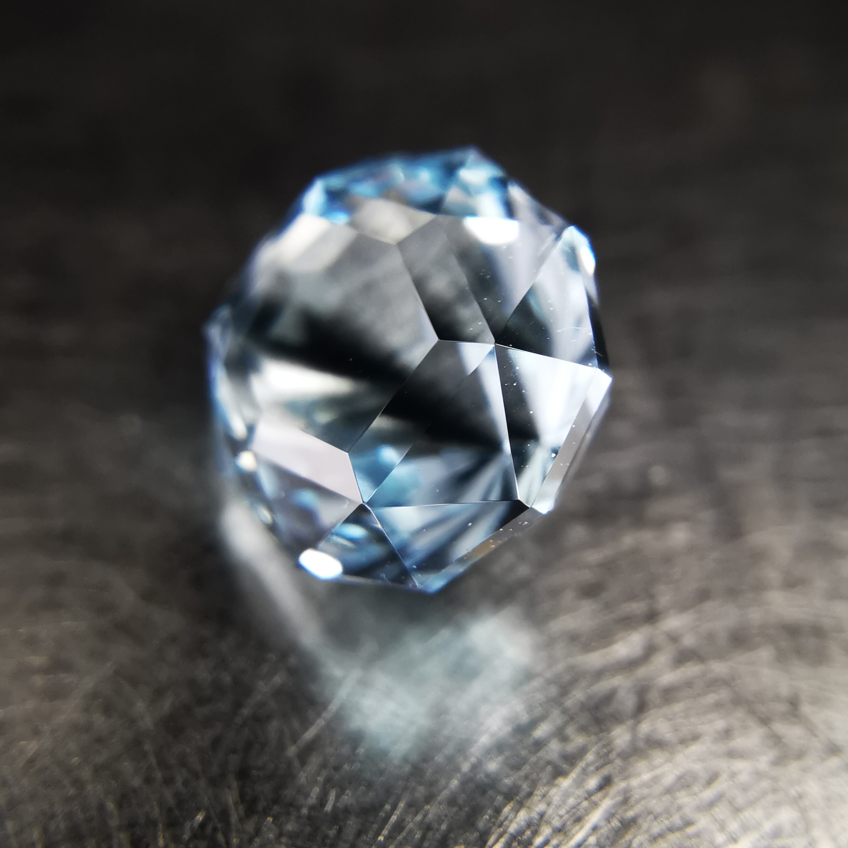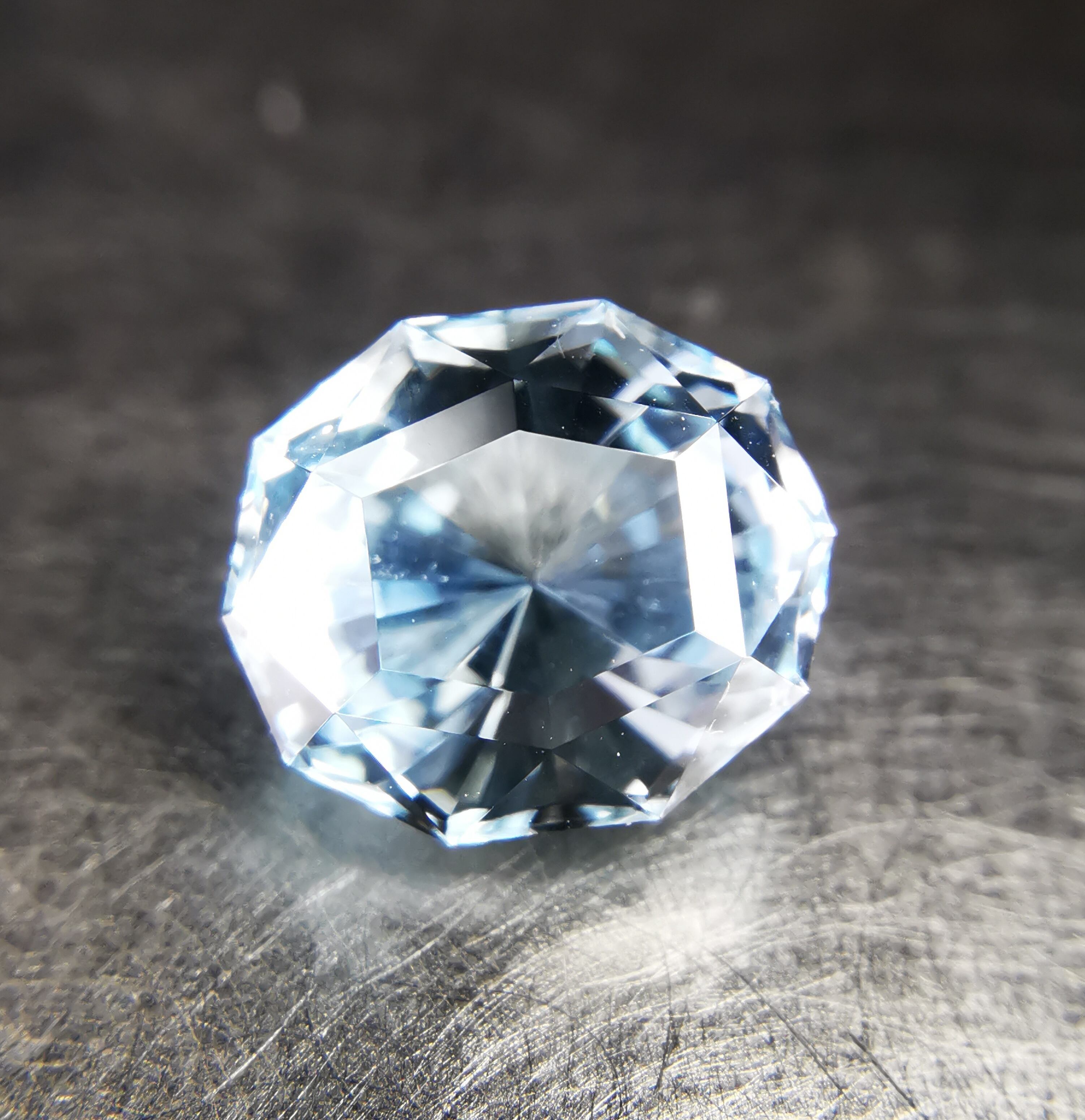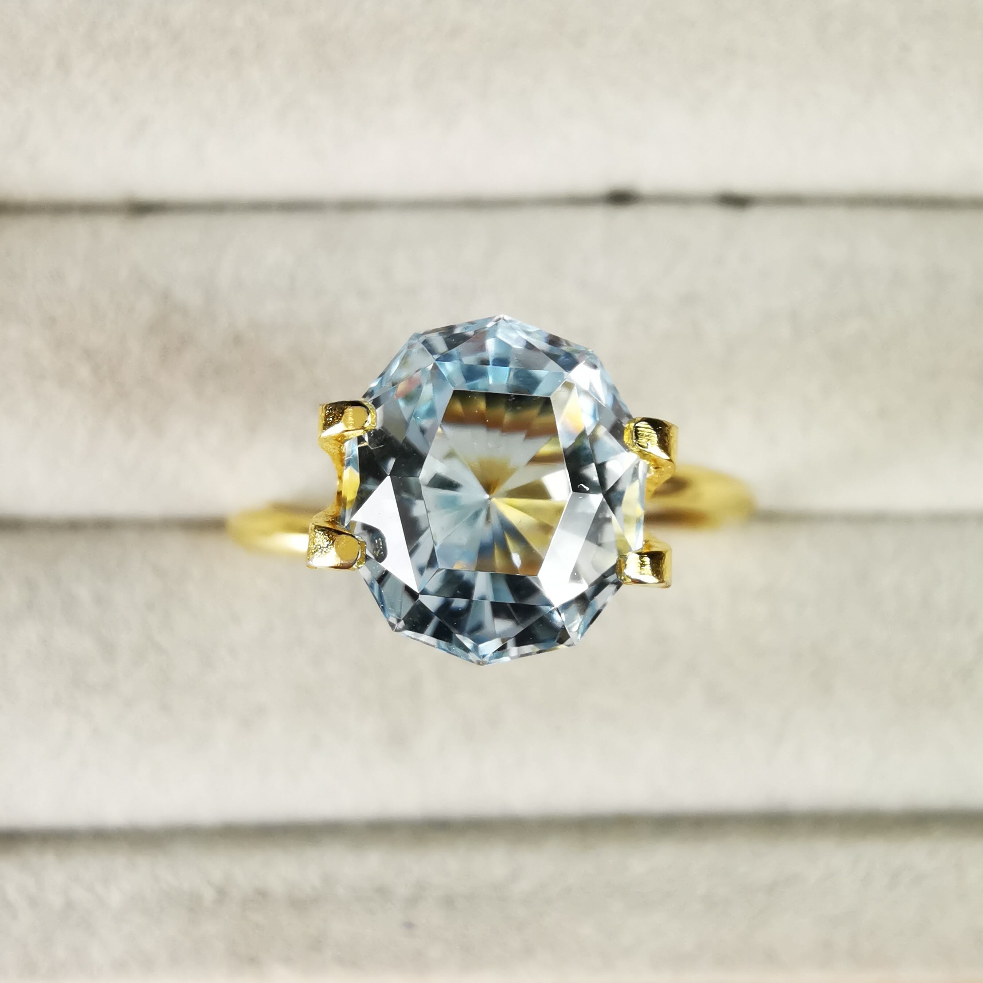 大粒の外し石を贅沢に使った立体的なカットで、様々な角度からきらめきを楽しめる一石です。