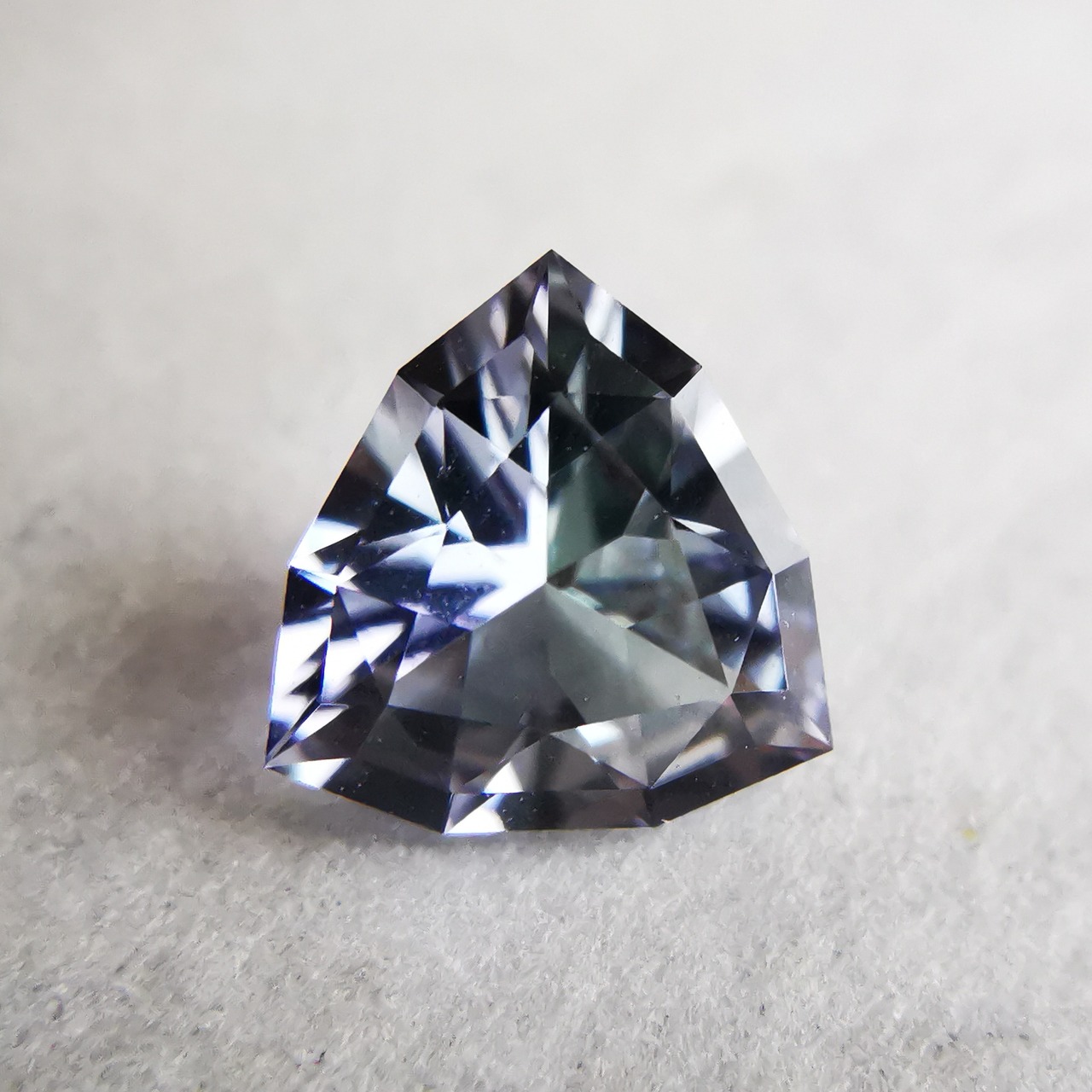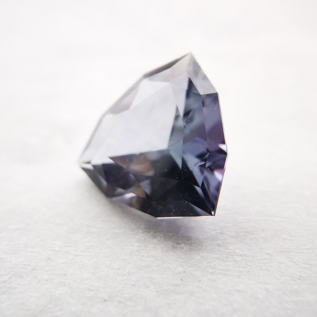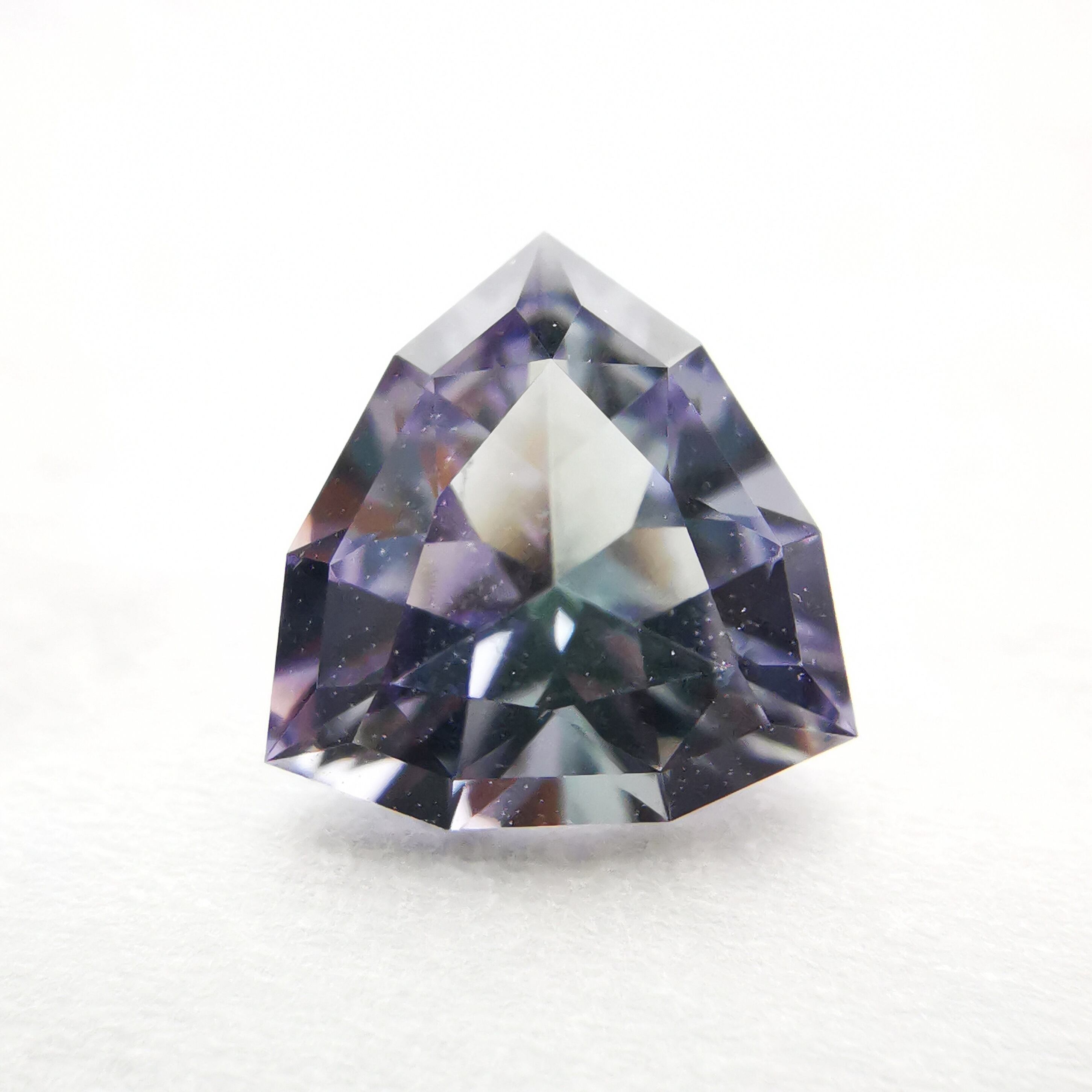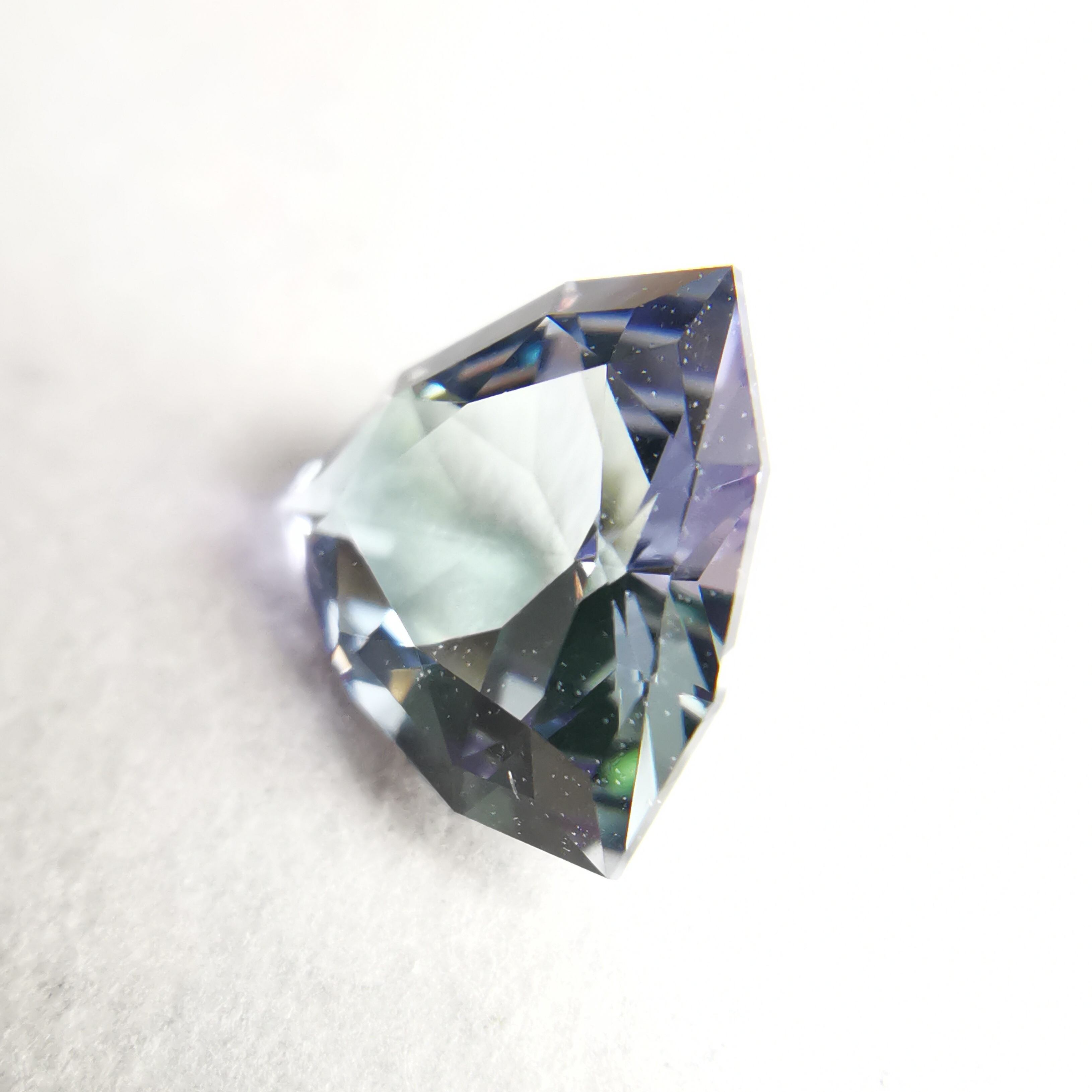 トリオンカットの3面のパビリオンに、ゾイサイトの多色性が表れています。