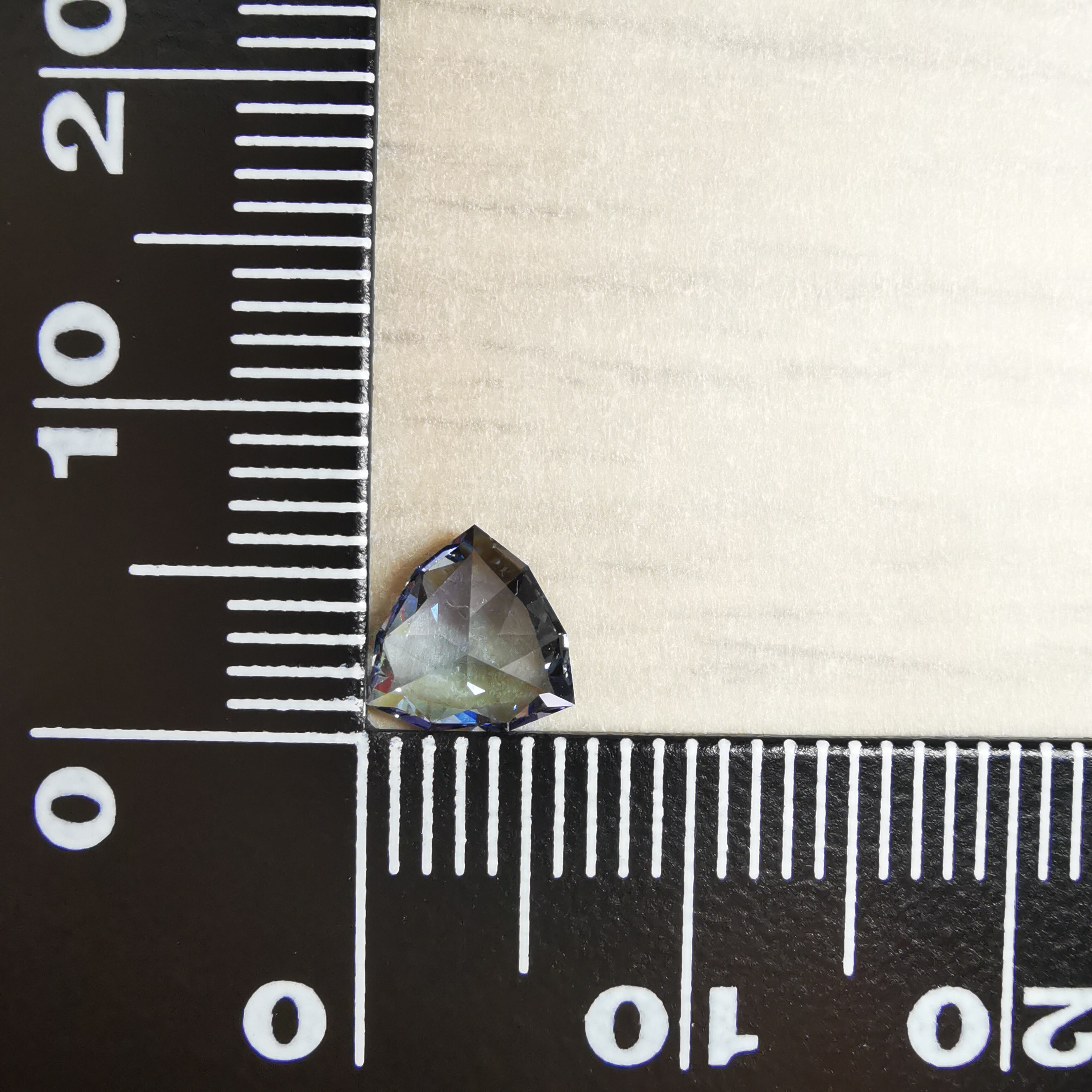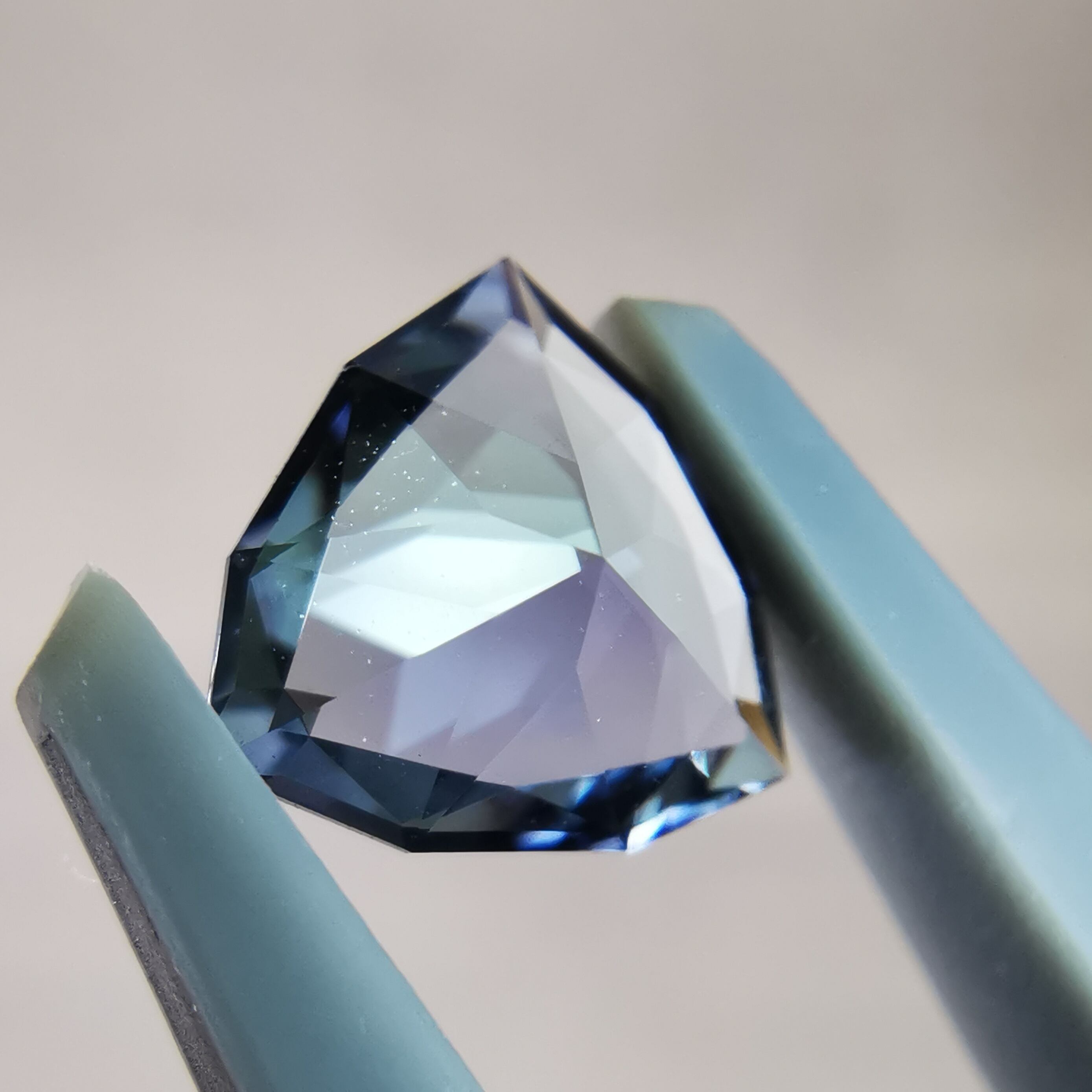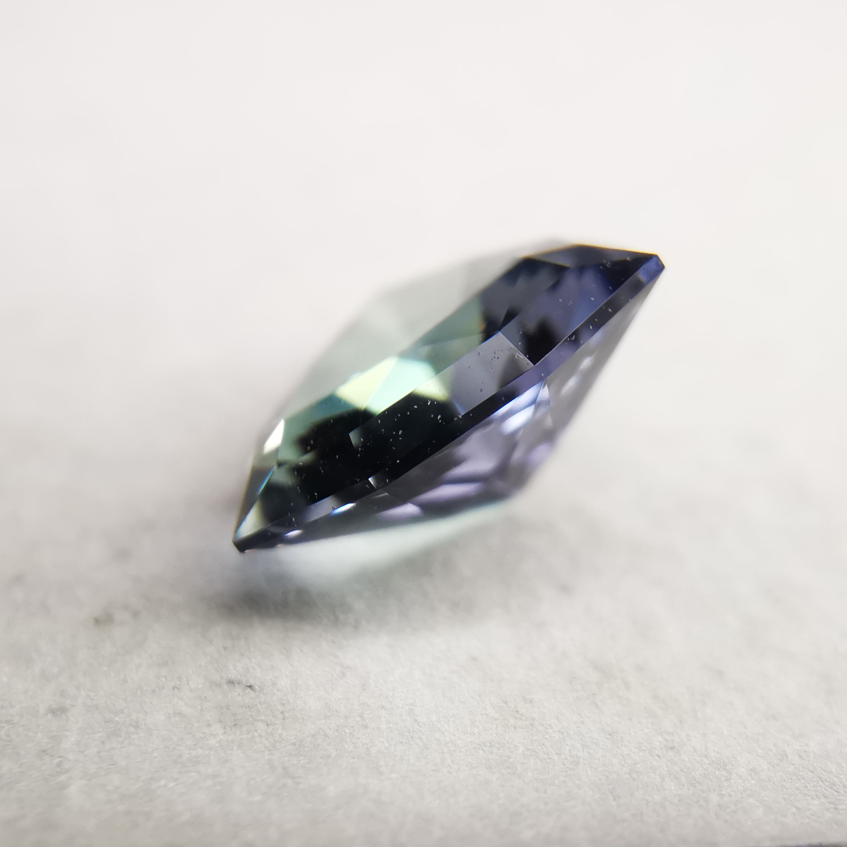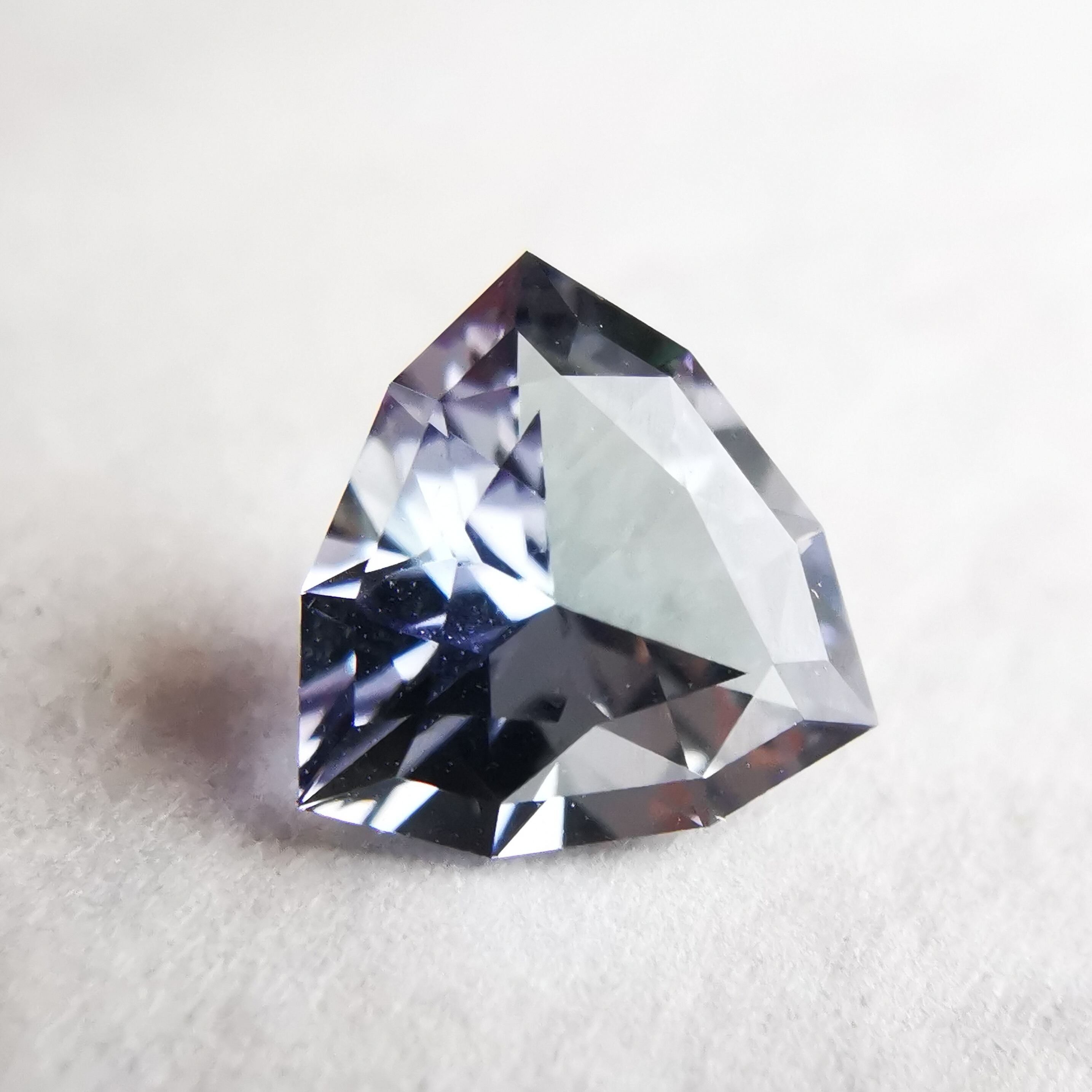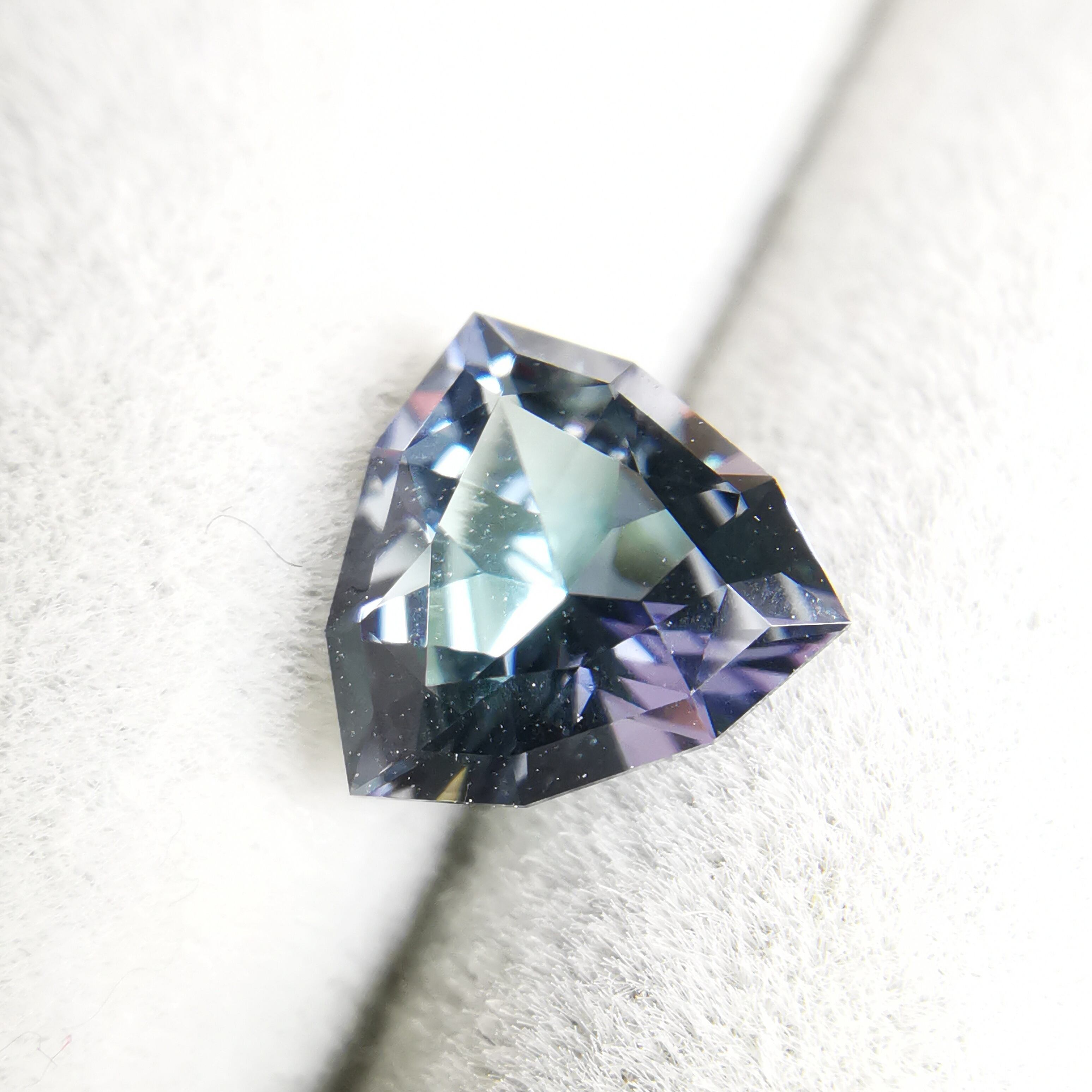 トリオンカットの3面のパビリオンに、ゾイサイトの多色性が表れています。
