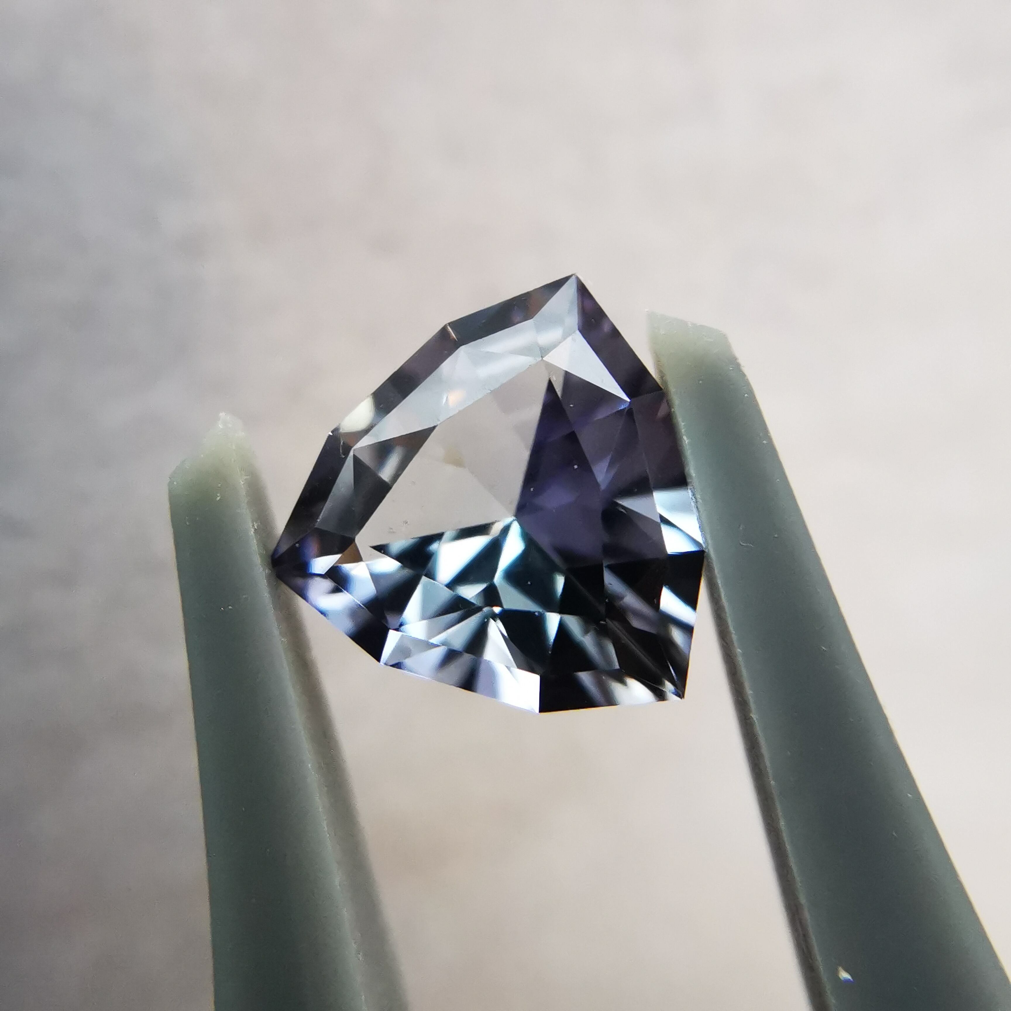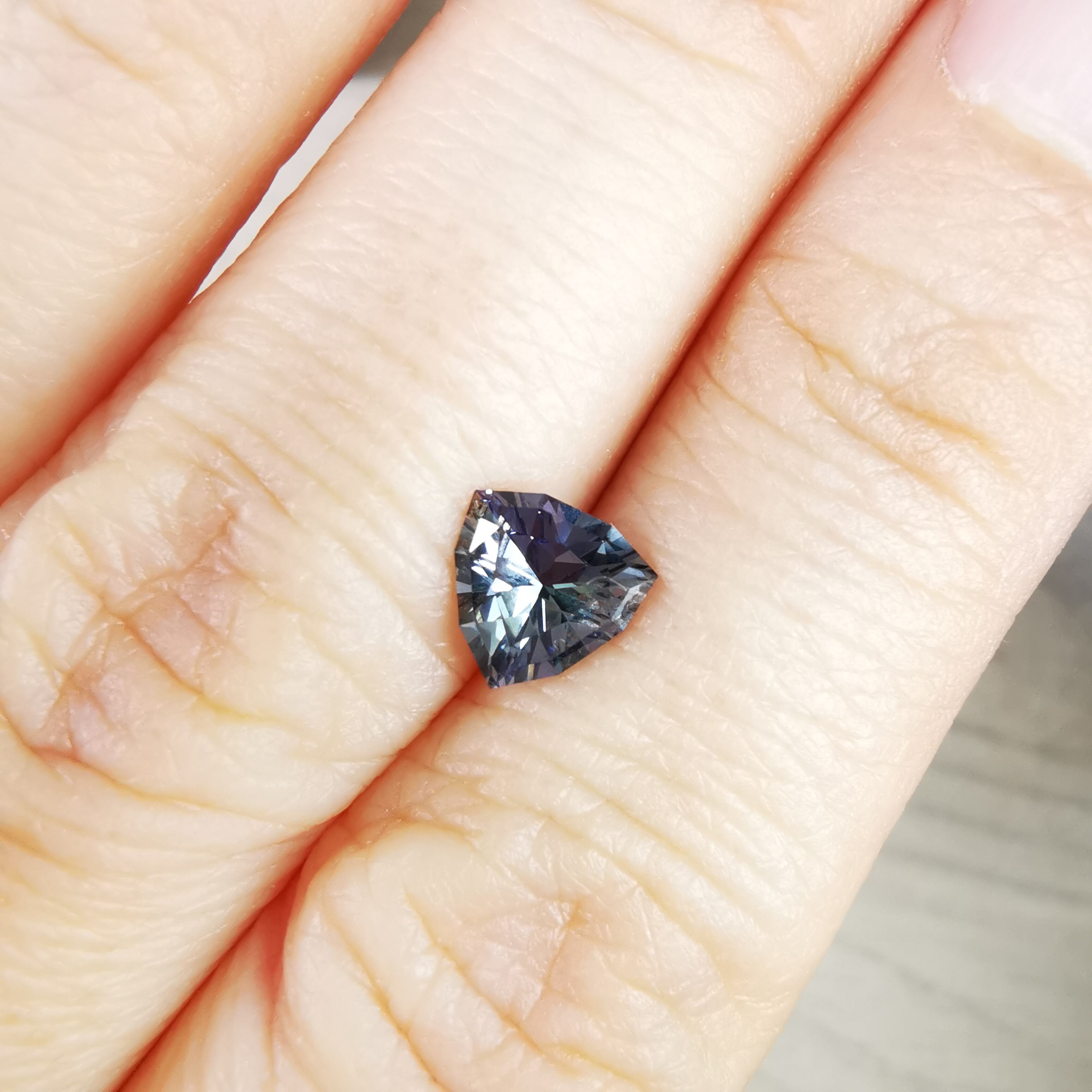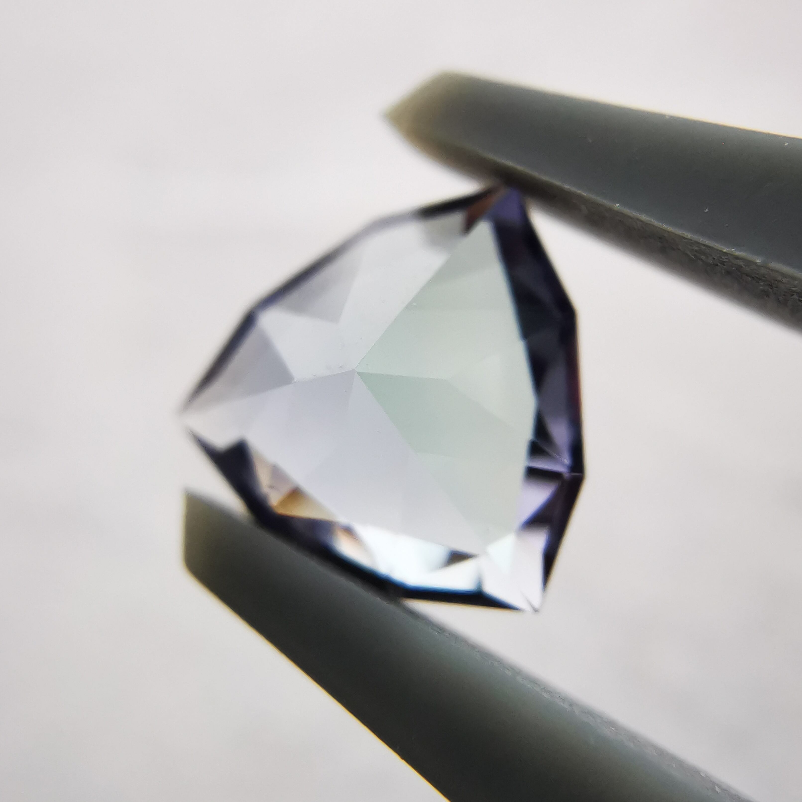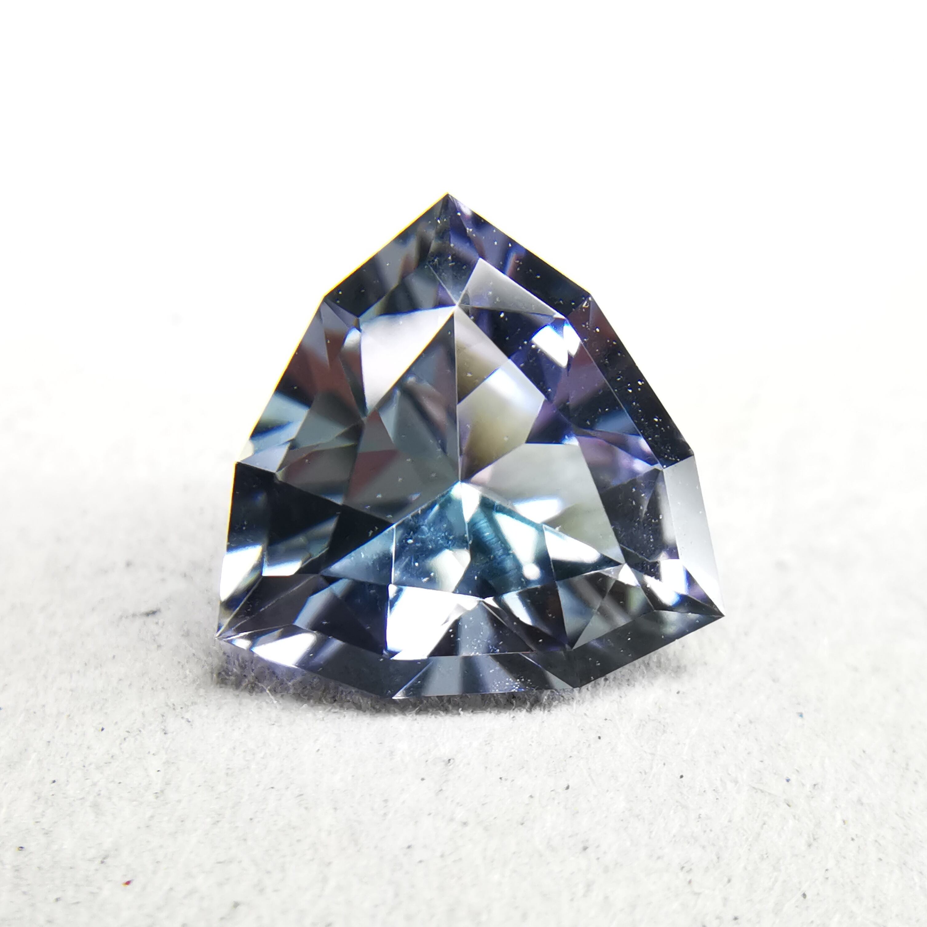 トリオンカットの3面のパビリオンに、ゾイサイトの多色性が表れています。
