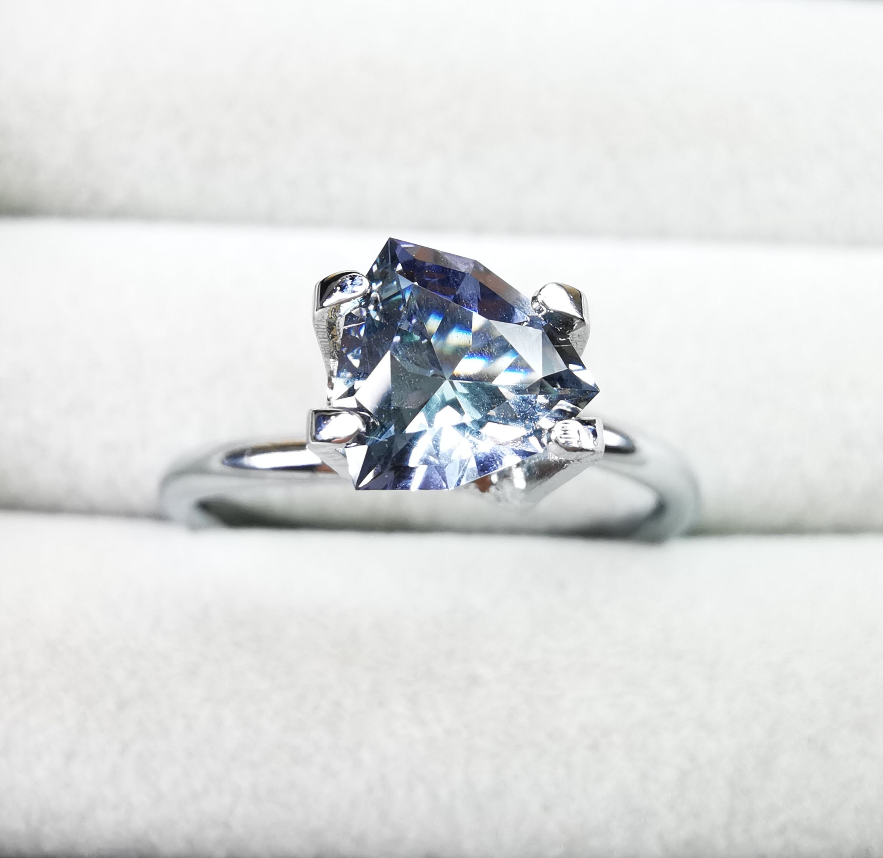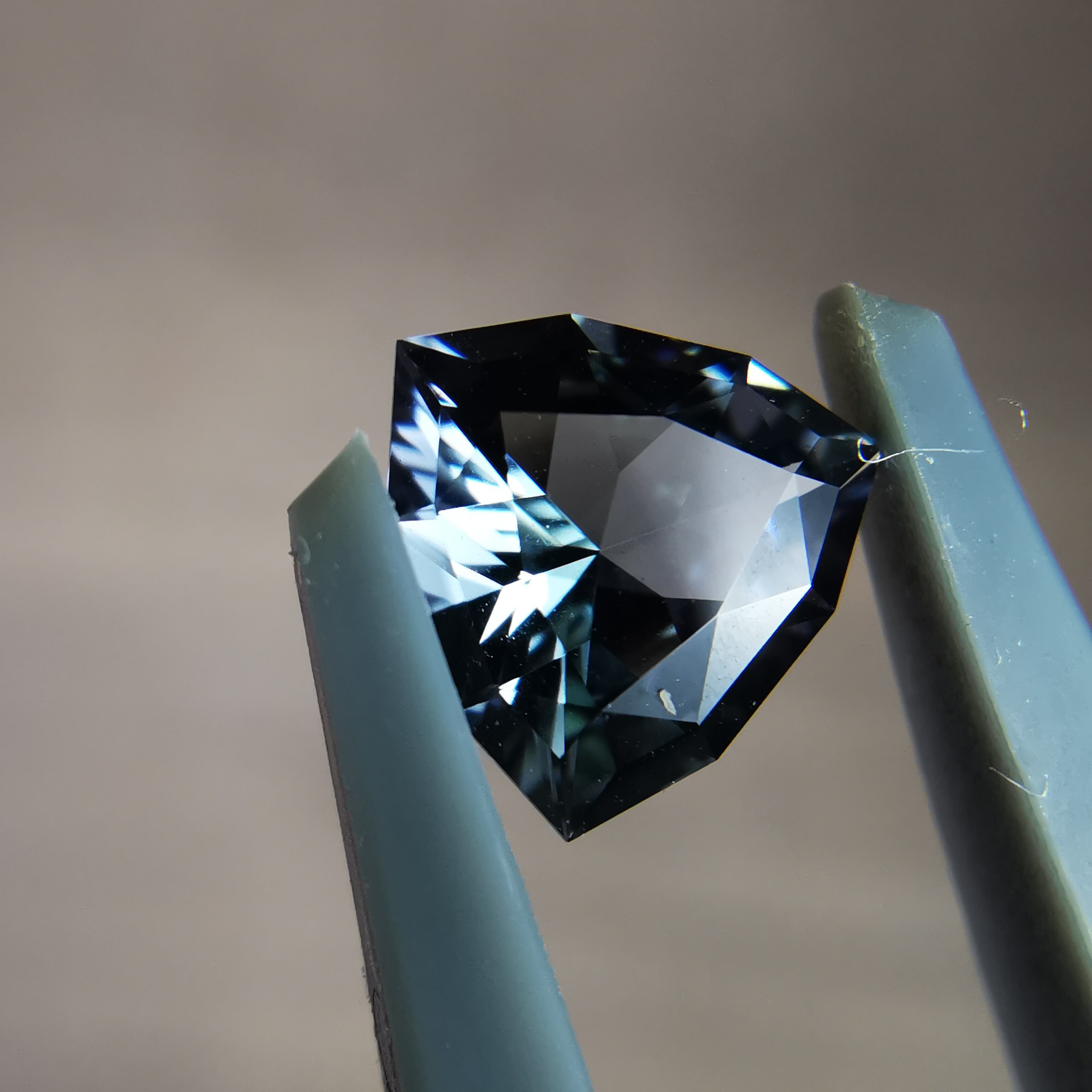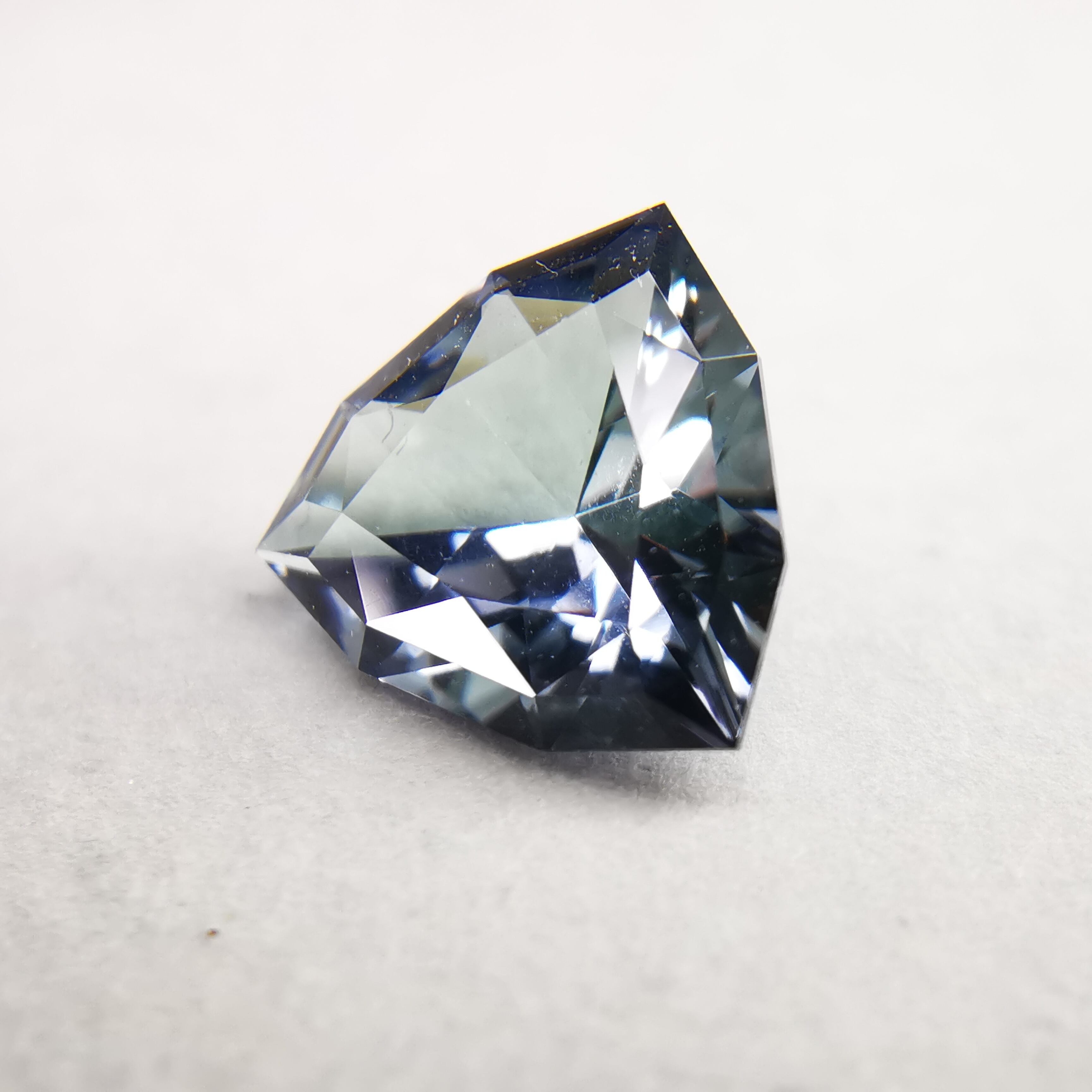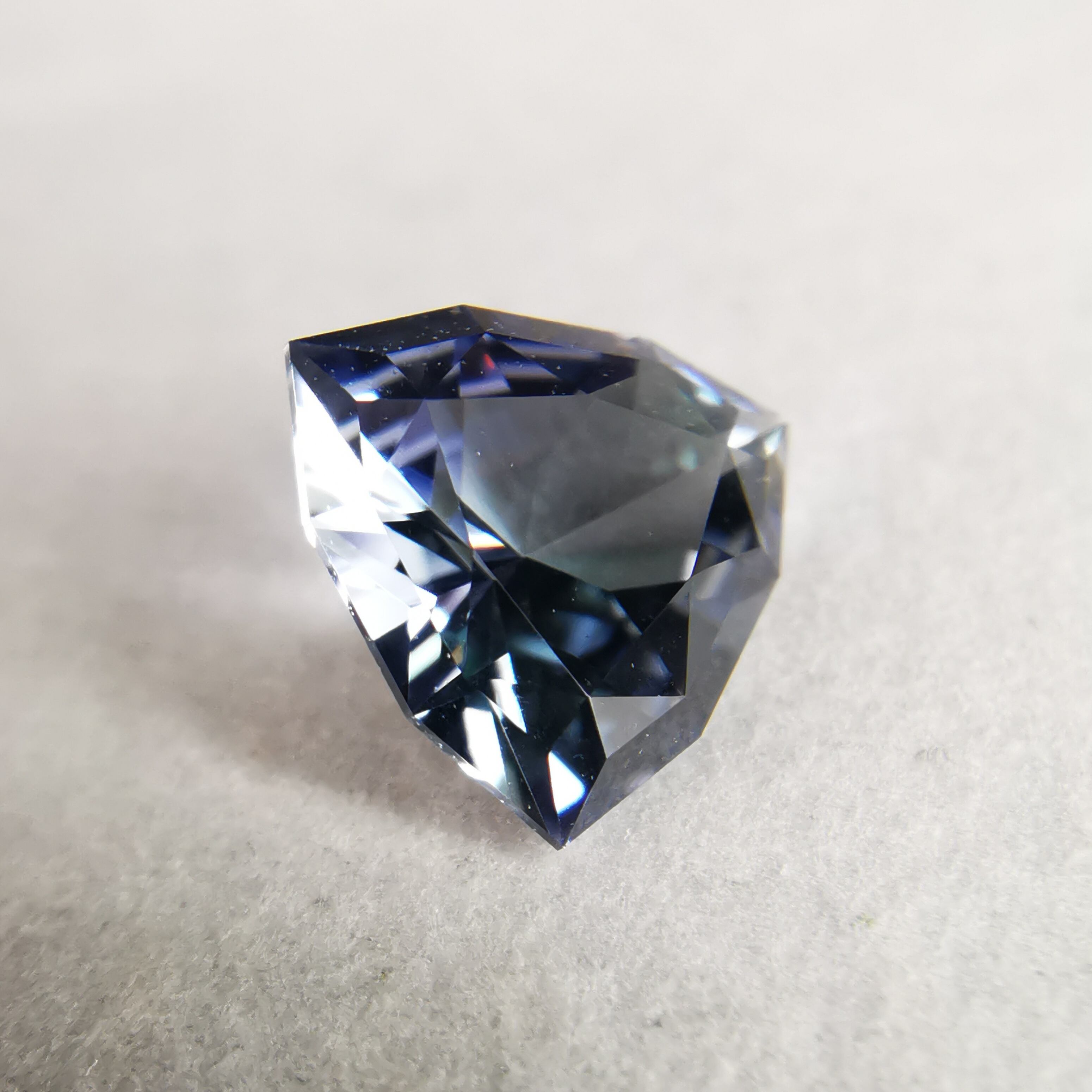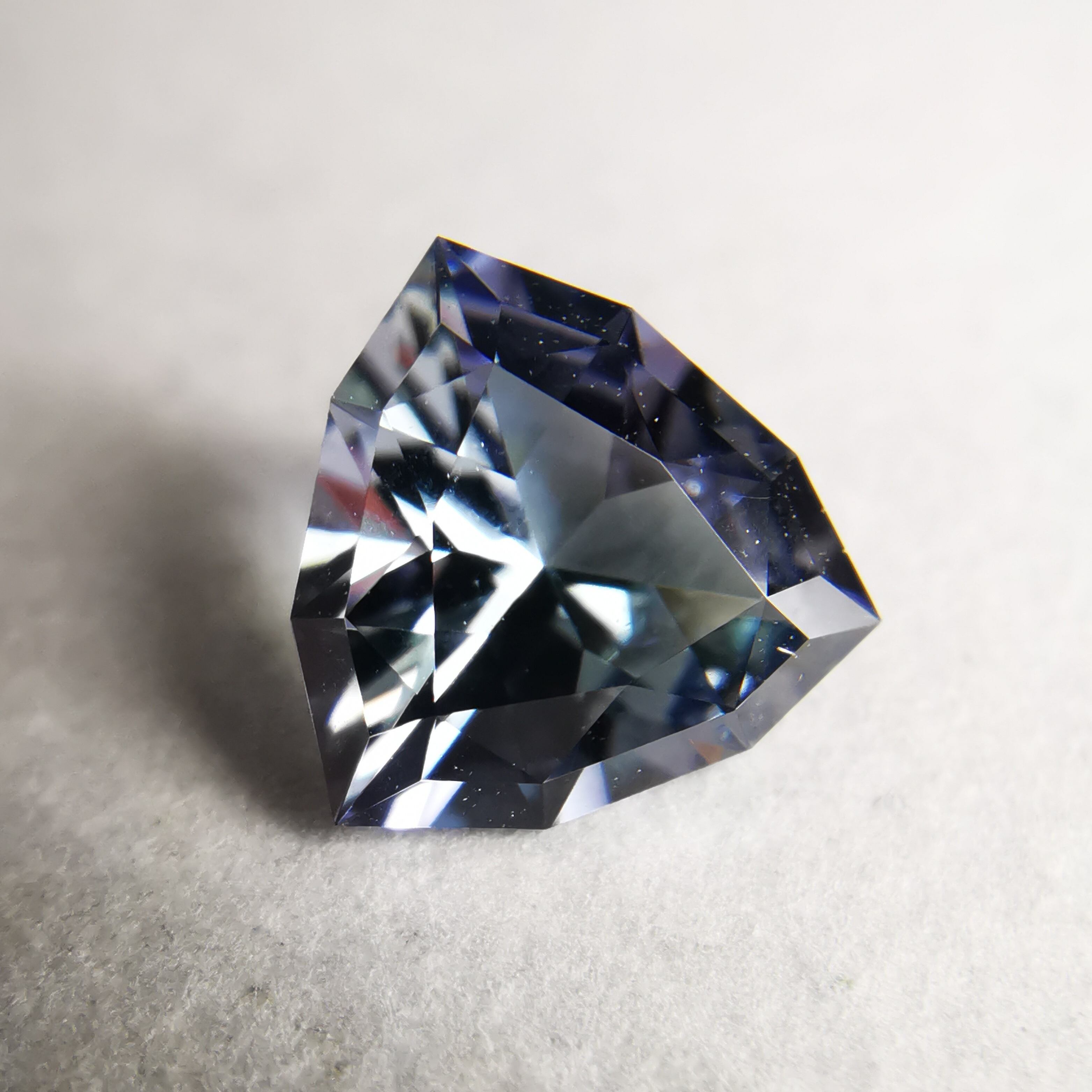 トリオンカットの3面のパビリオンに、ゾイサイトの多色性が表れています。