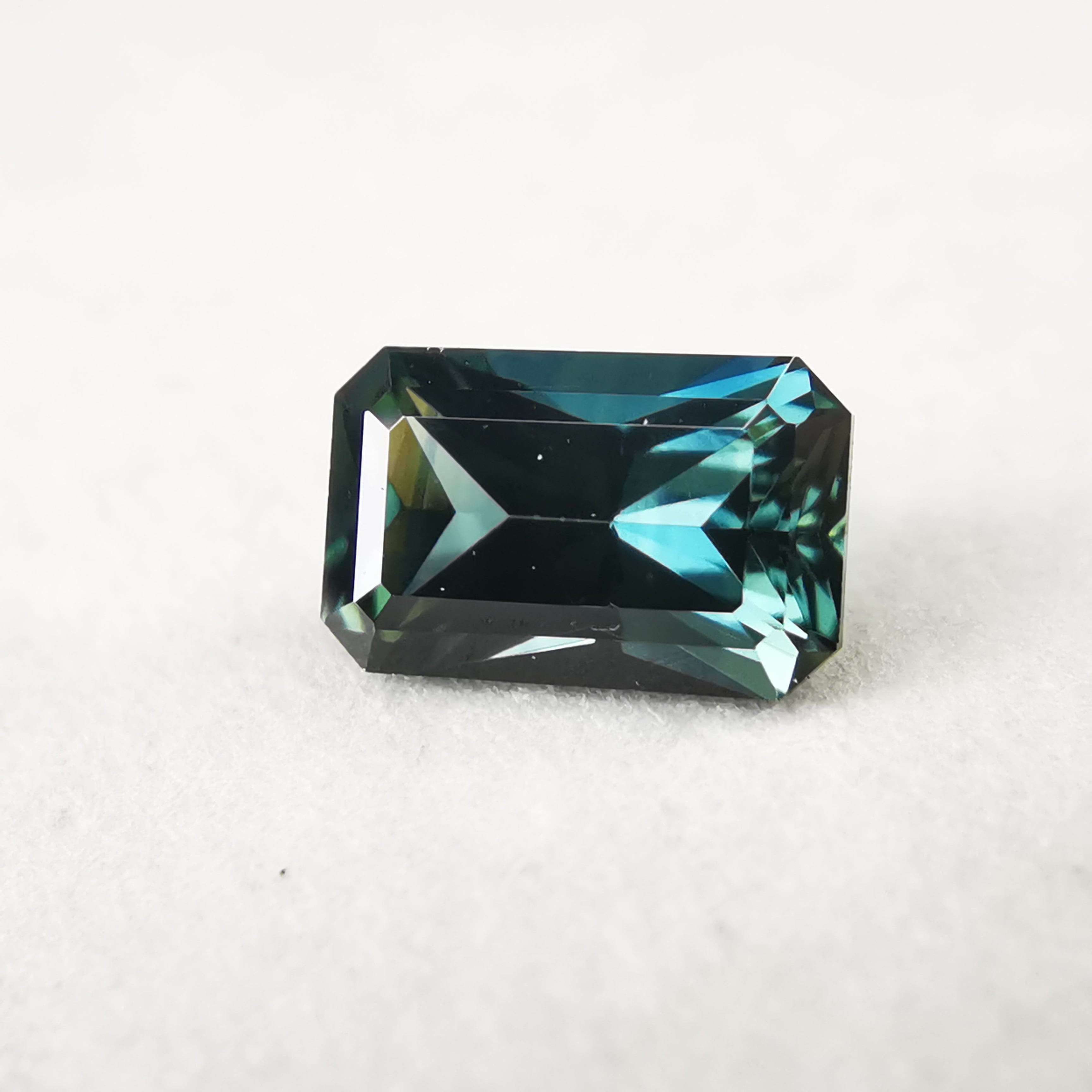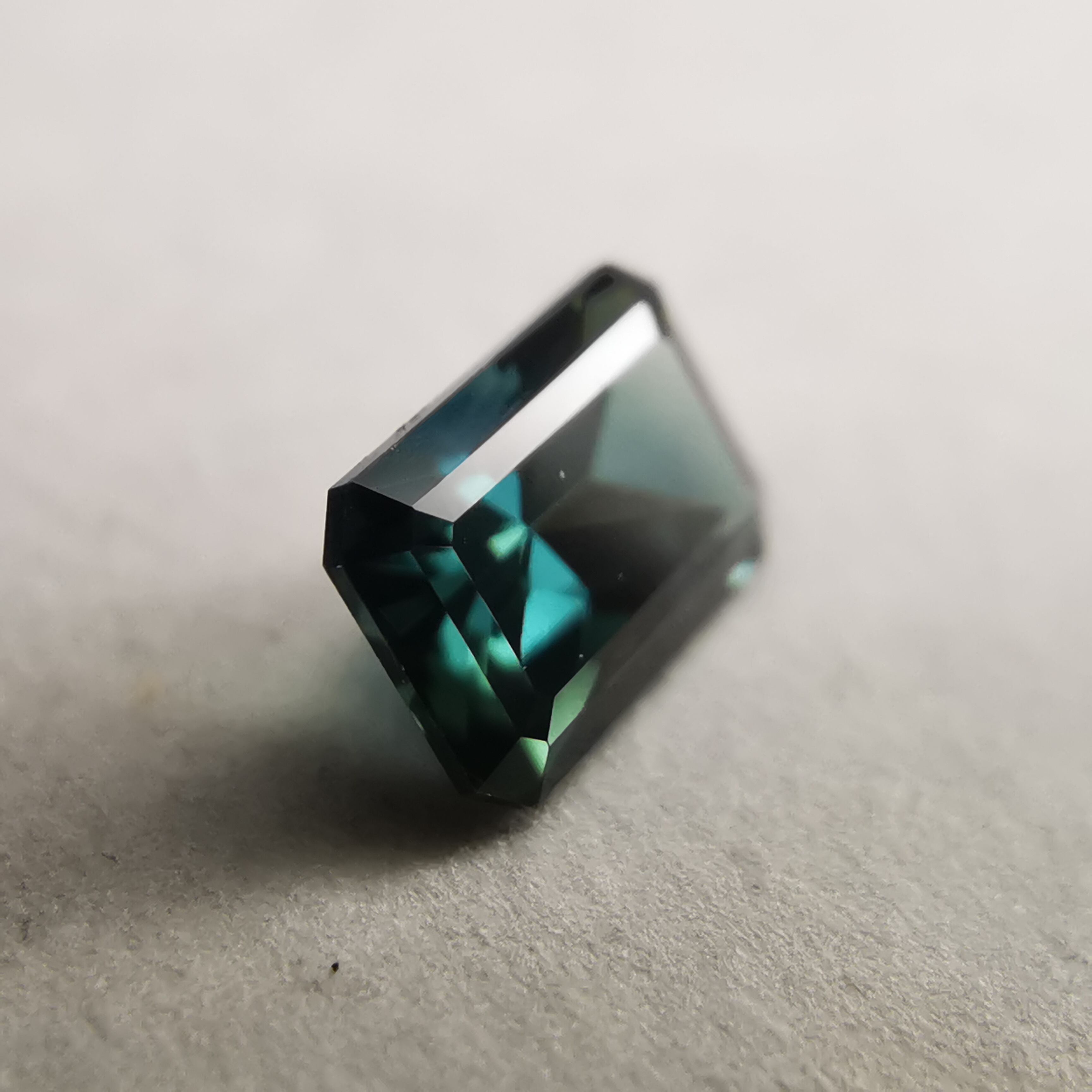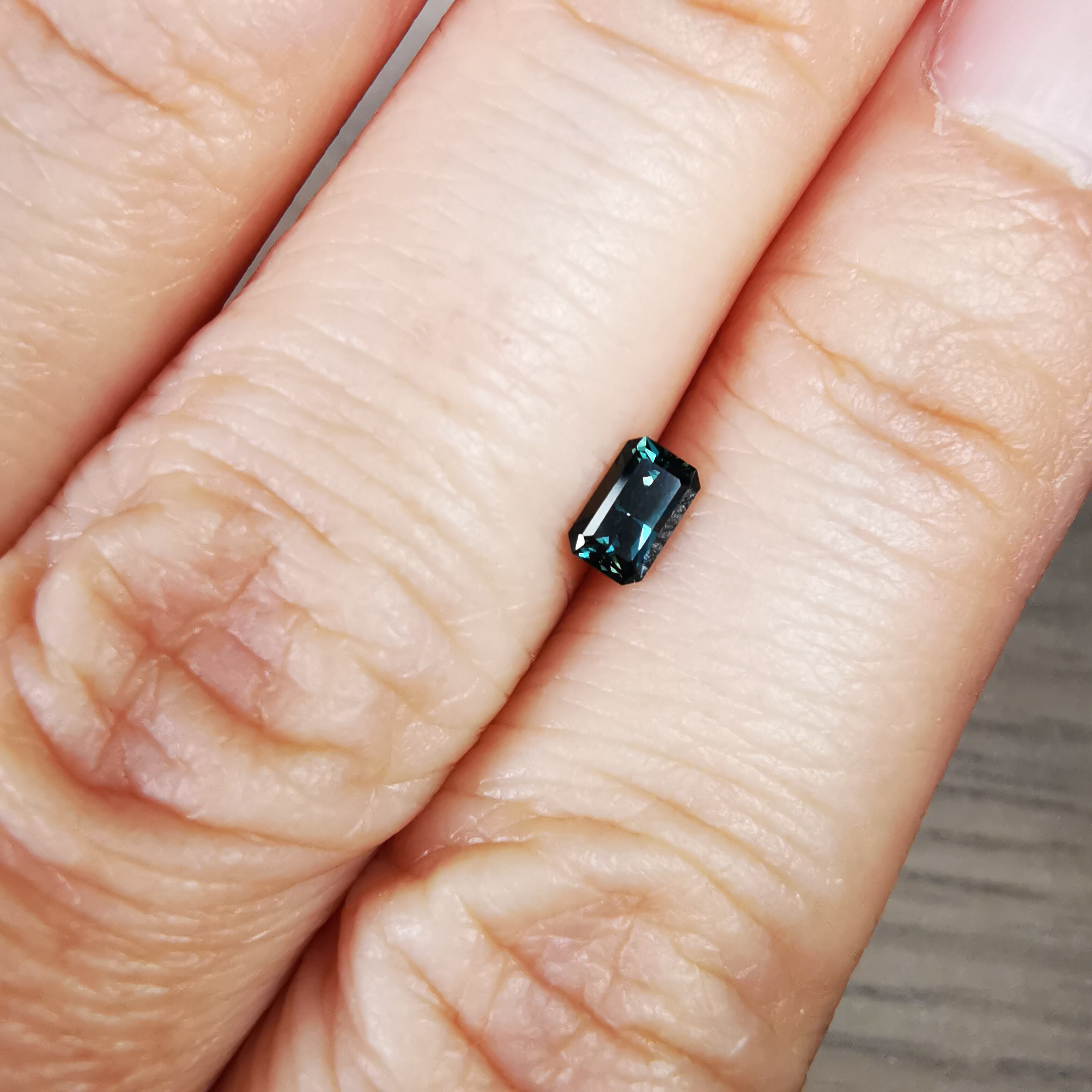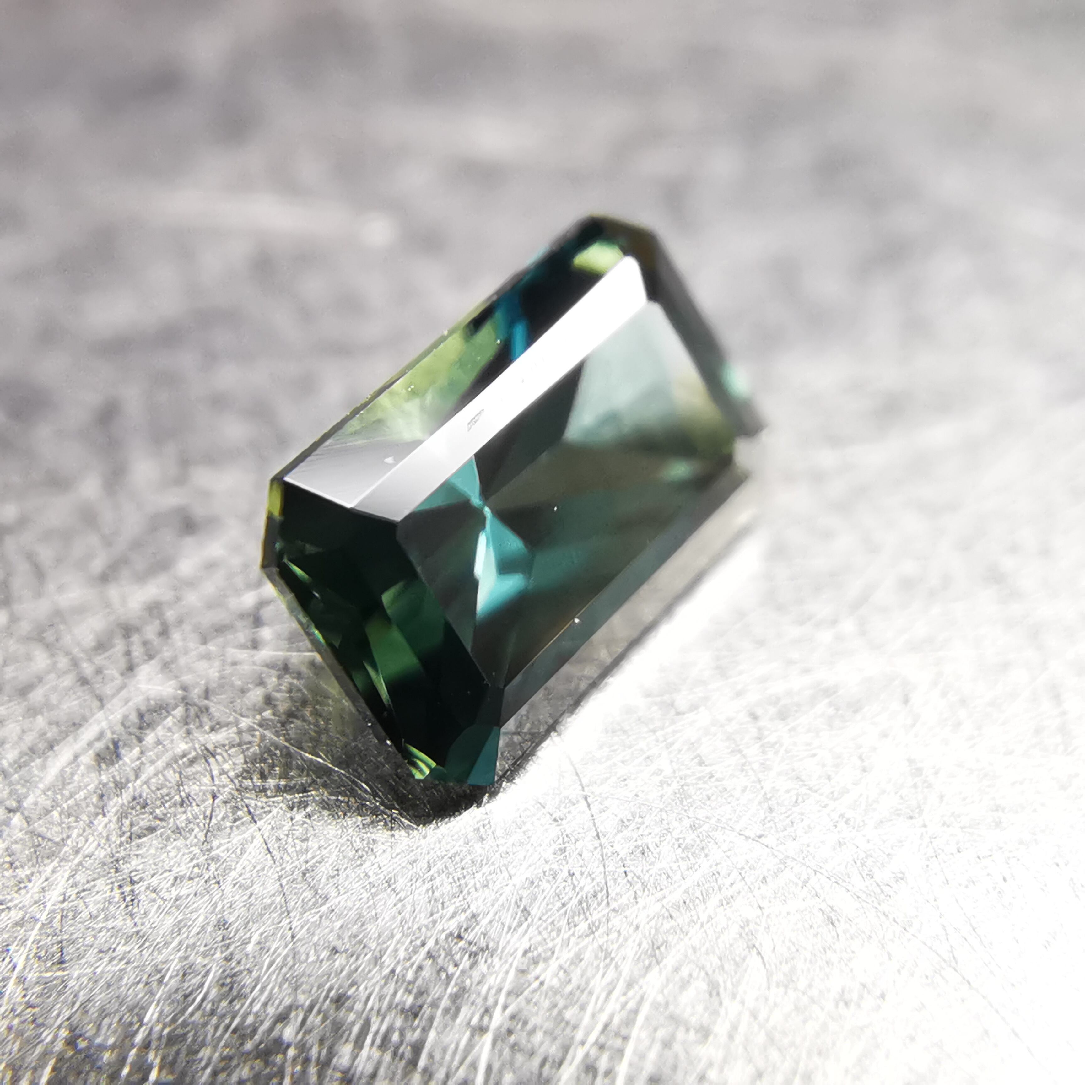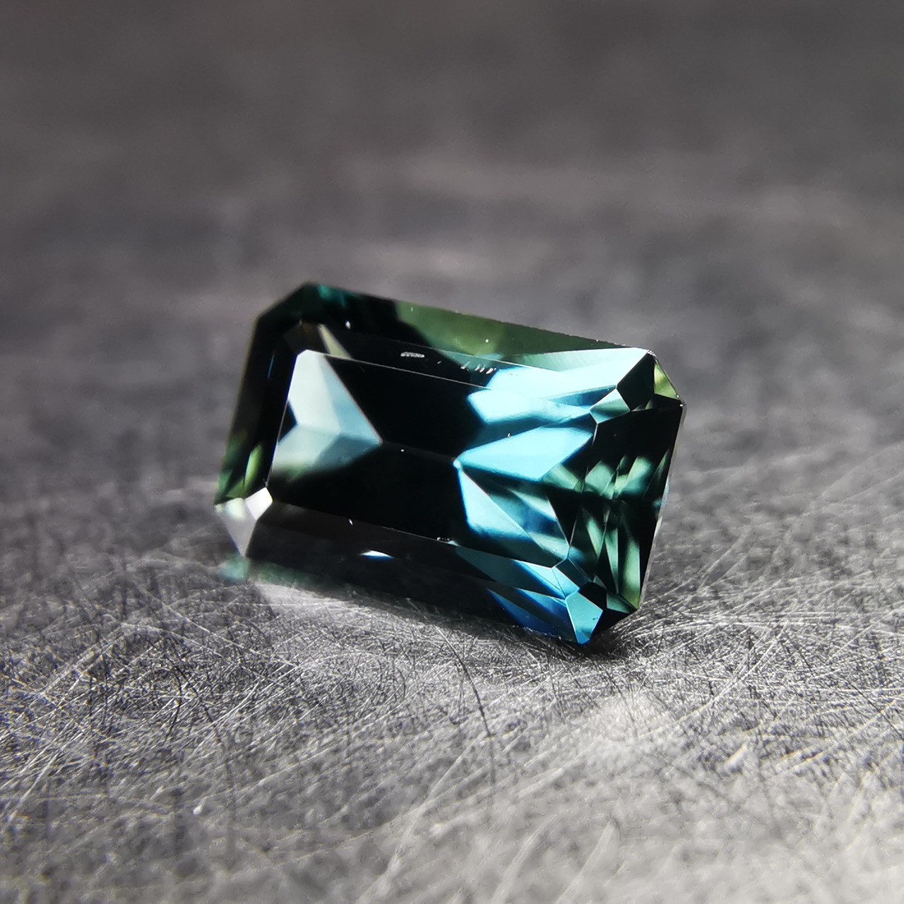 暗い石の中からティールカラーのきらめきが印象的なサファイアです。