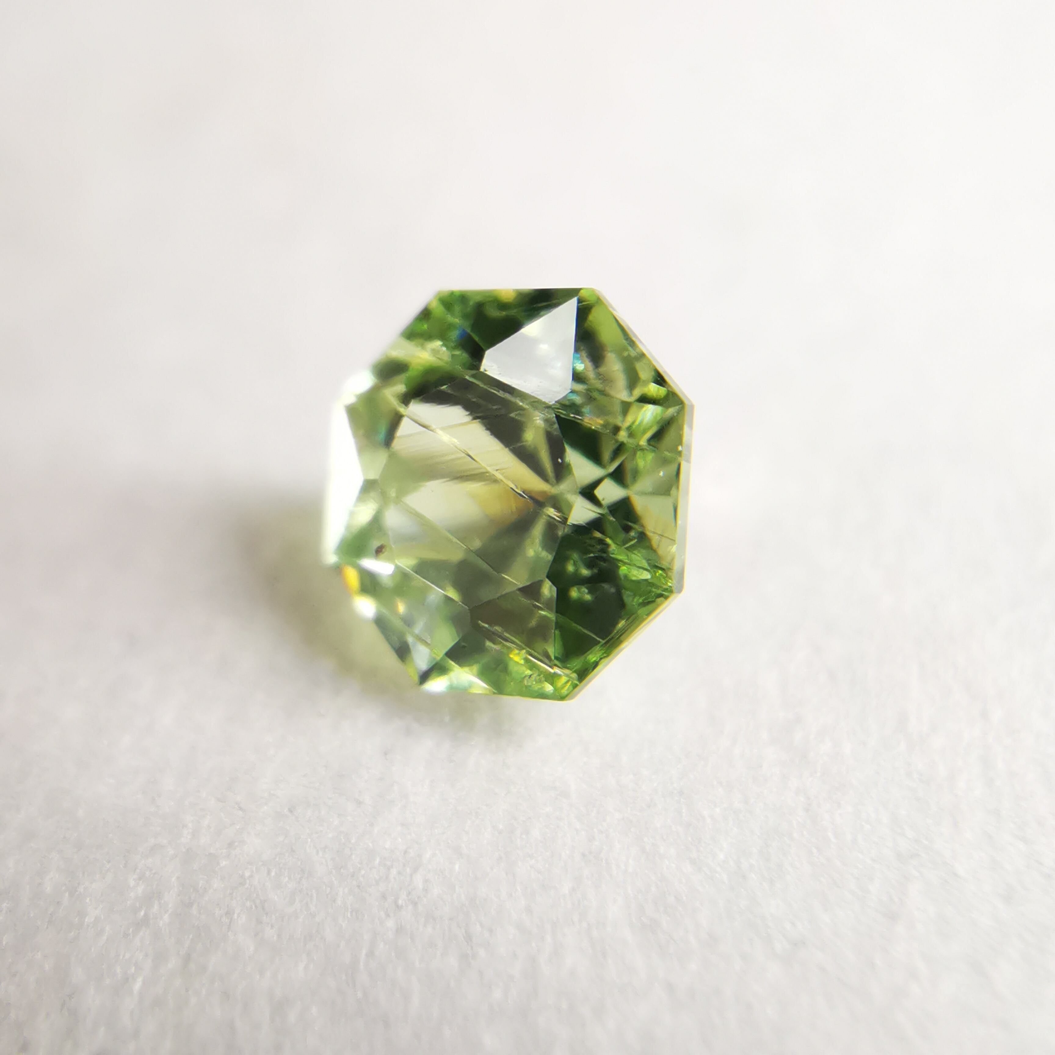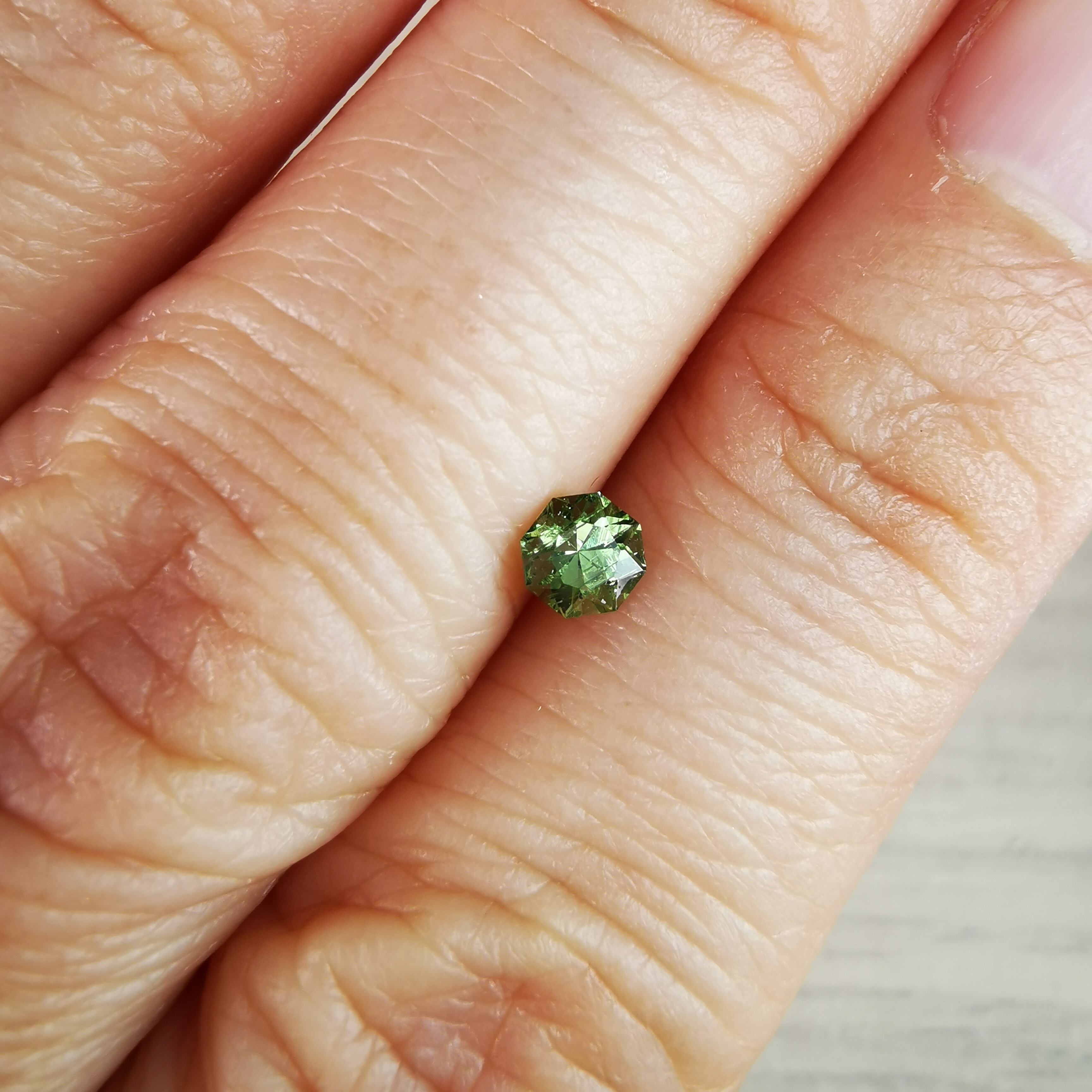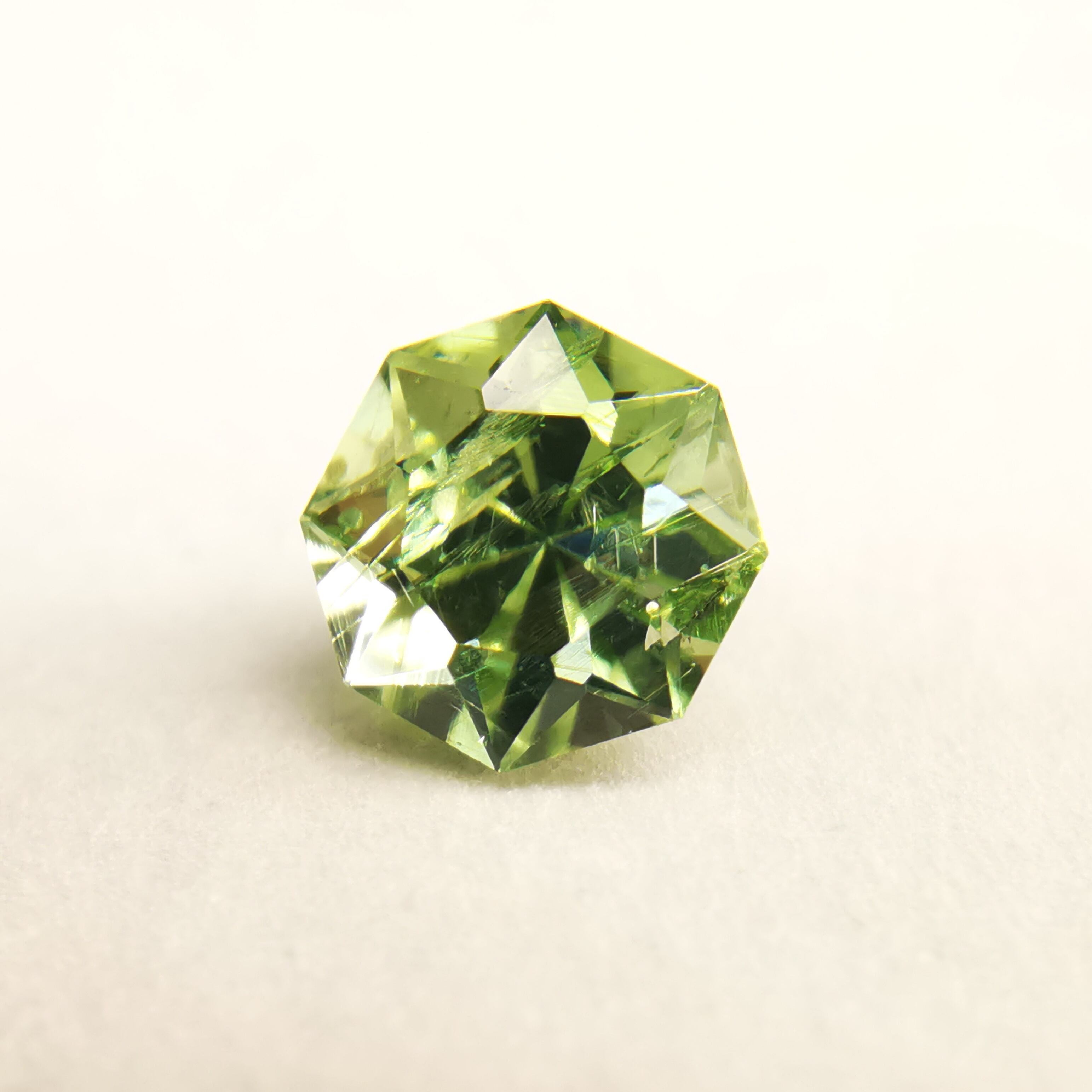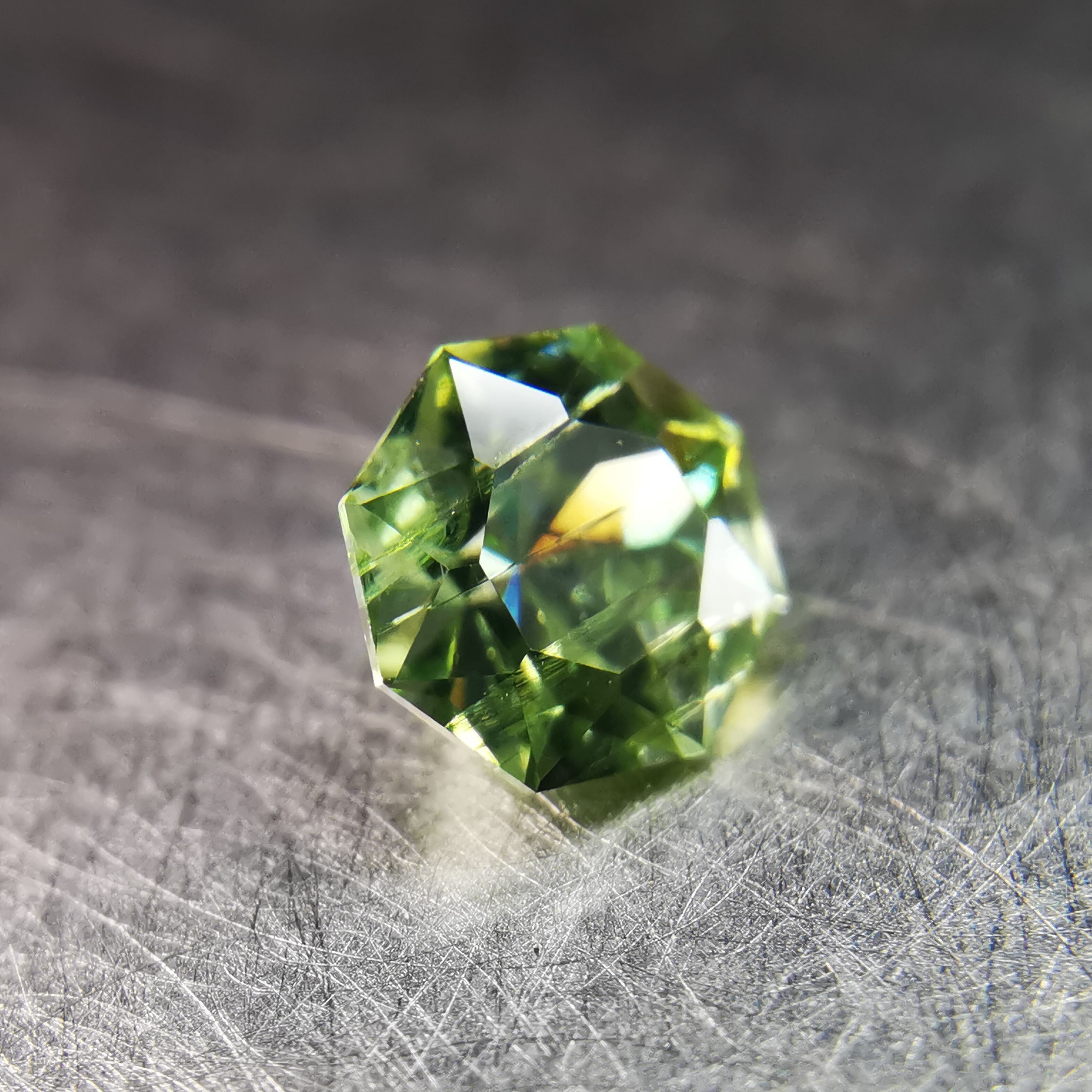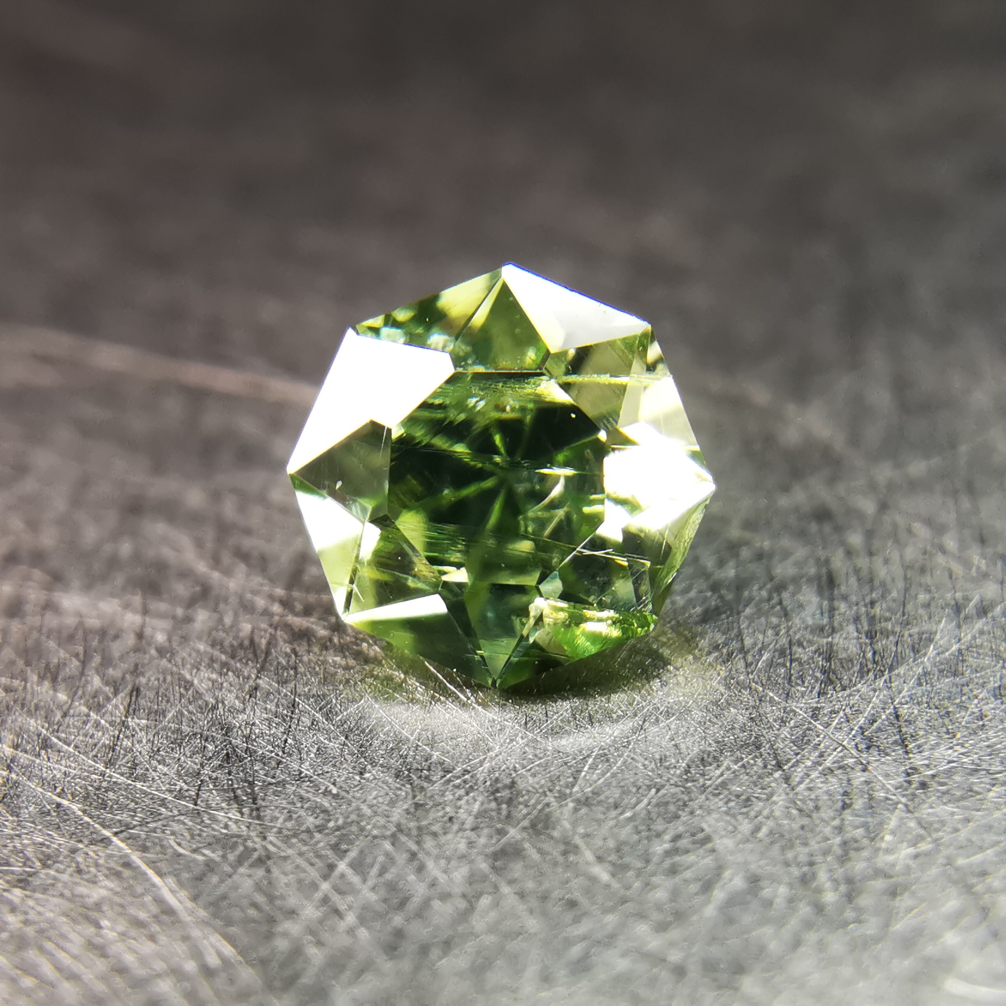 石を横切るようにインクルージョンが入り、ガードル付近のクラックには虹が見えます。